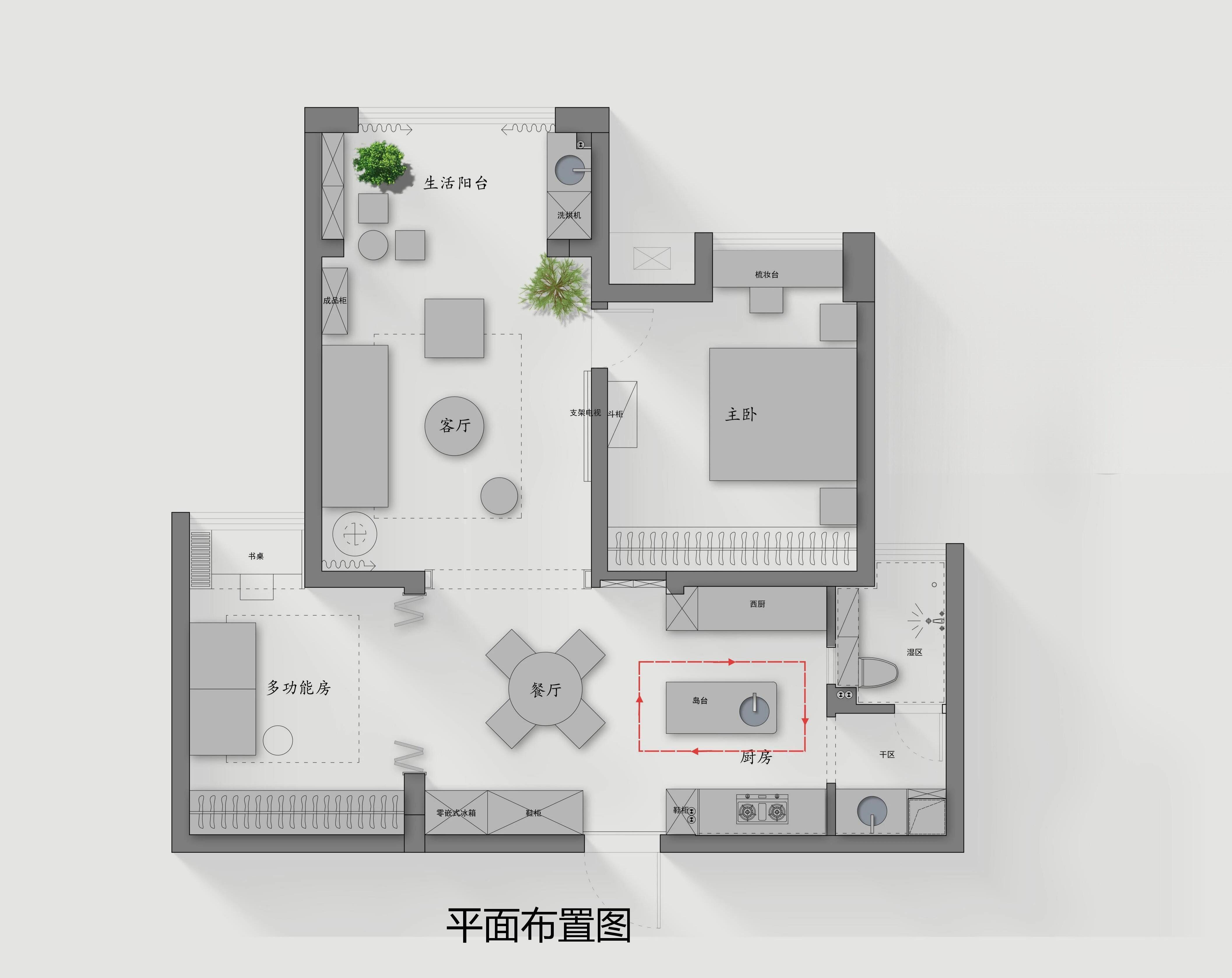 空间布局:创新点1:建立一条东西向的通透主动线,将入口、餐厅、客厅、卧室串联,实现光线与空气的最大化穿透,以白色石材岛台为核心,连接中、西厨与餐厅,形成高效的“洄游动线环”,使烹饪、社交、传菜行为无缝衔接,极大提升了公共区域的互动性与效率。