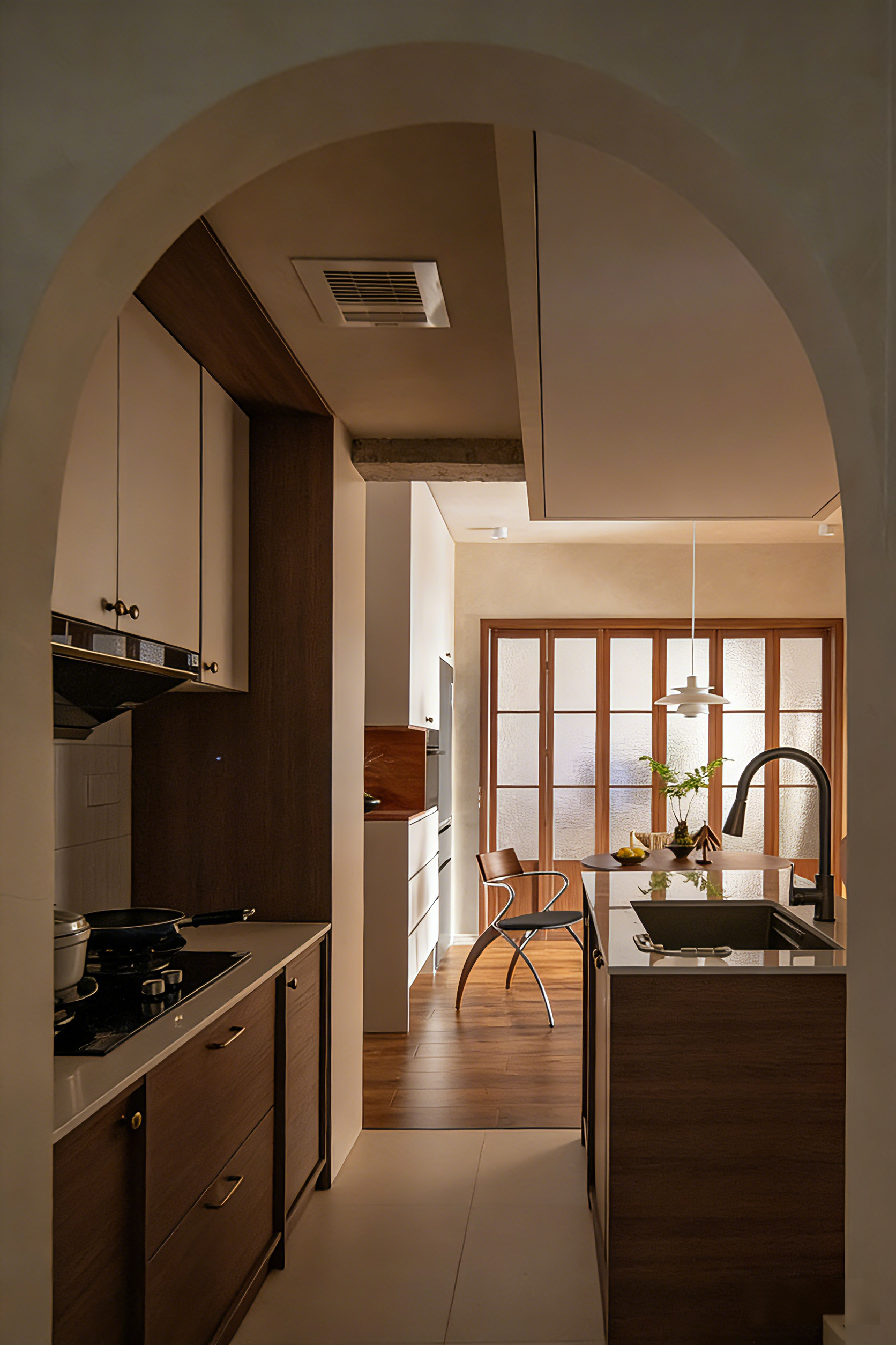 岛台朝向餐厅的一侧,采用了特殊的白色凹凸造型石材,凹凸的表面在光线下形成微妙的阴影变化,岛台上方,一片柔和的软膜天花如同第二层天光,既包裹了原始梁体又为厨房操作区提供均匀而温柔的照明。