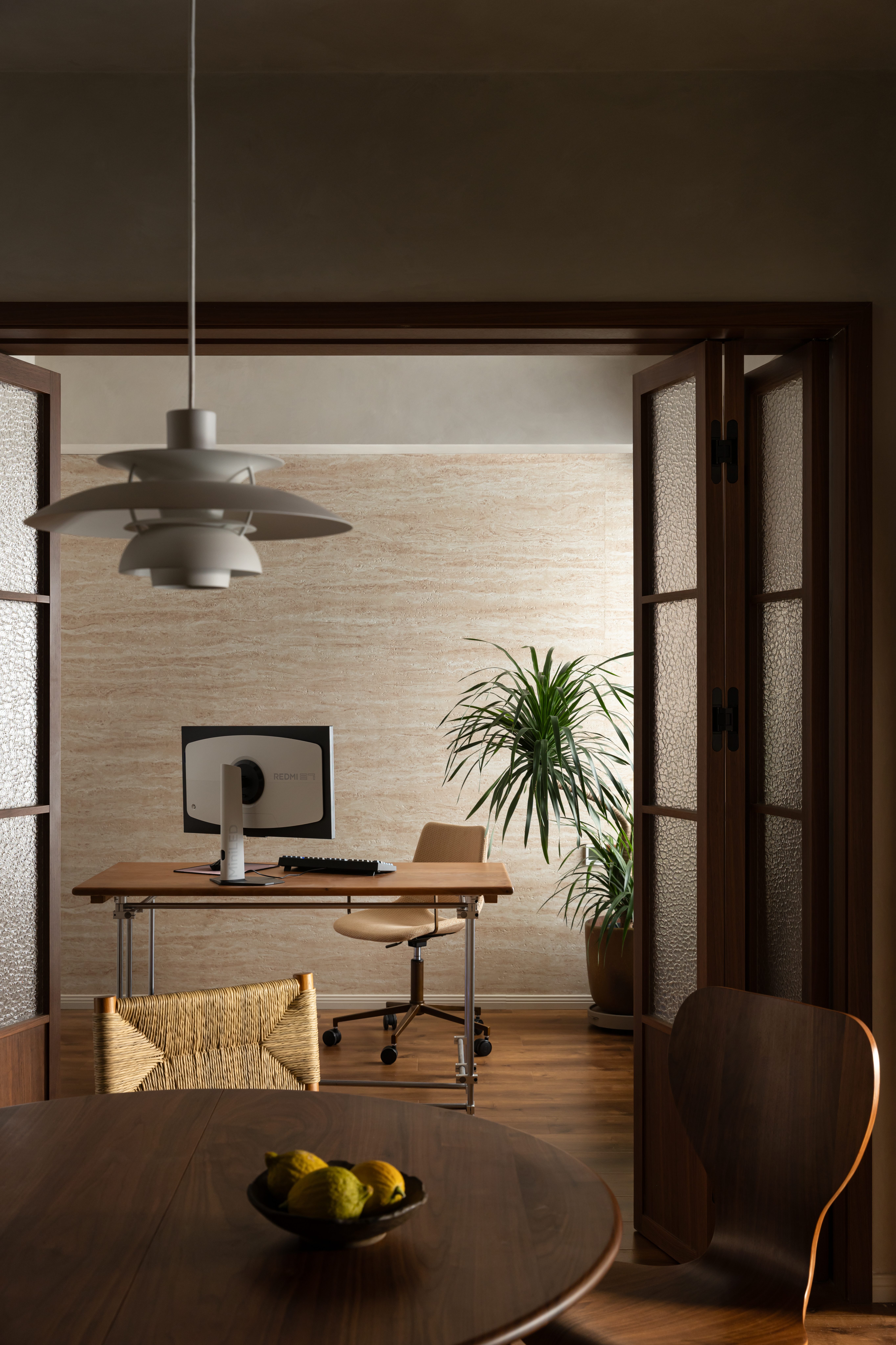 一张简约书桌搭配一棵龙血树,既满足了工作学习需求,又延续了绿意主题。折叠门的设计让空间可根据需求灵活切换,兼顾私密与开放。