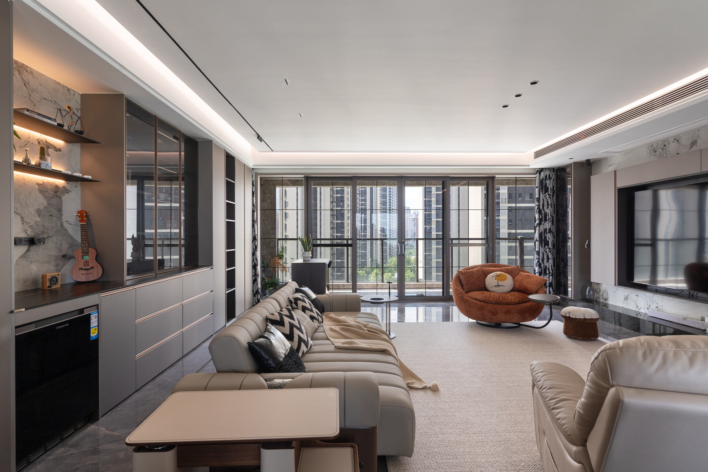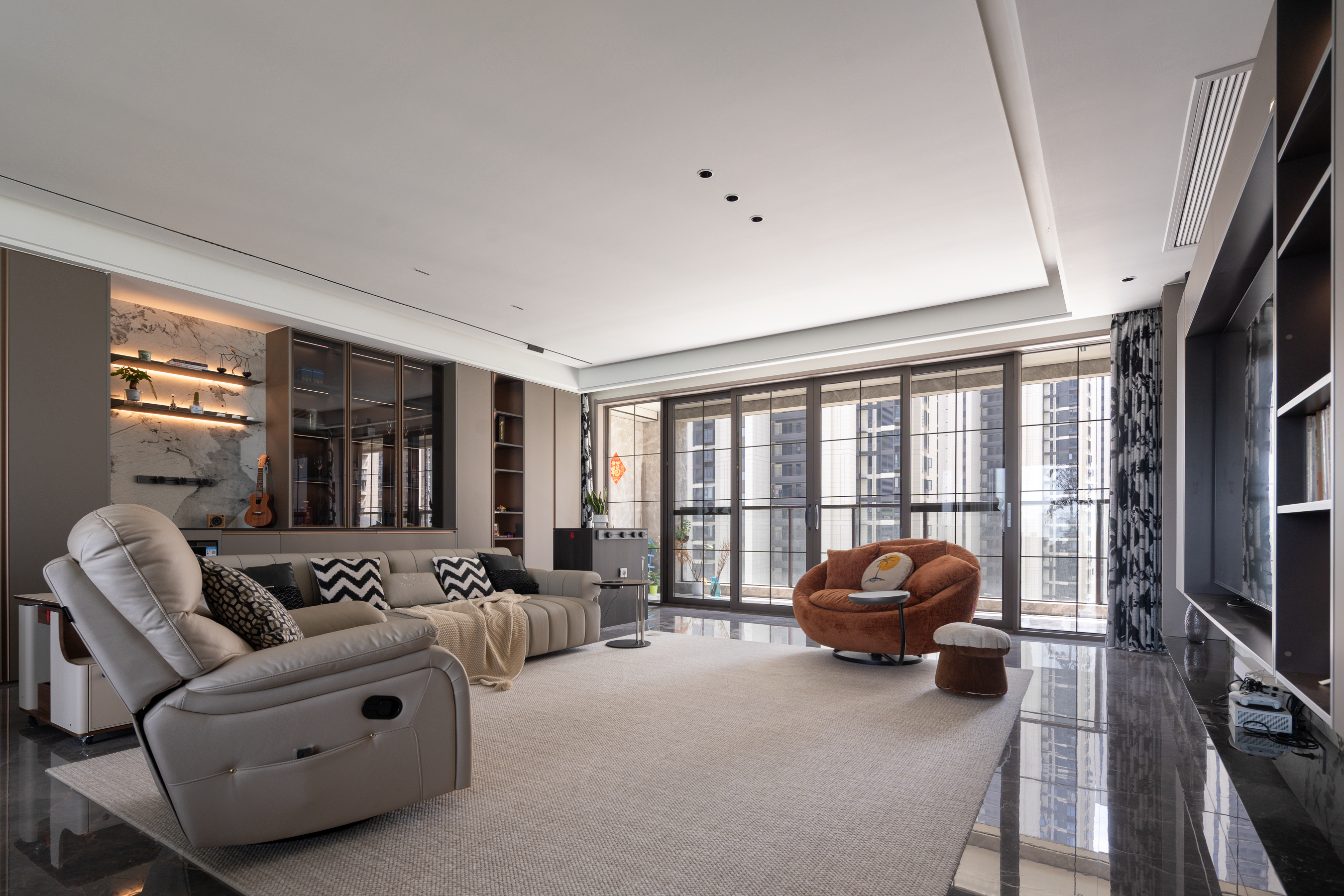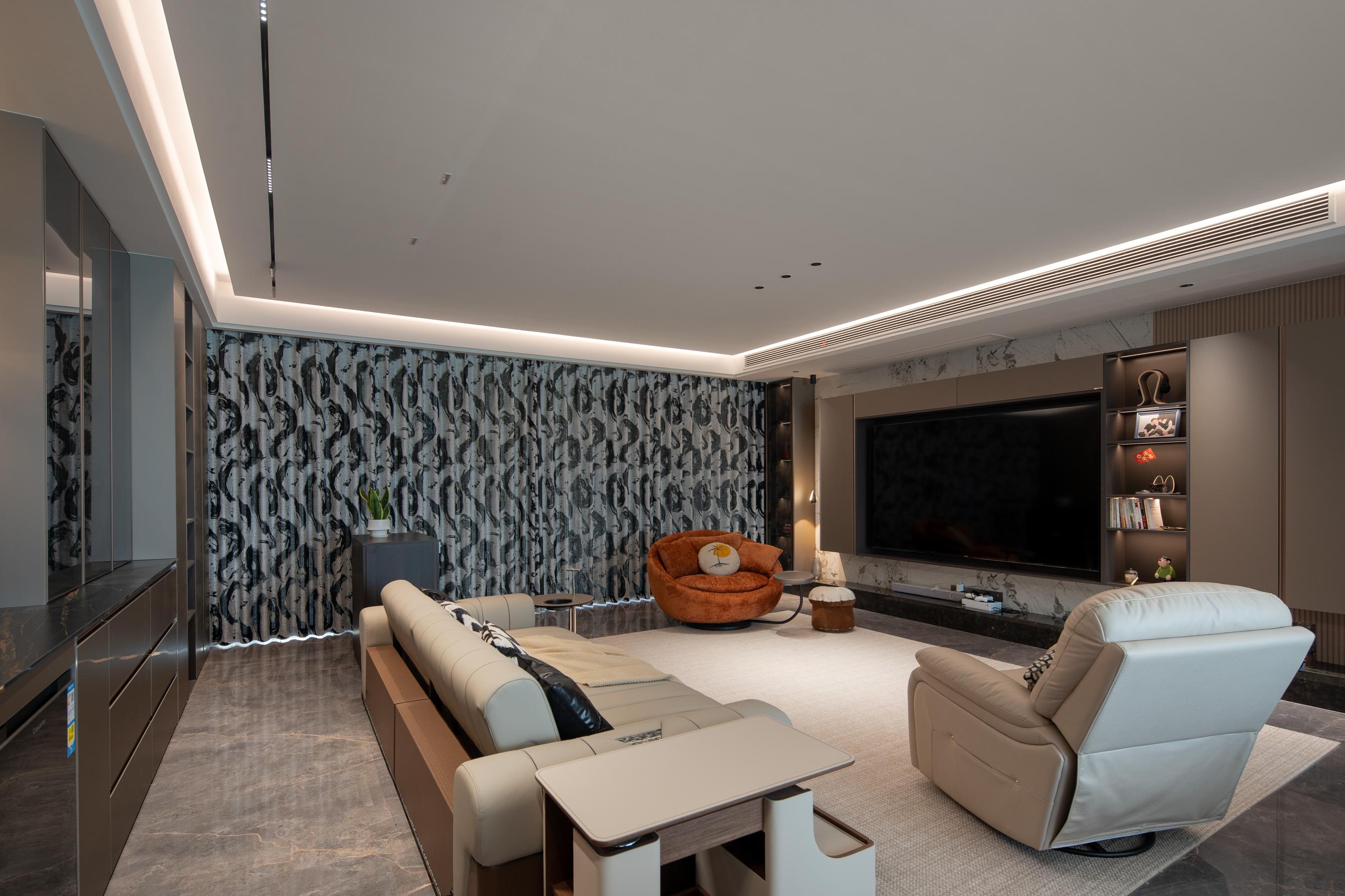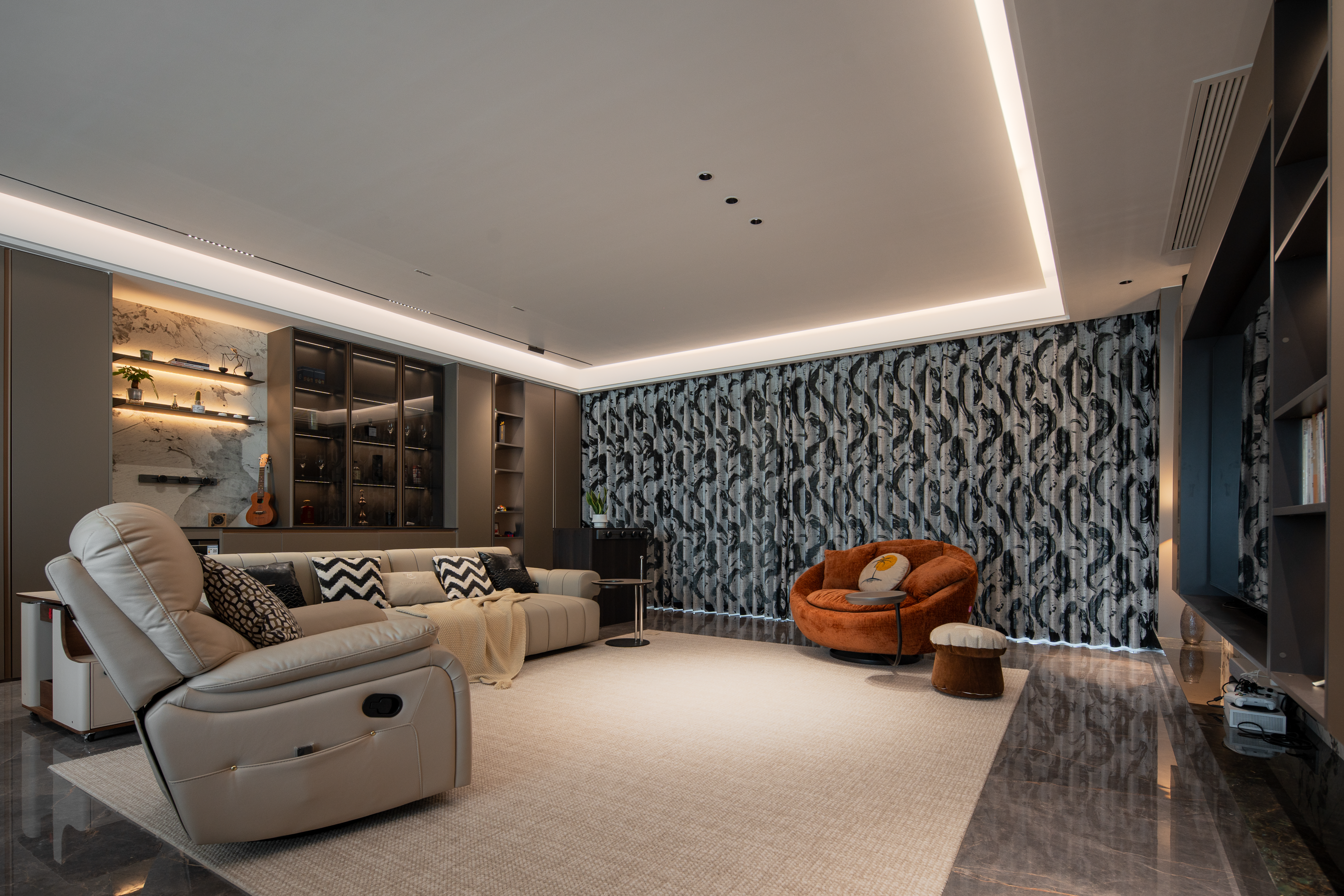 2.空间以简洁大气的硬装为基底,墙面运用高级灰调与天然石材纹理交织,石材的自然肌理赋予空间原生质感,灰调则沉淀出静谧的优雅氛围。水墨纹理窗帘,似流动的艺术笔触,开合间切换空间氛围。大面积落地窗引入自然光线,与室内灯光呼应,延伸视觉边界。从材质的精挑细选到布局的精妙考量,将奢雅融入每一处细节。于舒适日常中,演绎不张扬的高级质感,让家成为品味与生活共鸣的私属场域。 -