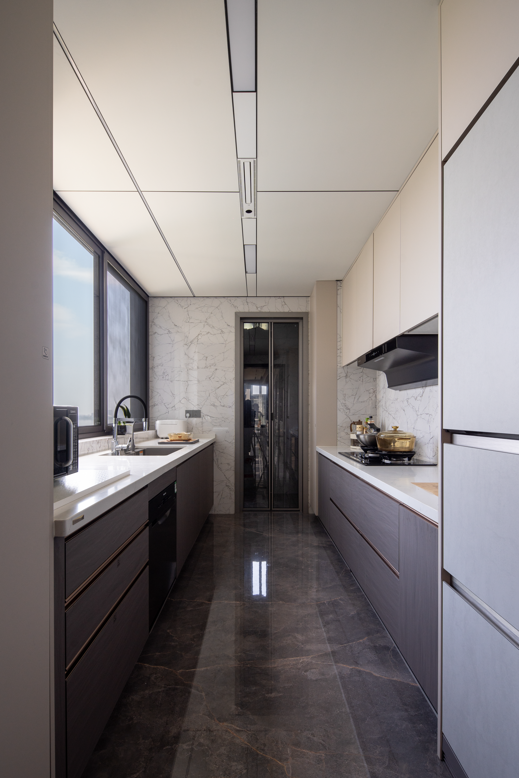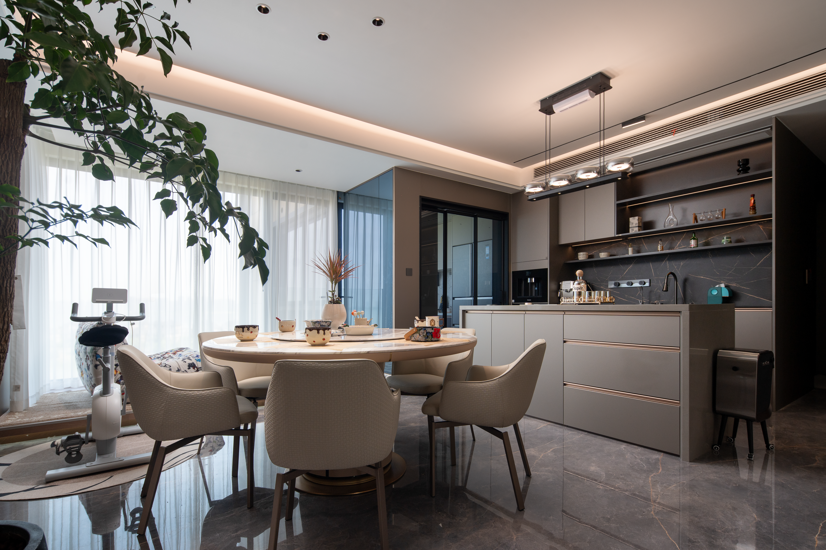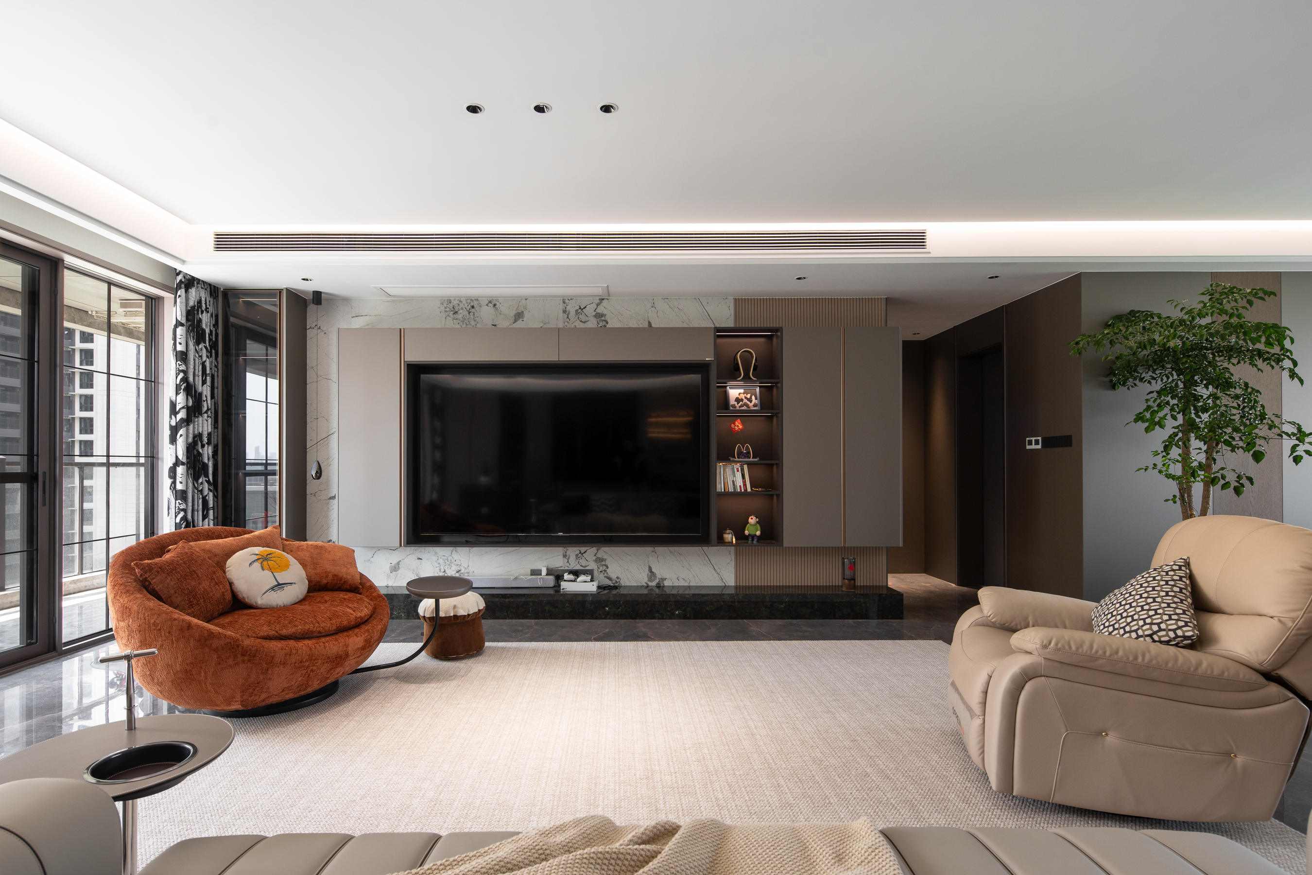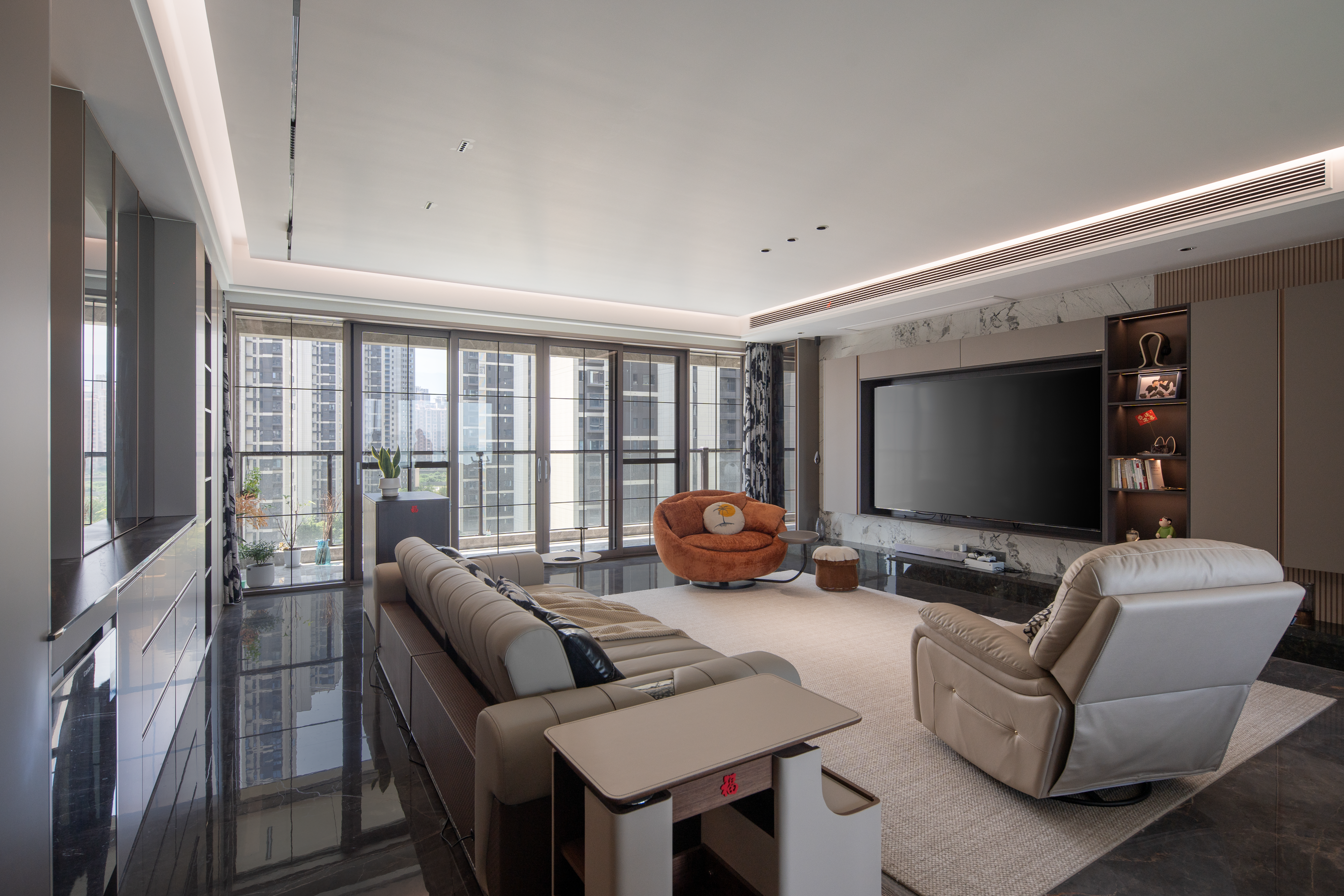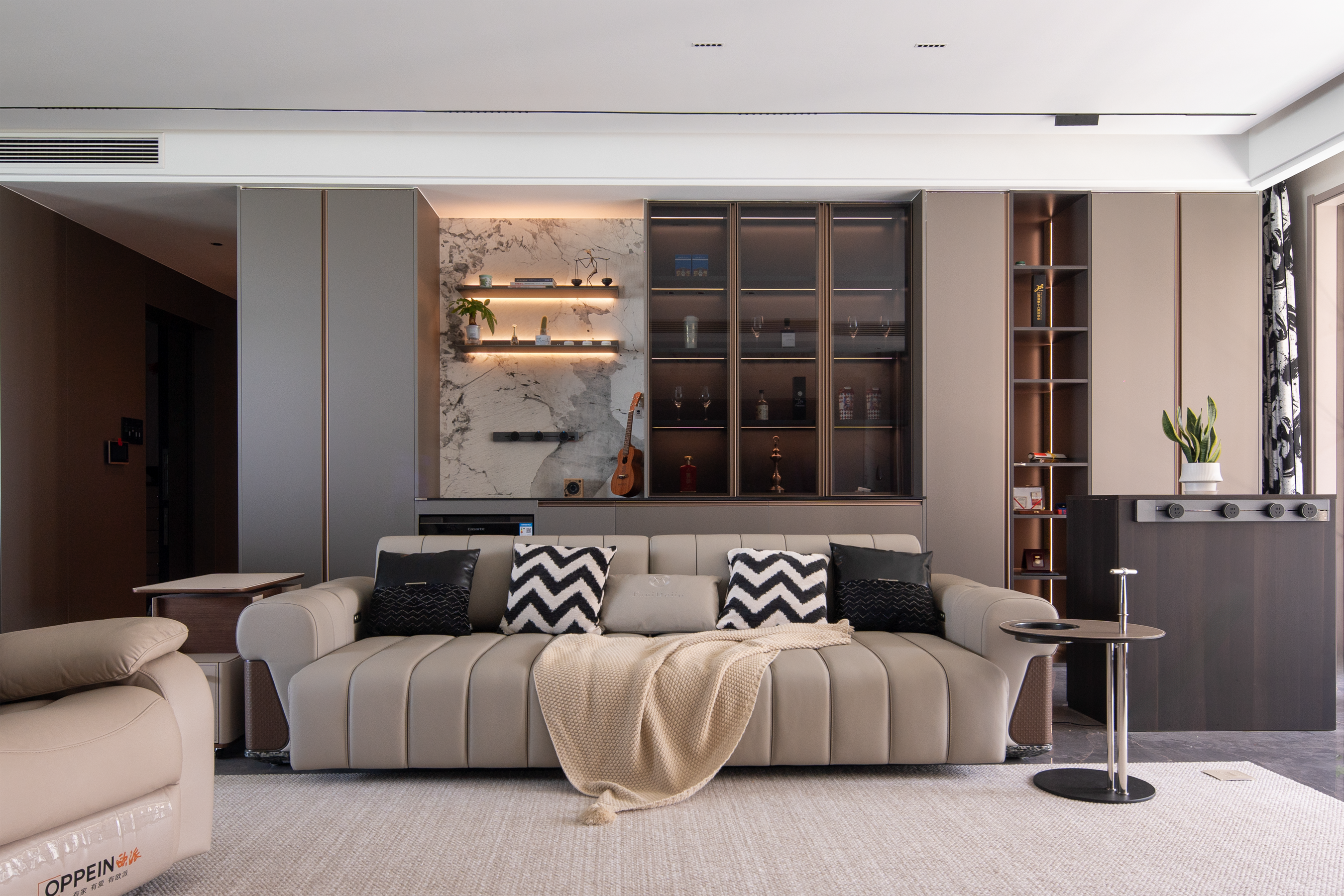 2.空间以简洁大气的硬装为基底,墙面运用高级灰调与天然石材纹理交织,石材的自然肌理赋予空间原生质感,灰调则沉淀出静谧的优雅氛围。水墨纹理窗帘,似流动的艺术笔触,开合间切换空间氛围。大面积落地窗引入自然光线,与室内灯光呼应,延伸视觉边界。从材质的精挑细选到布局的精妙考量,将奢雅融入每一处细节。于舒适日常中,演绎不张扬的高级质感,让家成为品味与生活共鸣的私属场域。 -