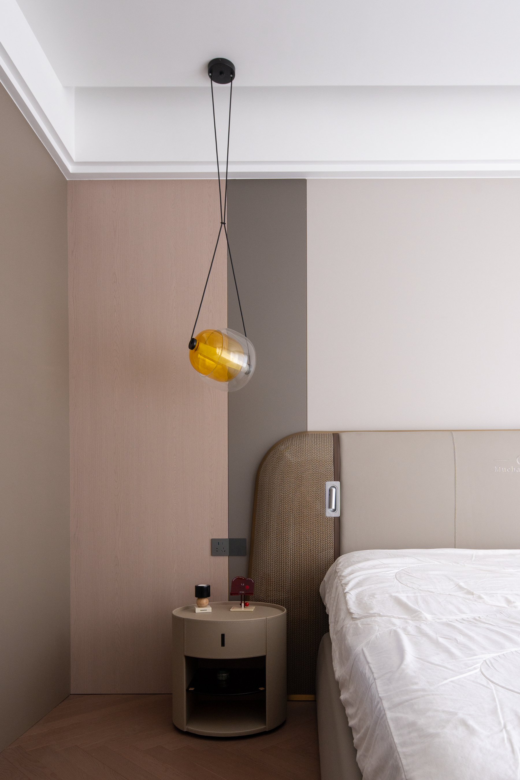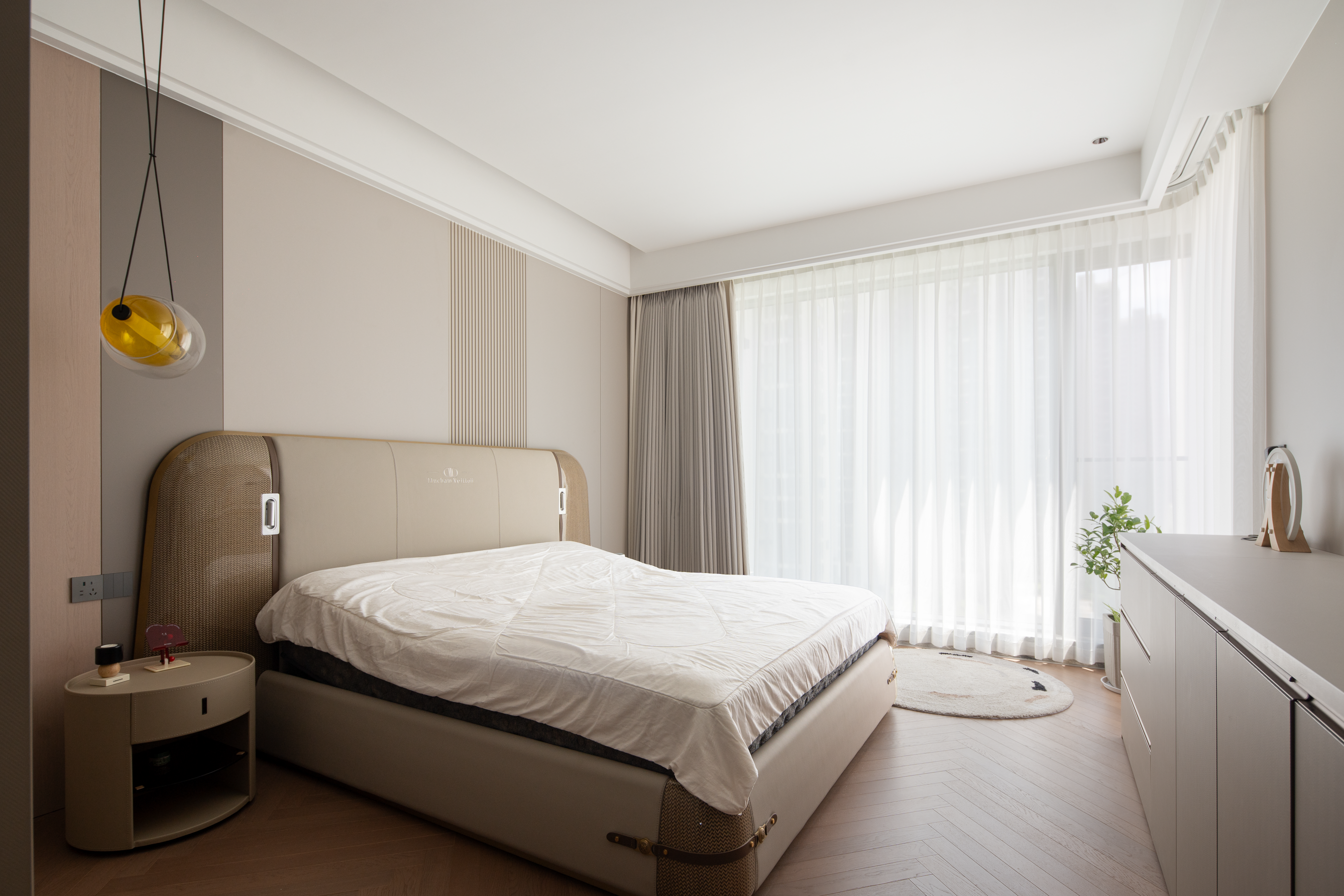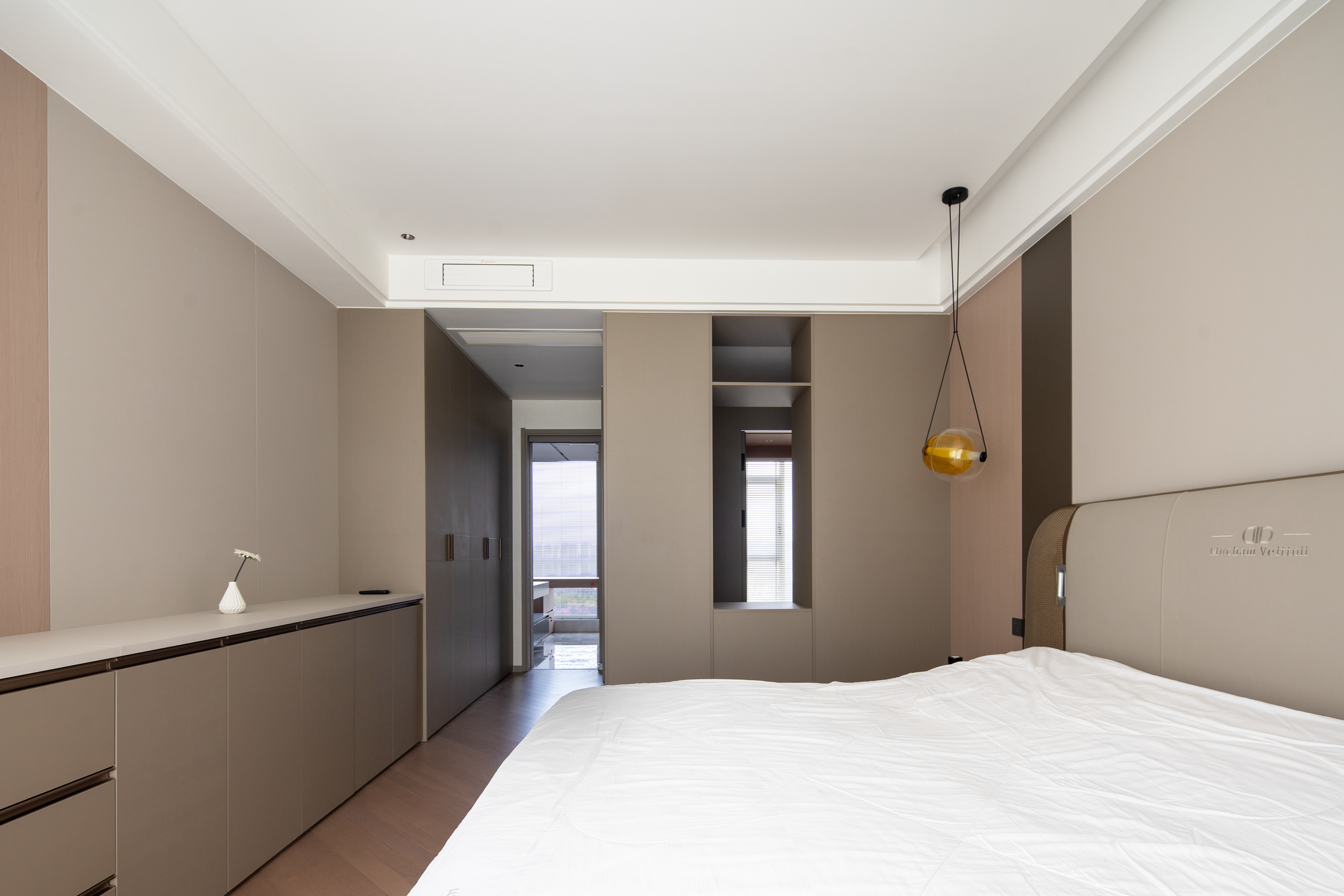 2.在深入勘察现场承重结构的基础上,设计师对主卧的开门方向进行了精准调整——将原本朝向入户过道的布局,巧妙改至内部玄关空间。这一改动,既避免了入户动线与卧室私密领域的碰撞,又借由玄关的过渡,让主卧入口形成层层递进的空间韵律,从踏入的瞬间便氤氲出静谧私密的氛围。同时对于入户房间内卫的暗卫问题,设计师以结构调整为突破口,着力增强采光与卧室空间感。通过科学拆除非承重墙体、增设通透的隔断设计,打破封闭沉闷的格局,让自然光得以自在流淌。