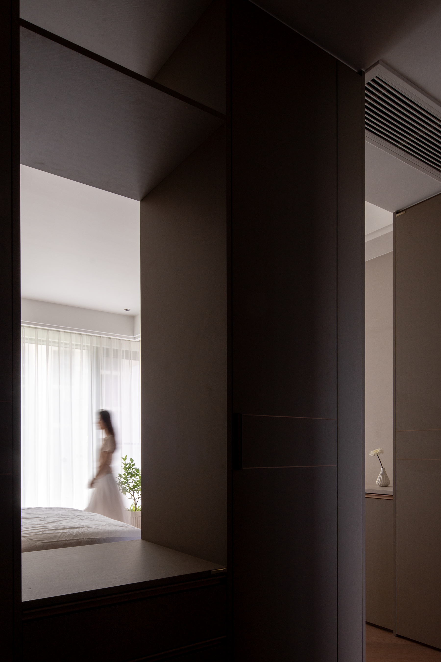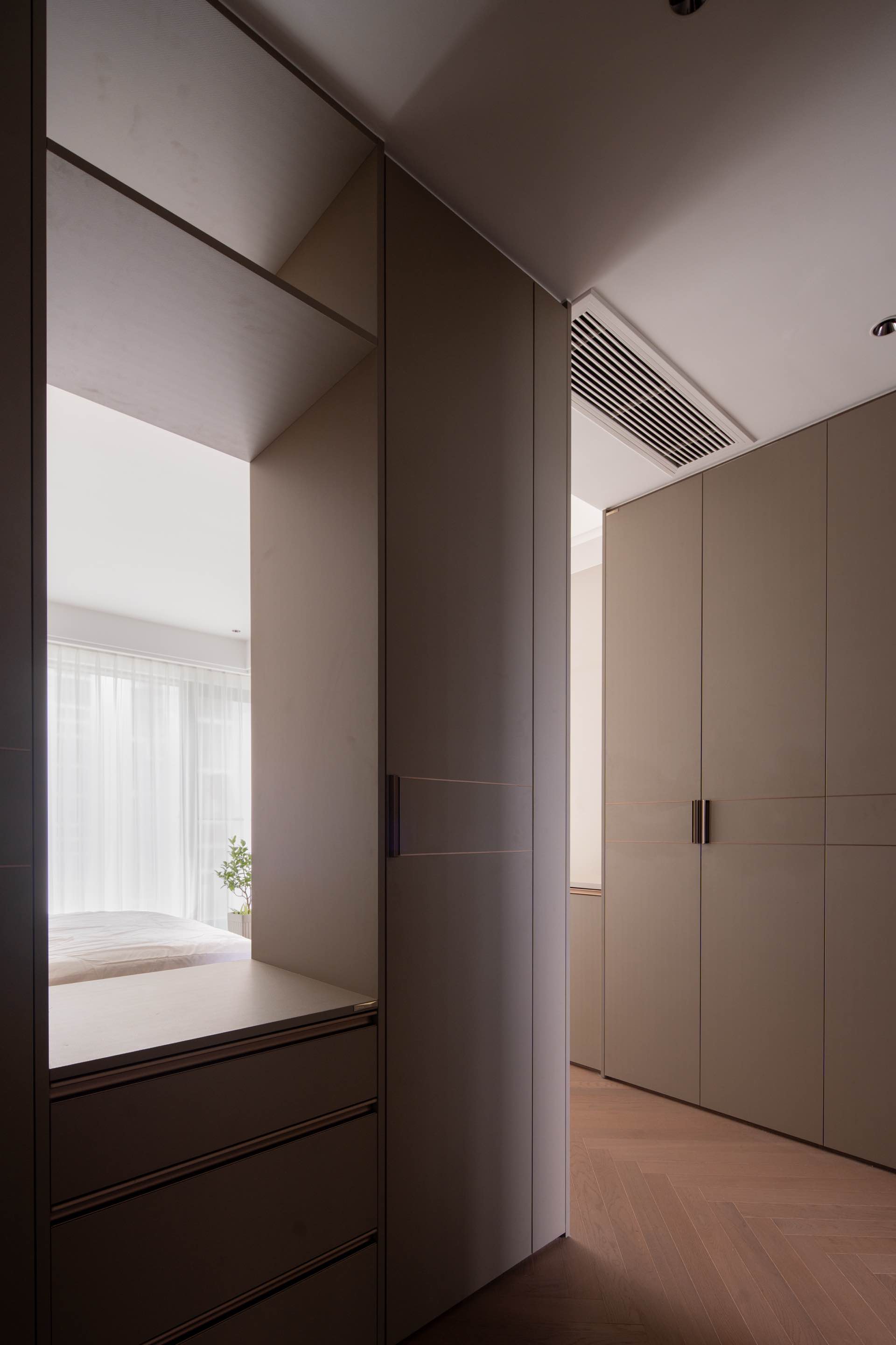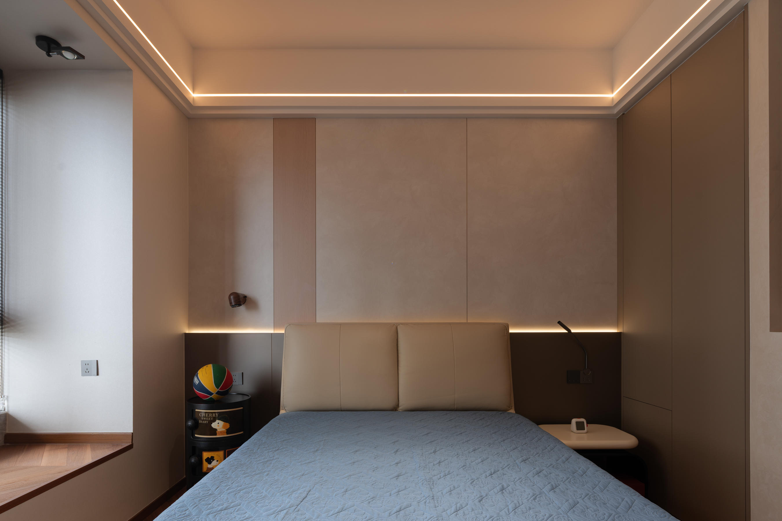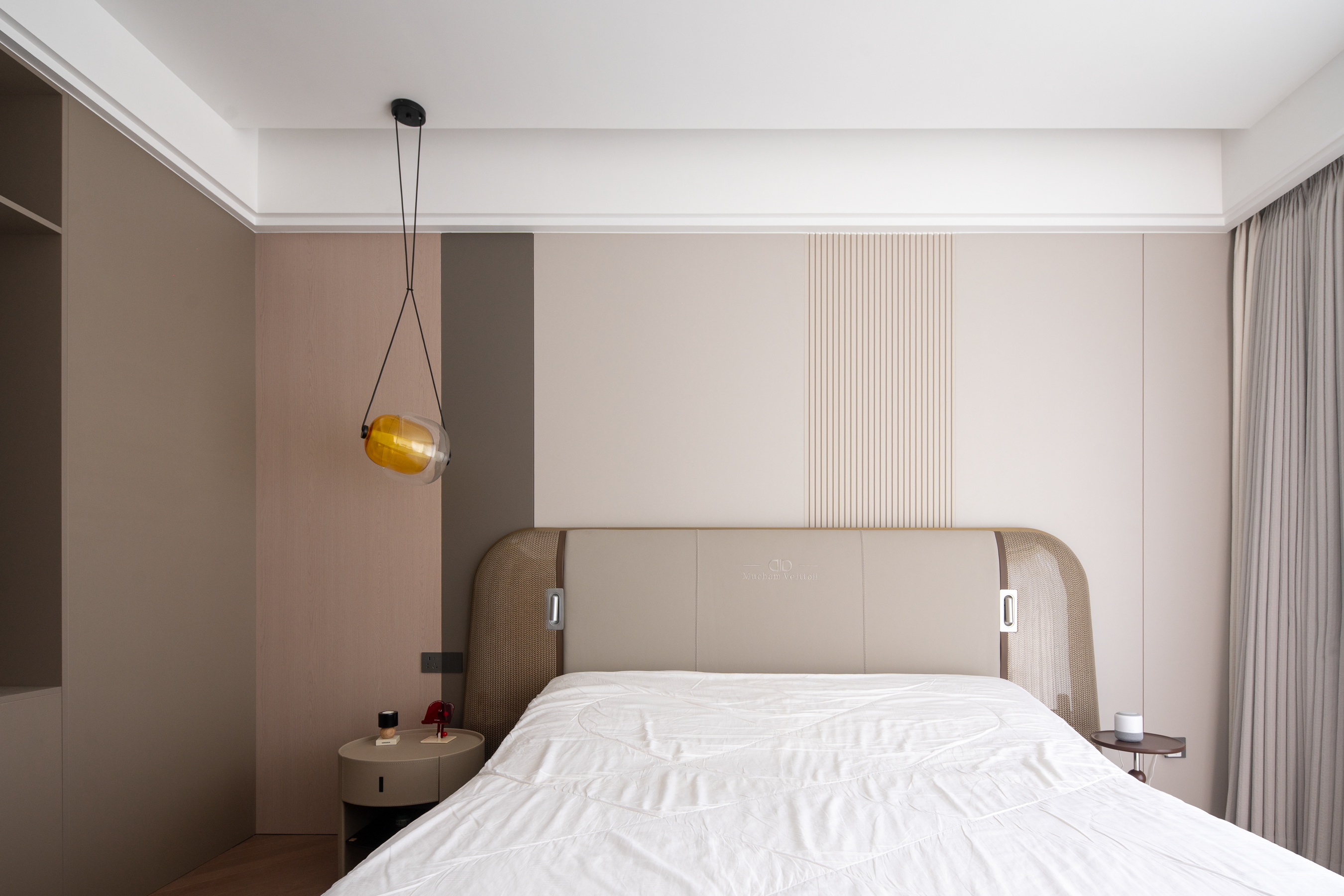2.在深入勘察现场承重结构的基础上,设计师对主卧的开门方向进行了精准调整——将原本朝向入户过道的布局,巧妙改至内部玄关空间。这一改动,既避免了入户动线与卧室私密领域的碰撞,又借由玄关的过渡,让主卧入口形成层层递进的空间韵律,从踏入的瞬间便氤氲出静谧私密的氛围。同时对于入户房间内卫的暗卫问题,设计师以结构调整为突破口,着力增强采光与卧室空间感。通过科学拆除非承重墙体、增设通透的隔断设计,打破封闭沉闷的格局,让自然光得以自在流淌。