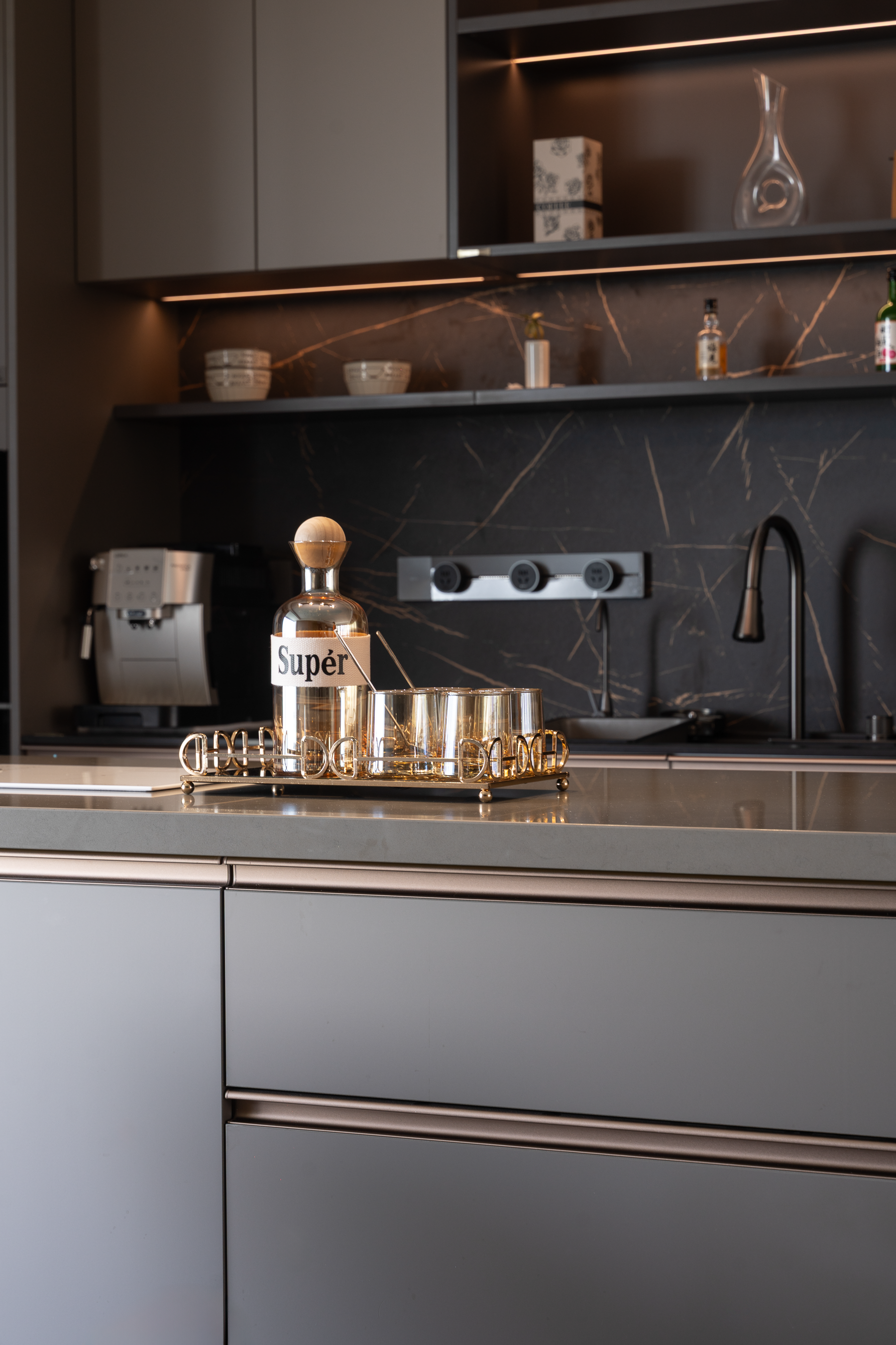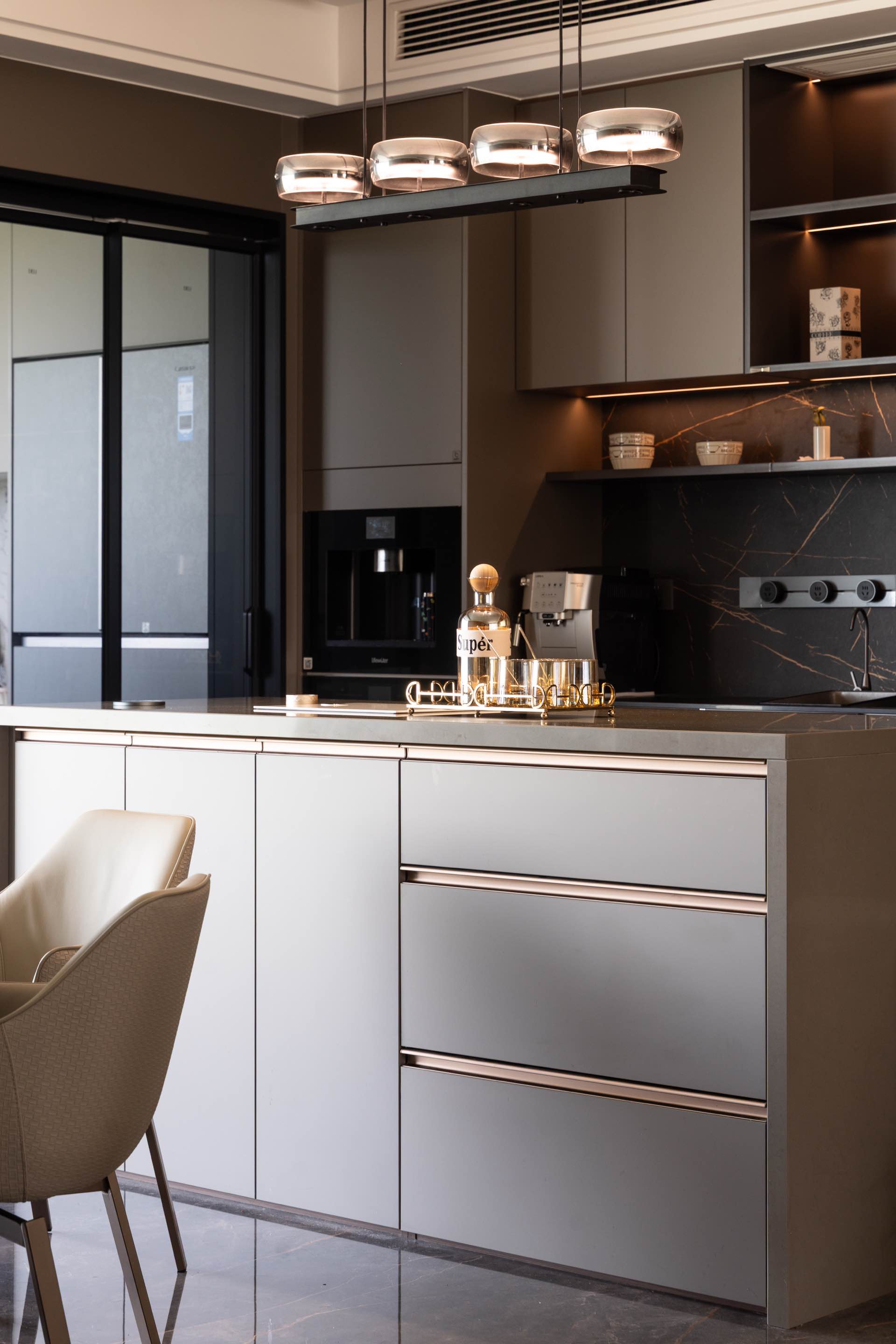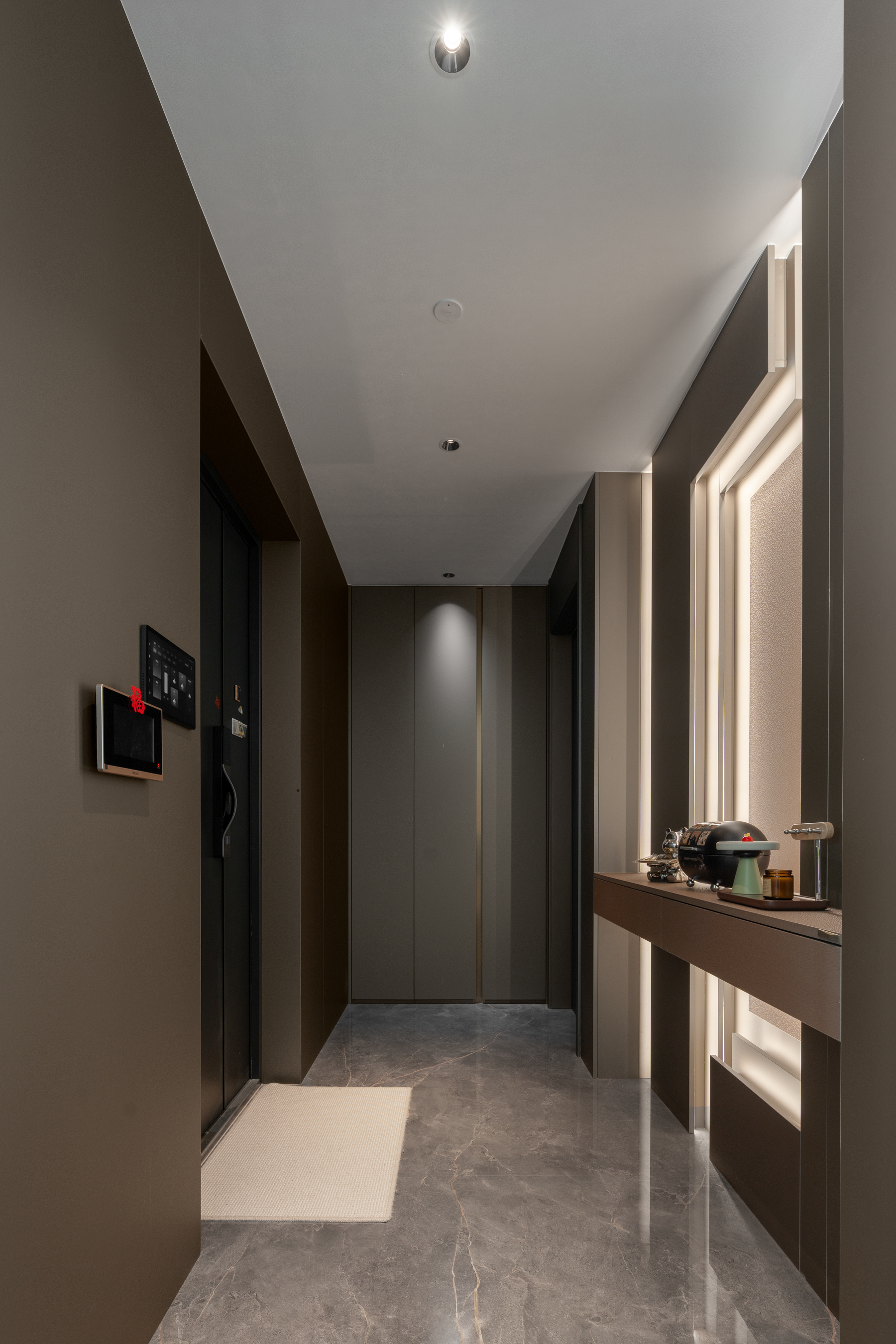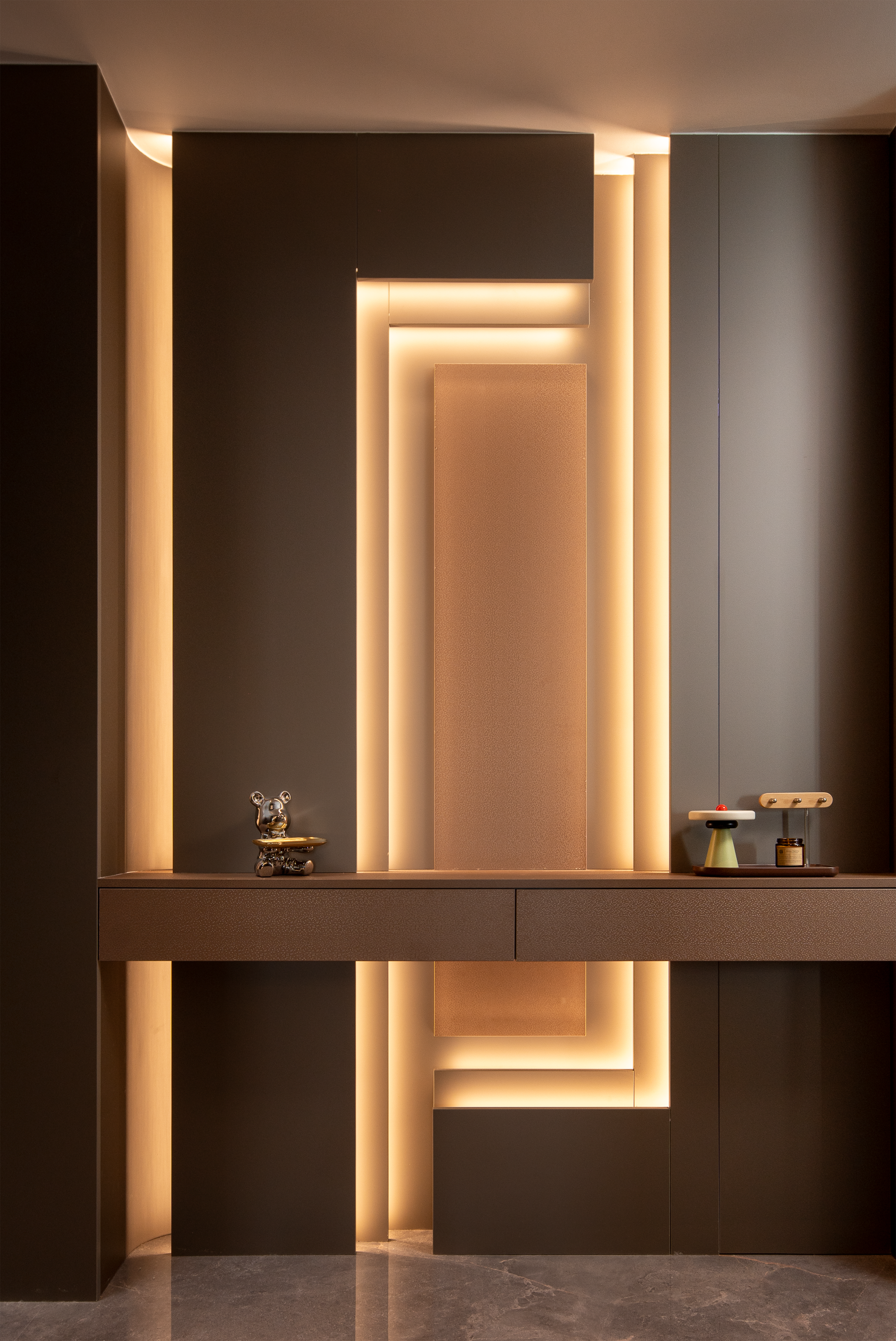 空间意境:1.玄关作为空间过渡的关键性场域,以低饱和深棕为主色调,构建沉稳高级的基底,辅以线性灯光勾勒立面轮廓,消解狭长空间的逼仄感。明暗交织间,意式轻奢的优雅张力悄然蔓延。端景台上陈列的艺术小物,是生活品味的微观注脚,让每一次归家都成为沉浸式美学之旅,启幕家的温柔。
