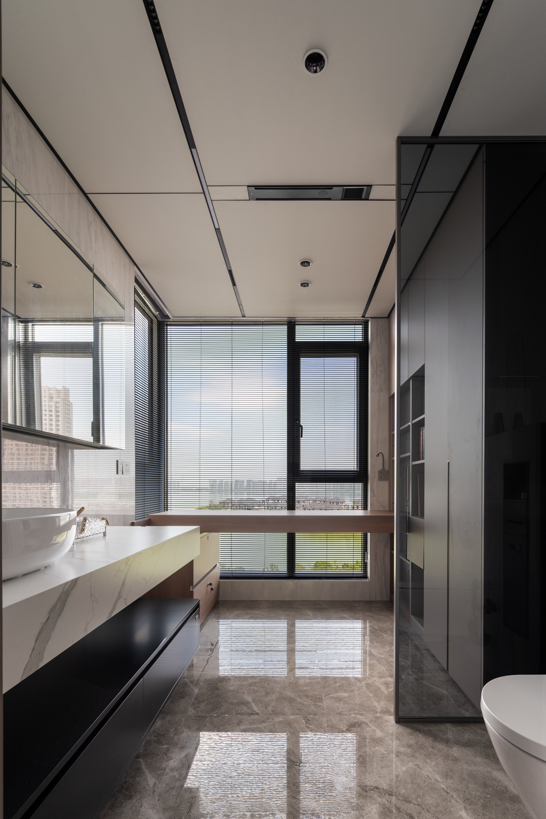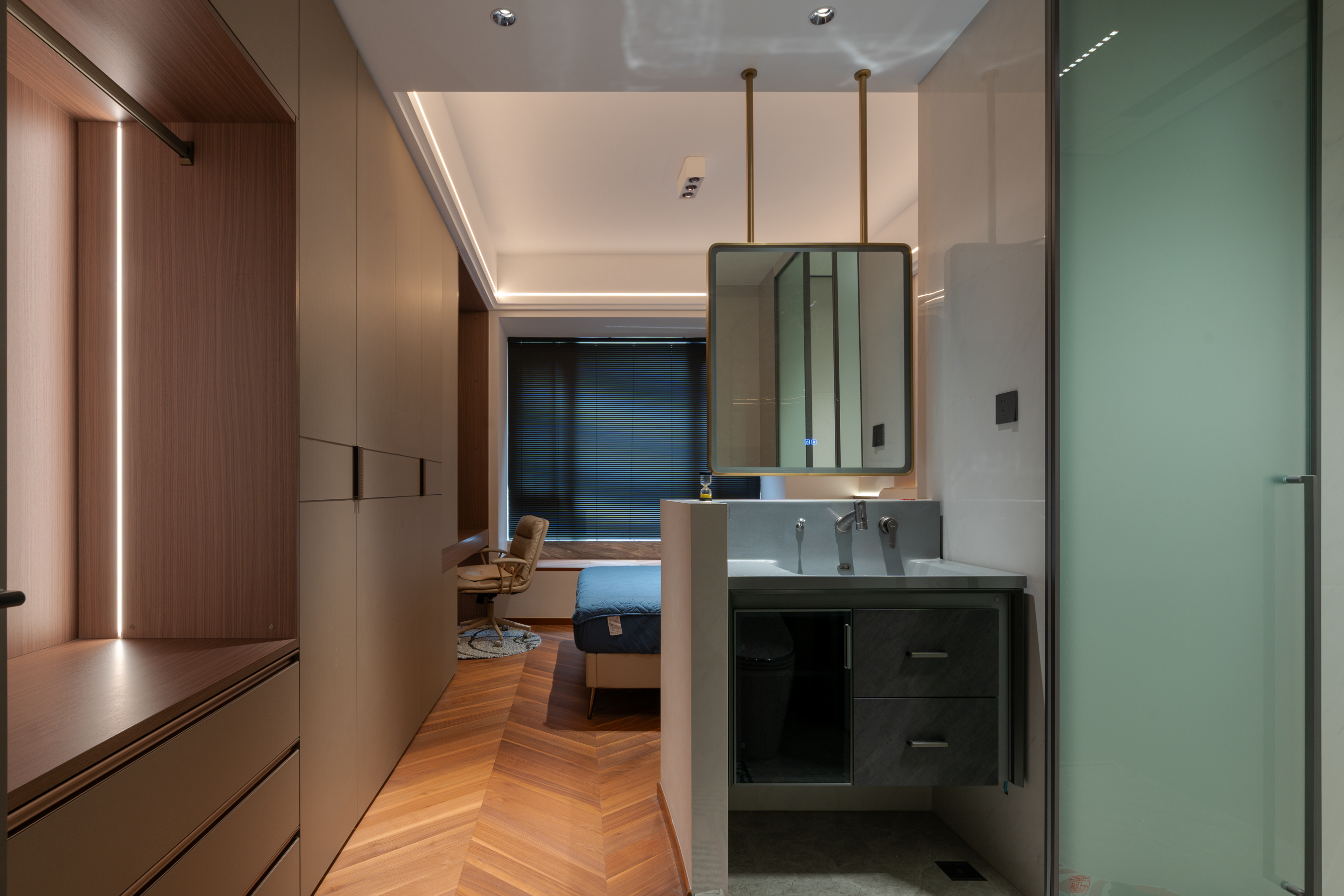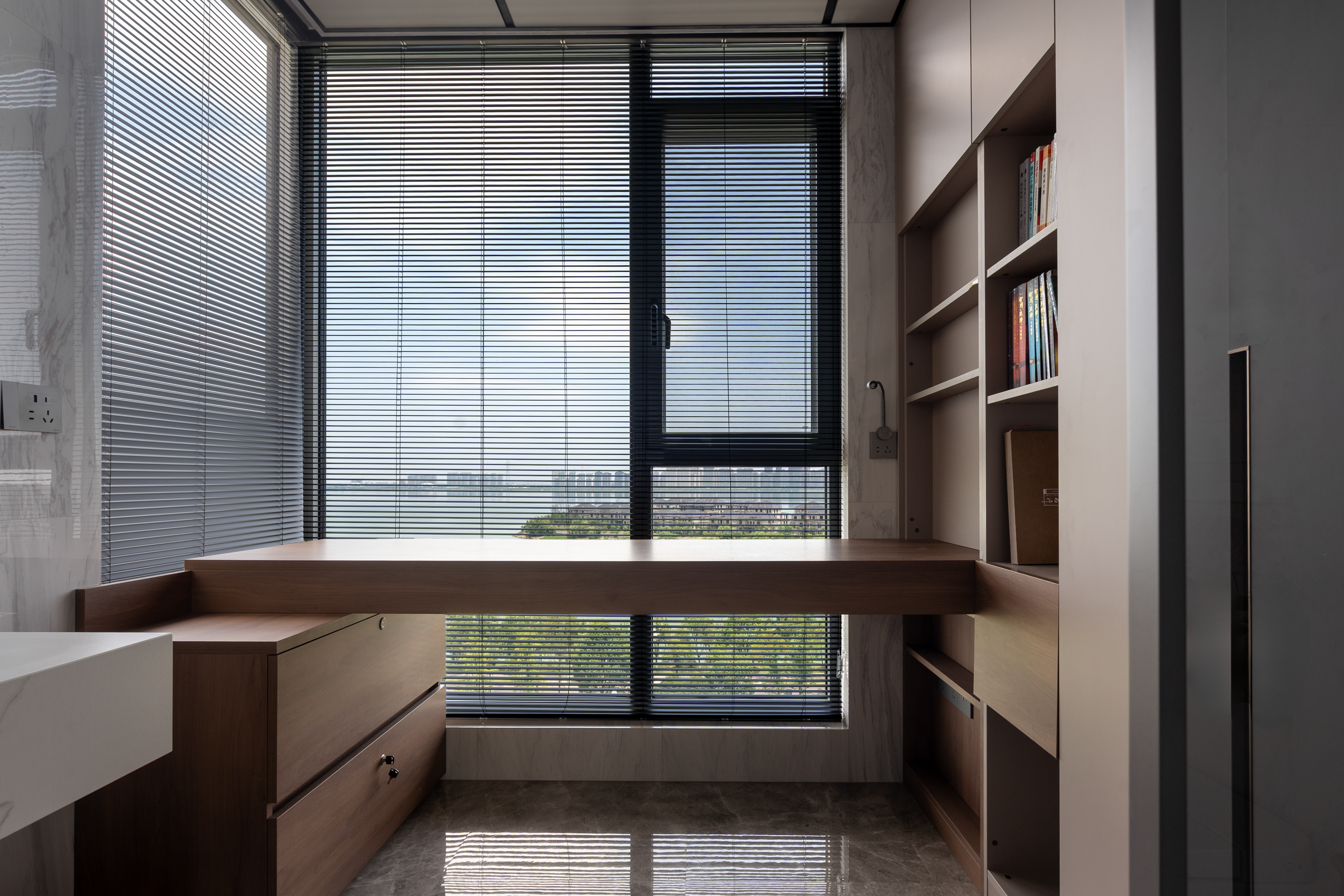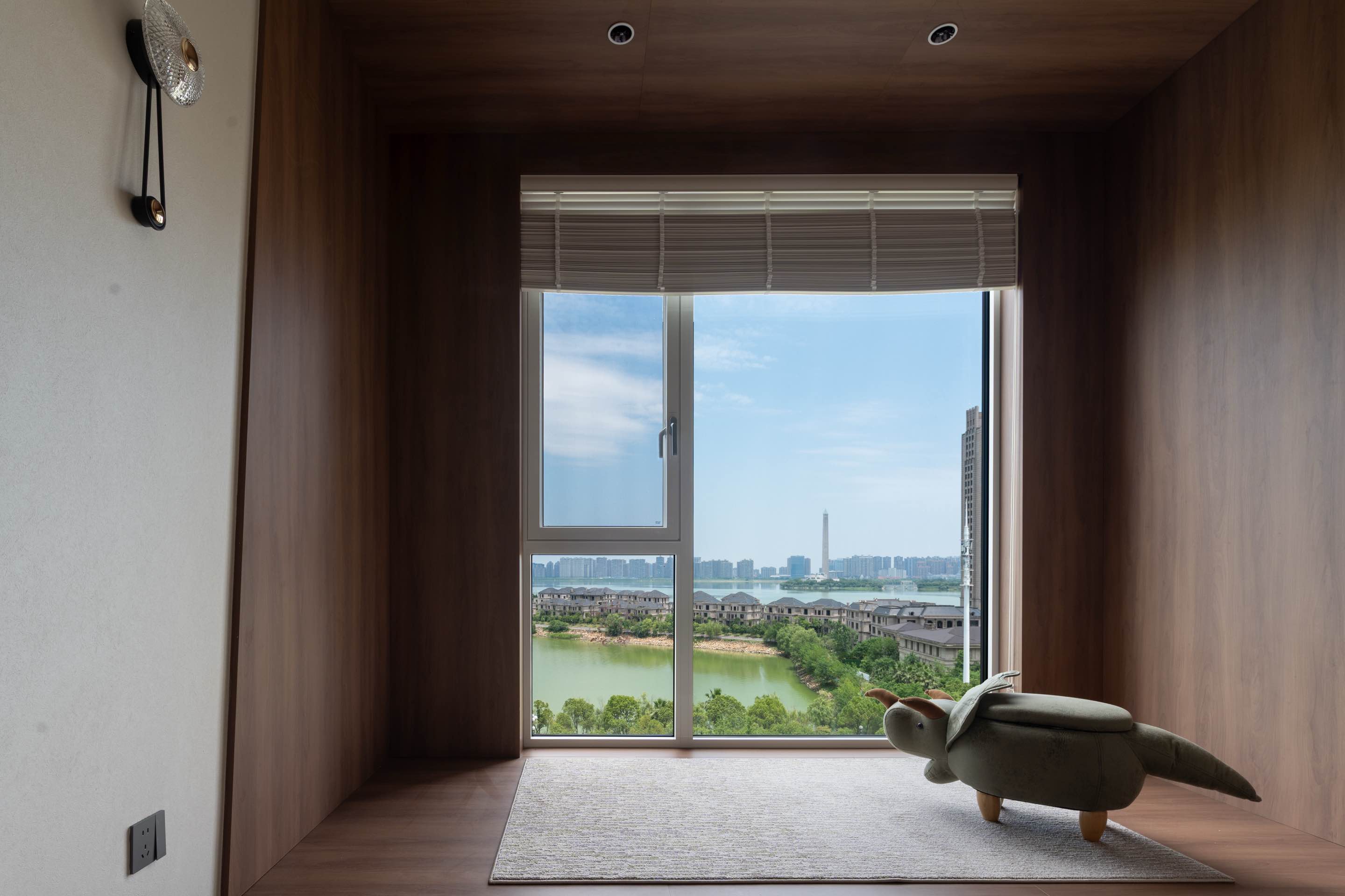 3.以生活场景为核心重构空间逻辑,设计师将主卧升级为集休憩、收纳、观景、办公于一体的复合型套间。保留并强化衣帽间的实用功能,让衣物收纳井然有序;临窗打造观湖休闲区,引入自然景致与天光,营造松弛的休憩氛围。针对主卫使用率较低的实际情况,设计师将其改造为观湖书房——既延续了观景优势、又为居家办公、阅读思考提供专属场域,实现功能与意境的双重升级。 -
