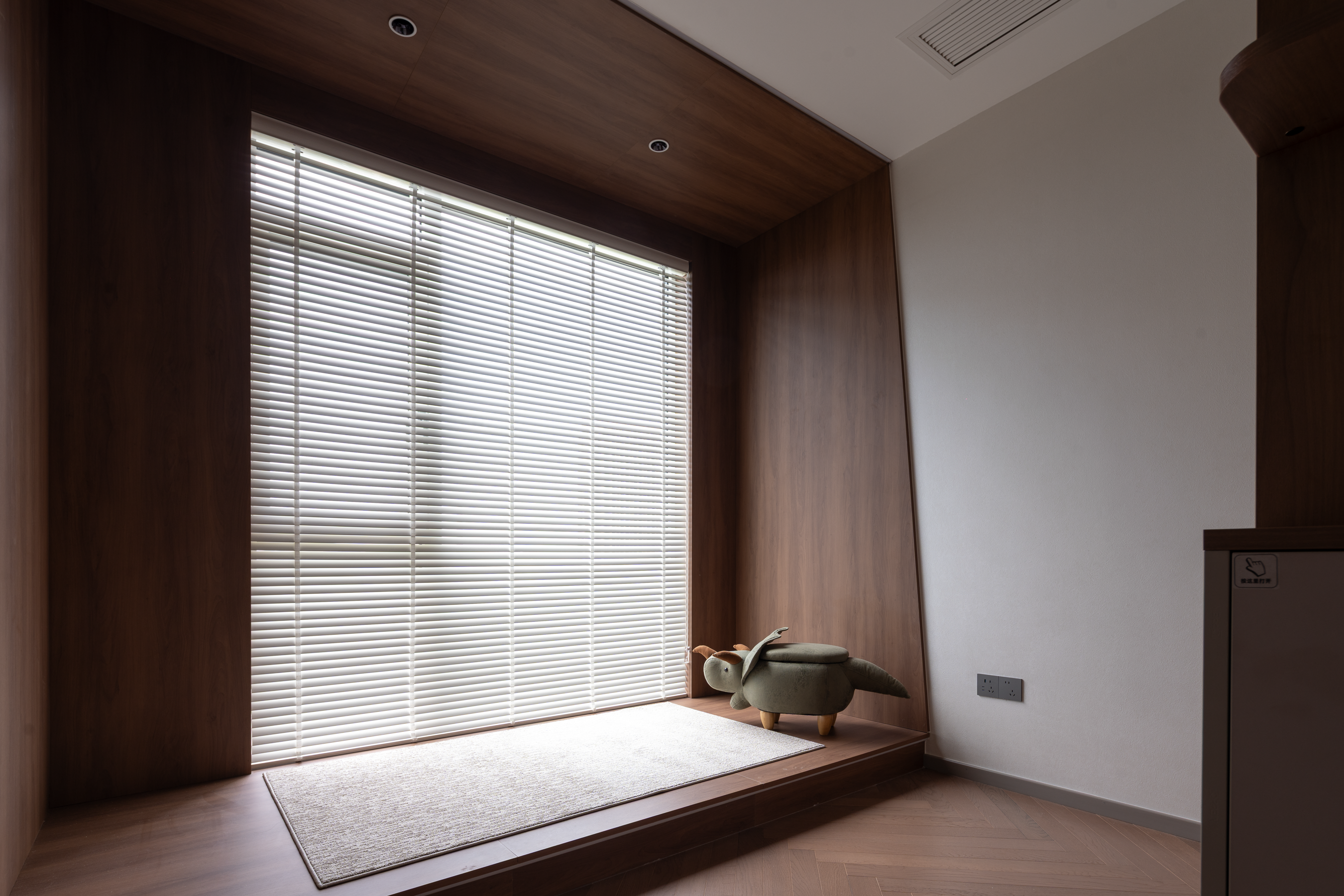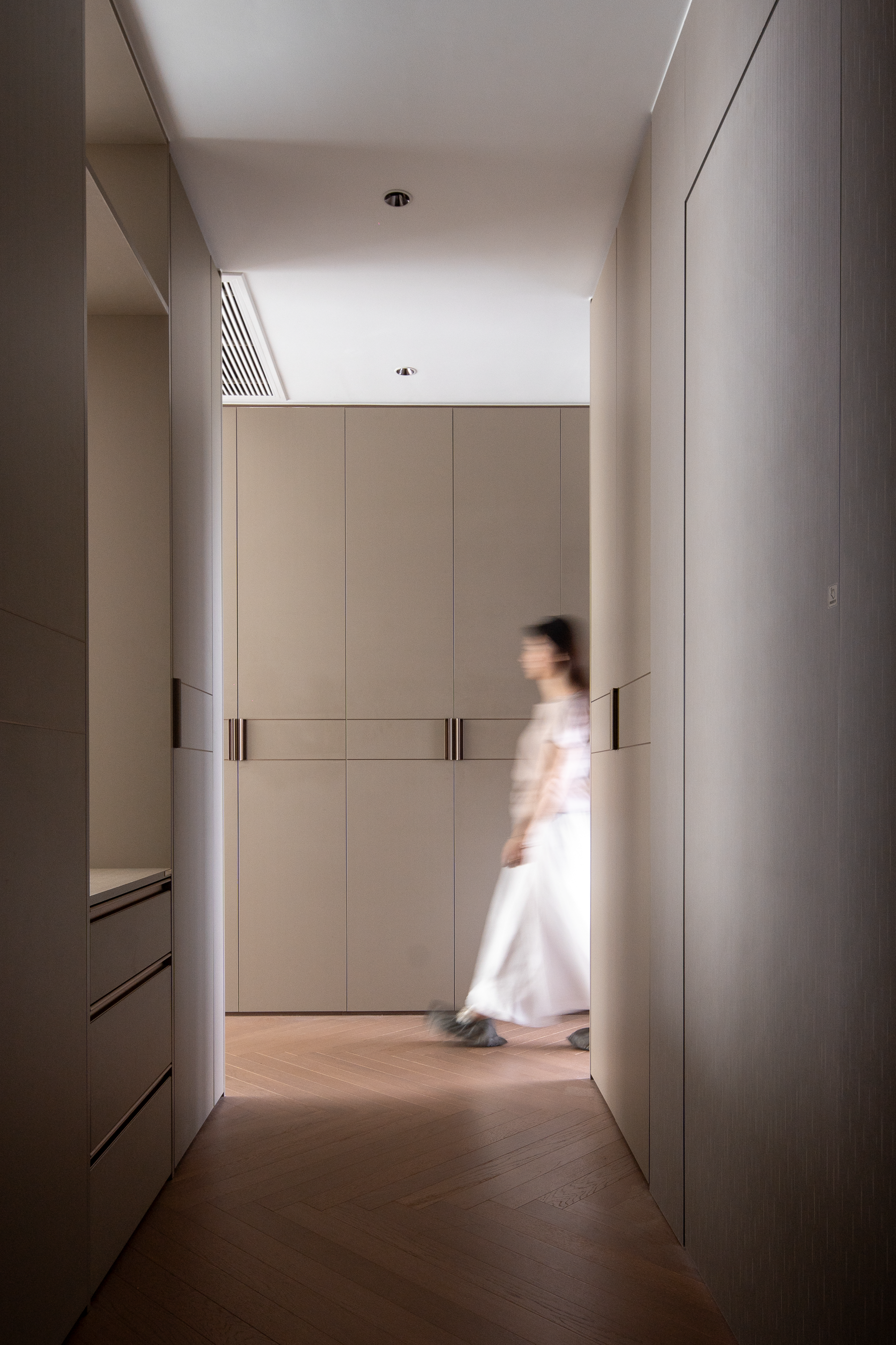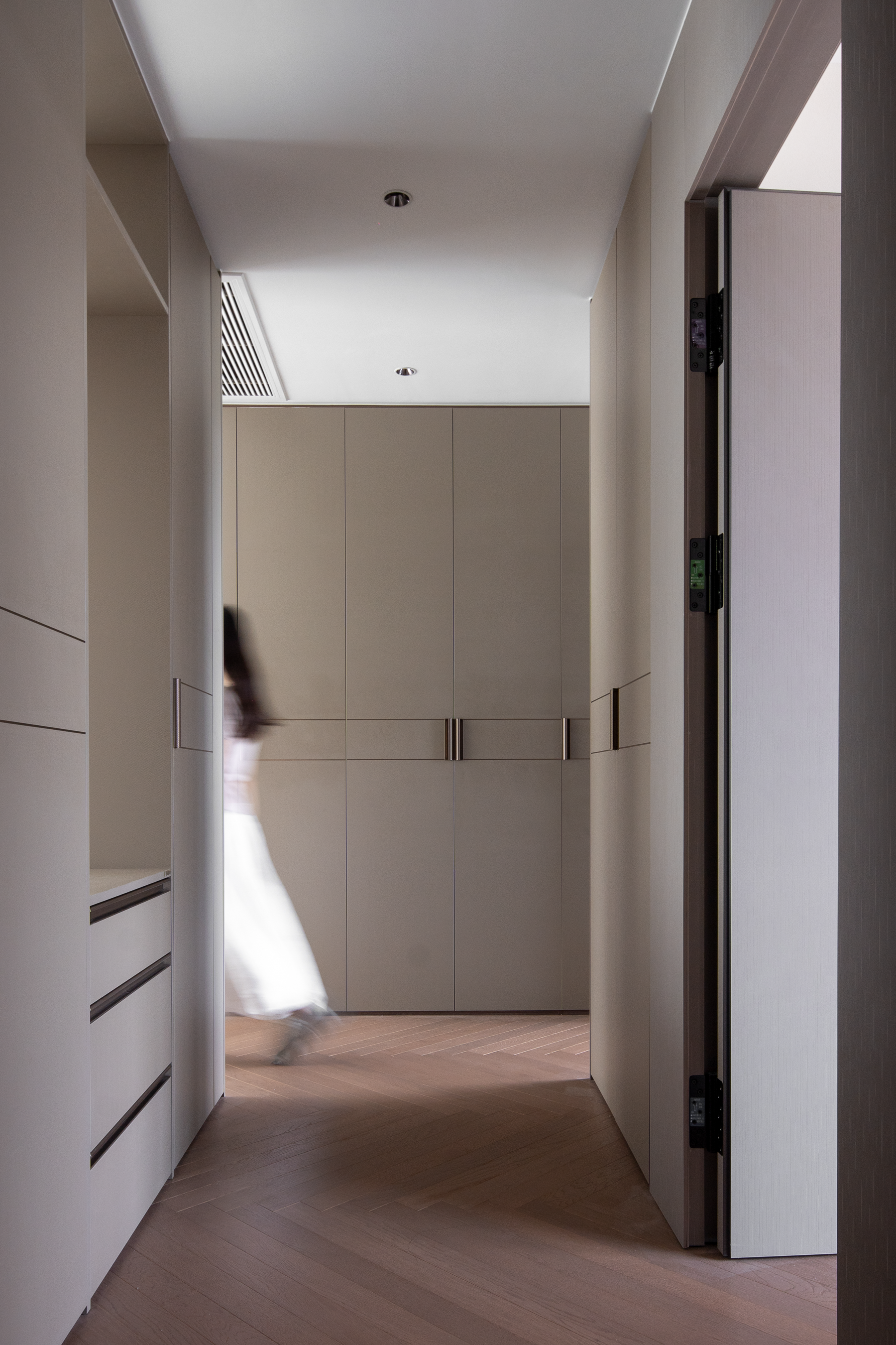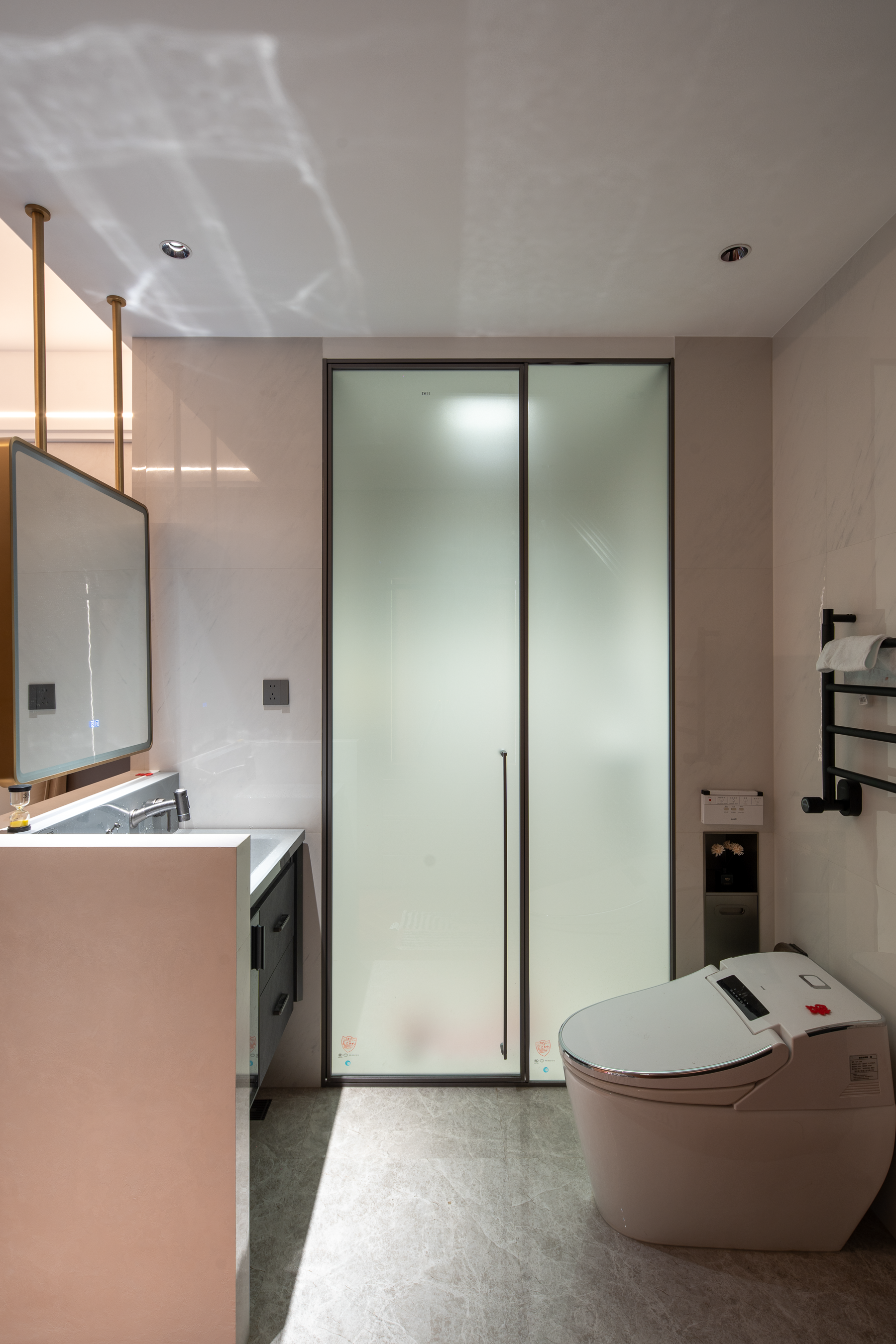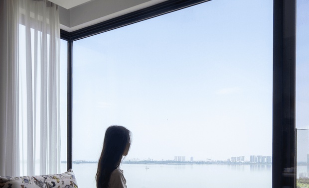 3.以生活场景为核心重构空间逻辑,设计师将主卧升级为集休憩、收纳、观景、办公于一体的复合型套间。保留并强化衣帽间的实用功能,让衣物收纳井然有序;临窗打造观湖休闲区,引入自然景致与天光,营造松弛的休憩氛围。针对主卫使用率较低的实际情况,设计师将其改造为观湖书房——既延续了观景优势、又为居家办公、阅读思考提供专属场域,实现功能与意境的双重升级。 -