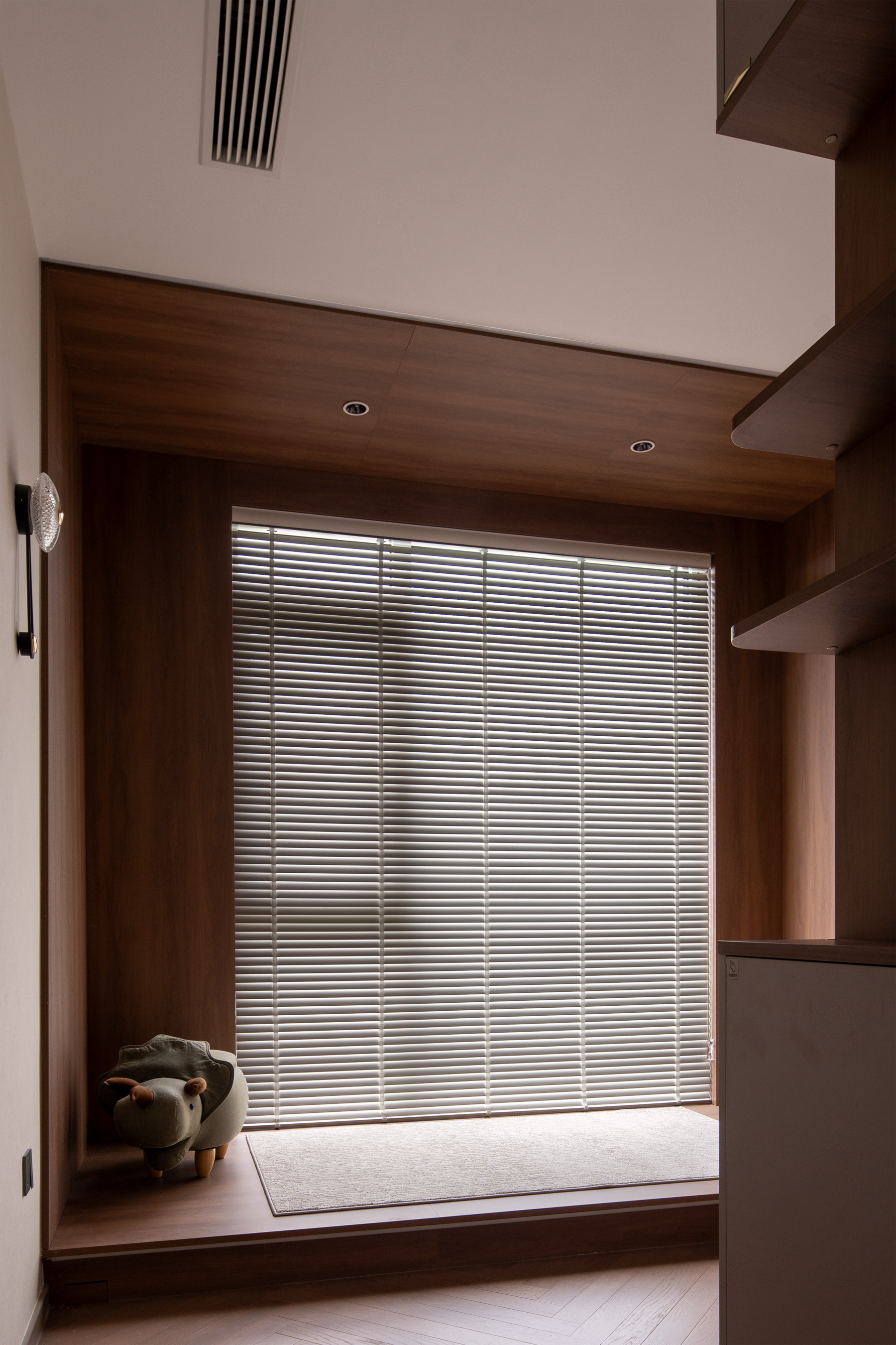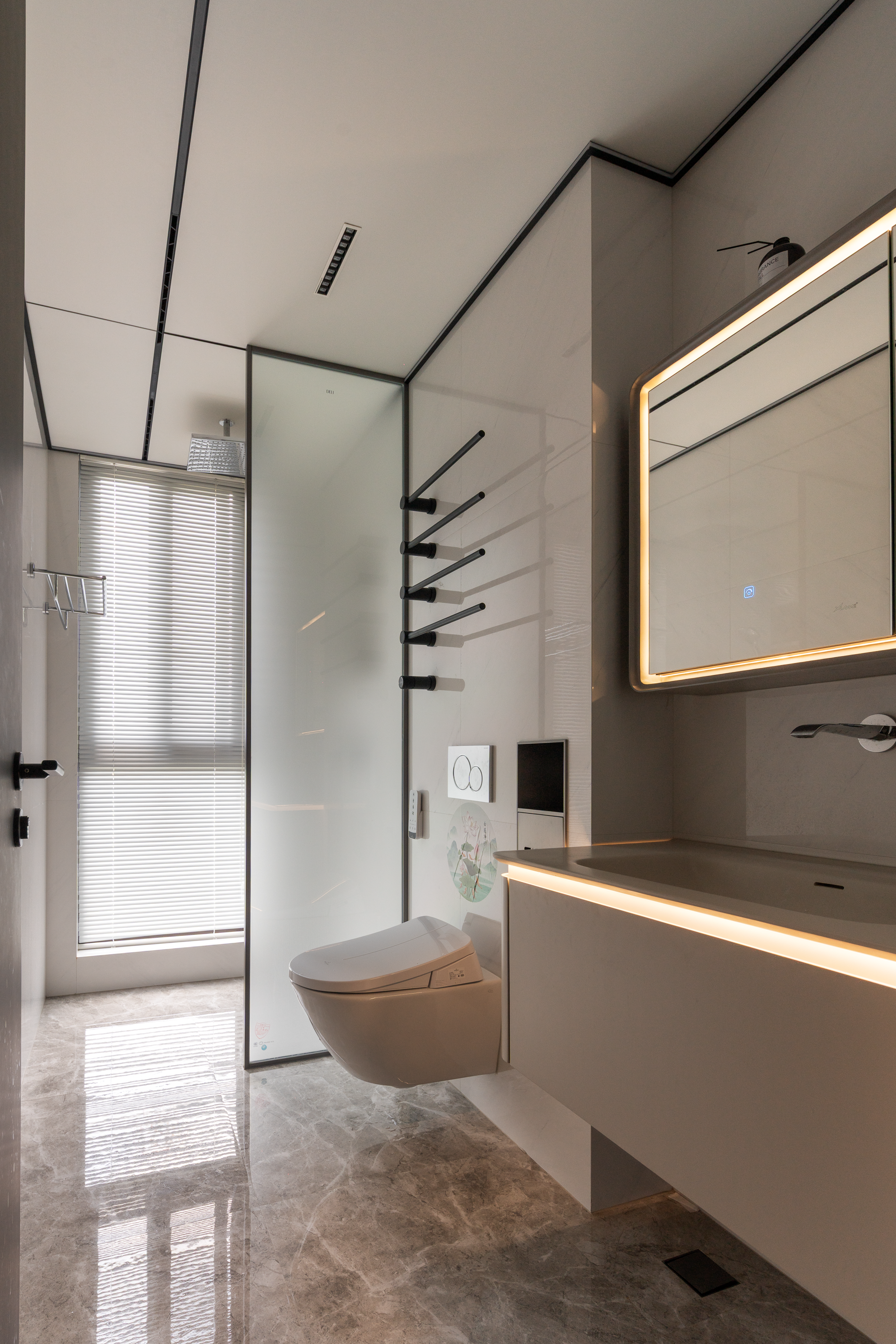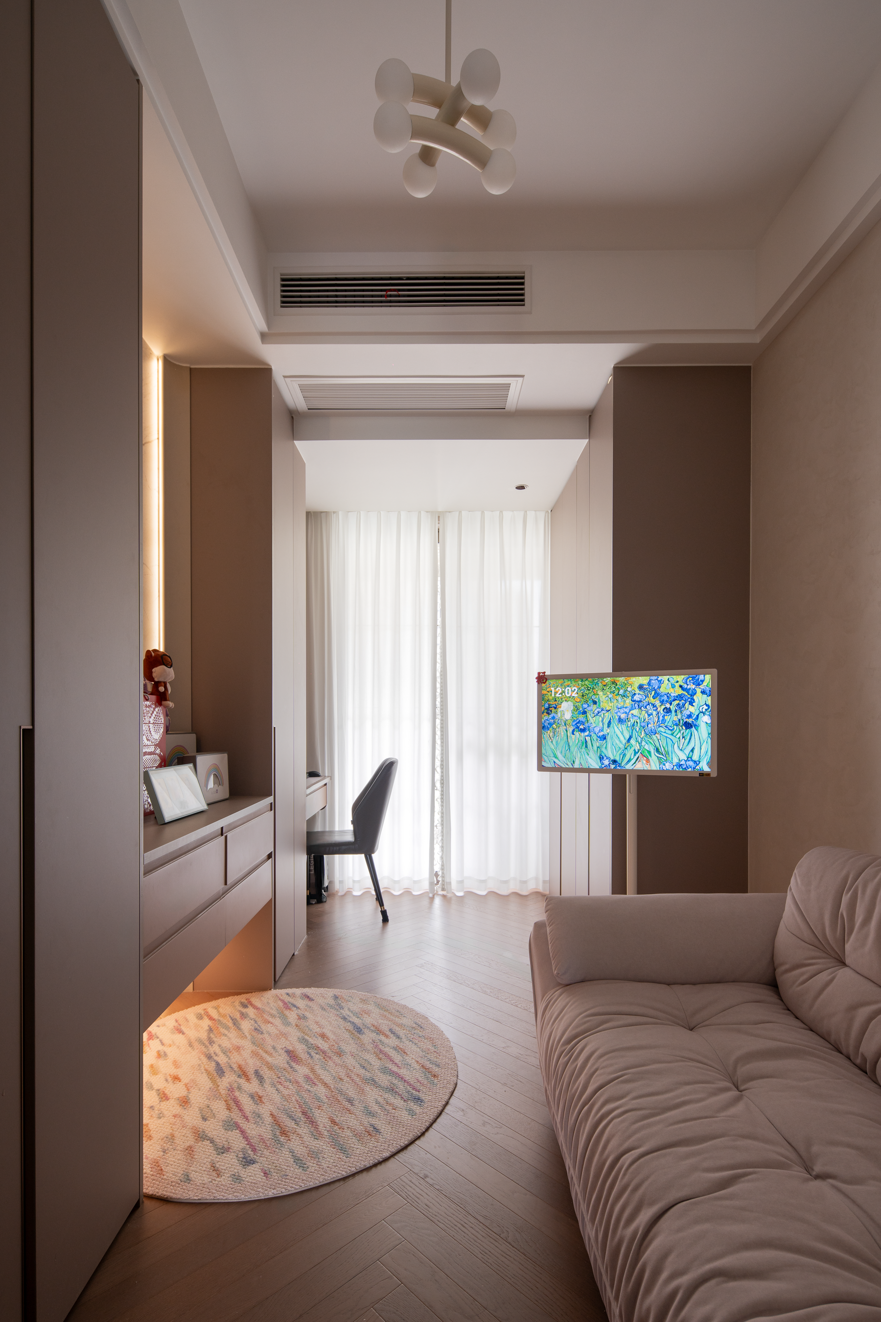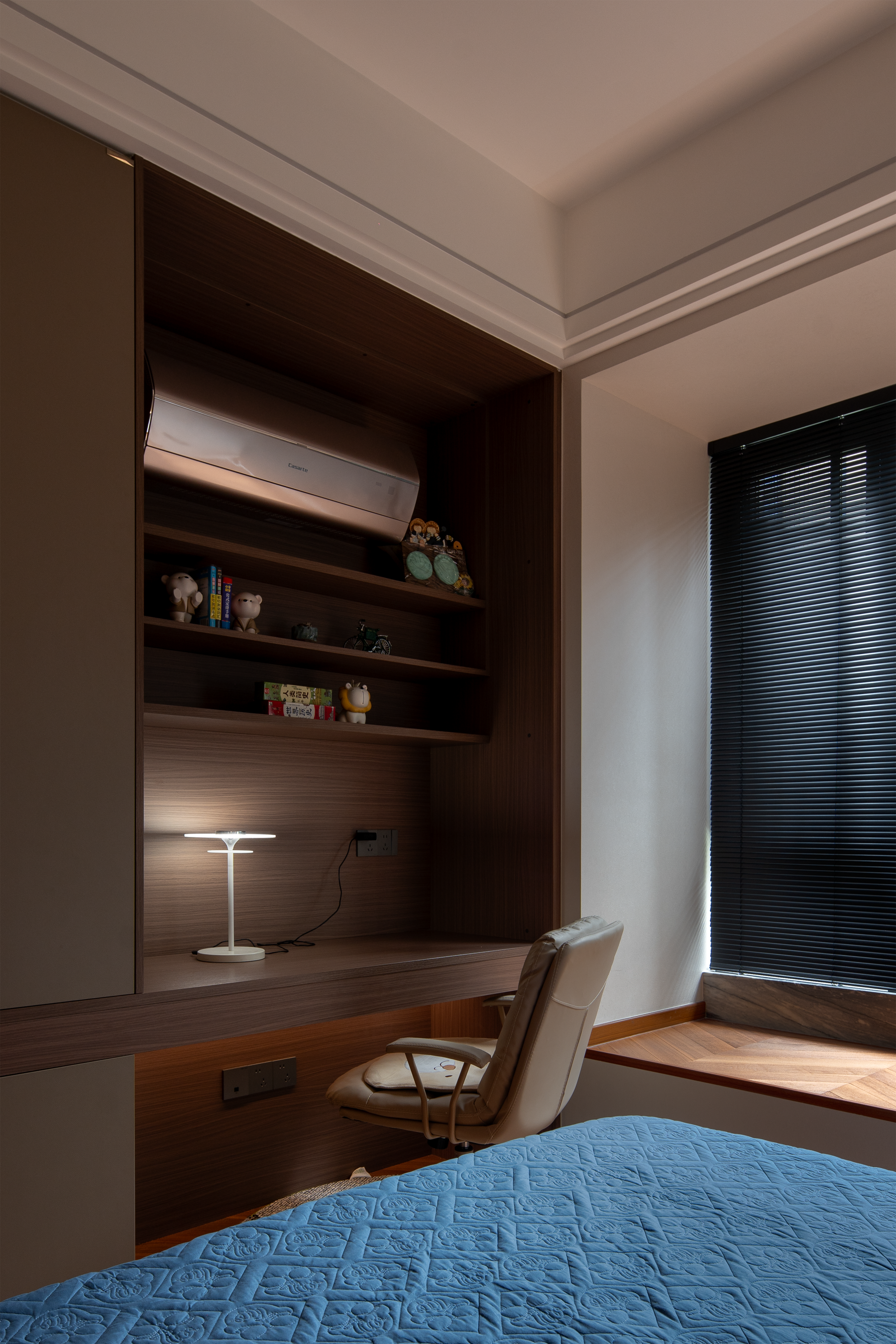 3.以生活场景为核心重构空间逻辑,设计师将主卧升级为集休憩、收纳、观景、办公于一体的复合型套间。保留并强化衣帽间的实用功能,让衣物收纳井然有序;临窗打造观湖休闲区,引入自然景致与天光,营造松弛的休憩氛围。针对主卫使用率较低的实际情况,设计师将其改造为观湖书房——既延续了观景优势、又为居家办公、阅读思考提供专属场域,实现功能与意境的双重升级。 -