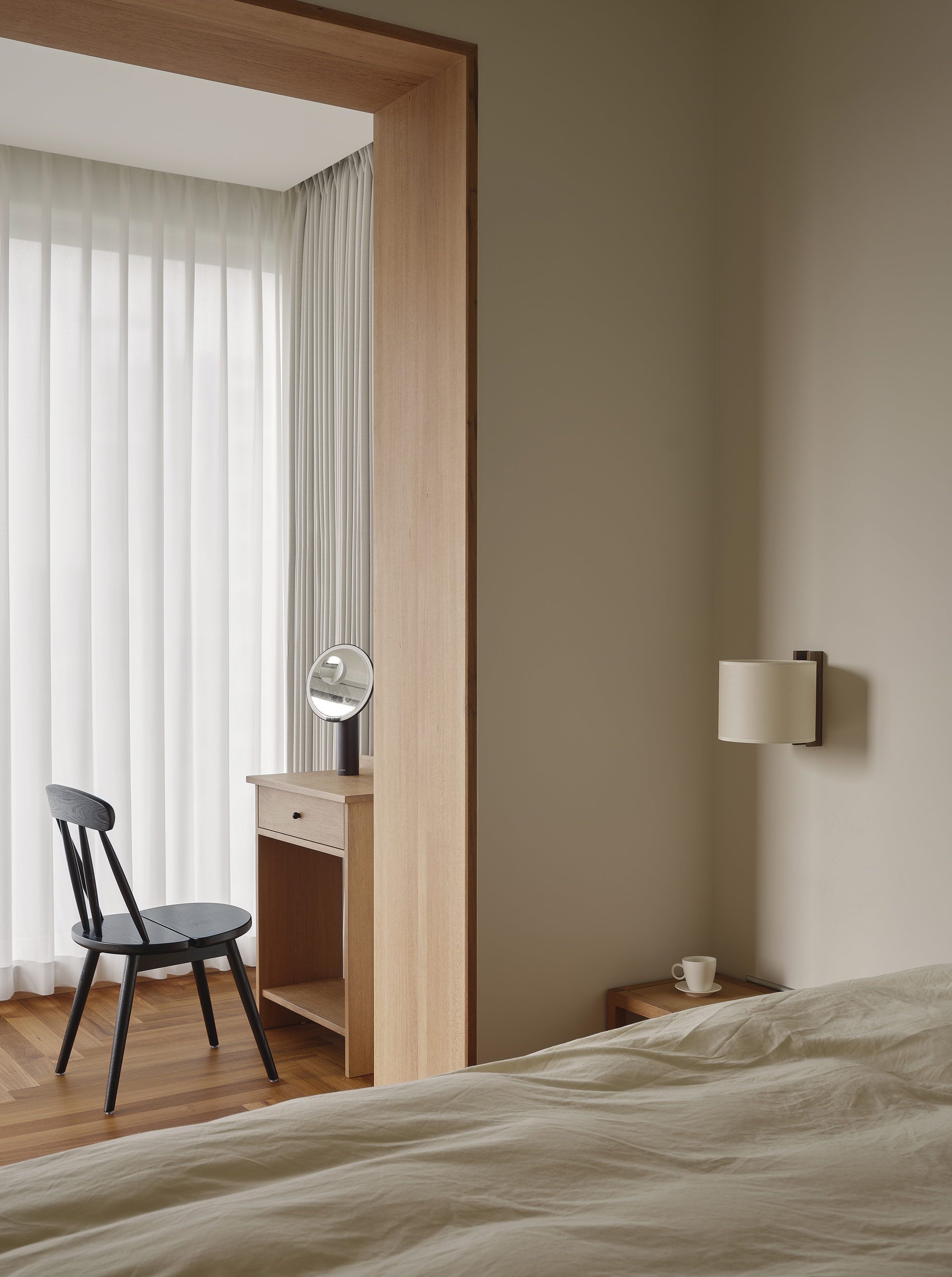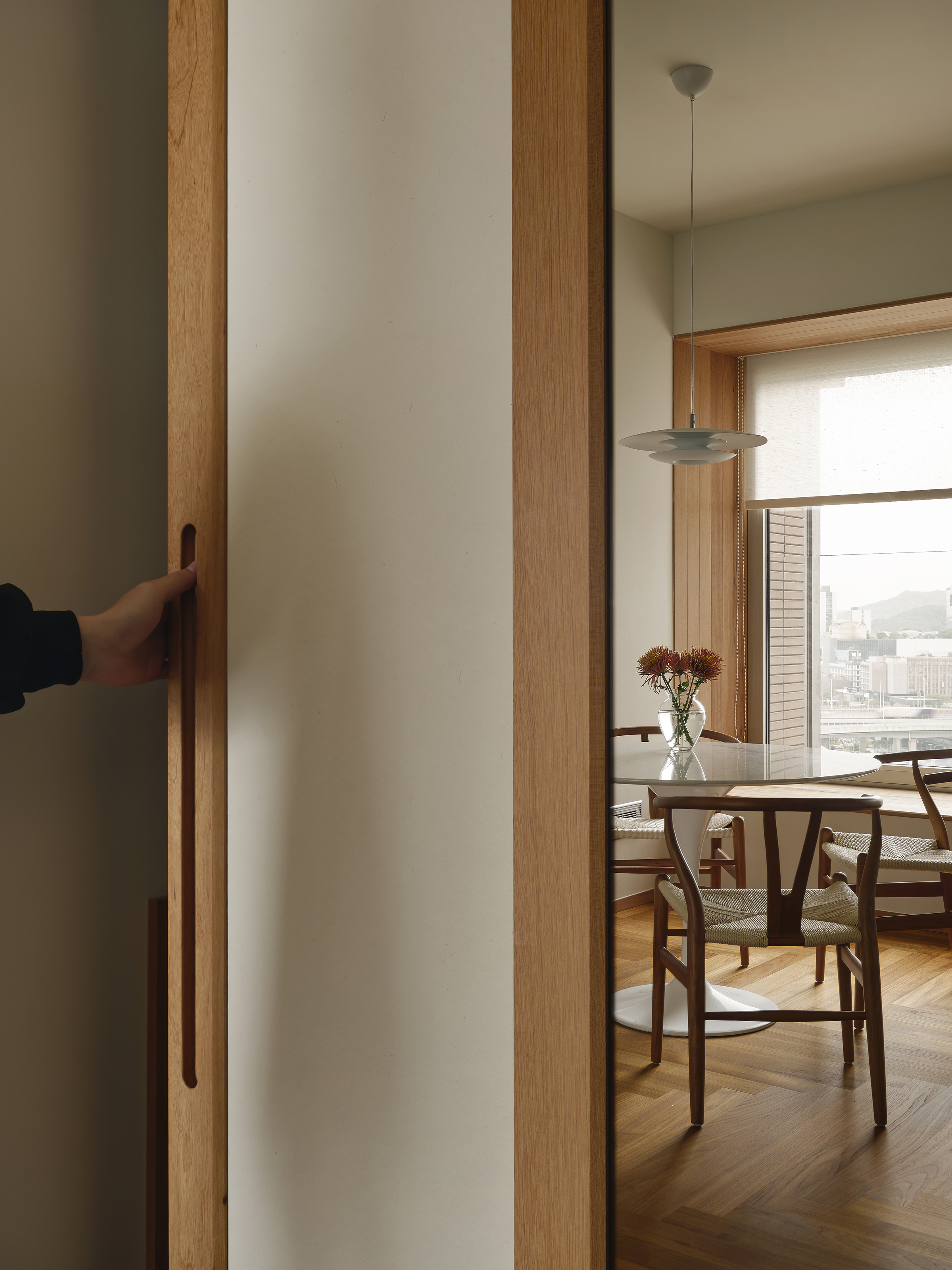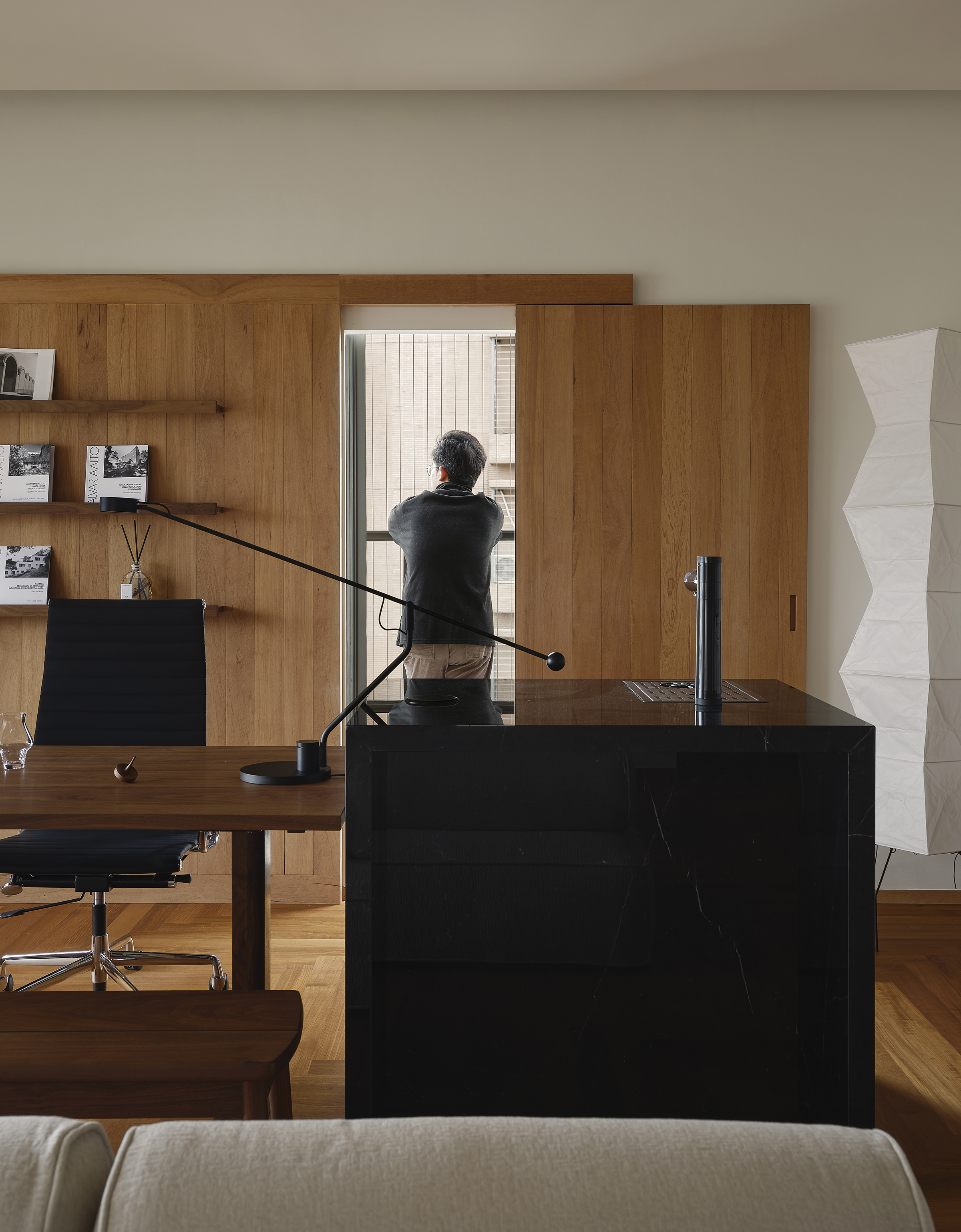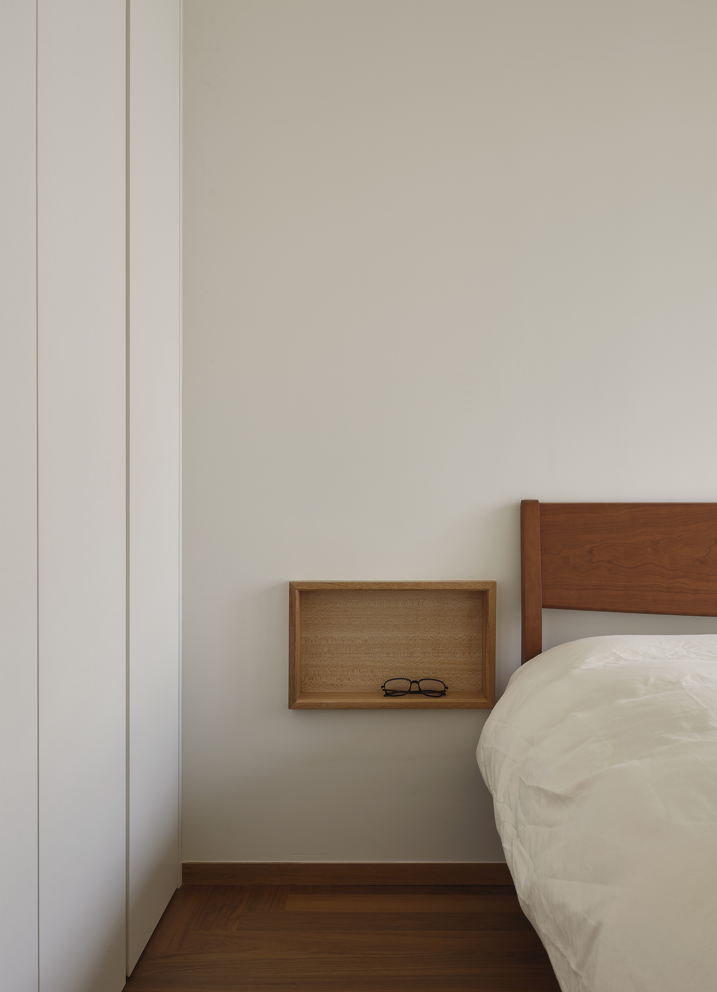 设计选材:秉持 “浑然天成” 的设计哲学,本案大量运用缅甸柚木、黑胡桃、非洲柚木等高等级硬木,并结合实木极简收口工艺:如飘窗包套四周整板对缝、2cm极窄门窗套、等宽板隐形门背景墙……以期呈现隽永之美。同时搭配大理石、苎麻、和纸等天然材料,构建出有呼吸感的氛围。