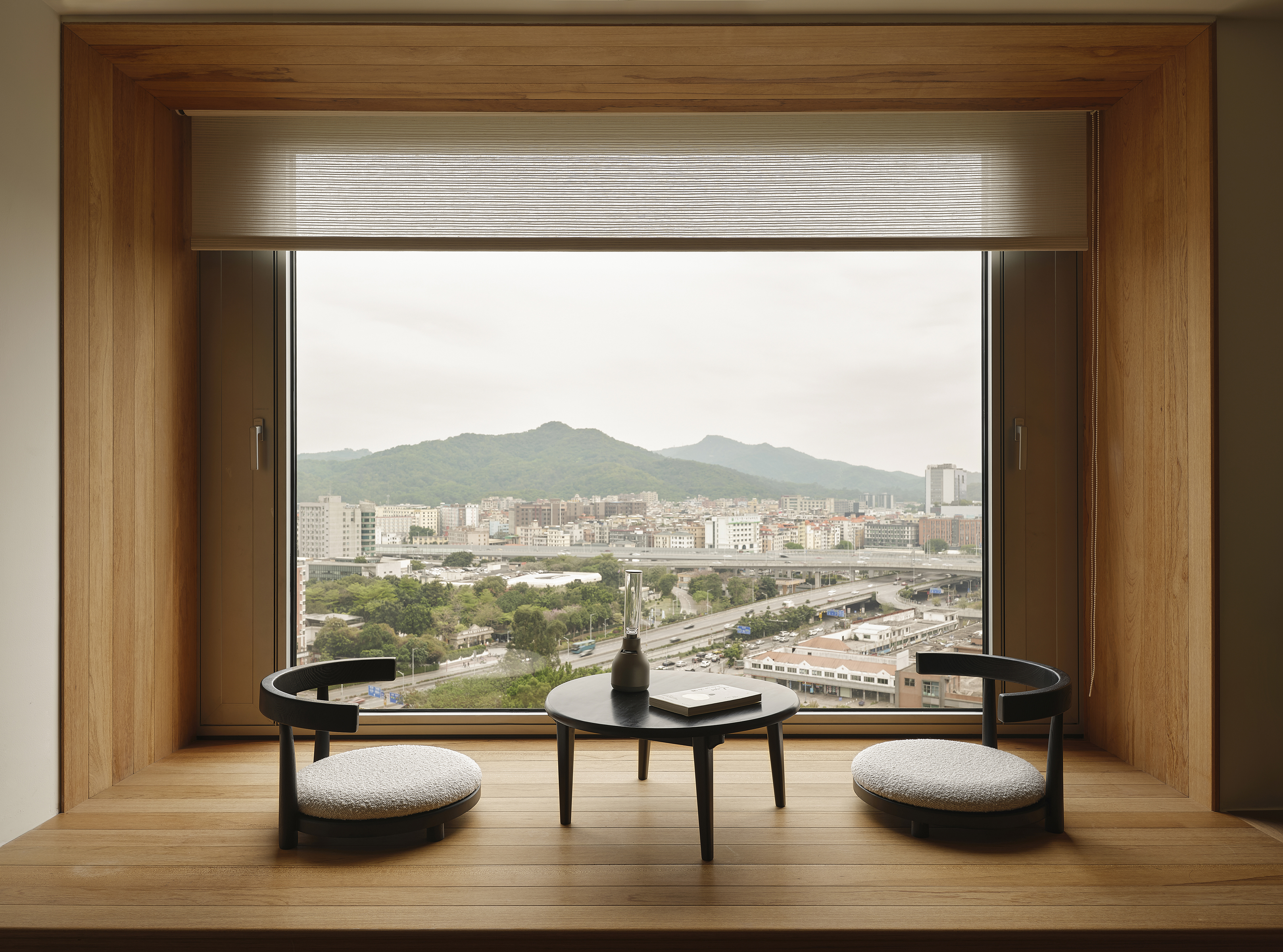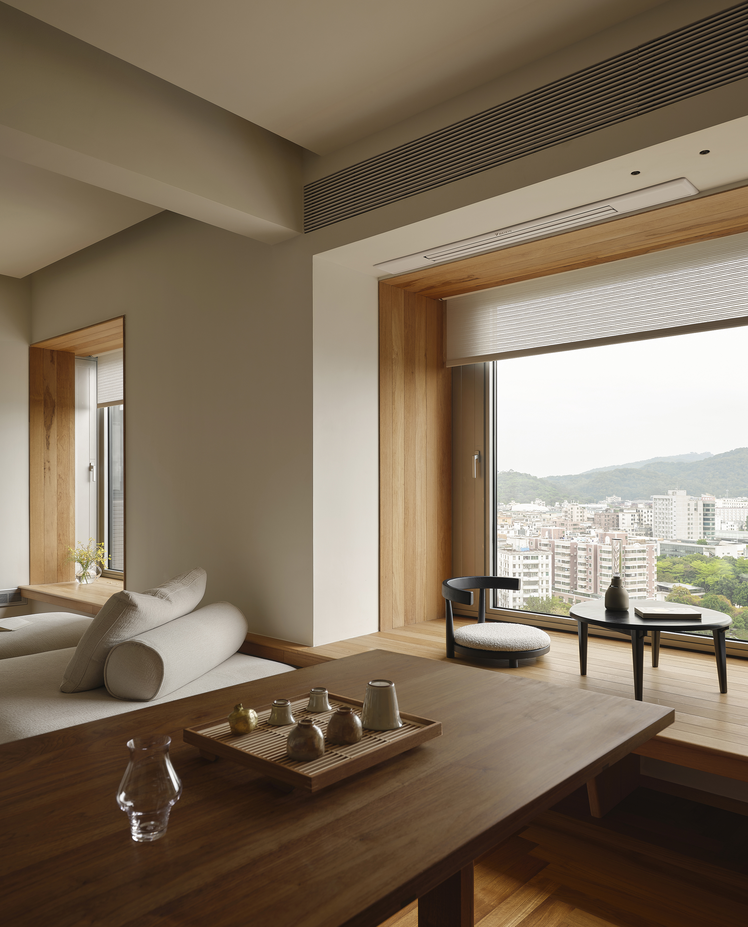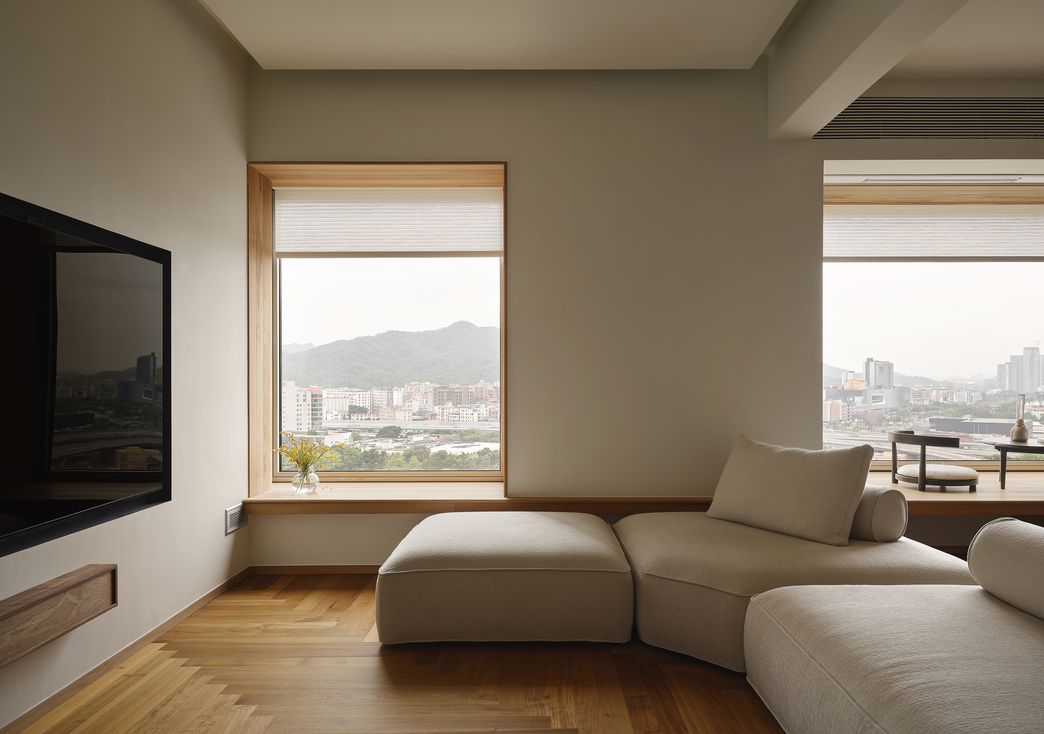 基于对空间尺度、通风采光、及室内外景观的综合考量,设计师大胆地改动原格局,将原「客厅」和「卧室」位置调换,获得采光优越的南向大横厅,将白云山景与城市景观“框”入起居空间,真正发挥出“山景房”的优势。