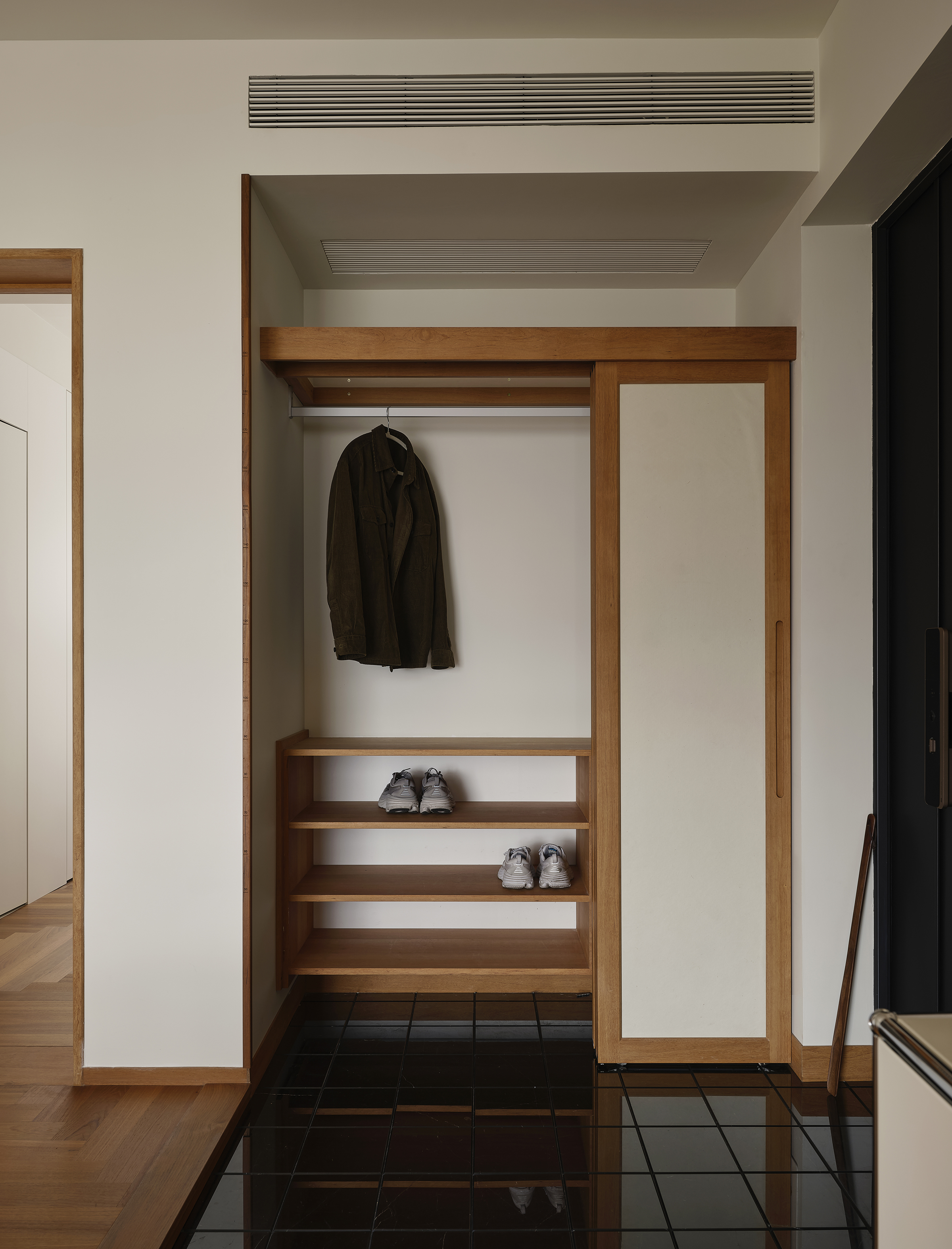 设计师改变原本的无玄关现状,打龙骨做出玄关落尘区,从入户门厅到核心起居空间,形成逐步展开的空间叙事,打破原户型一览无余的视觉模式,也给居住者更强的空间安全感。 -