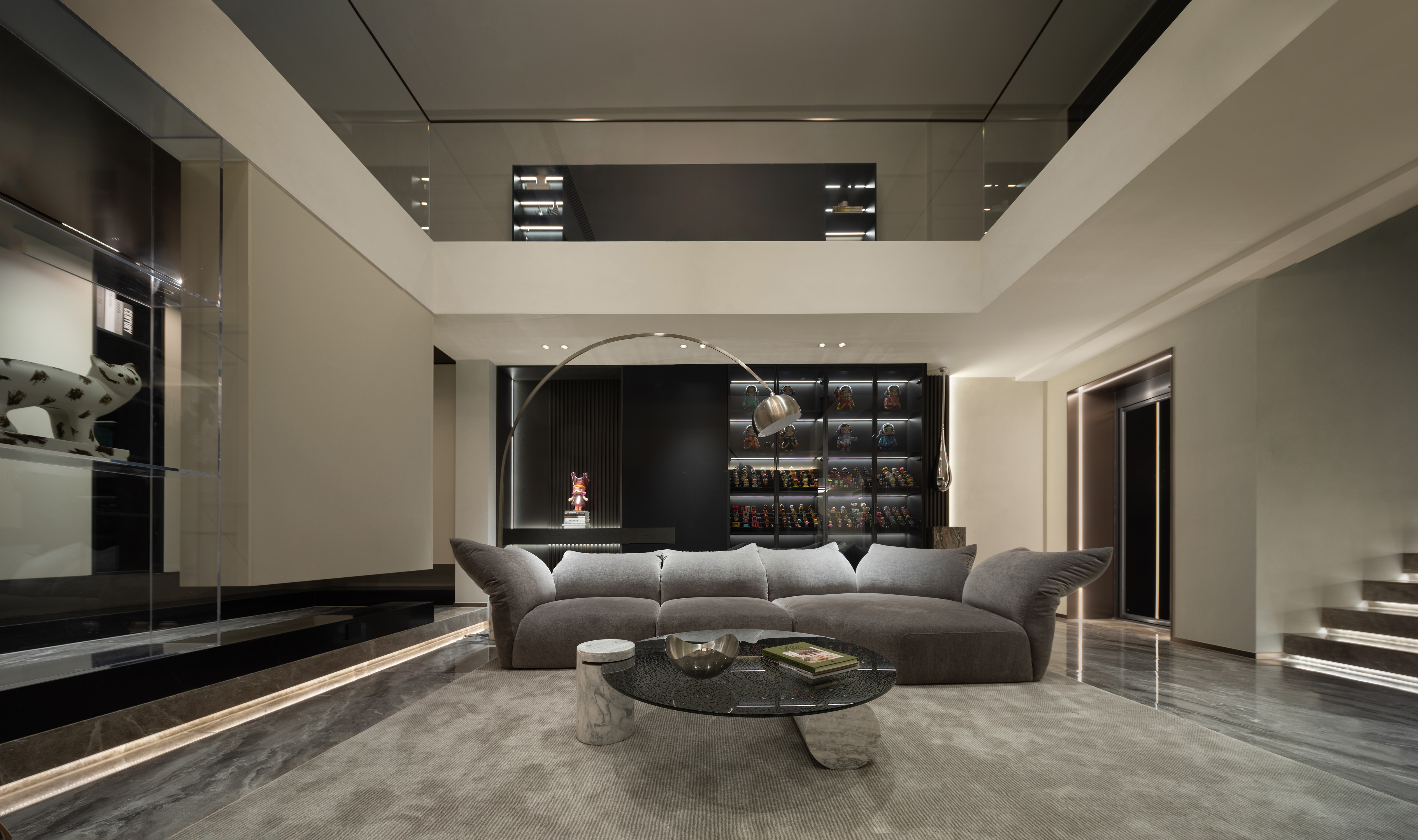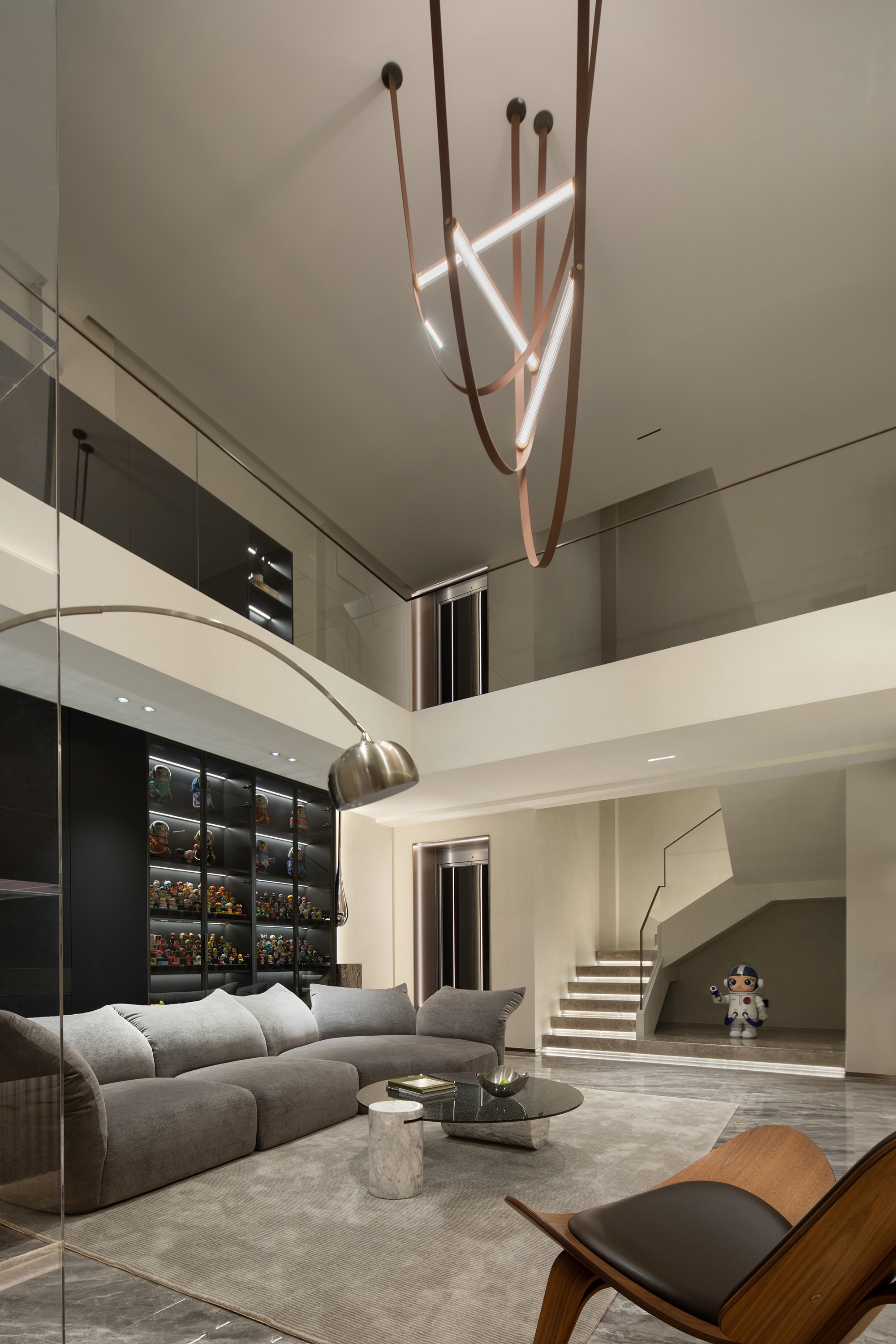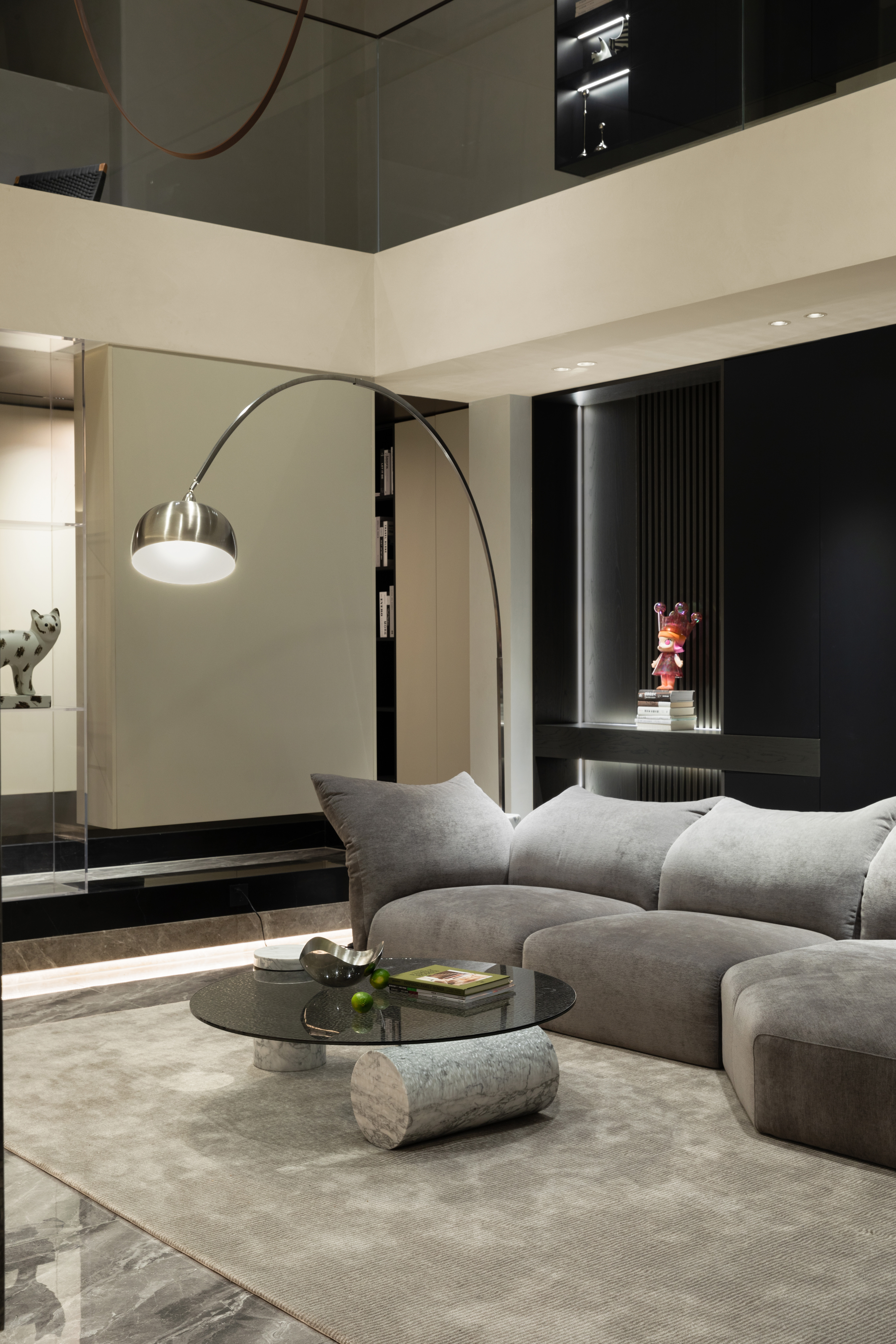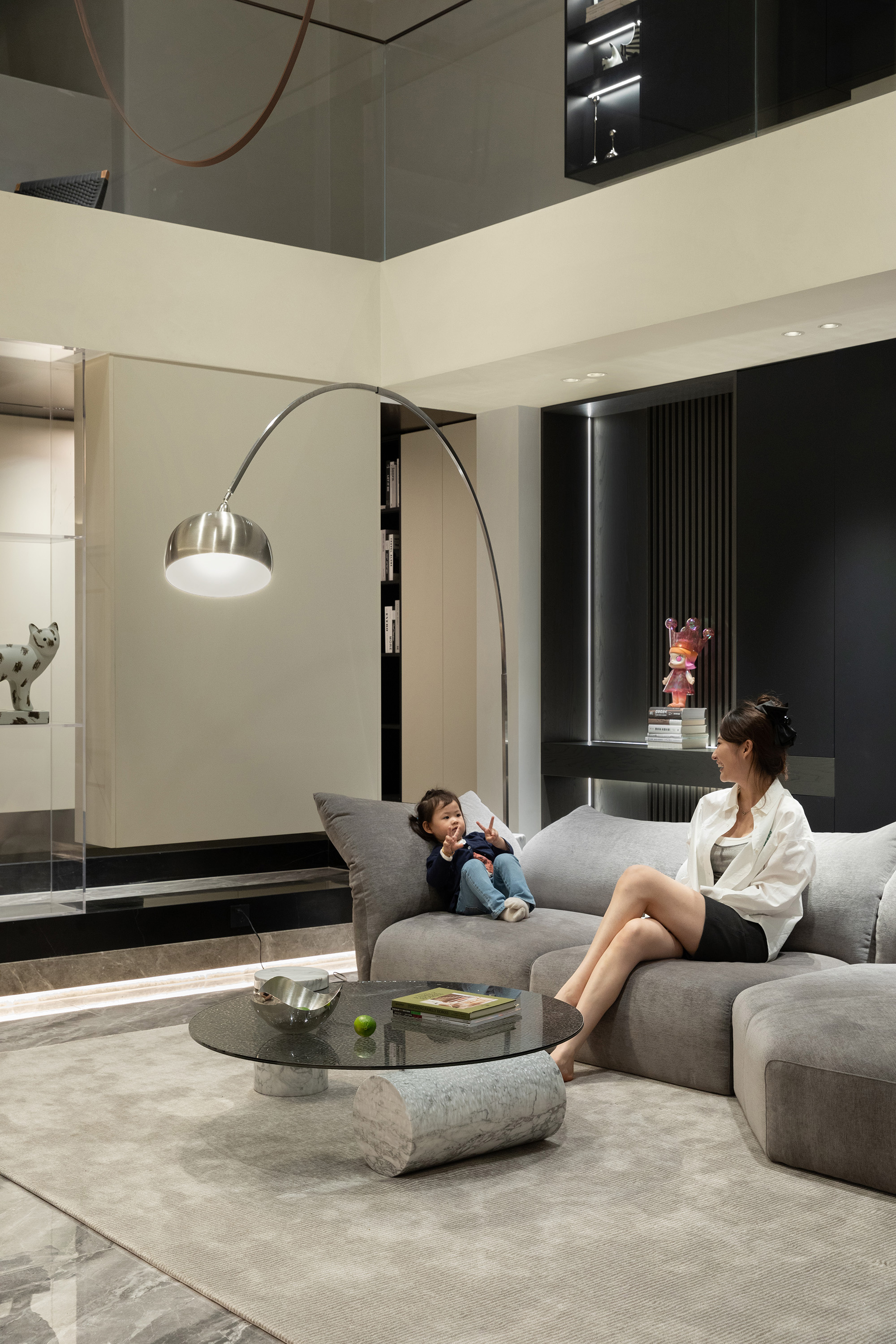向上的挑空让地下空间更开敞辽阔,线条简洁硬朗,FLOS的线性灯垂坠而下,将纵向空间连通起来。灰色的花瓣沙发后陈列着满满一柜子的Molly,可爱的元素与中性的空间相碰撞,产生了无限的乐趣。钓鱼灯的曲线中和了空间的硬朗。当脚踩在柔软的地毯上,倚靠着沙发,孩子在眼前嬉戏,与心爱的物品相伴,轻松愉悦的氛围足以消解一天的疲劳。