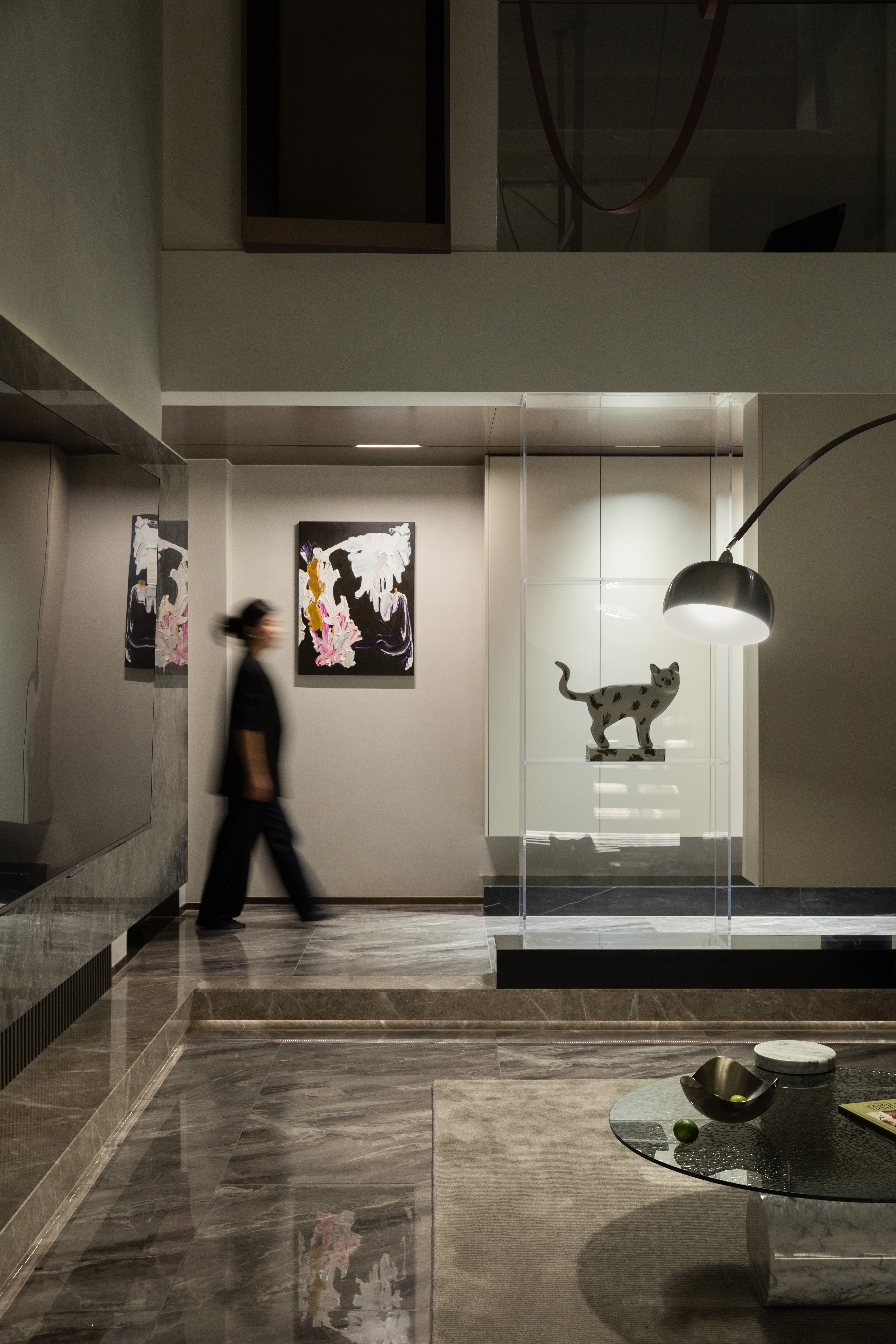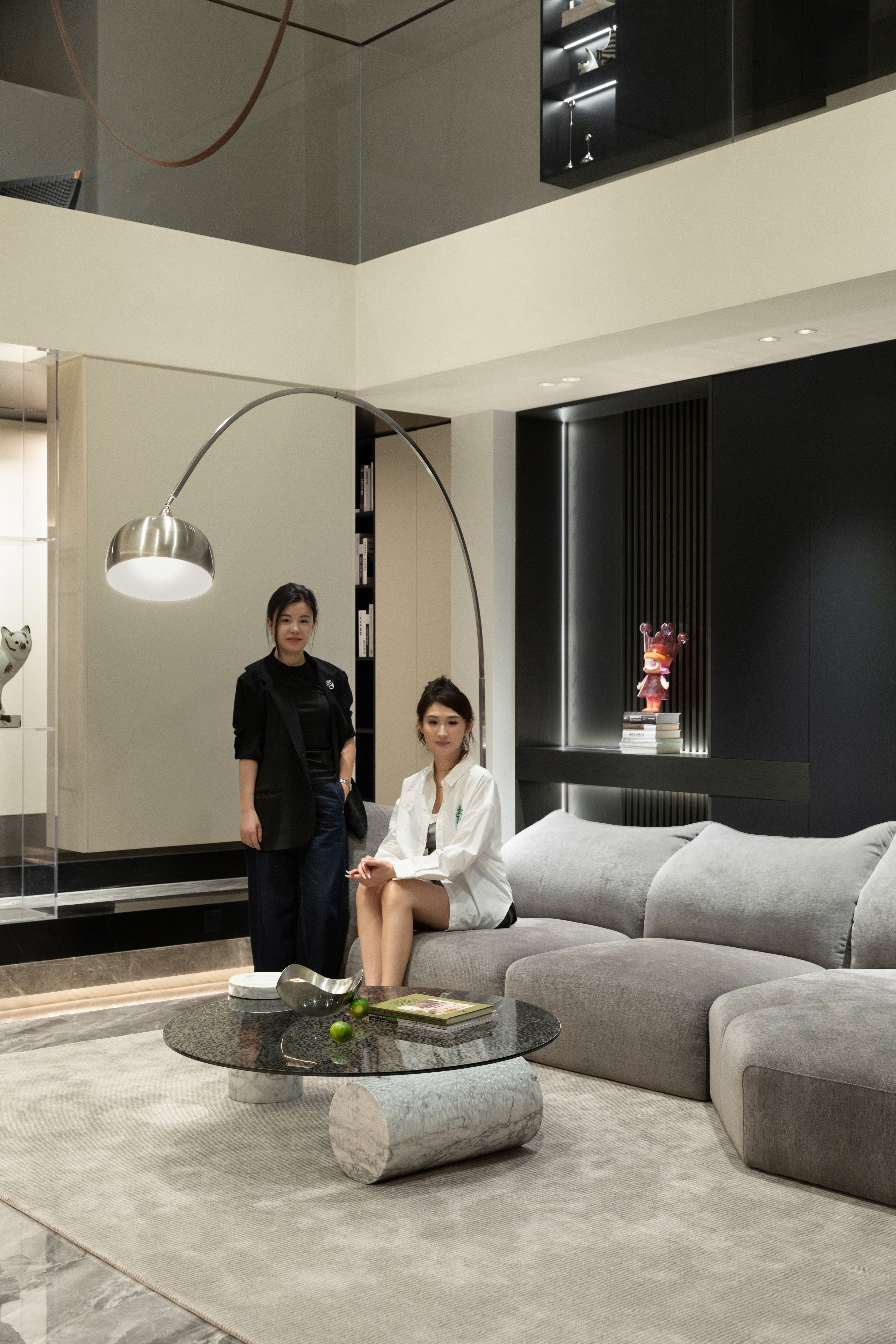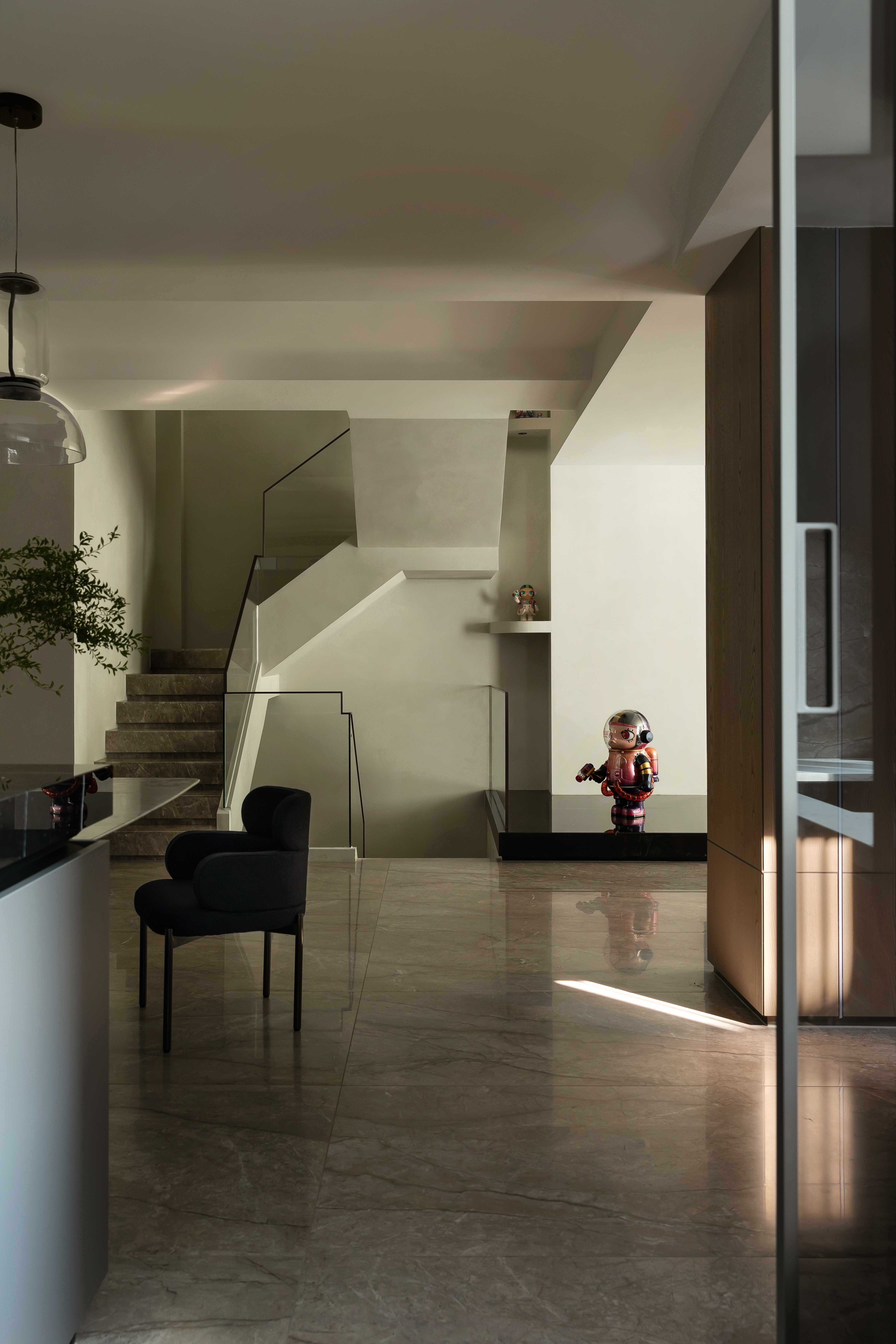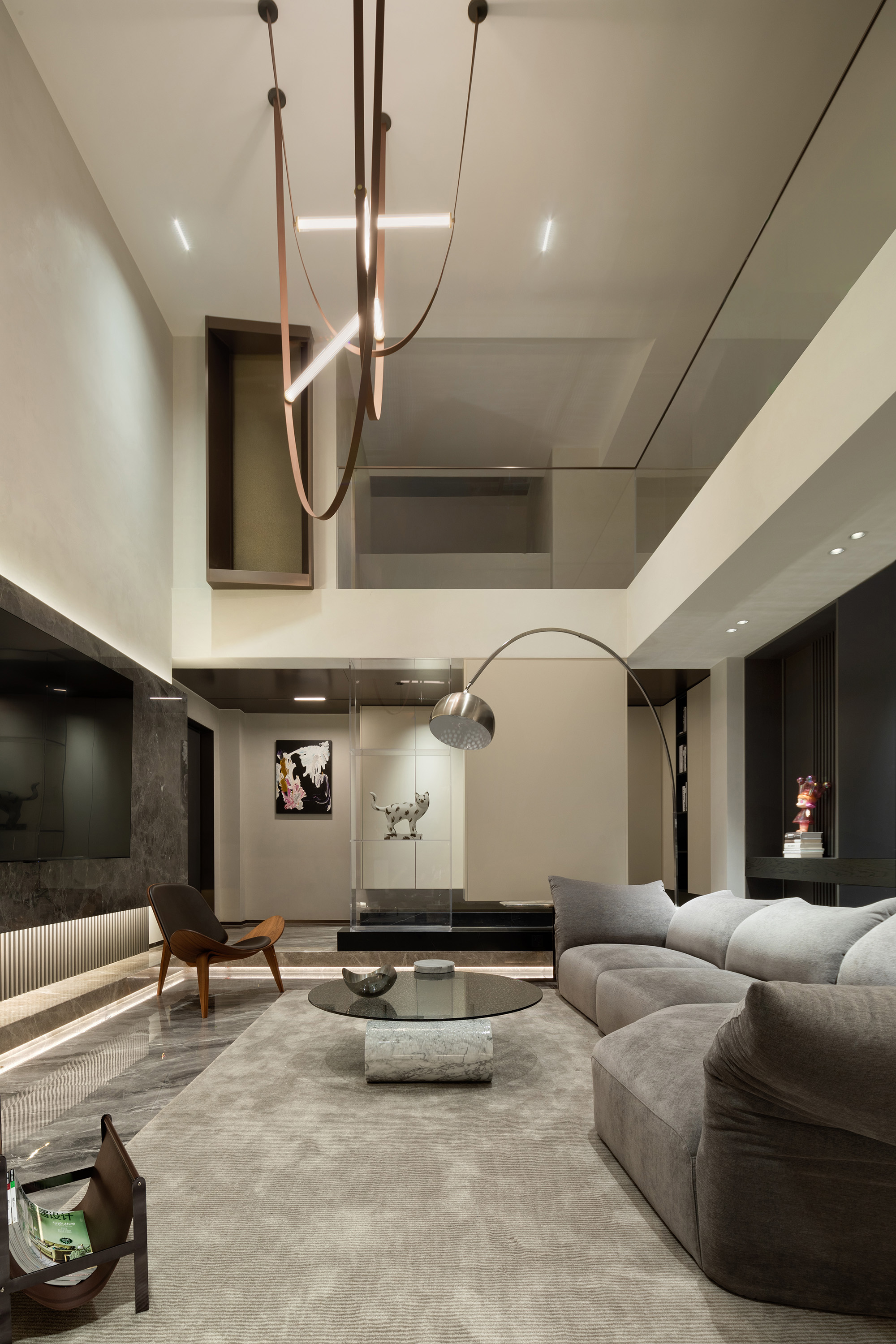 向上的挑空让地下空间更开敞辽阔,线条简洁硬朗,FLOS的线性灯垂坠而下,将纵向空间连通起来。灰色的花瓣沙发后陈列着满满一柜子的Molly,可爱的元素与中性的空间相碰撞,产生了无限的乐趣。钓鱼灯的曲线中和了空间的硬朗。当脚踩在柔软的地毯上,倚靠着沙发,孩子在眼前嬉戏,与心爱的物品相伴,轻松愉悦的氛围足以消解一天的疲劳。