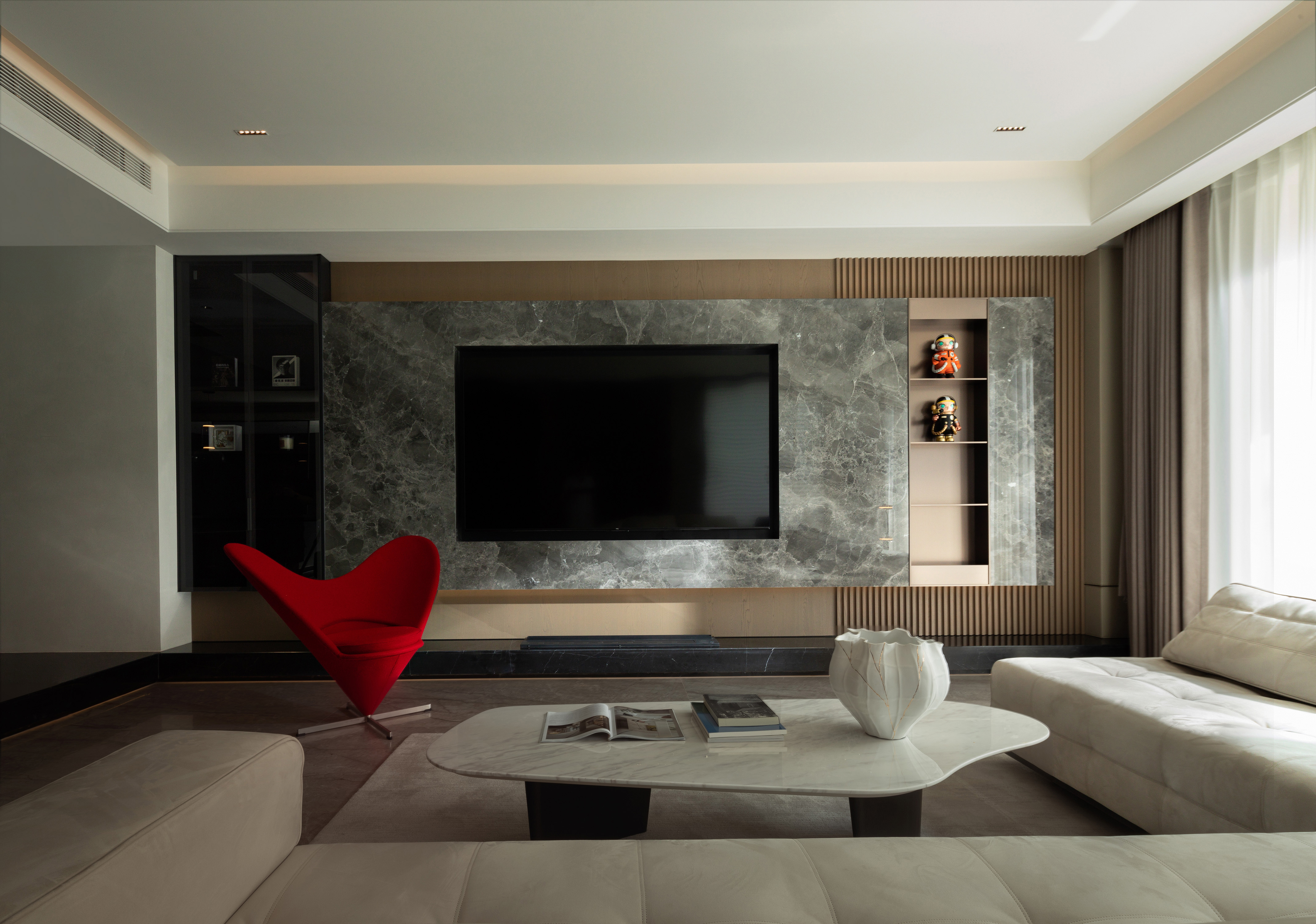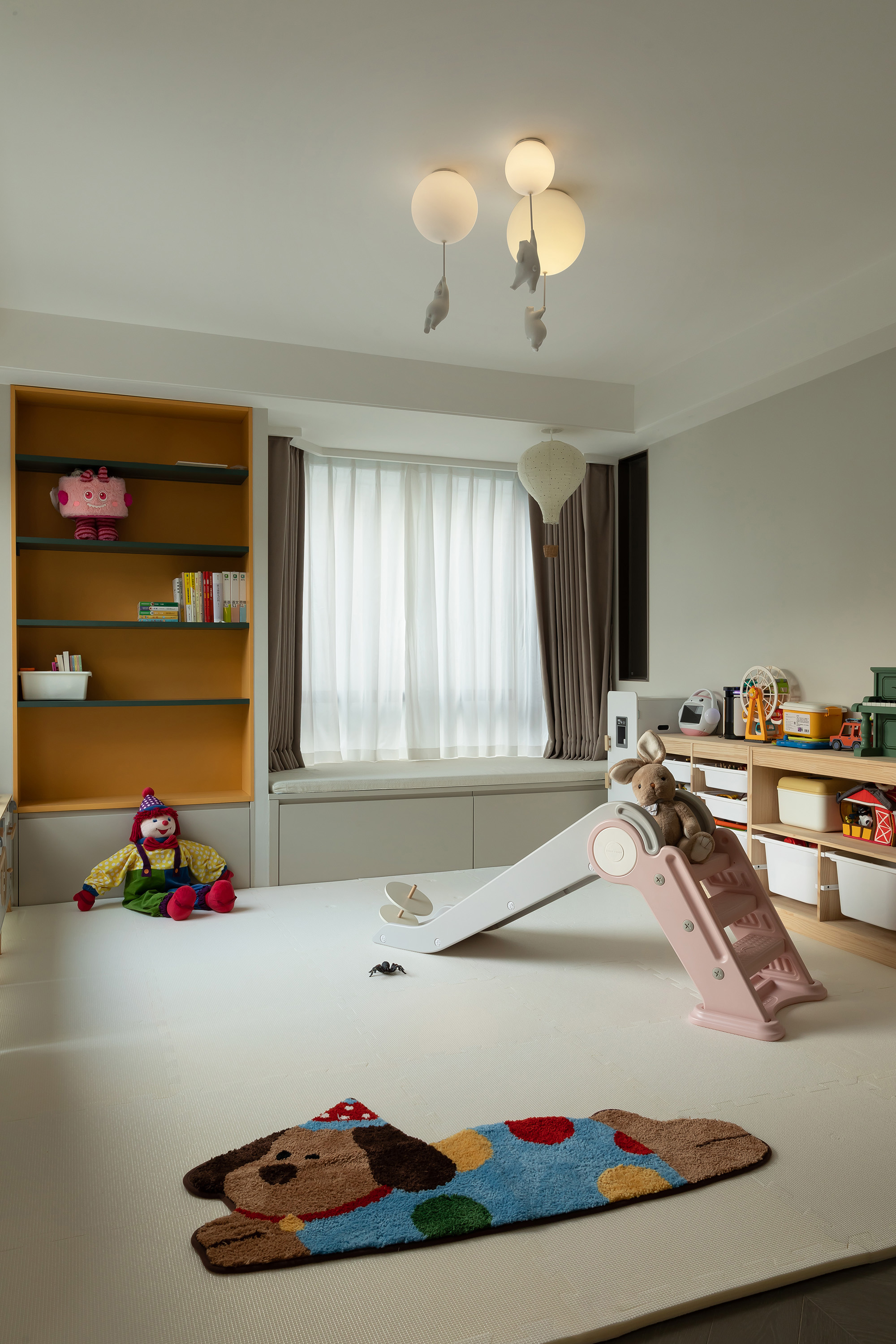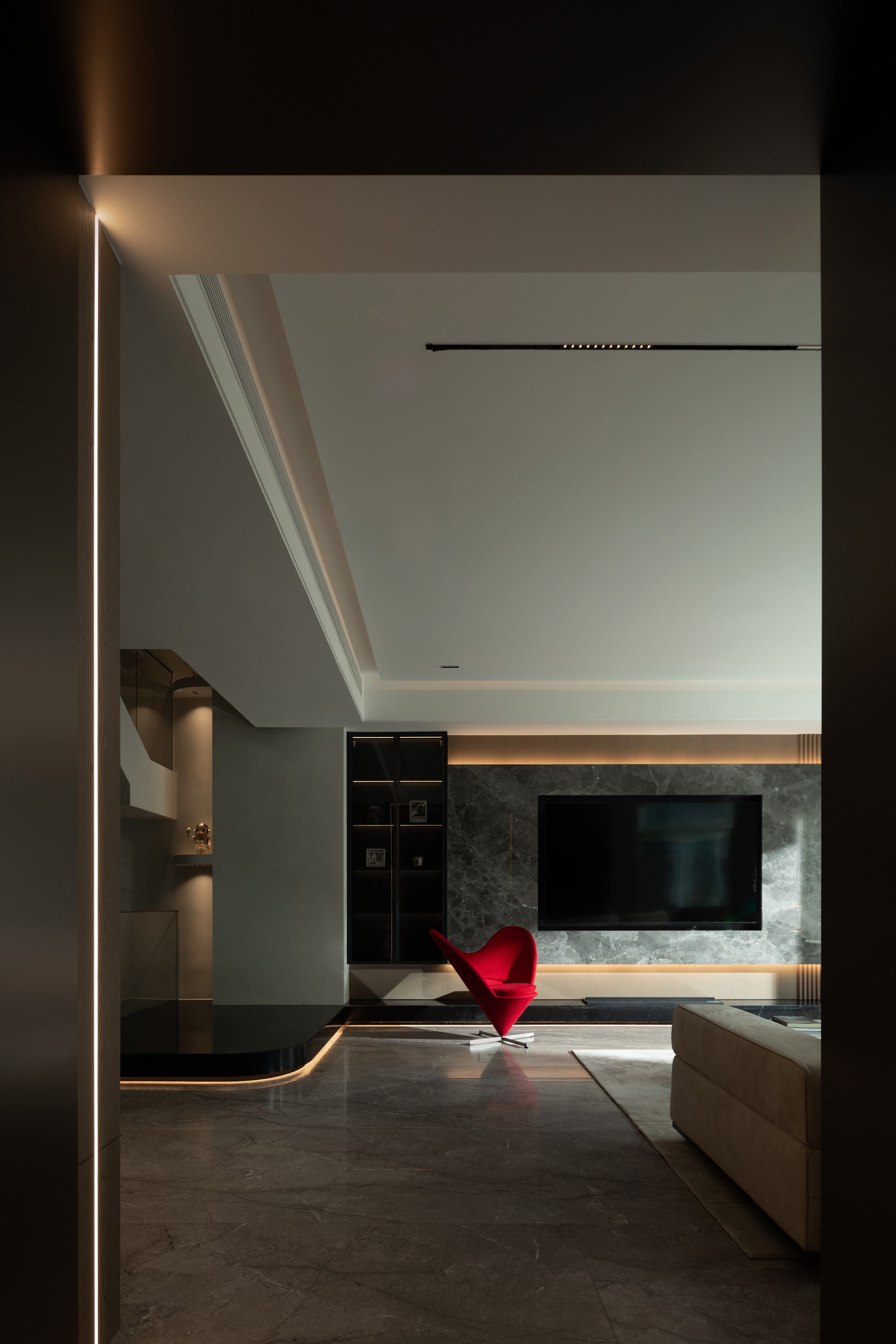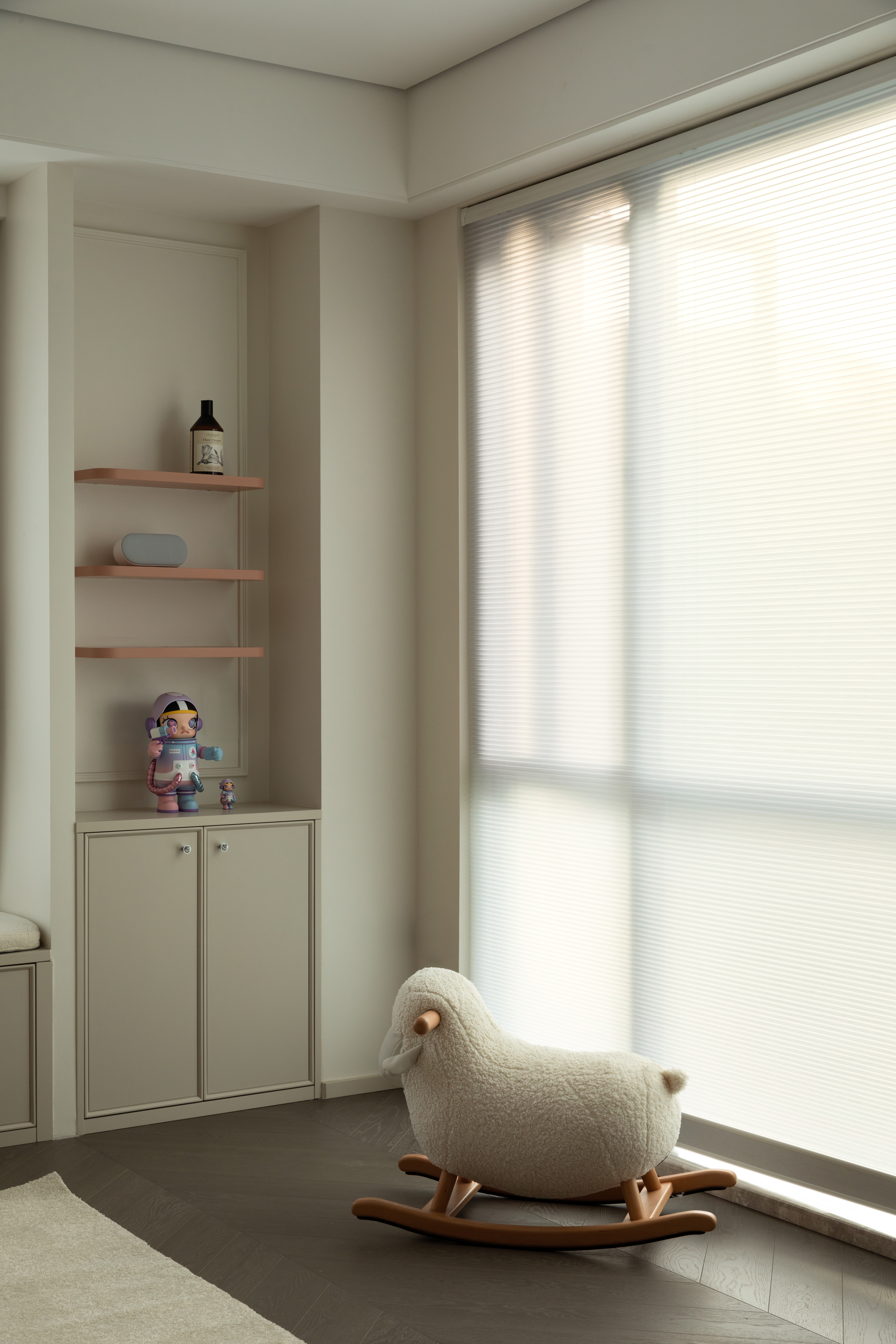 向上的挑空让地下空间更开敞辽阔,线条简洁硬朗,FLOS的线性灯垂坠而下,将纵向空间连通起来。灰色的花瓣沙发后陈列着满满一柜子的Molly,可爱的元素与中性的空间相碰撞,产生了无限的乐趣。钓鱼灯的曲线中和了空间的硬朗。当脚踩在柔软的地毯上,倚靠着沙发,孩子在眼前嬉戏,与心爱的物品相伴,轻松愉悦的氛围足以消解一天的疲劳。