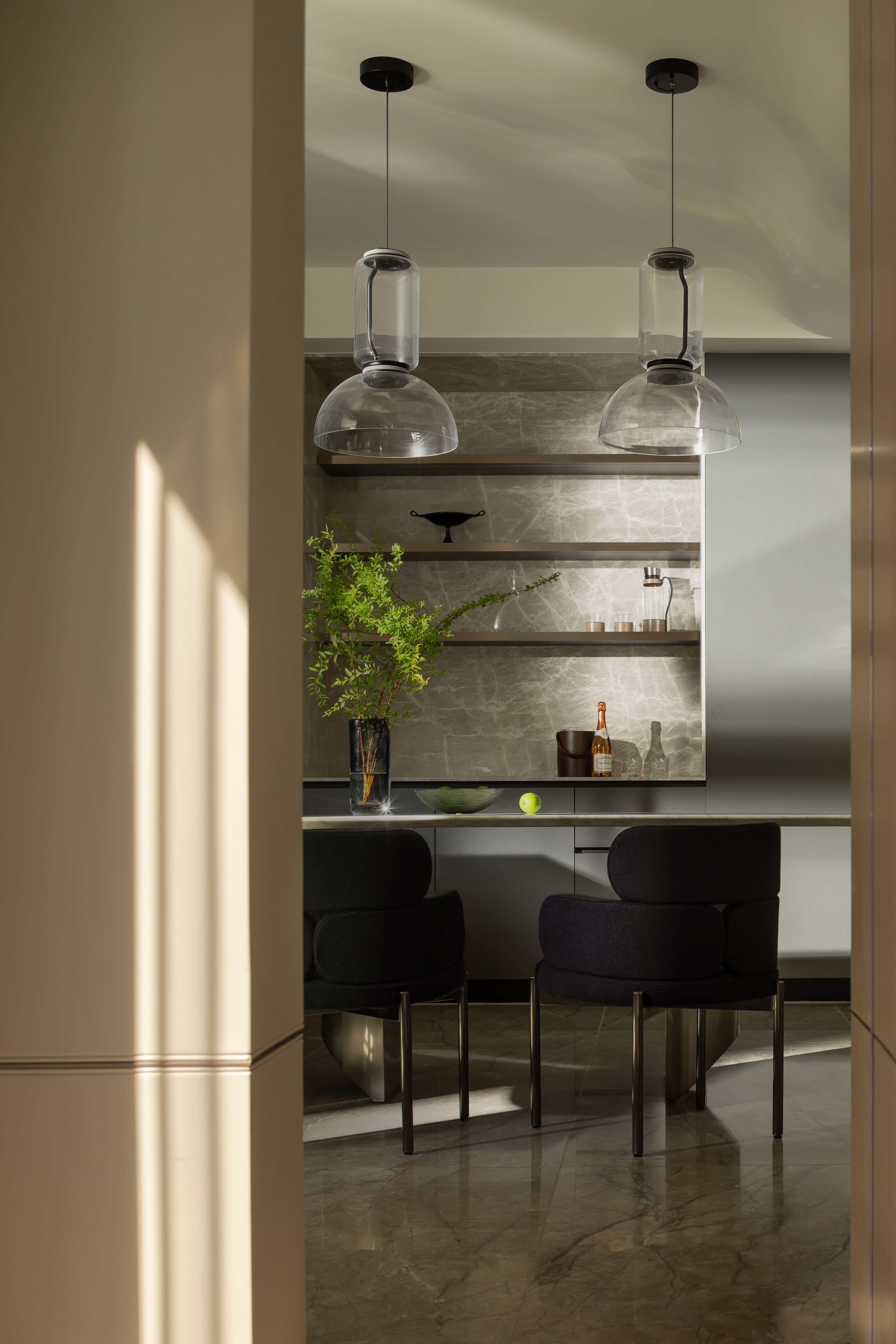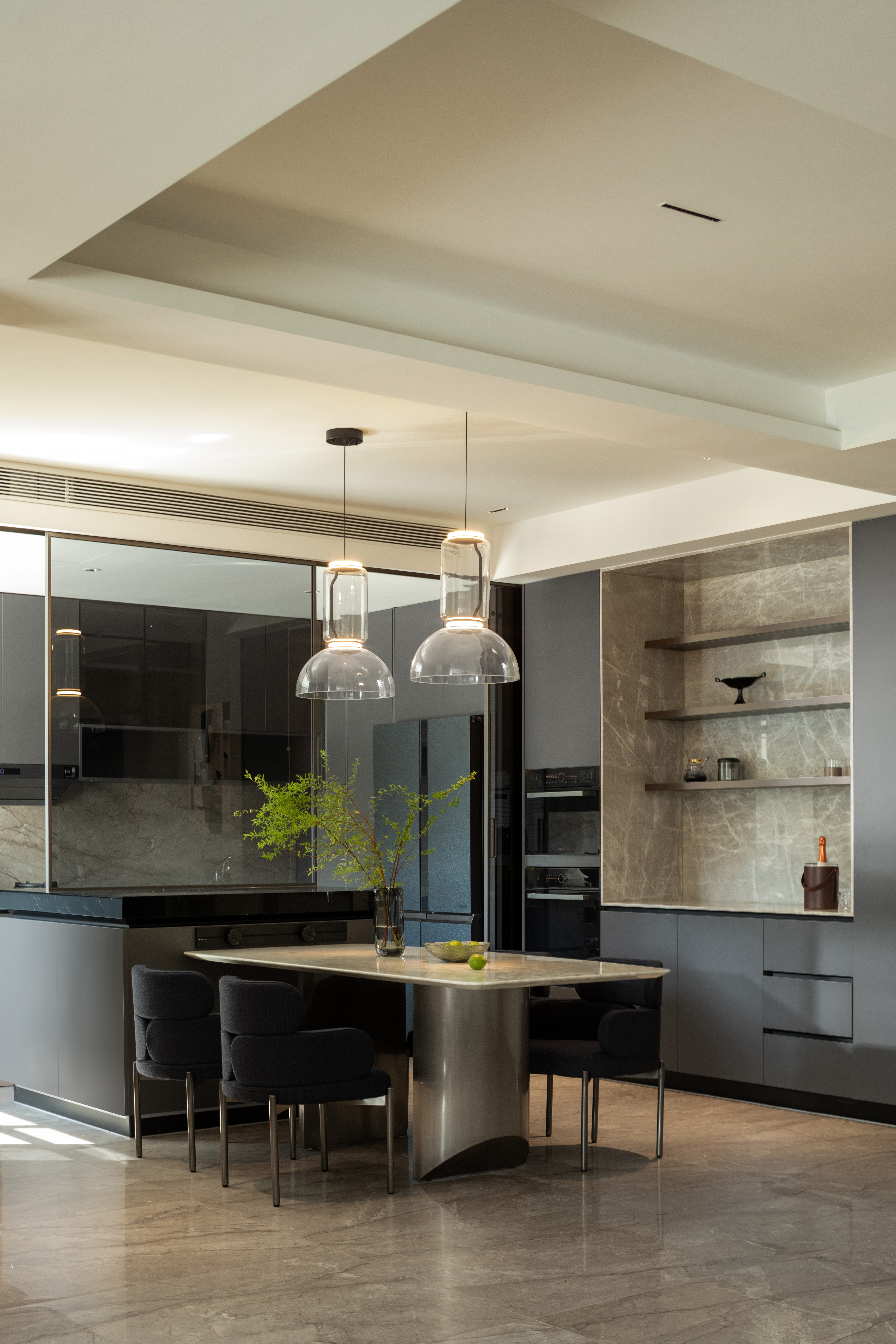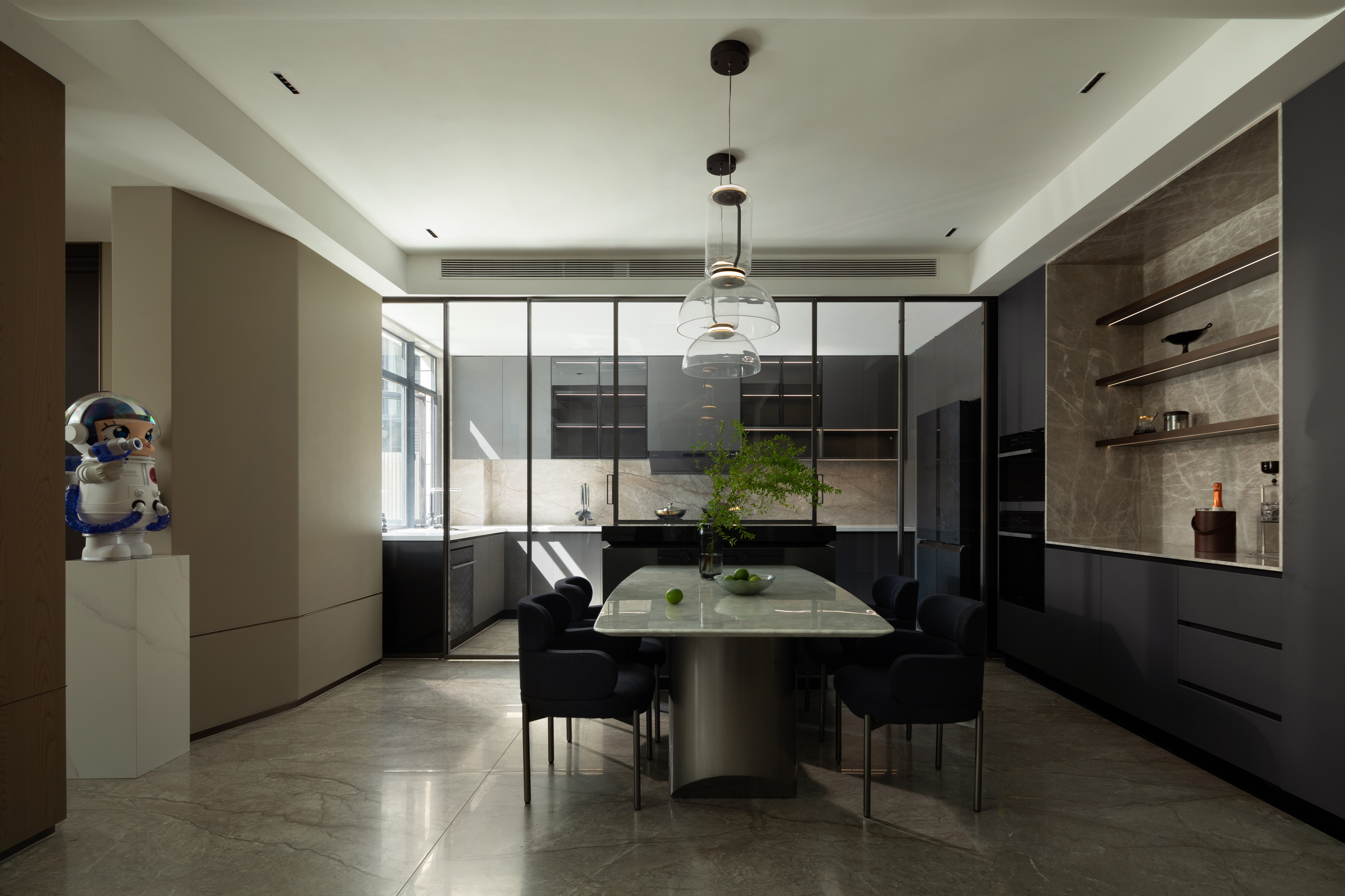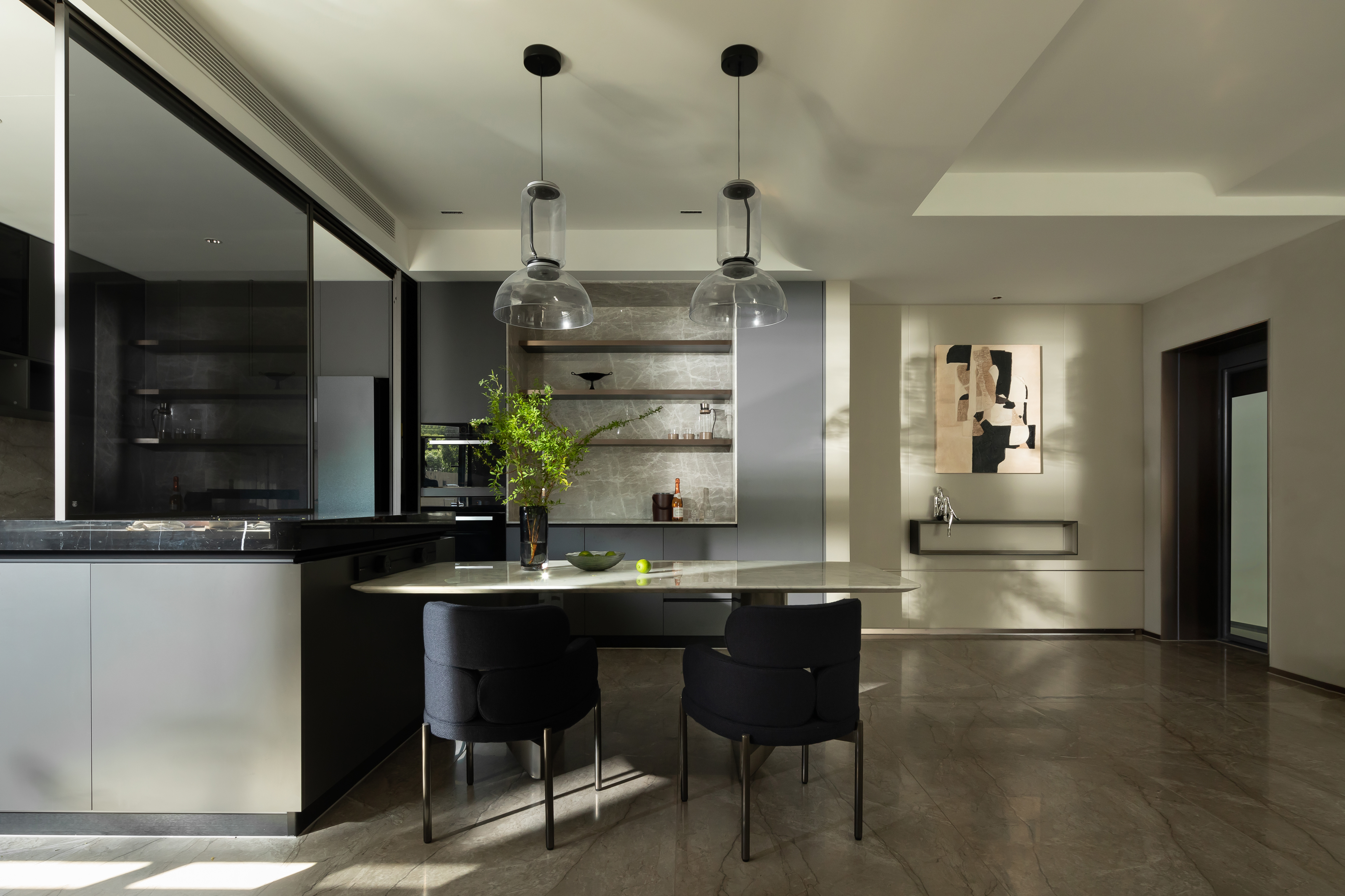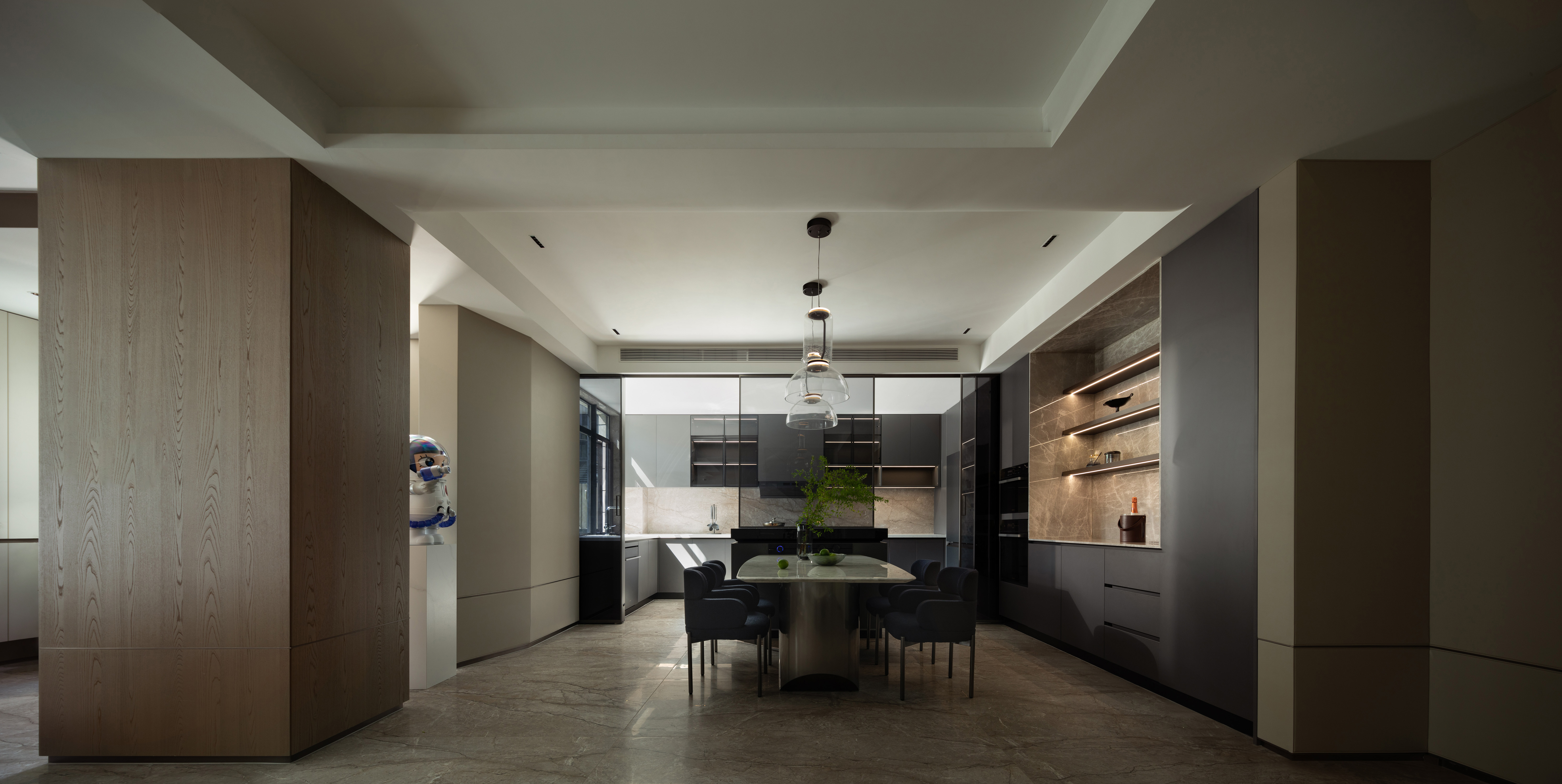 我们希望探索材料、空间秩序和几何比例,以木饰面、大理石、艺术涂料等自然的材质与色彩,在空间中碰撞营造温润雅致的面貌,透明的柜体增加了空间的通透性,在光、自然和品质下,用不同的语言构建新的秩序。 -