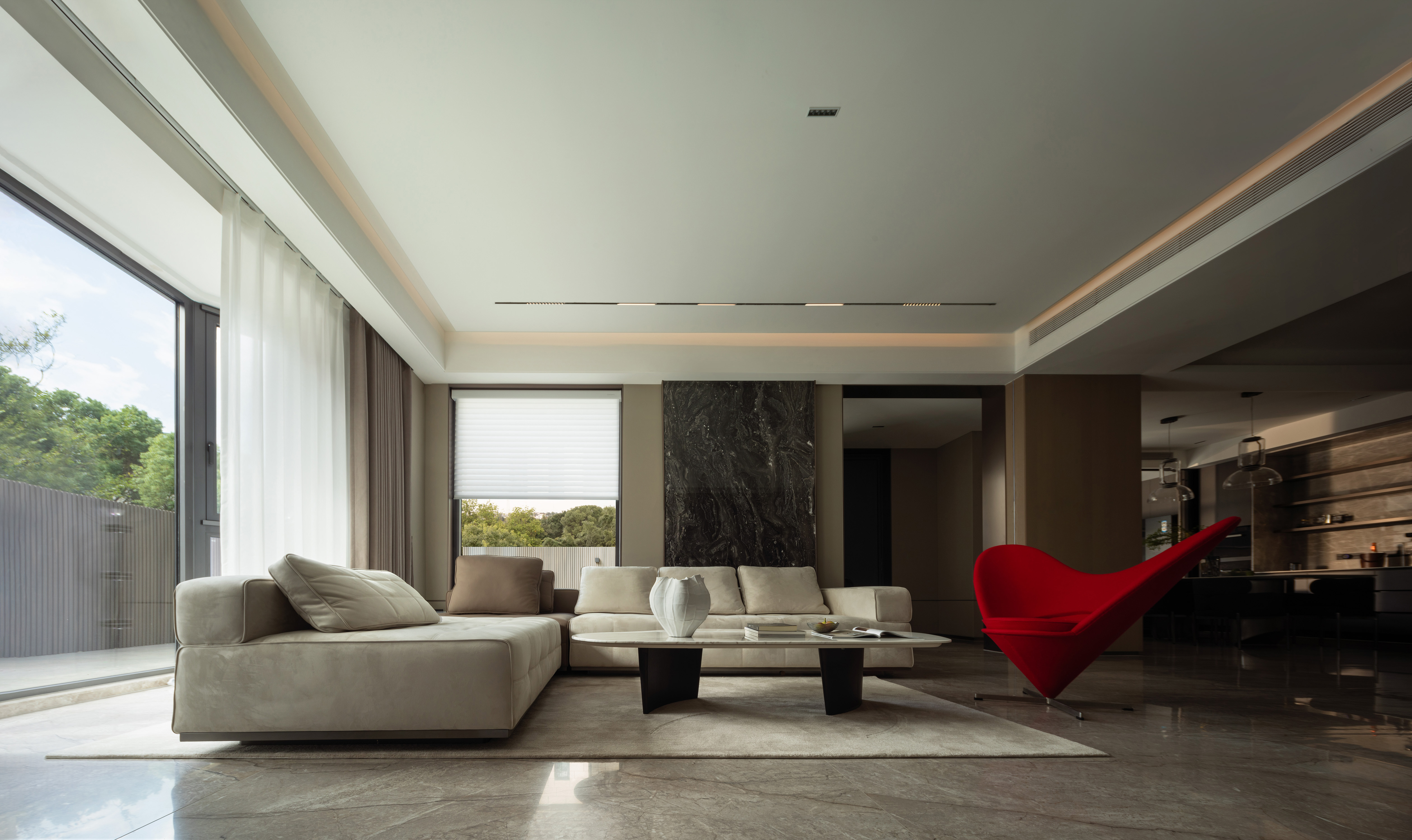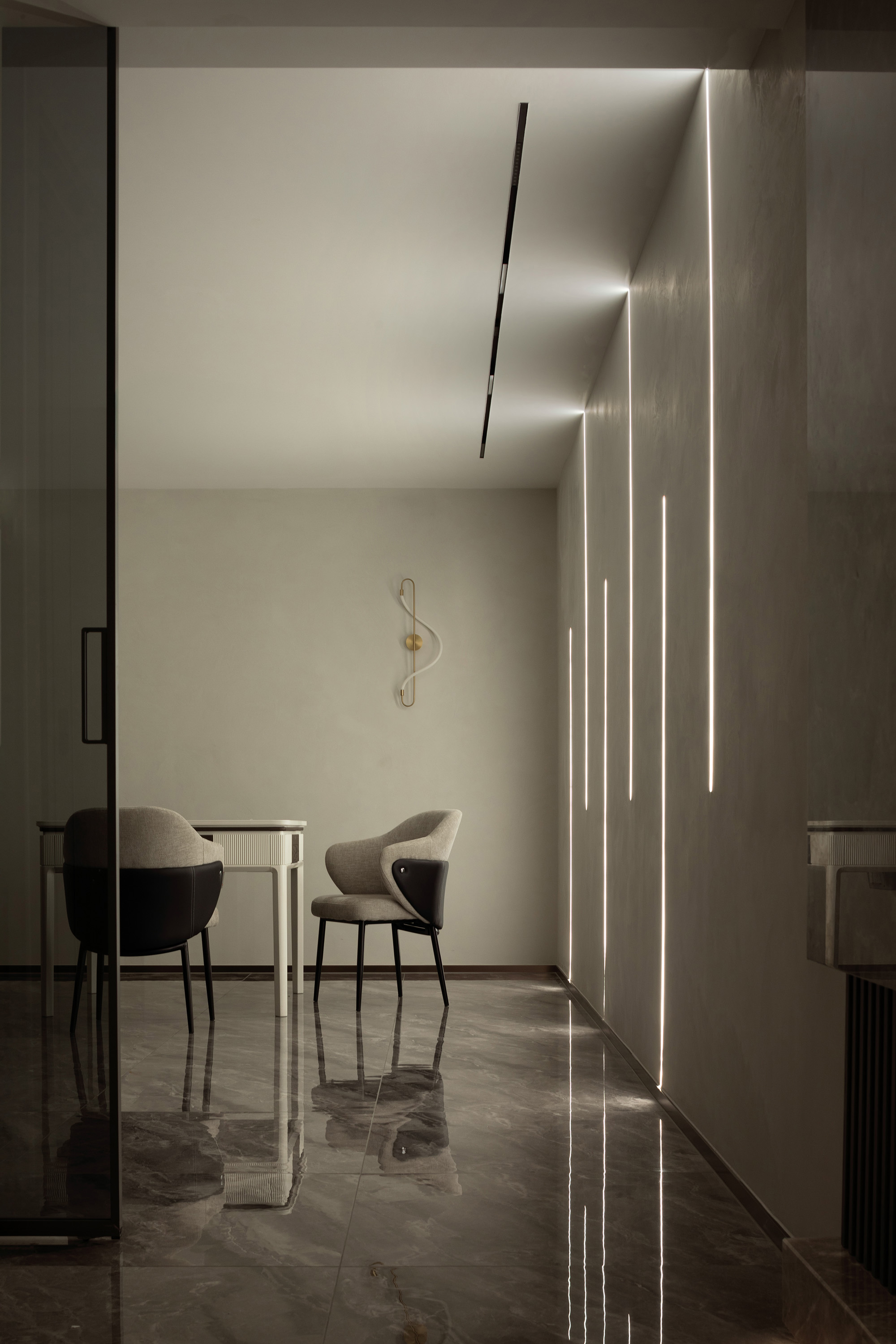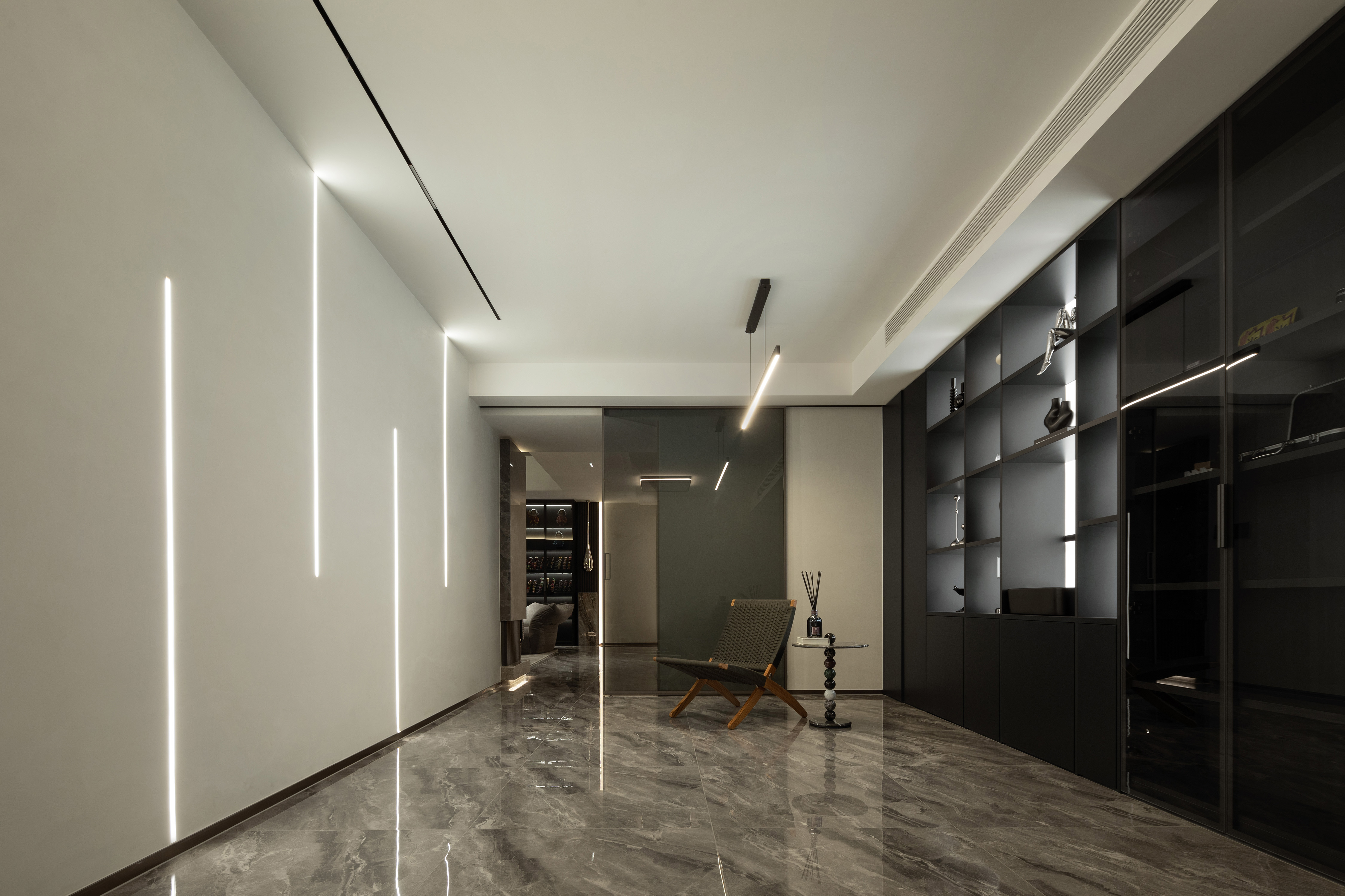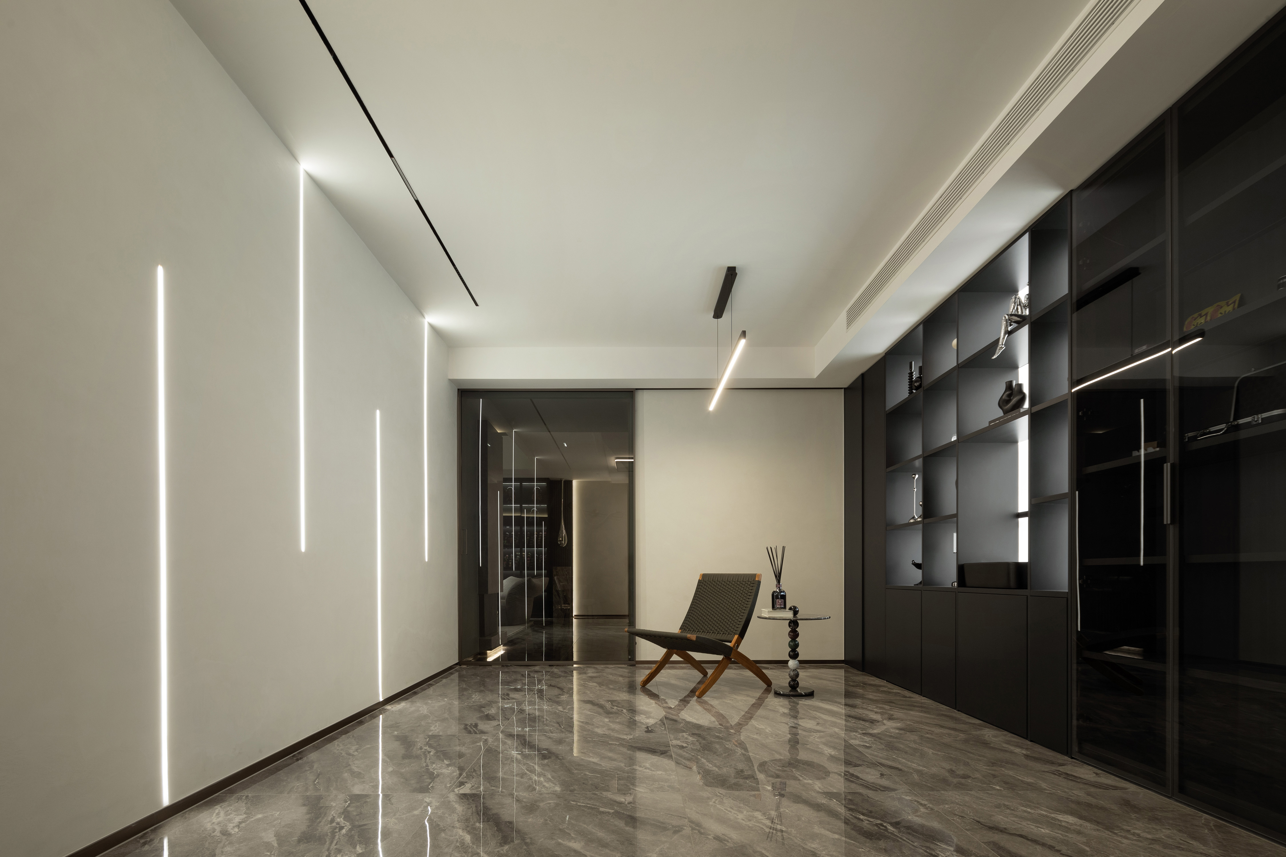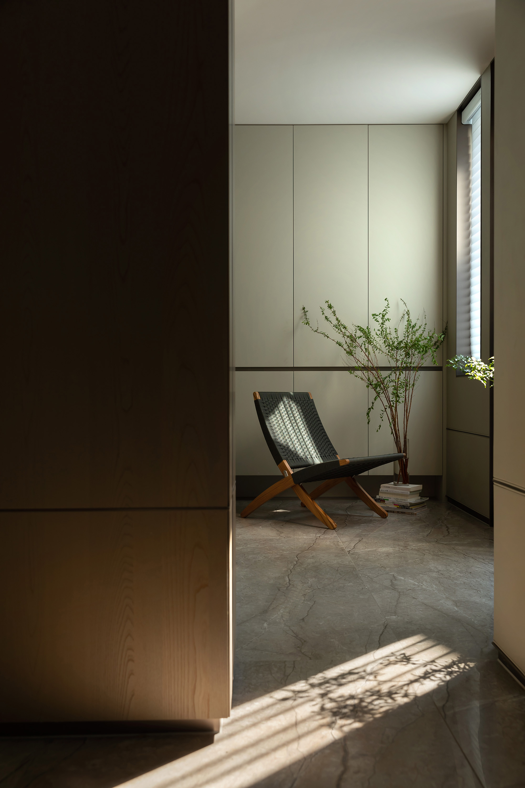 我们希望探索材料、空间秩序和几何比例,以木饰面、大理石、艺术涂料等自然的材质与色彩,在空间中碰撞营造温润雅致的面貌,透明的柜体增加了空间的通透性,在光、自然和品质下,用不同的语言构建新的秩序。 -