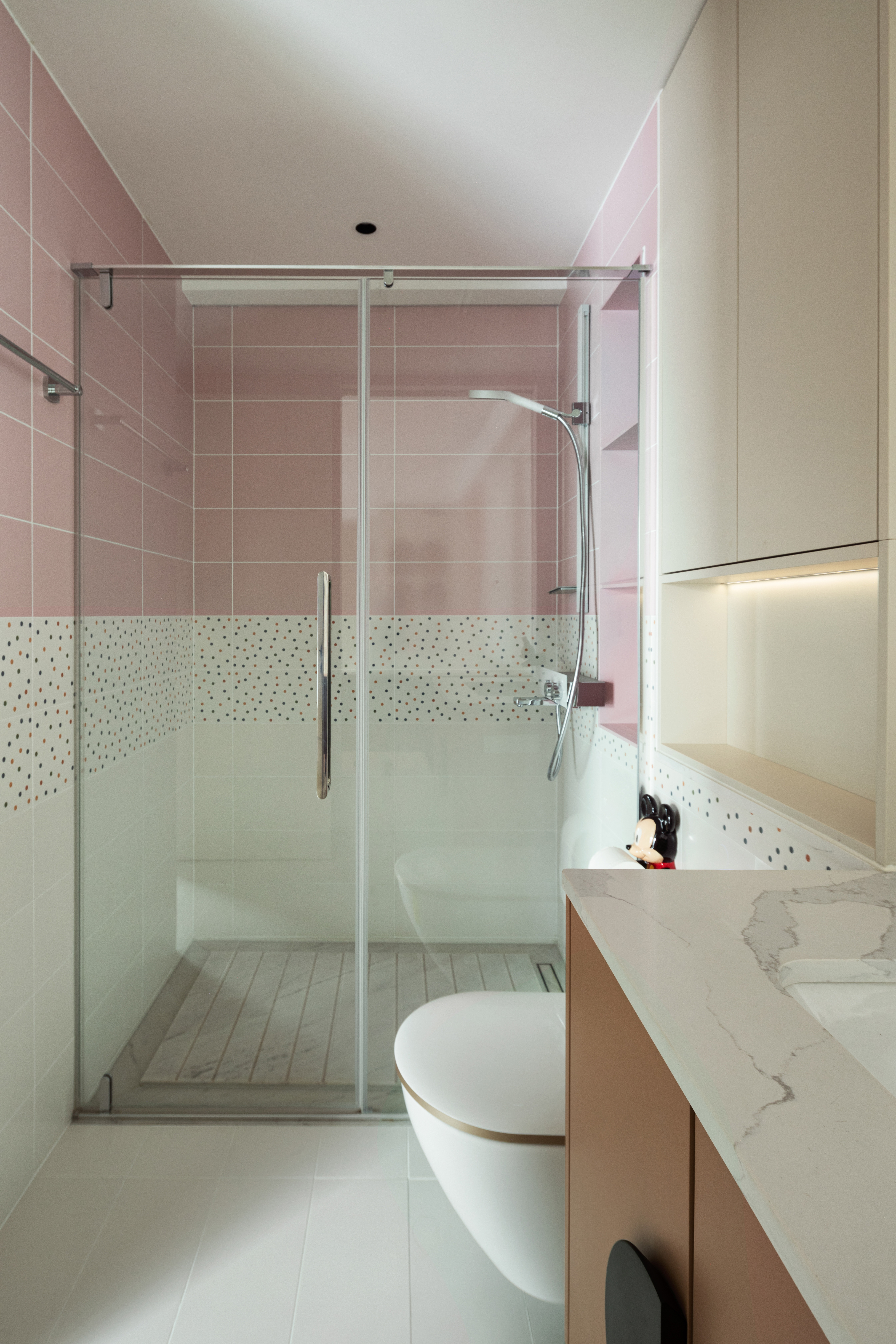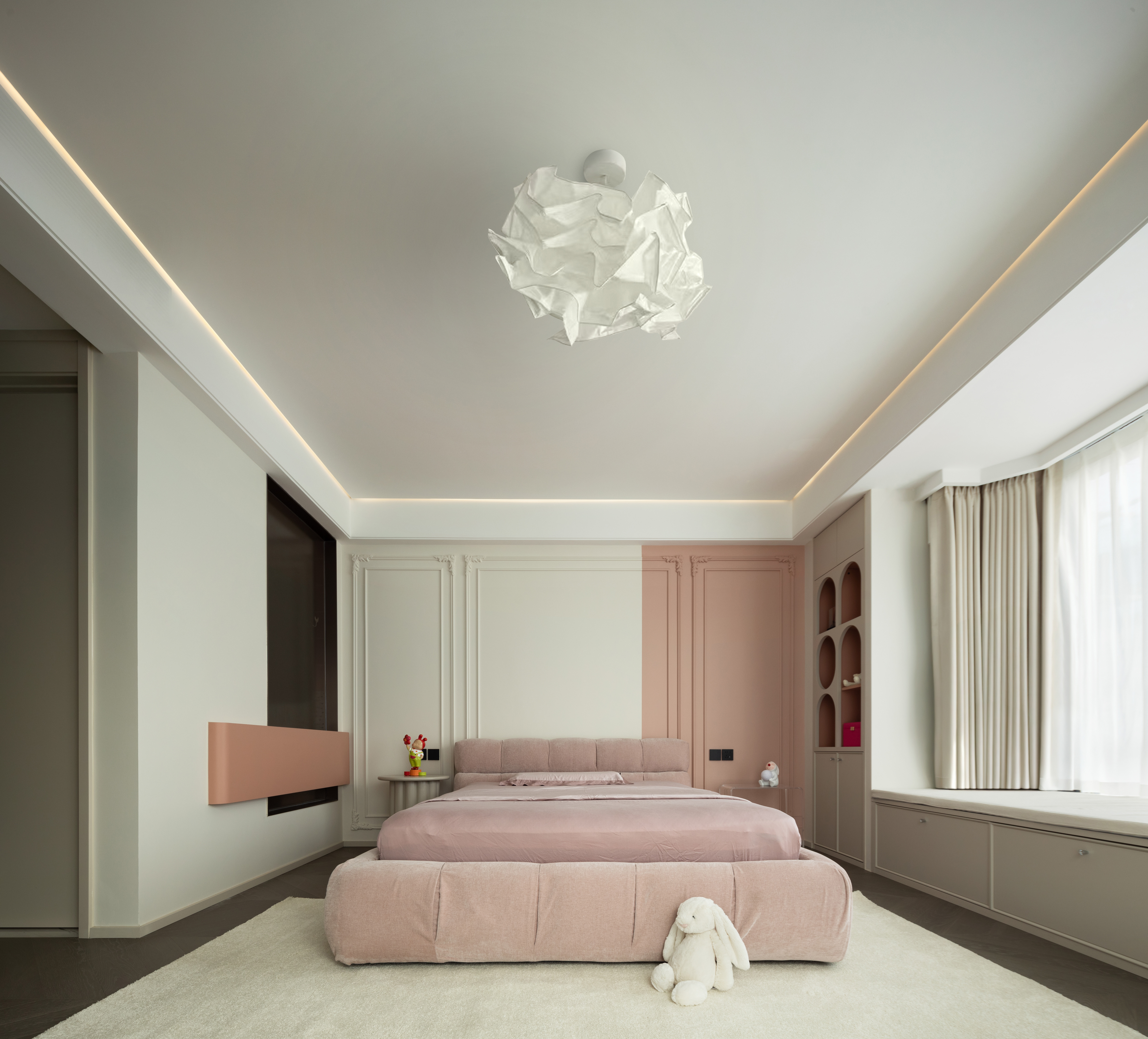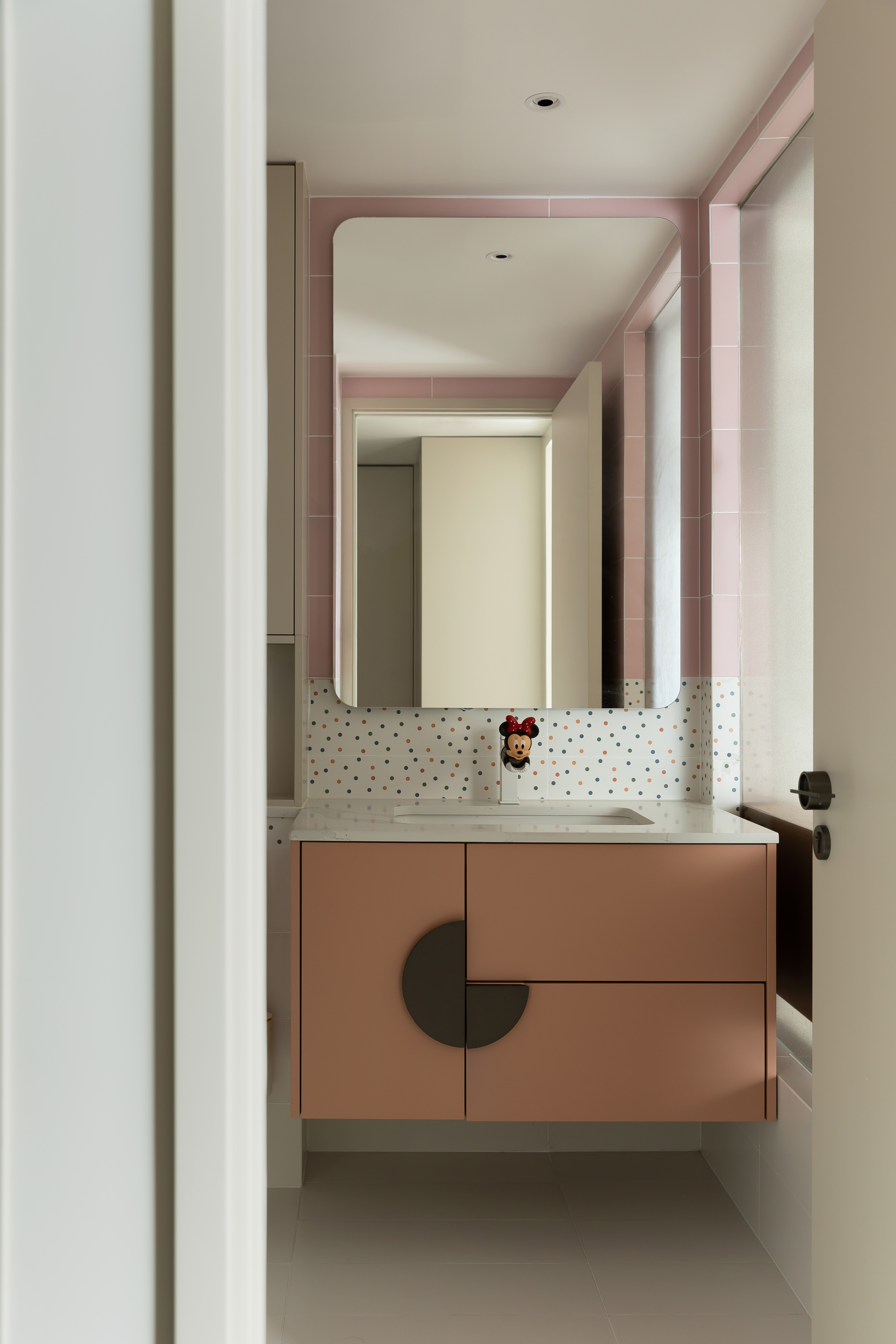 女儿房选择了温柔的粉色,以低饱和度呈现,奶油白与粉色拼接的床头背景,优雅的法式线条勾勒出甜美的气息,将童真与优雅平衡的恰到好处,满足了孩子不断成长的需求。卫生间也使用了不同色度的粉来装饰墙面和柜体,让心也跟着柔软了起来。