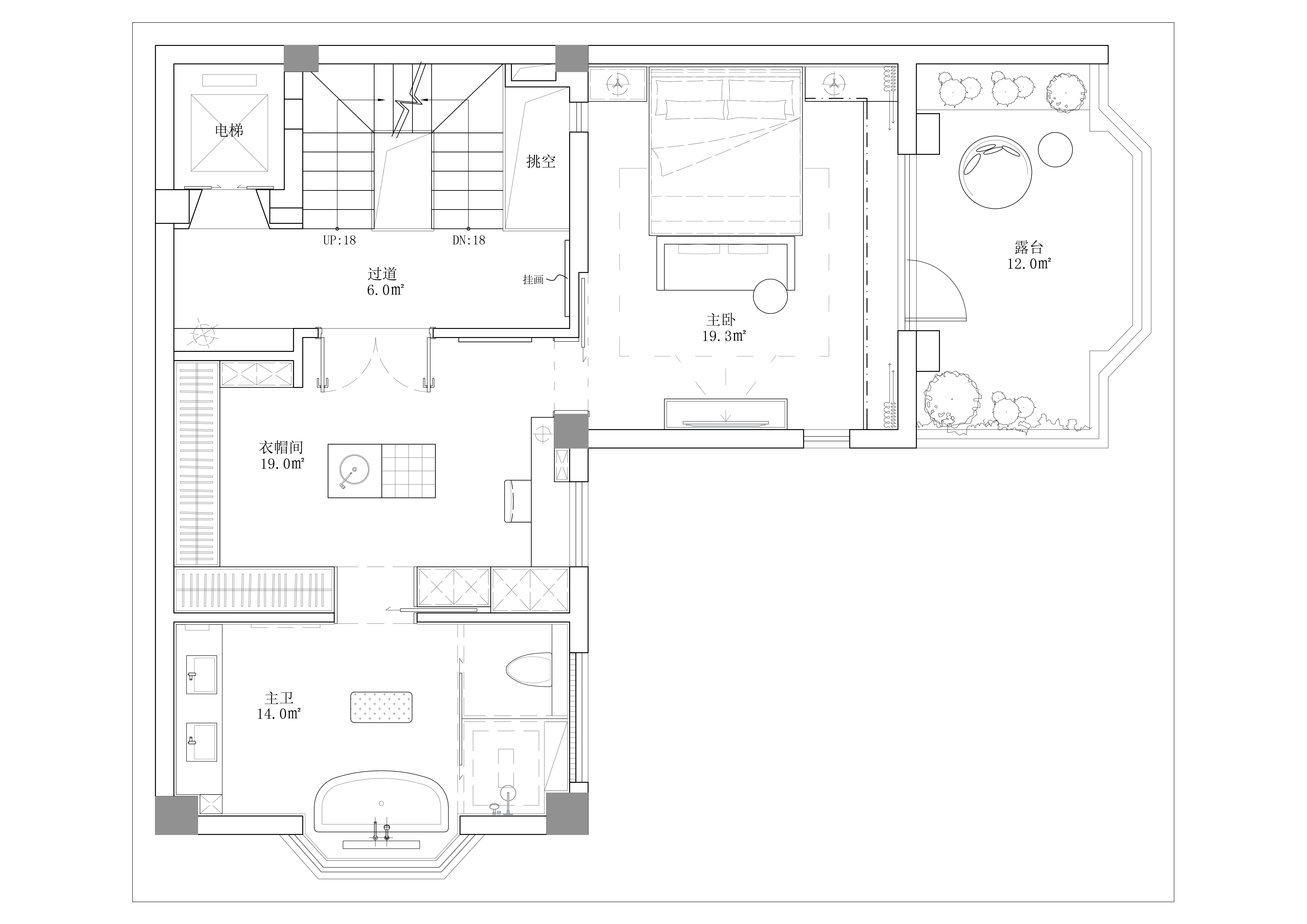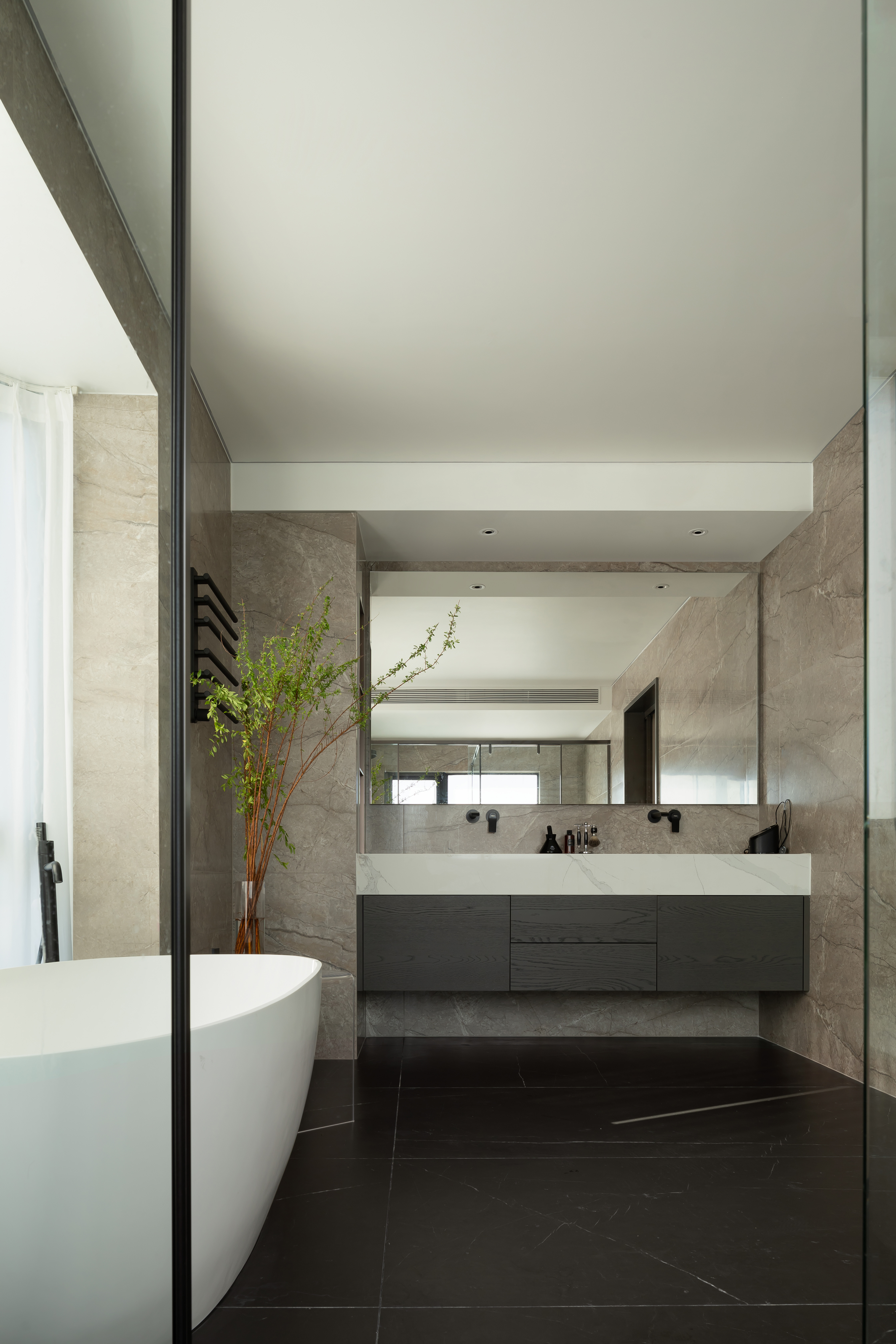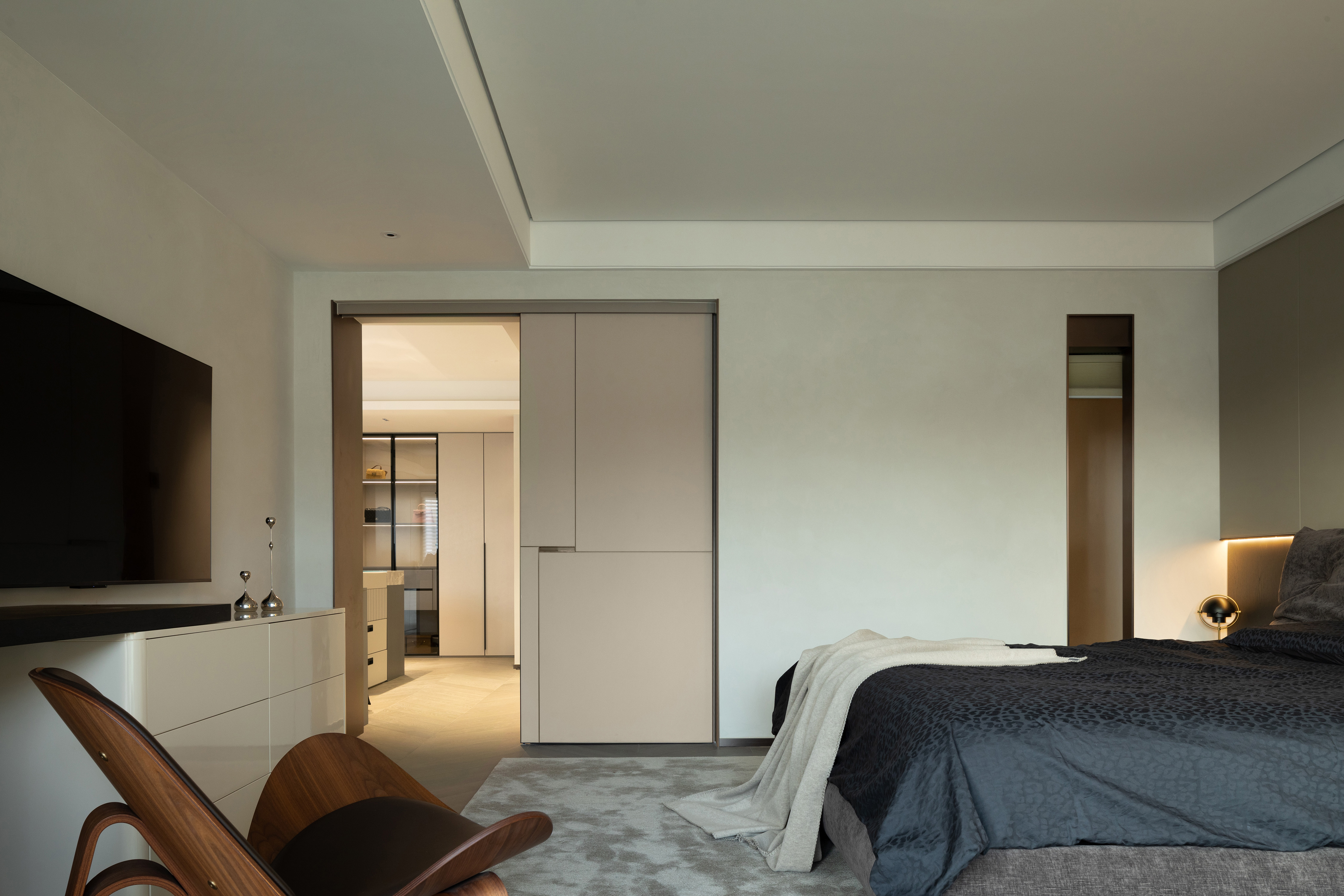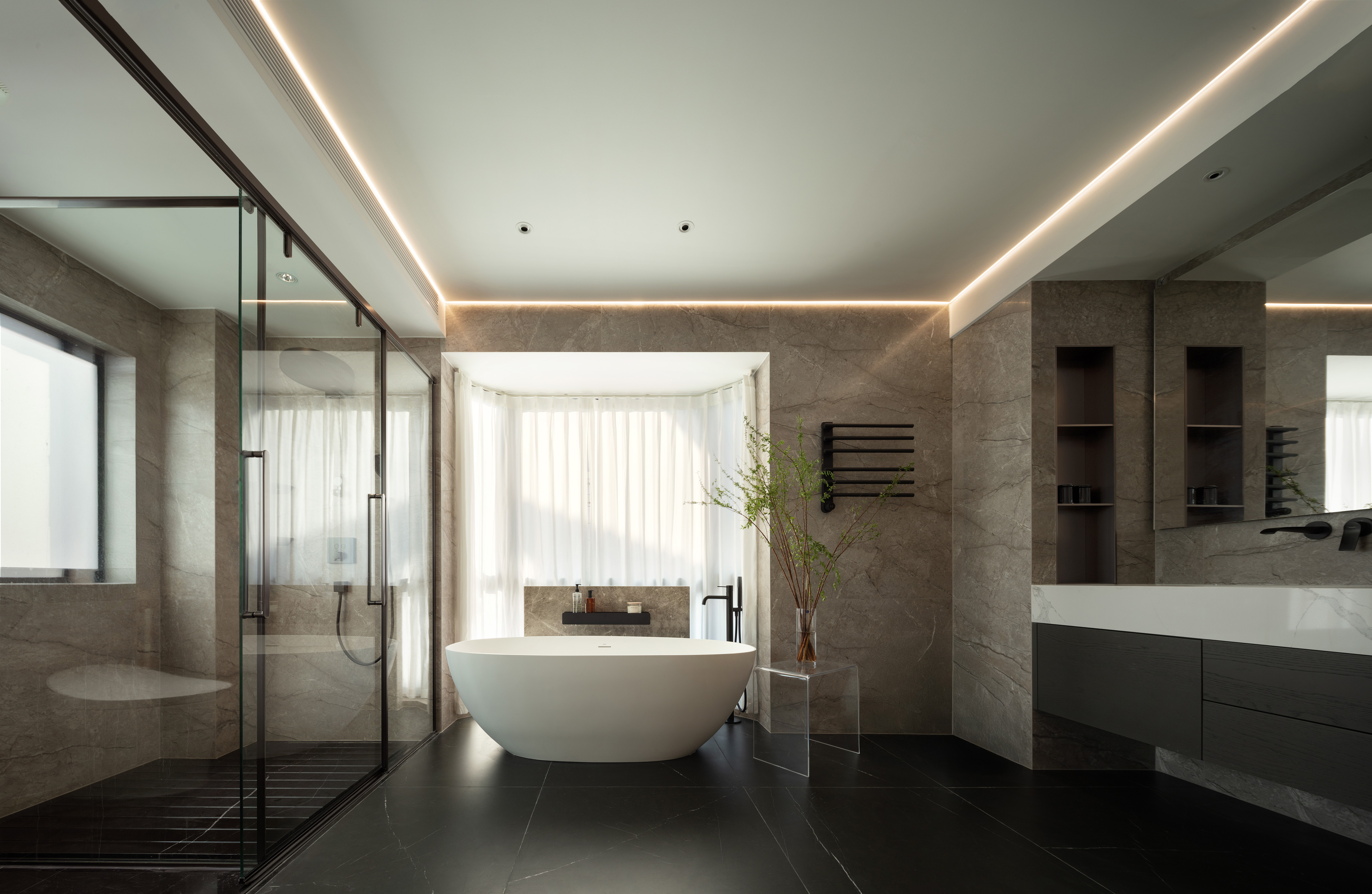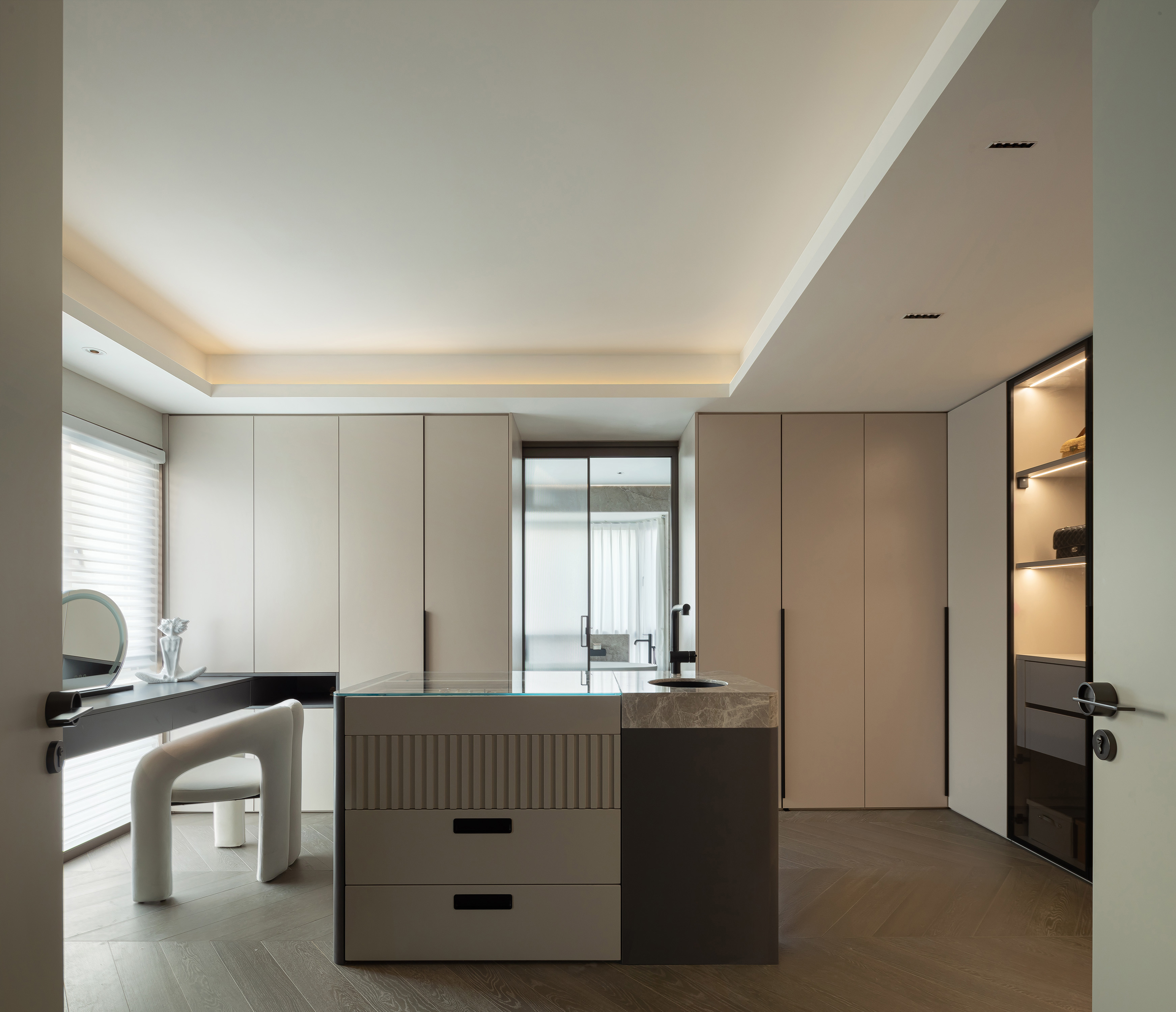 主卧套房结合了宽阔的衣帽间和卫生间功能,女主人东芮美丽优雅,对于衣帽洗漱功能要求极高,卫生间是她的疗愈之地,因此需要确保动线的合理便捷,以及使用的舒适。