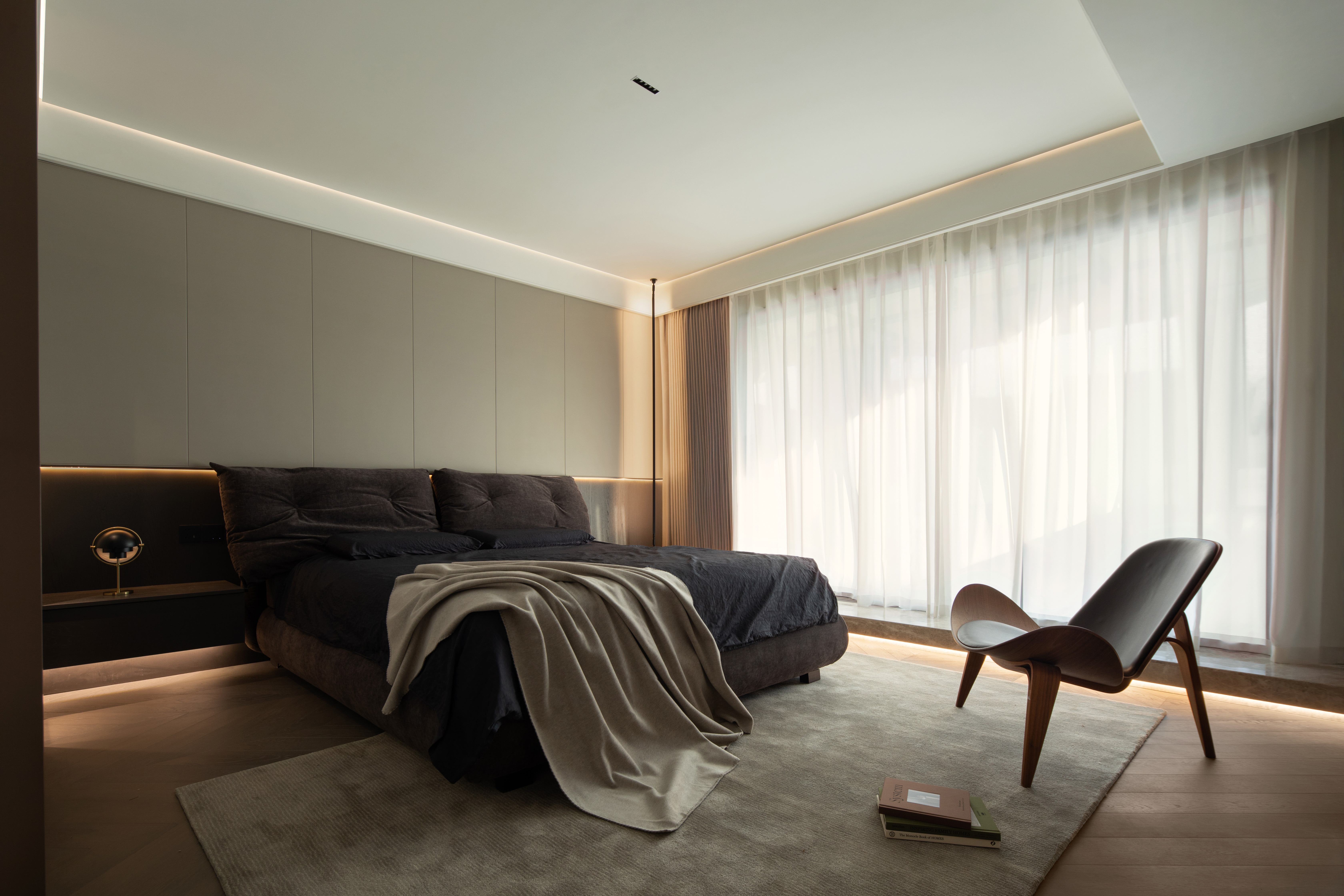 空间意境:潮流易逝,气质不减,我们希望家历经时间而愈加经典,尽量简化装饰元素,以简约的线条和经典的色彩来表达,因此公共区域使用了不同色度的米和灰,织物、木材、石材相融合,平衡冷暖。