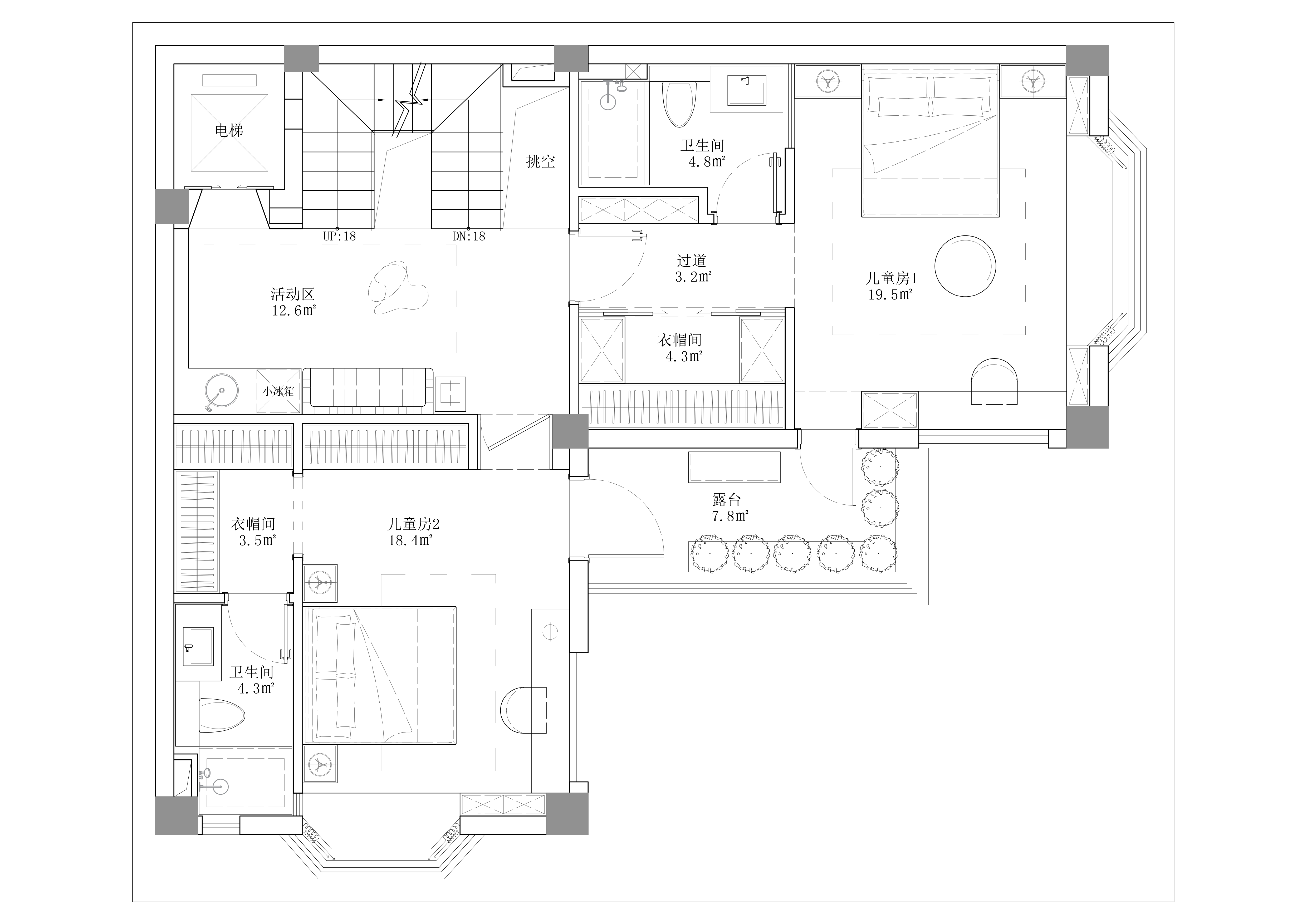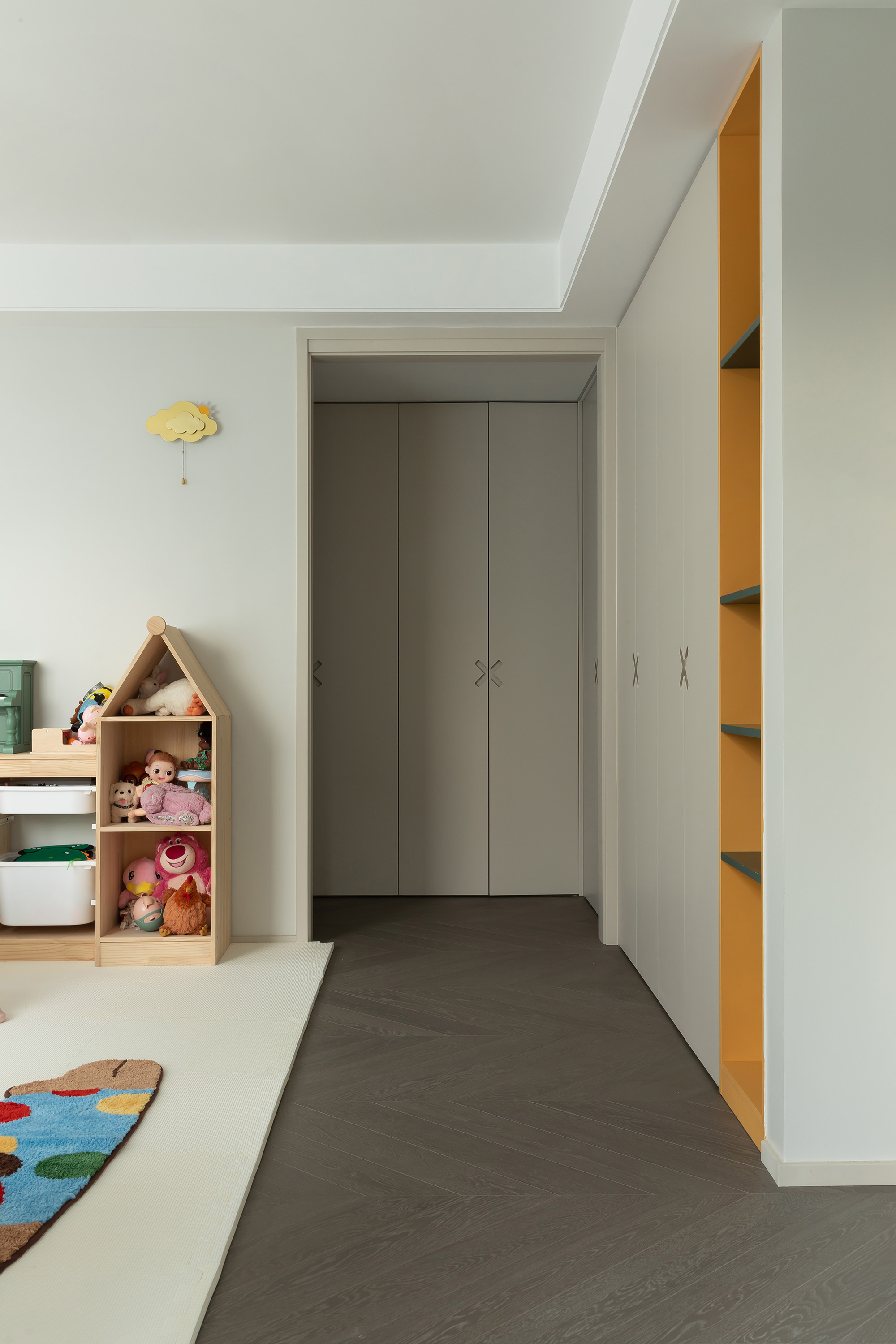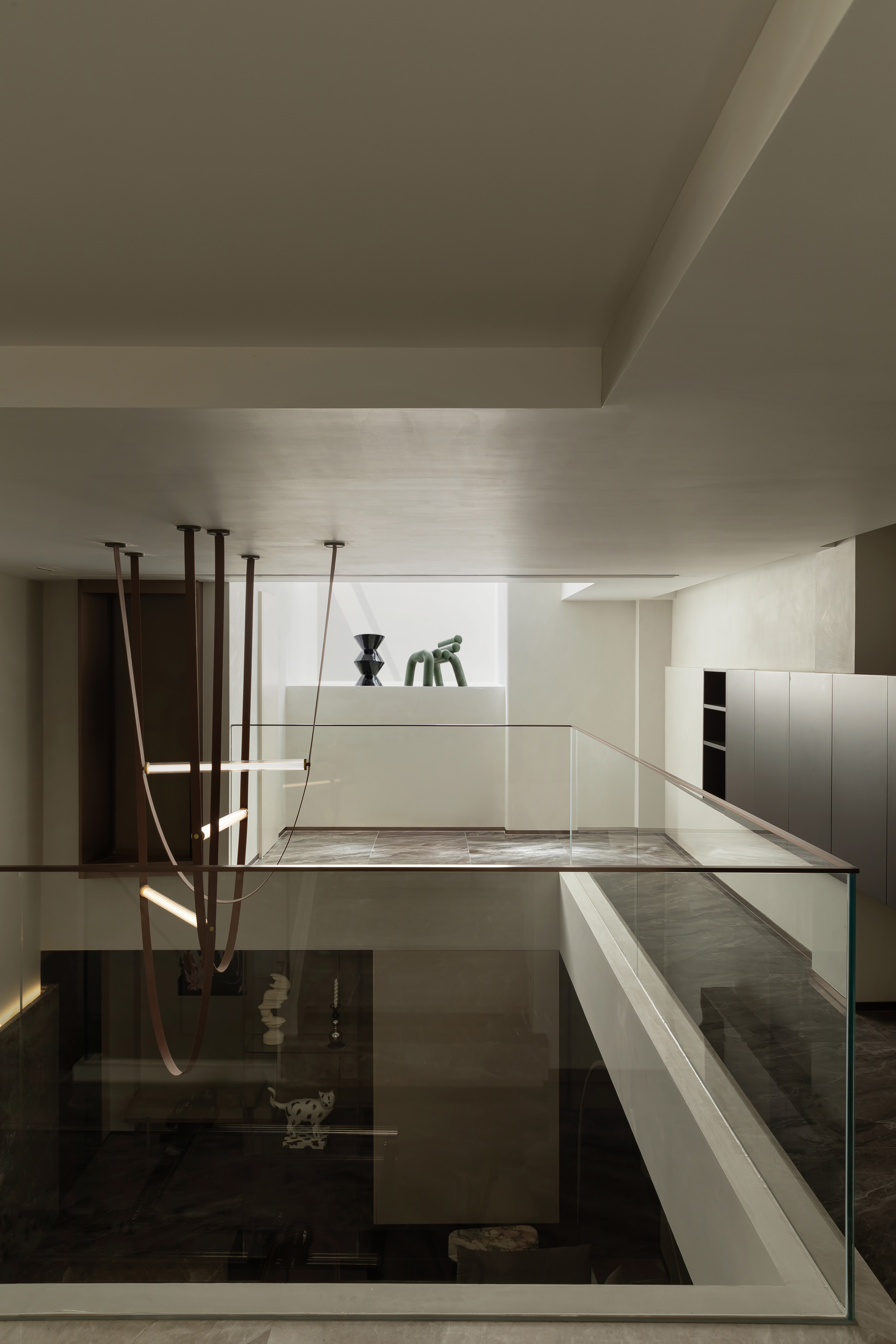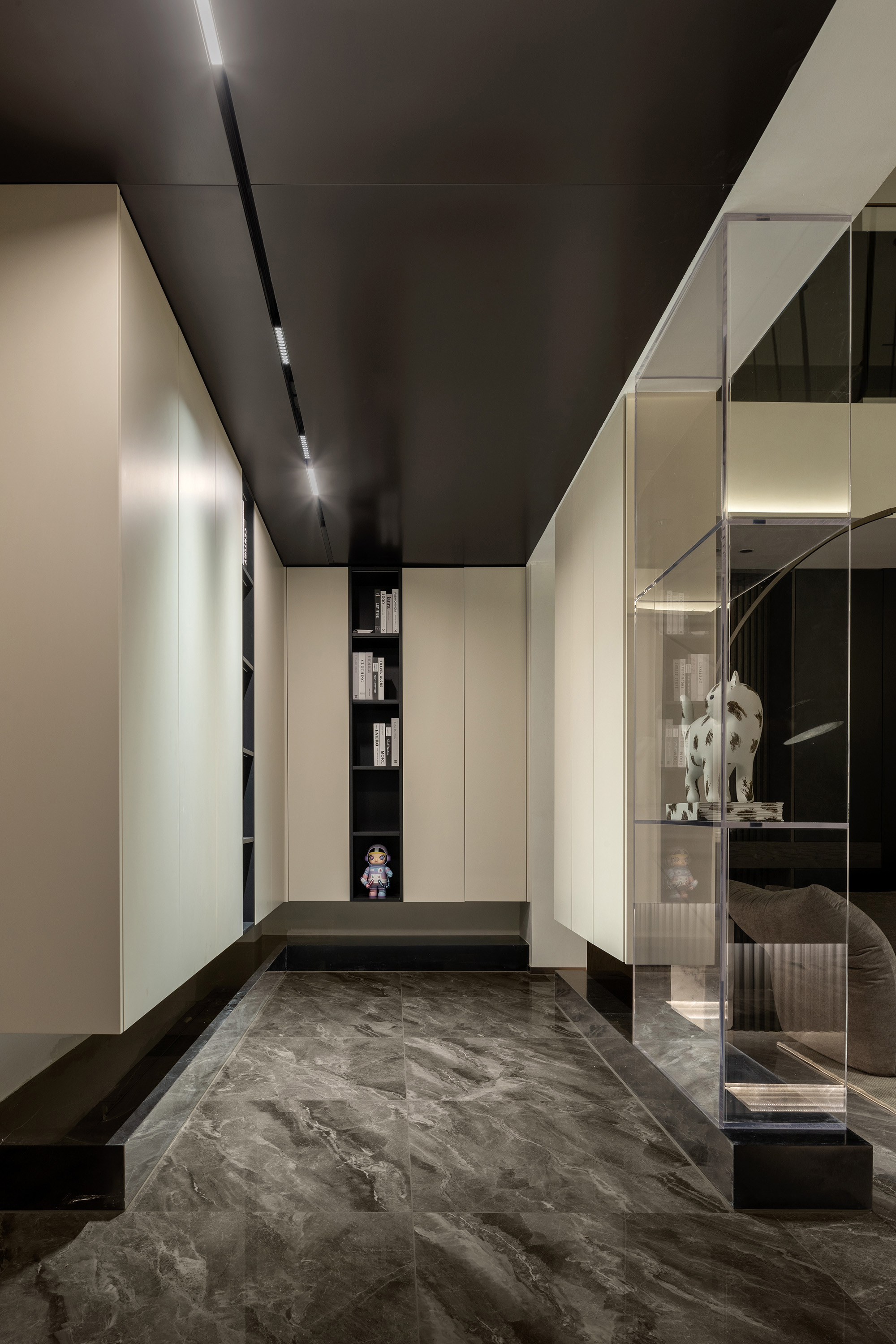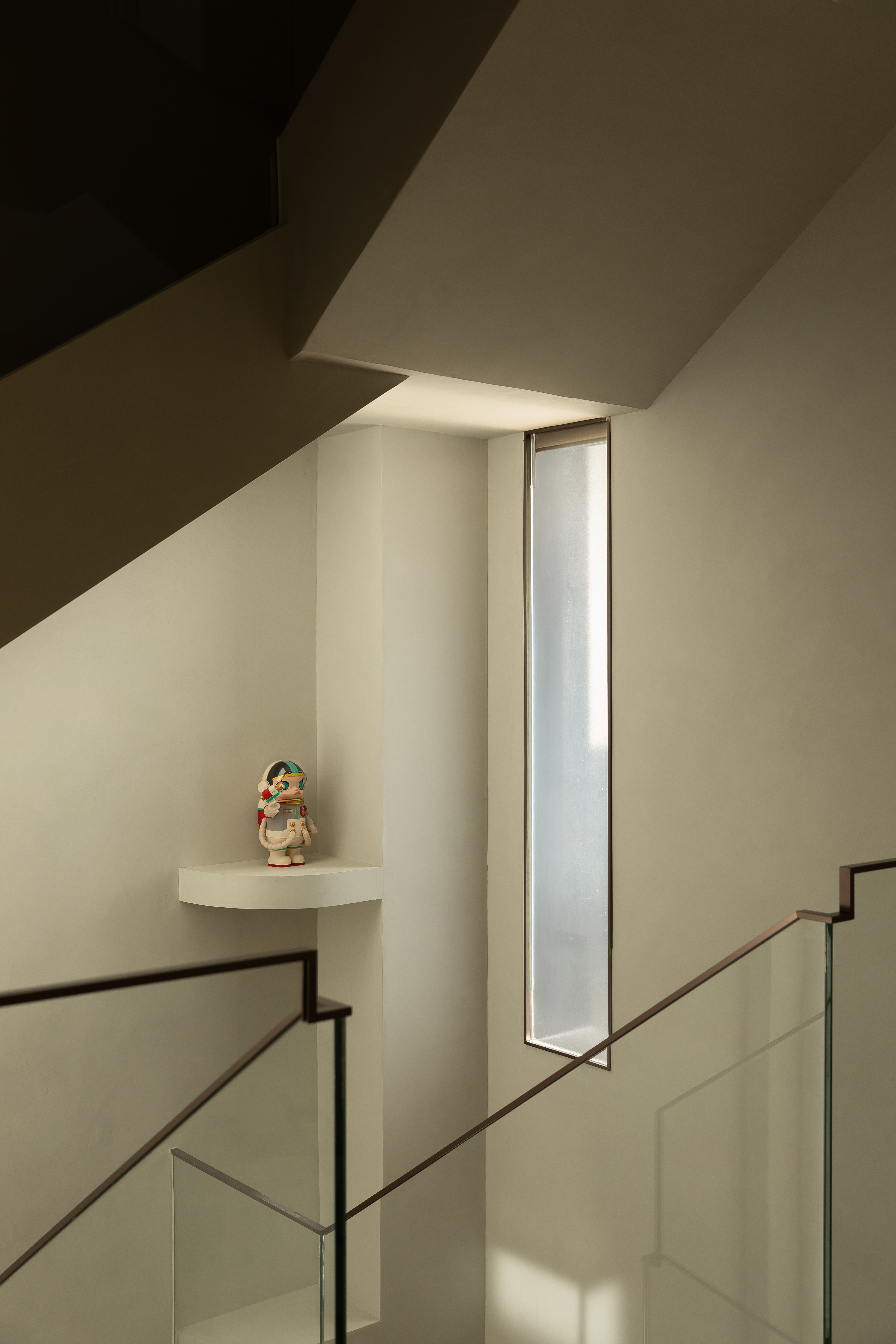 东芮希望这个空间除了承载全家人的生活,也可以完美的展示Molly玩偶,在上下的楼梯通道楼预留了挑空层板作为玩偶展示,展示区域的灯光也成为楼梯间的灯光,东芮收藏的玩偶们拥有了一个完美的“家”。 -