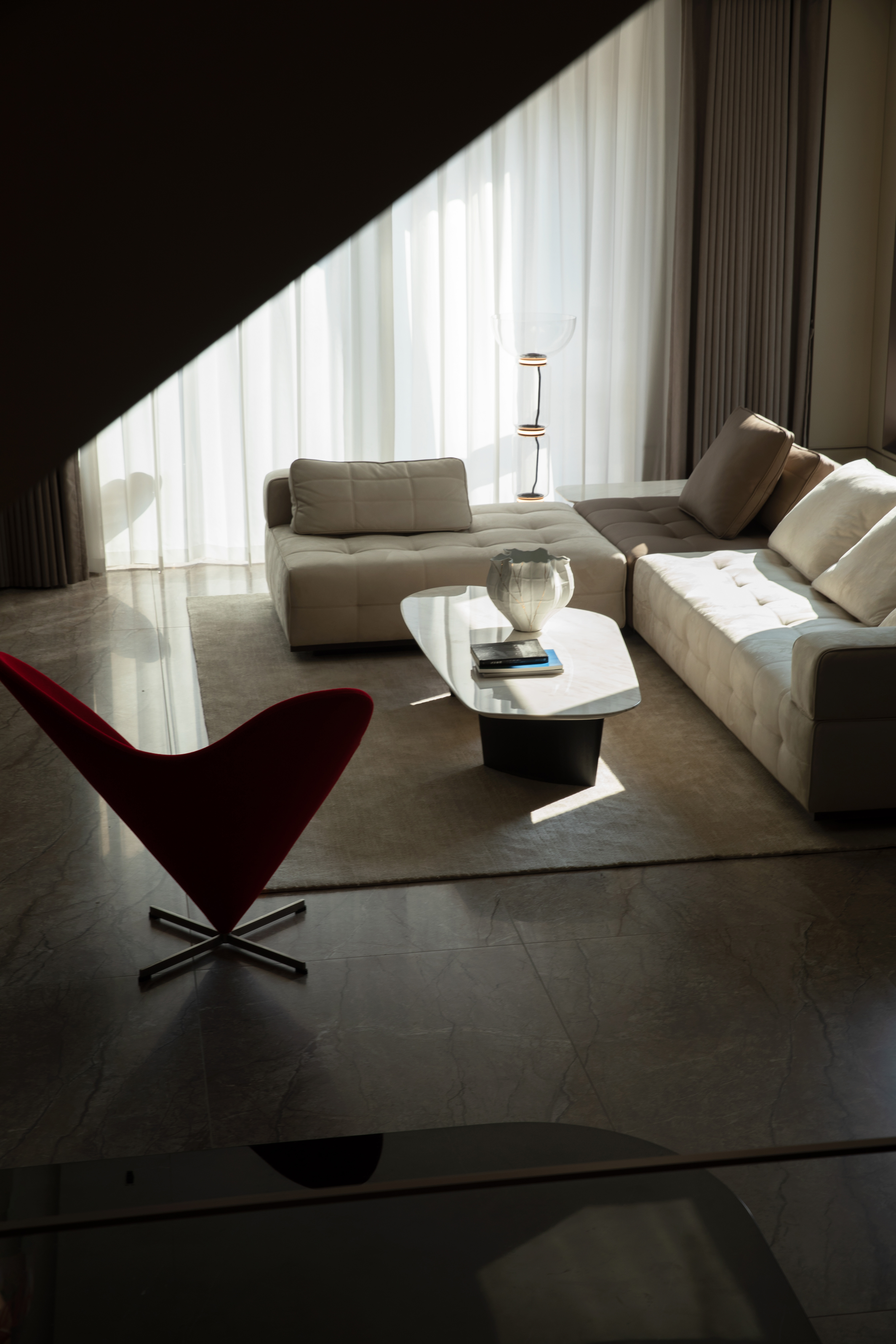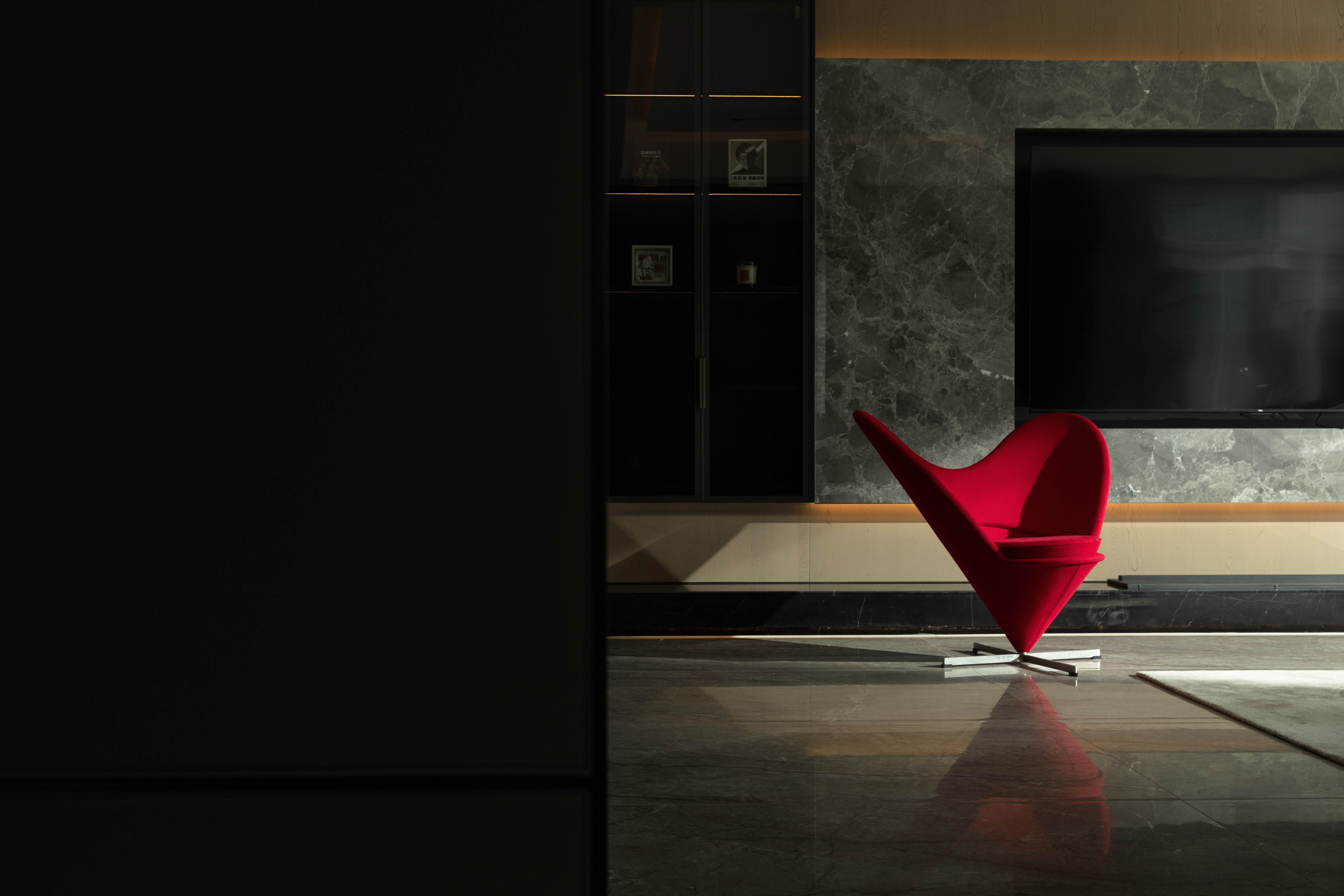 1958年设计的HEART-CONE Chair在傍晚的阴影里鲜明而耀眼,以突破常规的几何线条勾勒出爱心的形状,富有强烈的表现力。椅子不仅仅只是一把供人休息的家具,它成为空间的一部分,是主人对家的理解,更是设计想要传达的温暖。