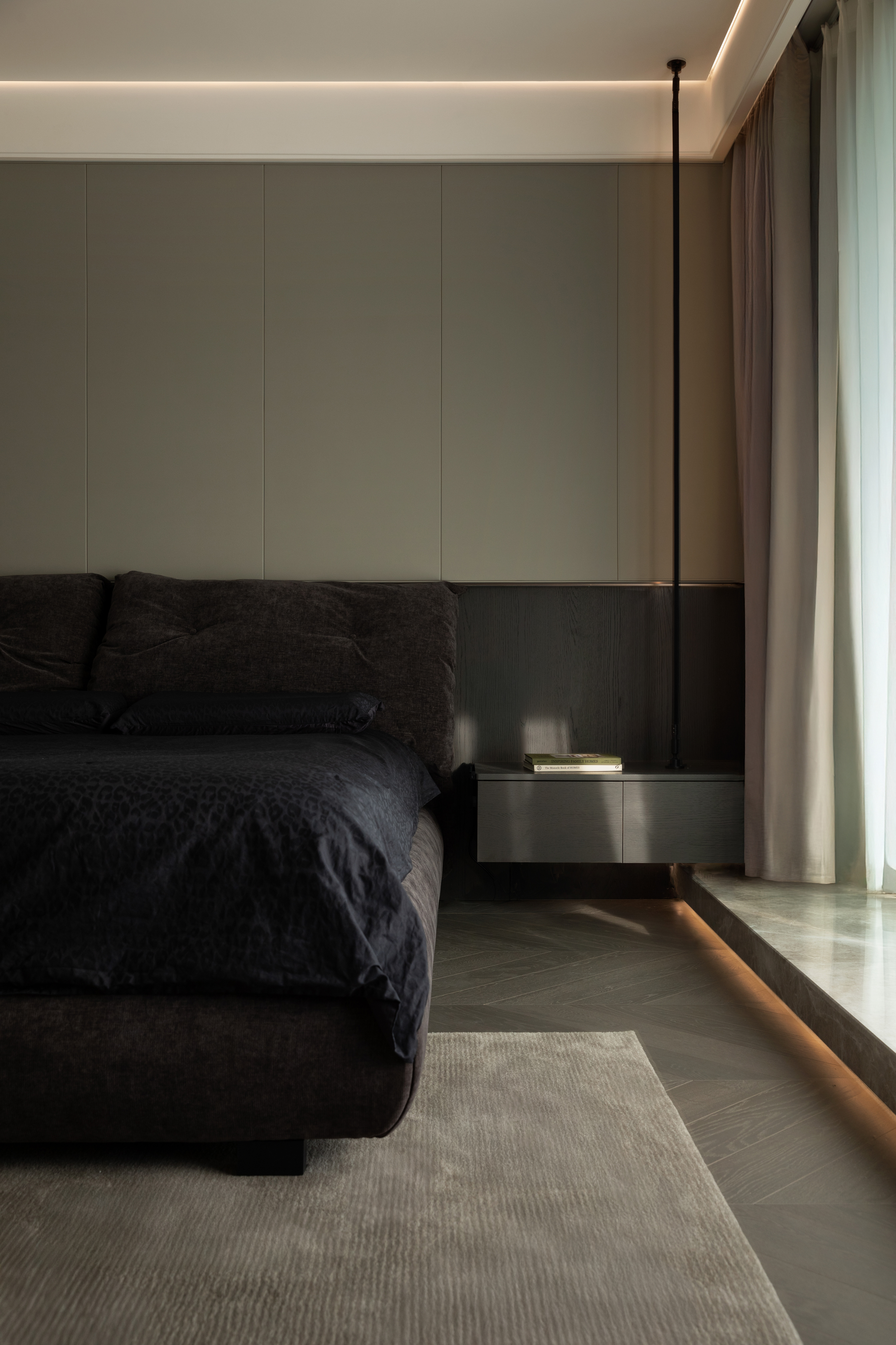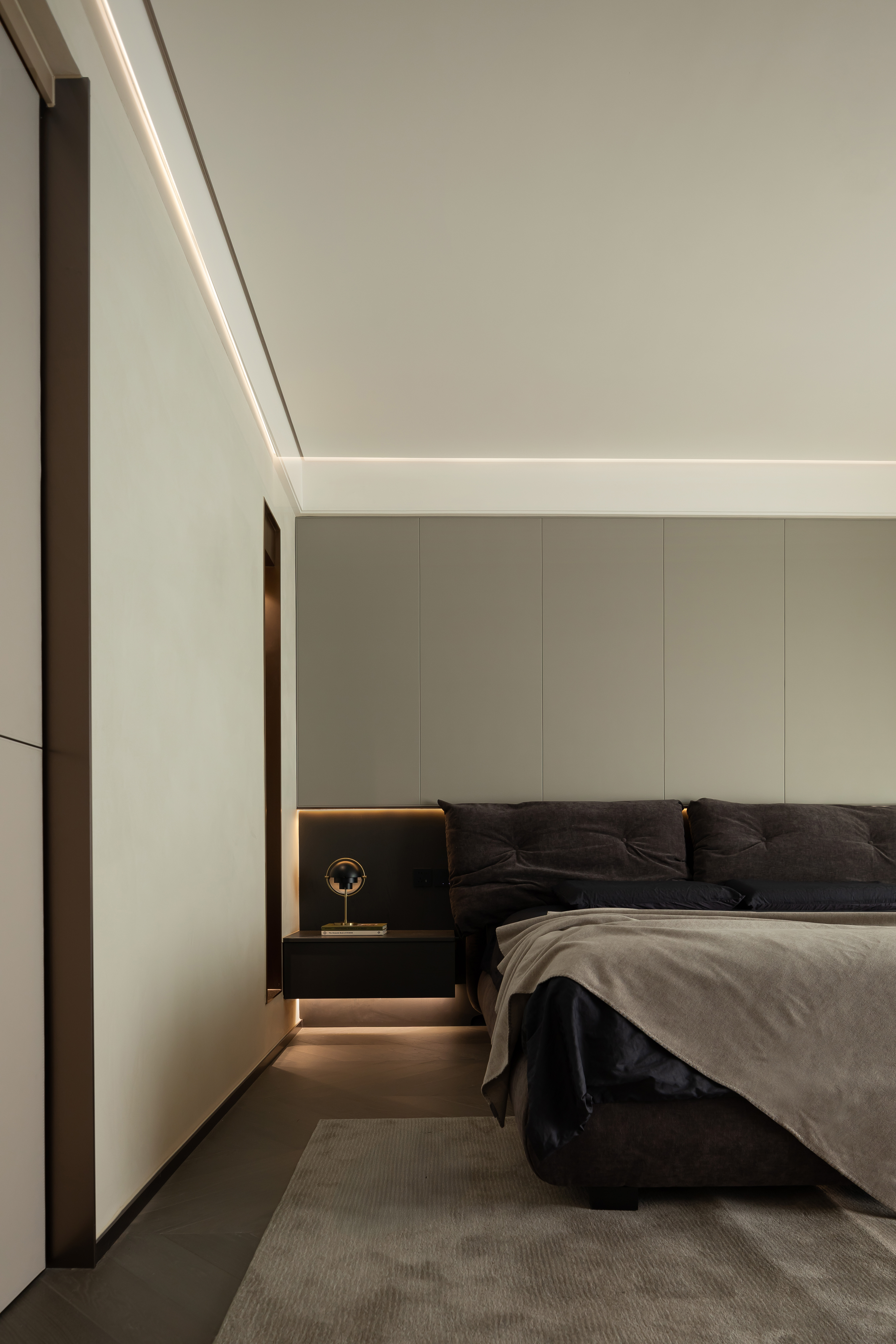休憩区功能简单,以极简的黑白灰勾勒出宁静的氛围,米色与黑色拼接的床头背景冷暖融合,让人进入空间的一瞬间身体变得松弛起来,躺在柔软的床上,直到自然醒来,被家注入新的能量。