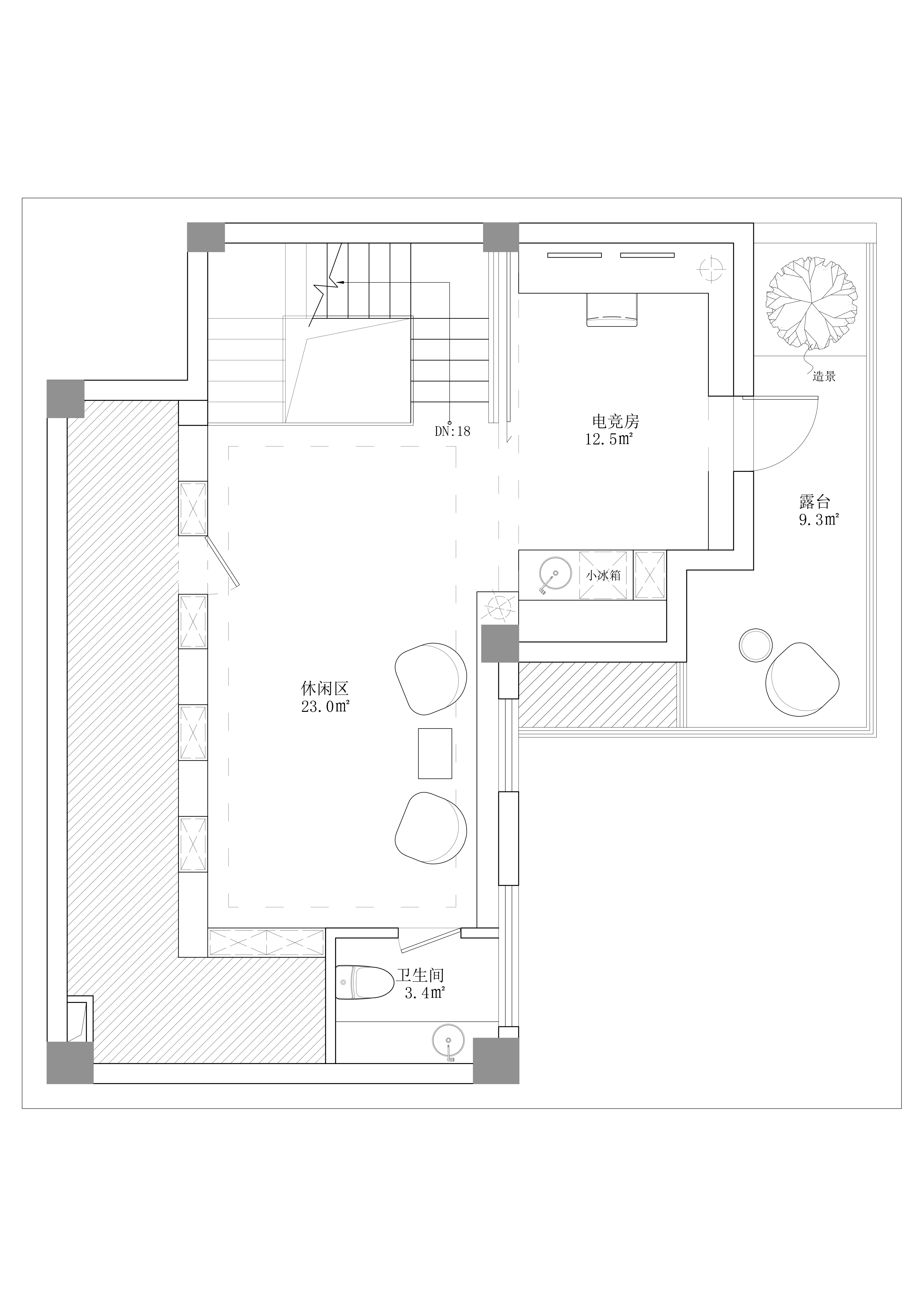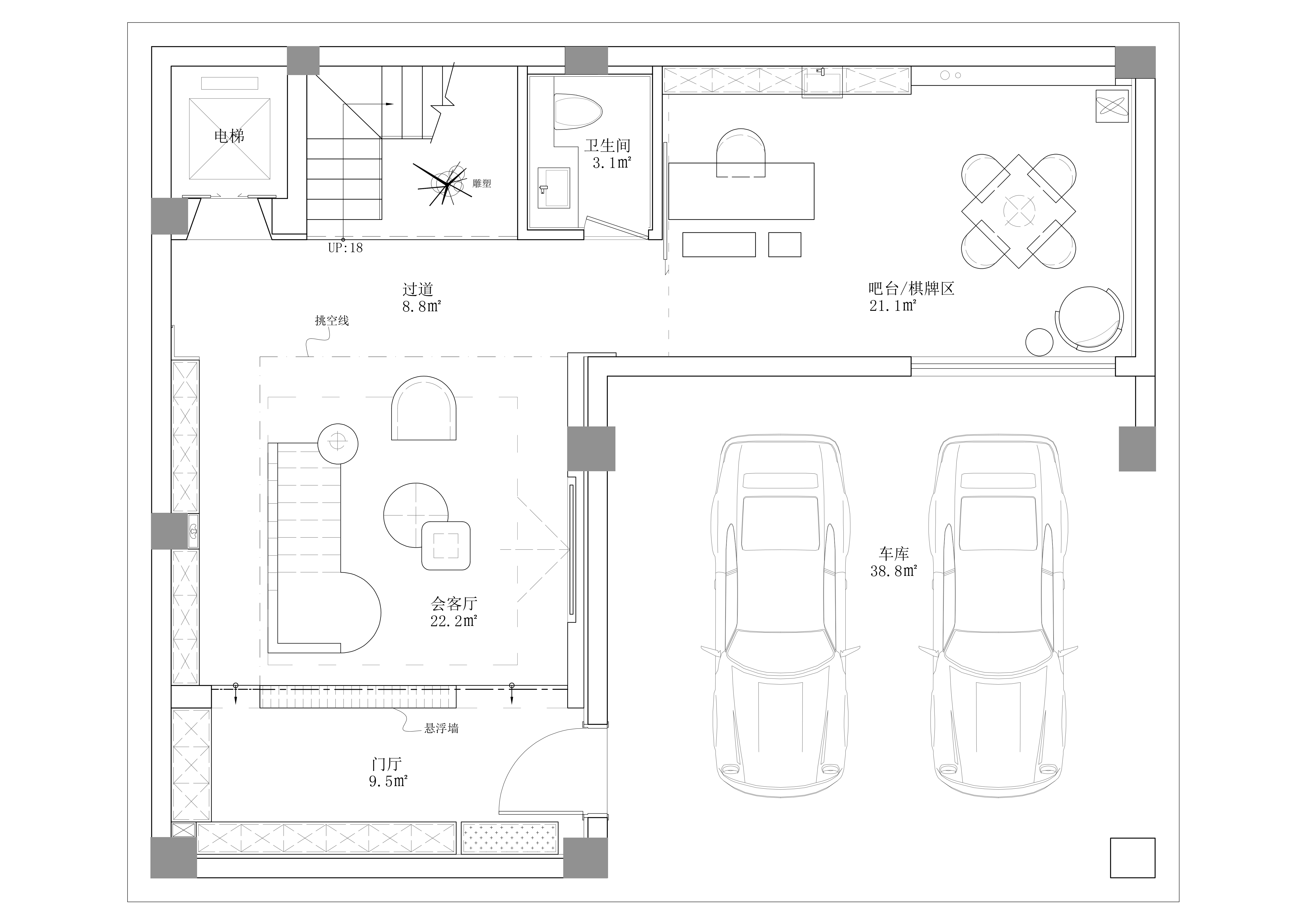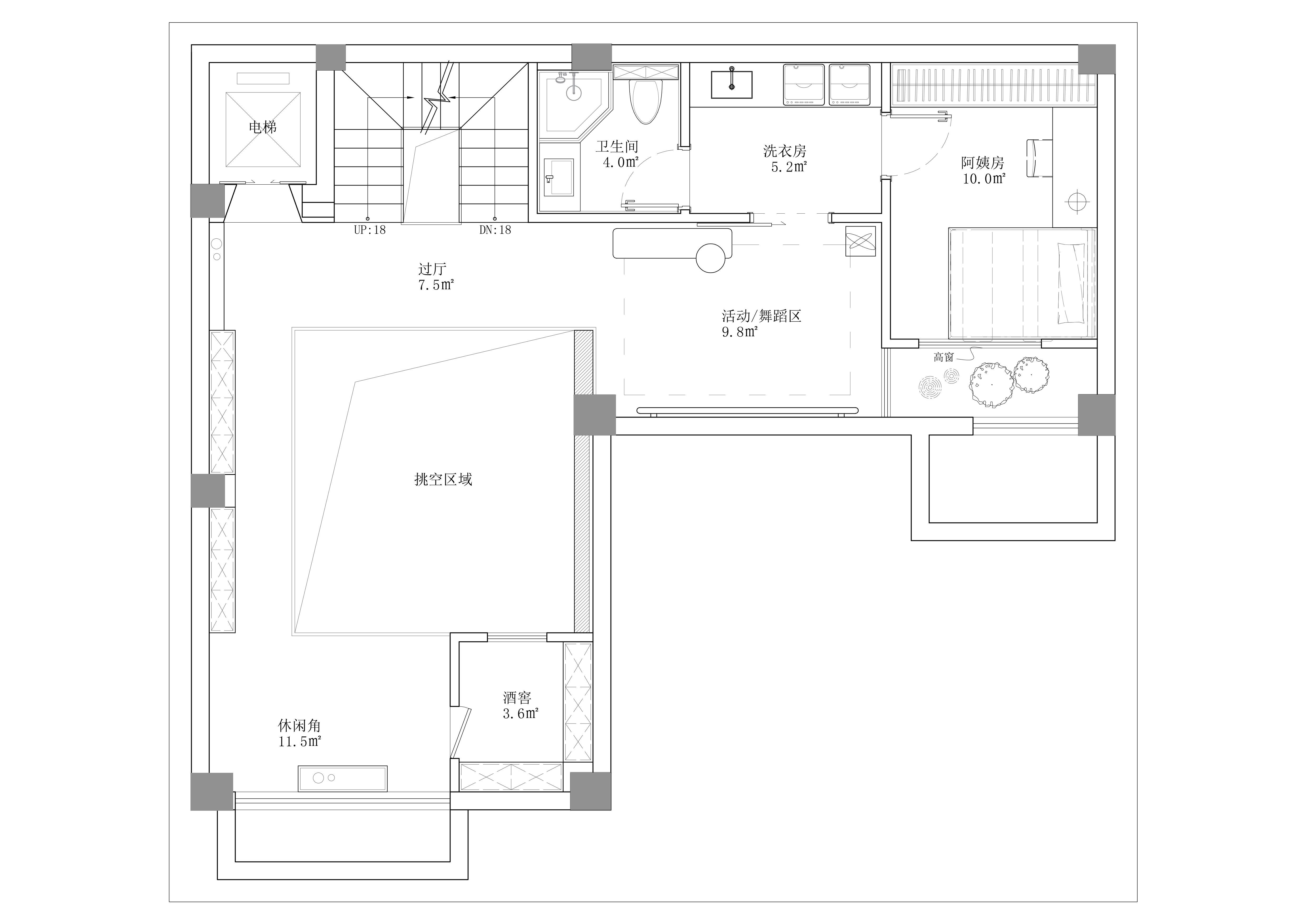 设计选材:原建筑的地下室存在几处缺陷问题,例如只有一个采光井,自然光只能到达B1层,B2层处于纯黑无采光的状态;管道杂乱,层高低;楼梯占用行走动线,两条楼梯动线混乱,地下室闭塞,且没有电梯。