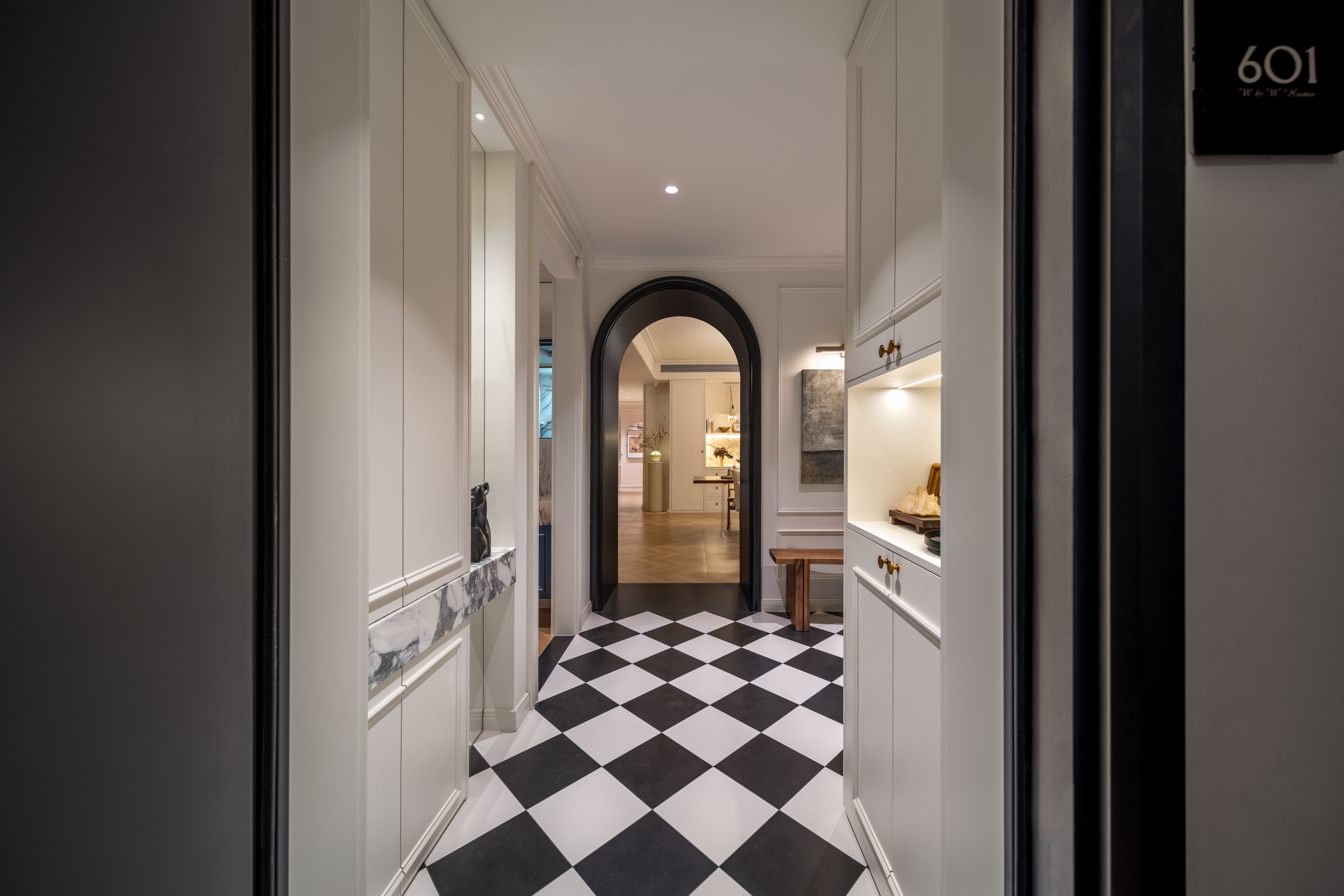 拱形黑色门套的实景呈现,其质感与光影效果远超想象,它不仅巧妙地划分了空间动线,更成为一处独特的艺术框景。