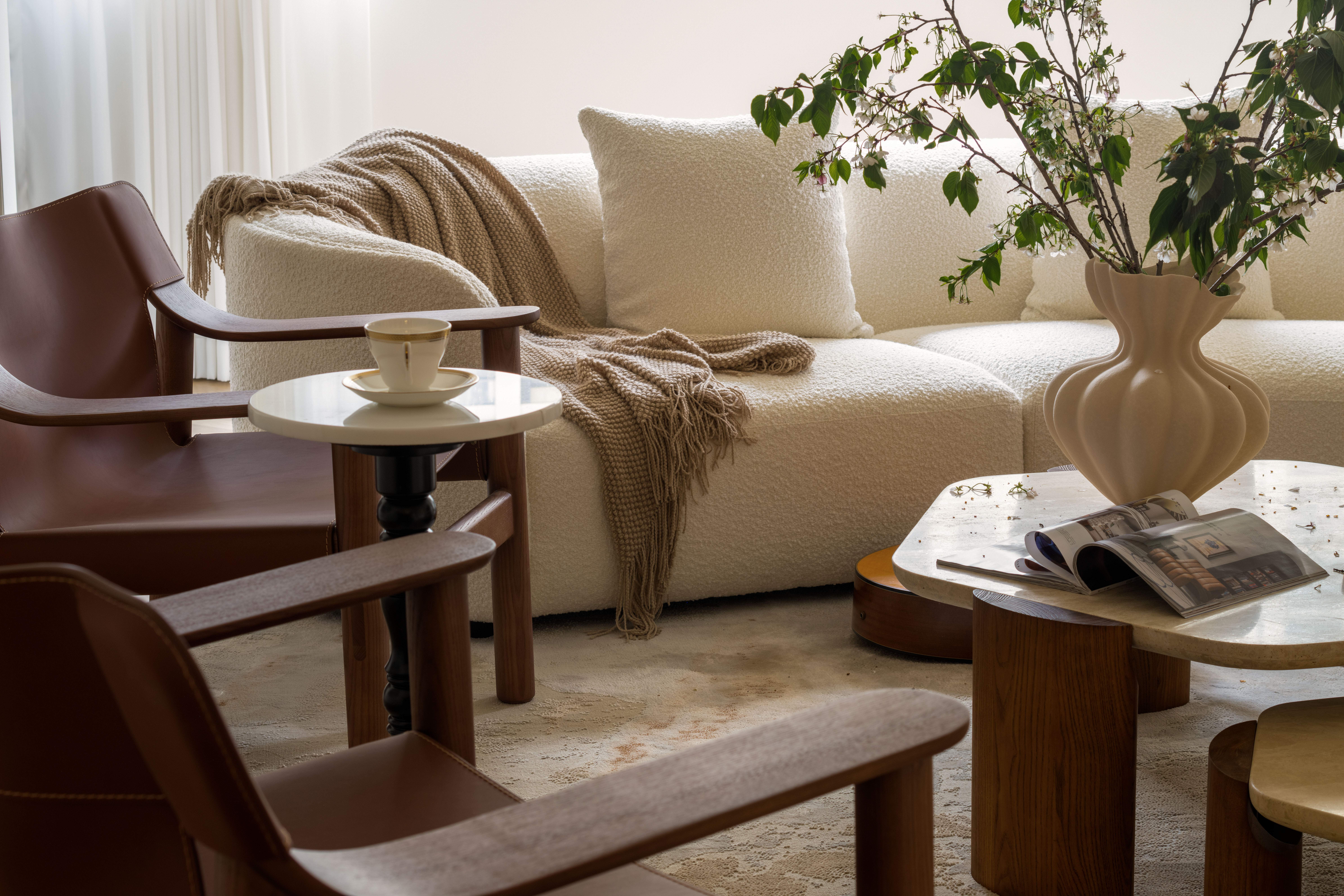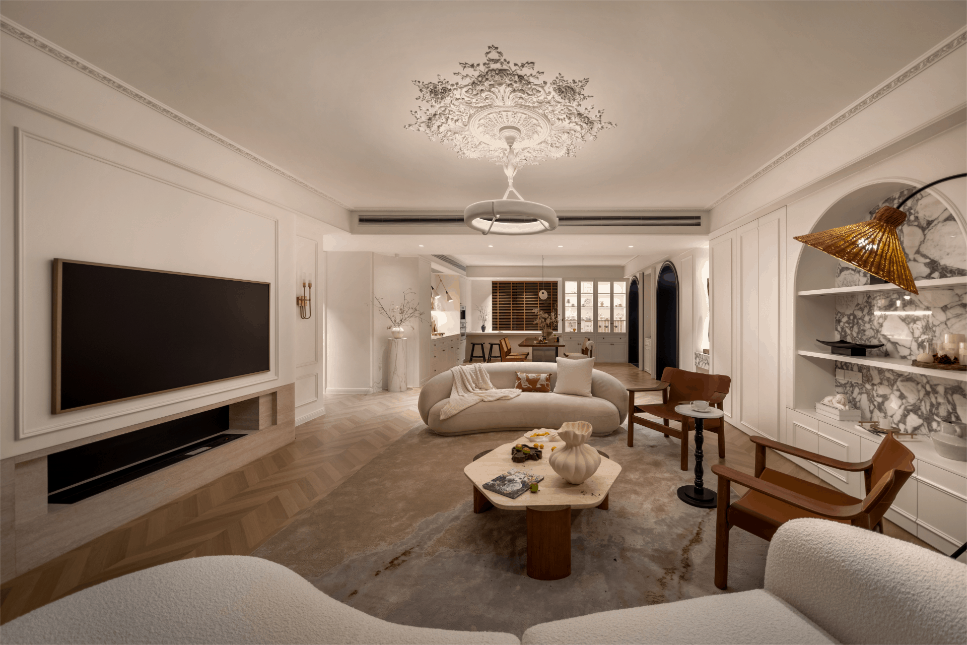设计选材:精选天然大理石、温润柚木、精致石膏线条作为基调,奠定空间永恒、温暖与优雅的法式风骨。并巧妙点缀稀有树瘤木、细腻皮革与手工藤编,于奢华质感中融入自然野趣、舒适触感与呼吸感,形成一场经典、自然与人文的精致对话。