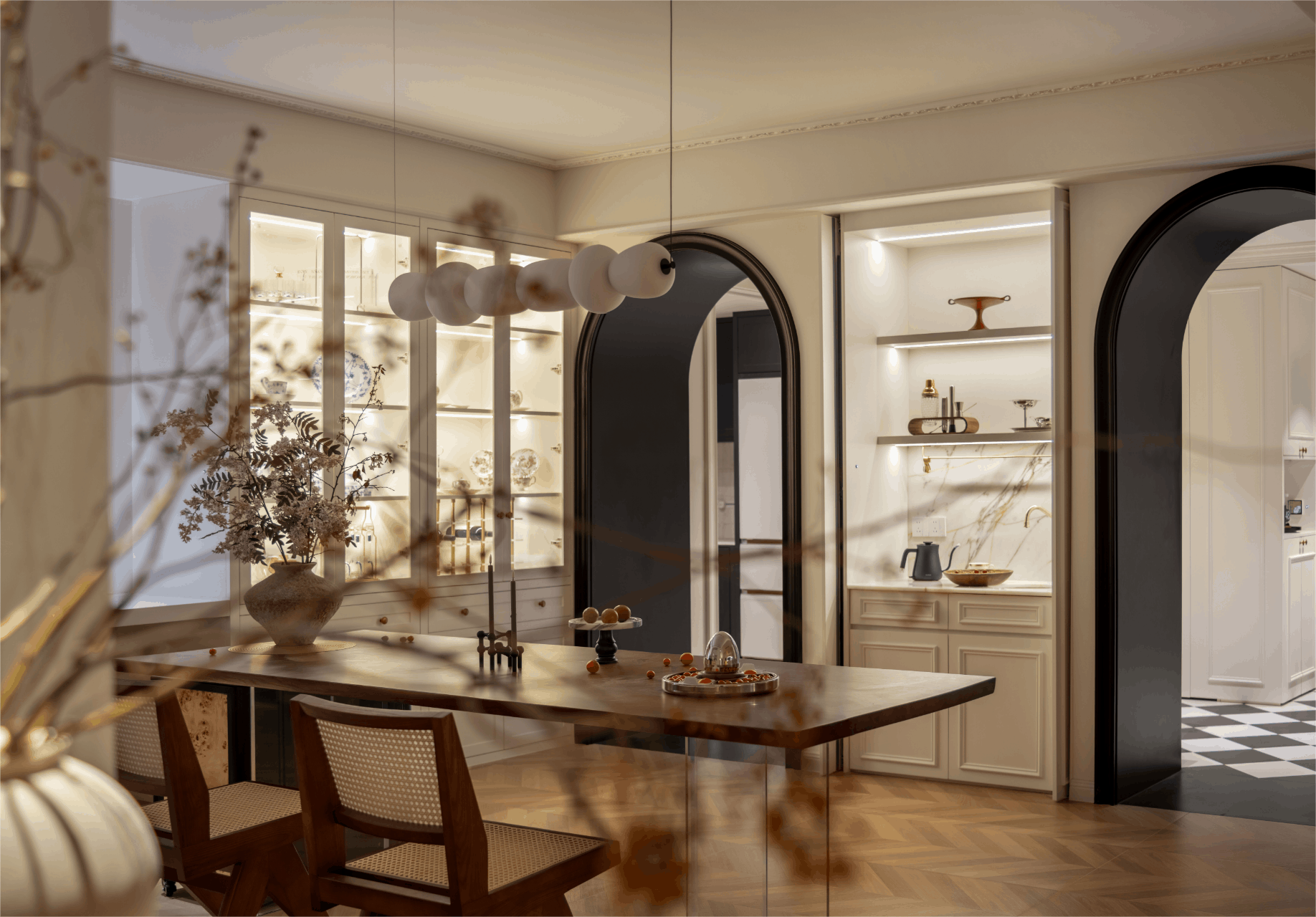 餐边柜延续了整体的设计语言,不仅提供海量收纳,更是公共空间的颜值担当。