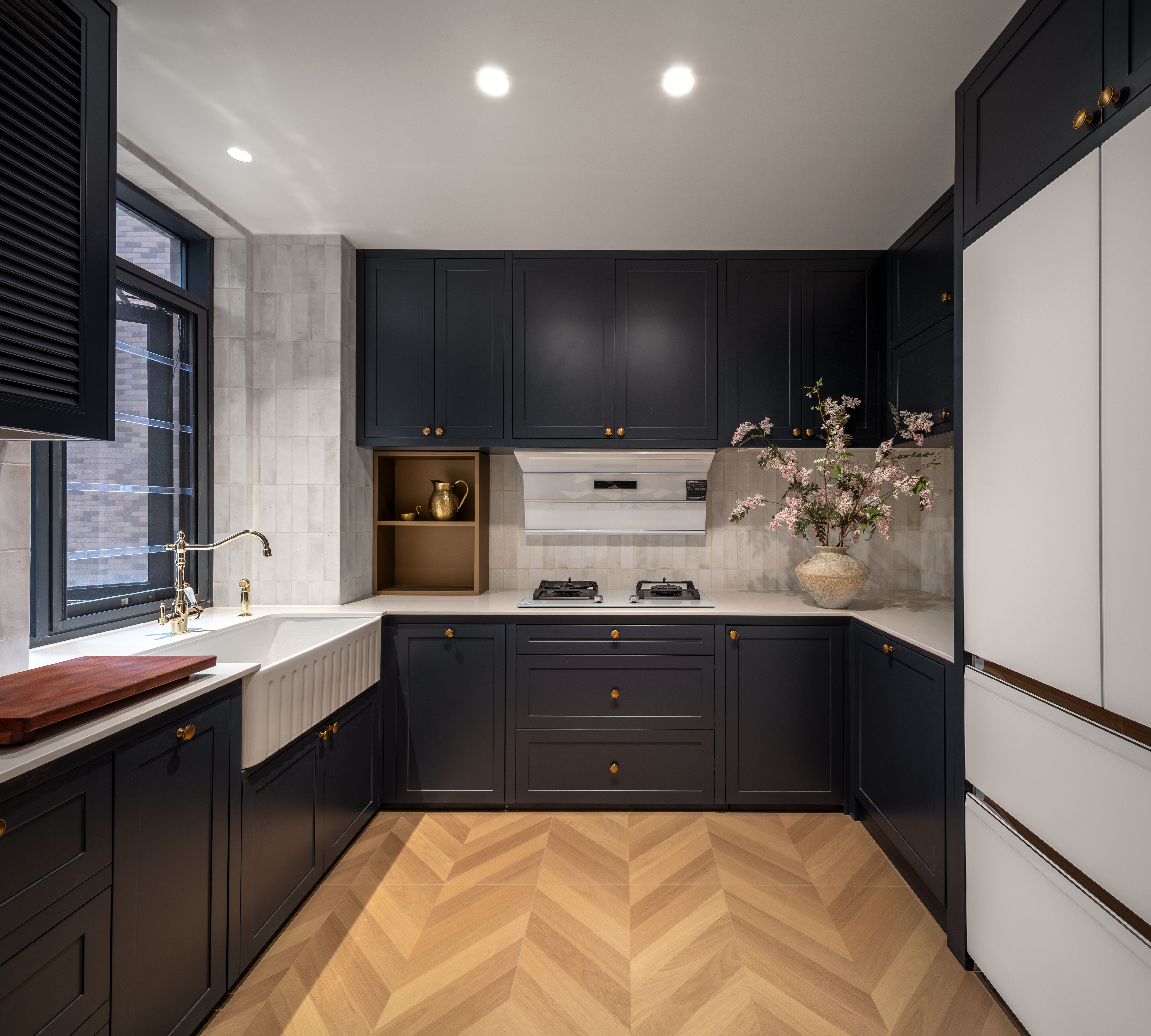 台面的纯白,亦或是经典耐看的黑色烤漆橱柜门,与地面鱼骨拼木纹砖形成各司其职的氛围张力。