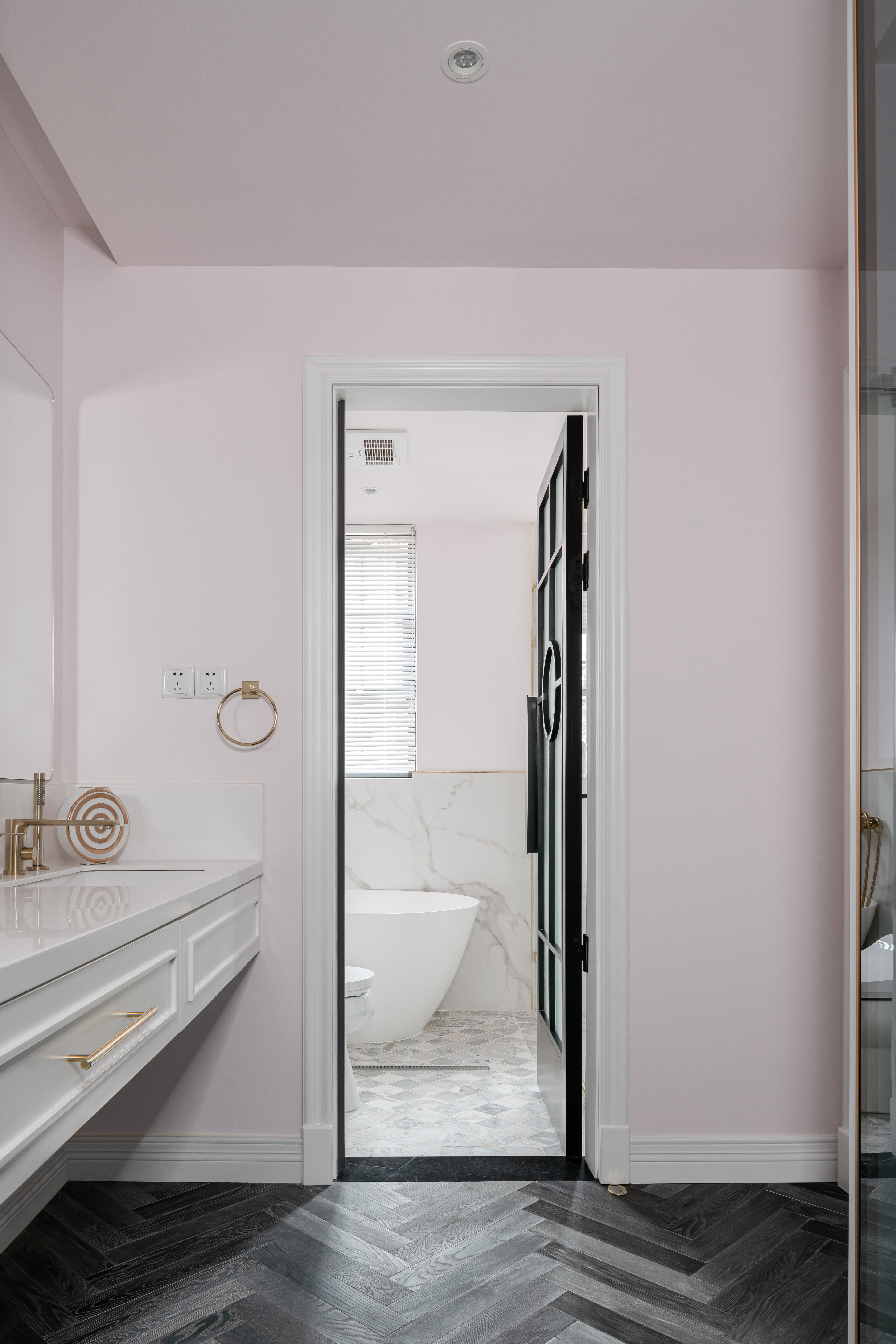 设计师选用经典的白作为浴室空间的主色调,打造具有极简气息的空间。半墙理石砖围绕浴缸,金属线条分割收口使空间的功能分区变得更为奢华,部分墙面与顶面是防水乳胶漆,同色延伸上顶,使空间显得高。