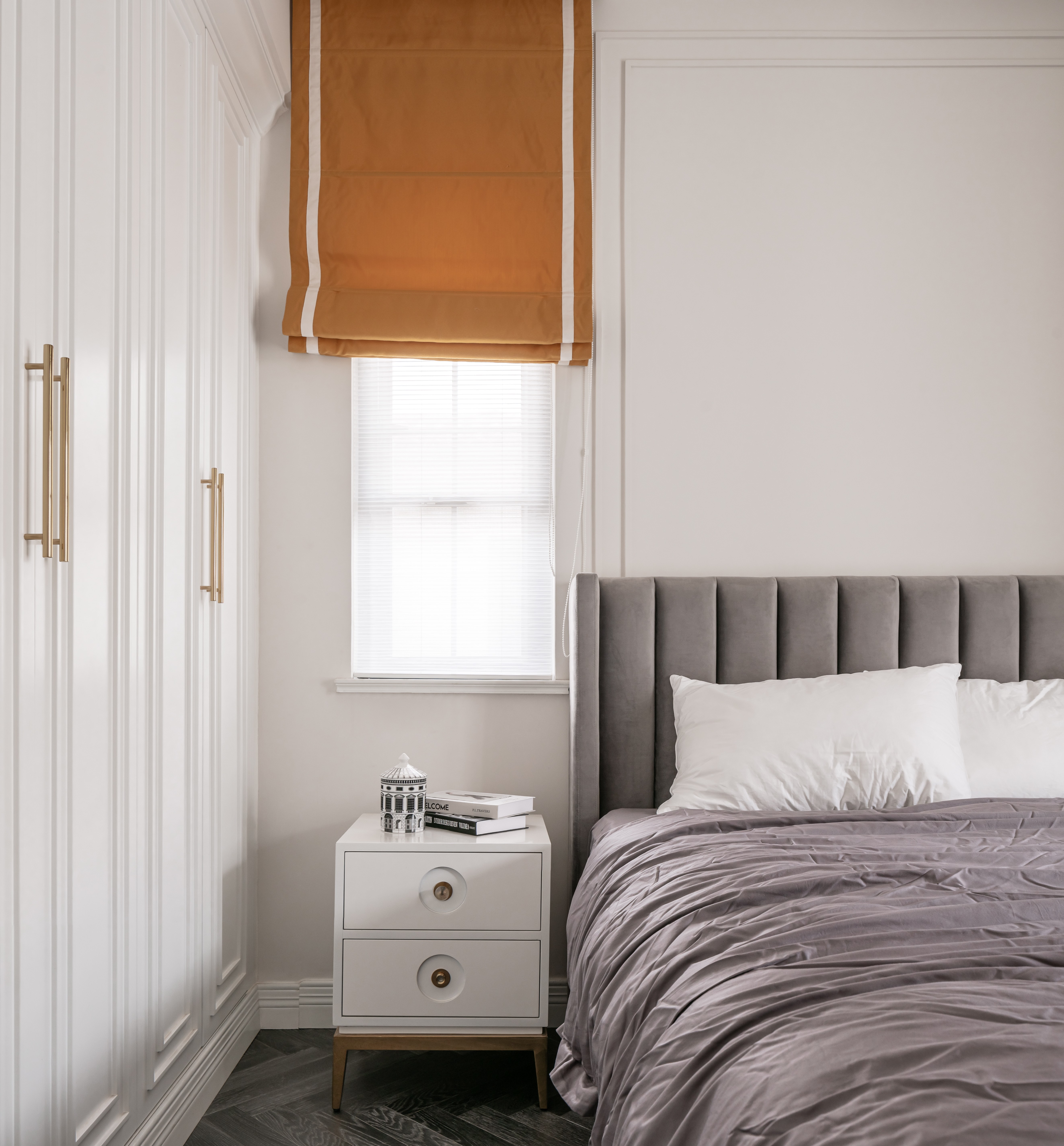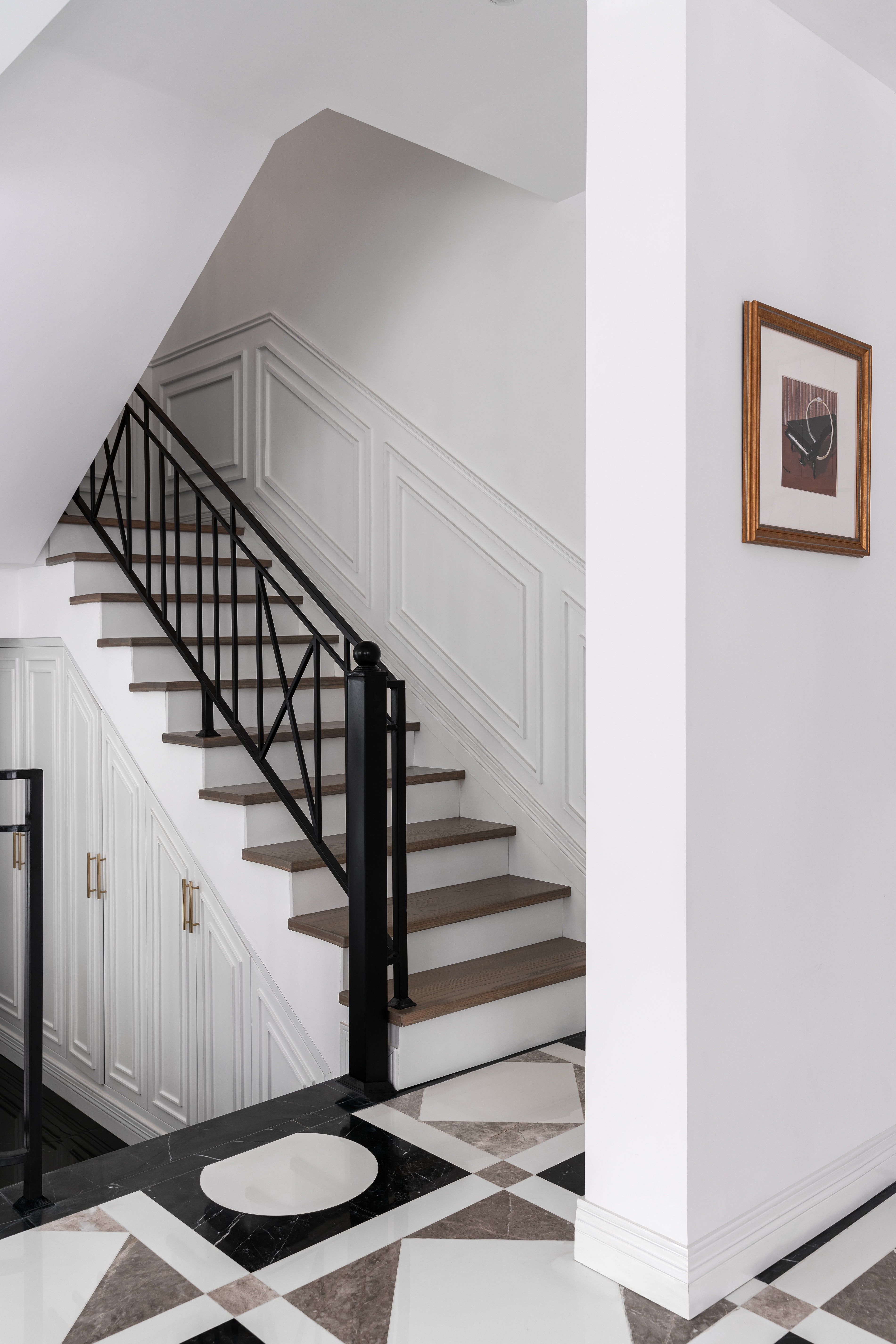 门厅的简约定制鞋帽柜,既满足储物功能又达到了轻法的效果。搭配了法式线条在空间中的描绘,白色作为基调营造出了温和优雅而朴实的空间氛围