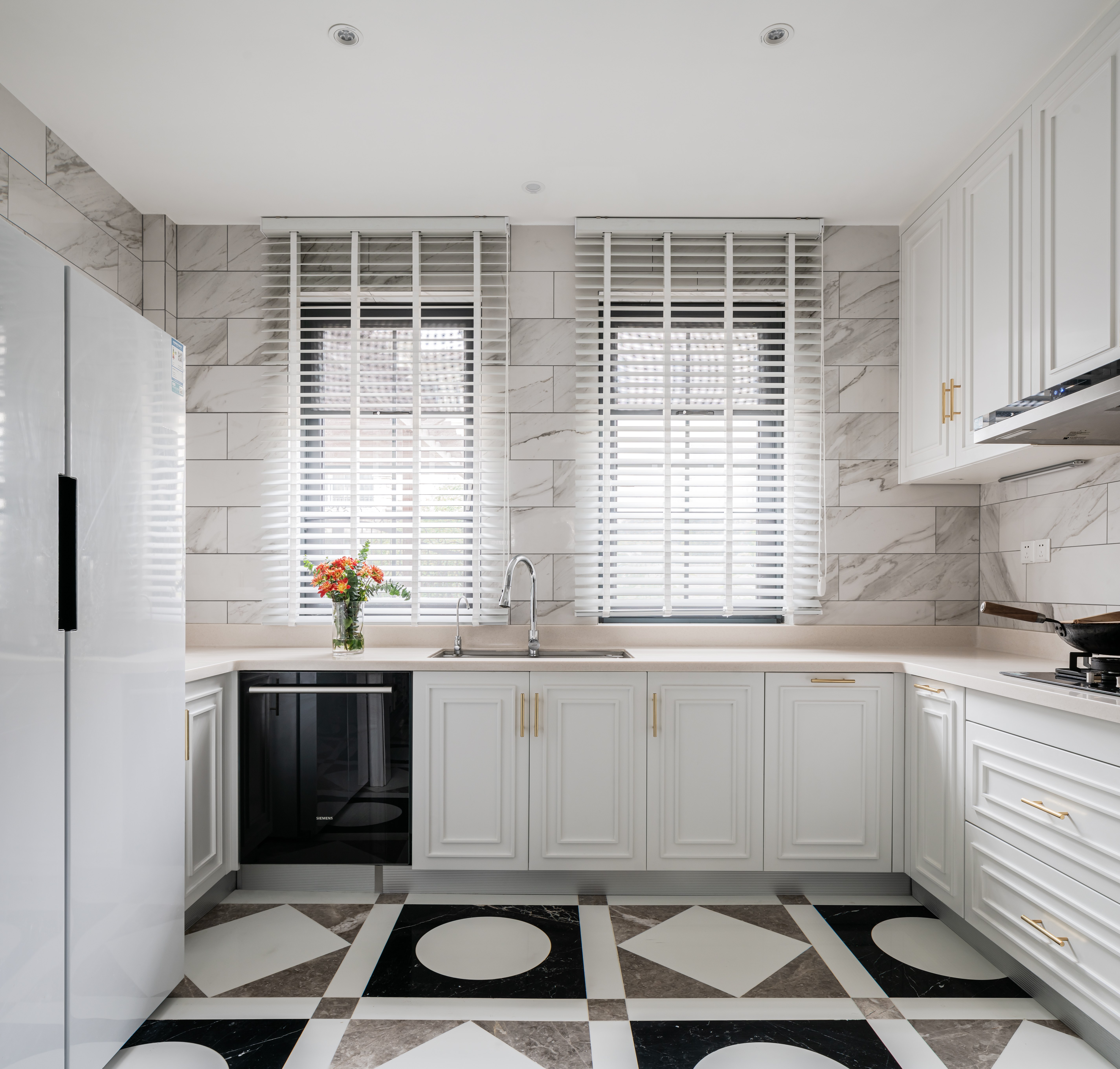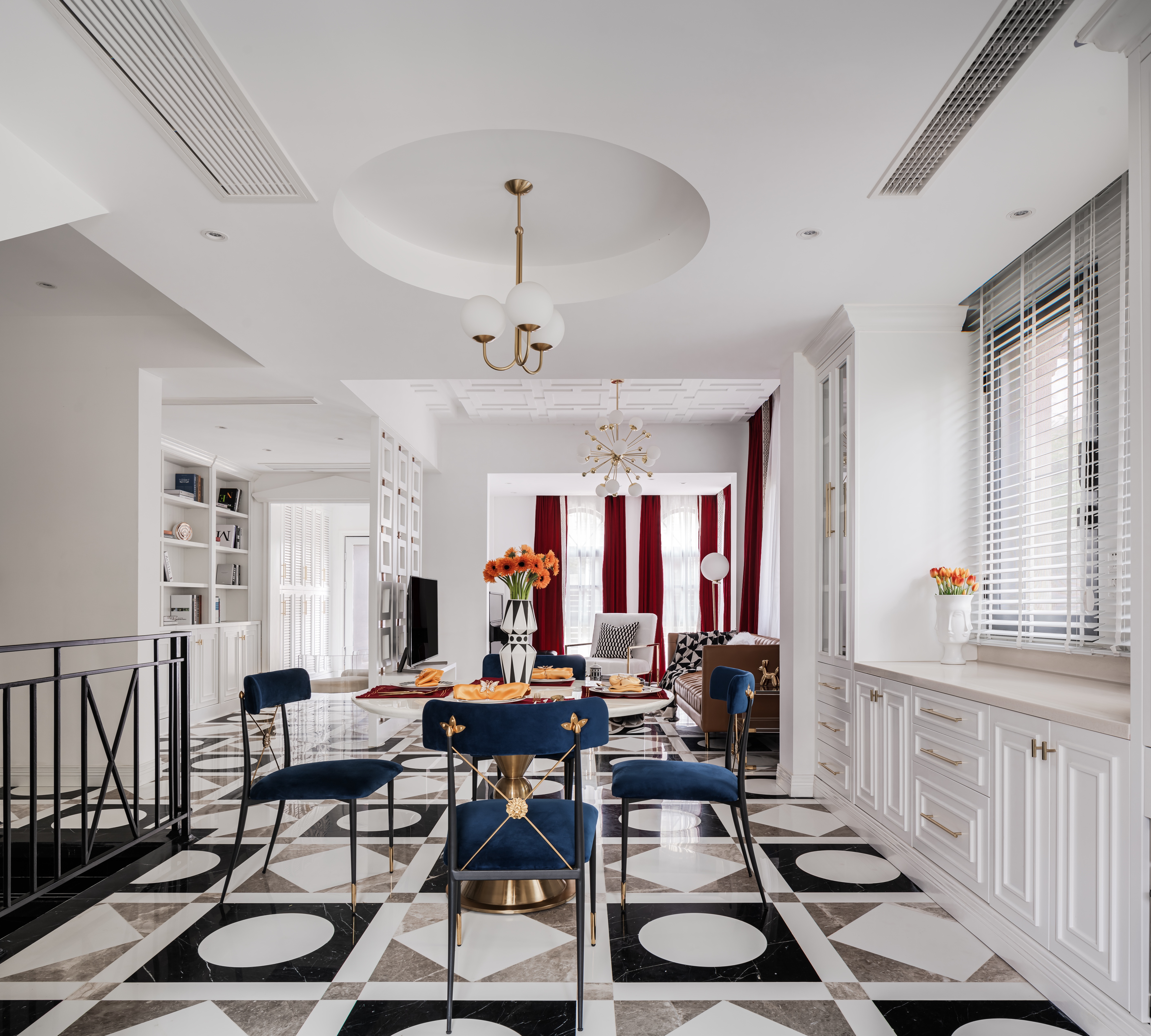 空间意境:作品在环境风格上的创新点在于 “法式秩序的当代化解构”。摒弃传统法式的繁复与厚重,保留其经典的比例与线条符号(如回字型墙板、装饰线条),并注入现代简约的块面语言。创新性地通过打通客厅与外廊道,引入“钢琴艺术角”,将自然光景、琴声与室内氛围融为一体,使法式浪漫从视觉延伸至听觉与情境体验,营造出兼具画廊般艺术感与家庭厅温馨感的独特场景。厨房区域的中西分治,则创造了从快速简餐到慢享烘焙的多样化生活场景。