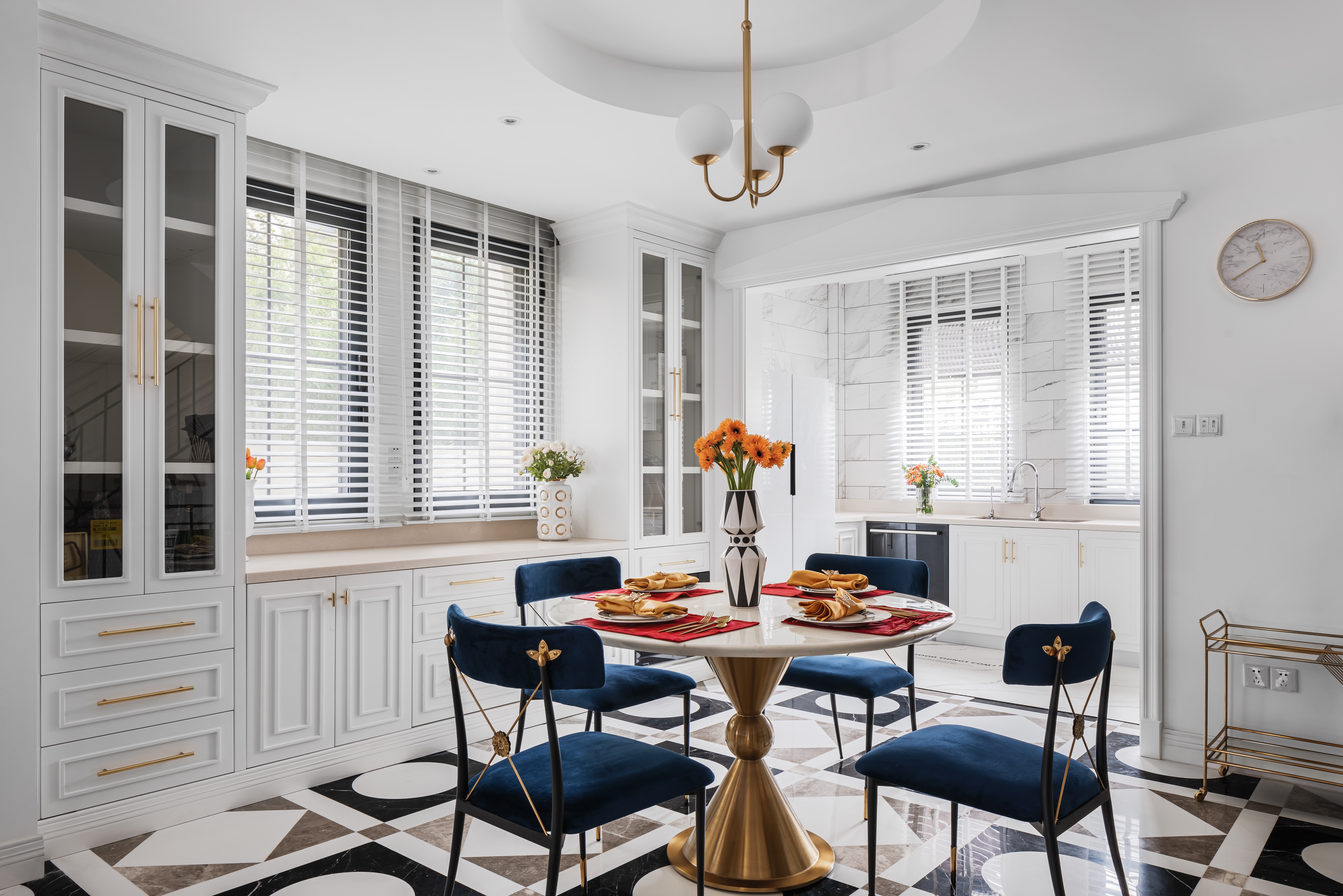 餐厅与厨房一体同时拥有中厨和西厨的功能,一体的壁大大增加了厨房的收纳,酒柜在餐桌旁,整体颜色简洁,营造一种自由放松的氛围,轻奢风格家具重点强调优雅,舒适温馨的感 觉,所以在选择餐桌餐椅方面会较为讲究