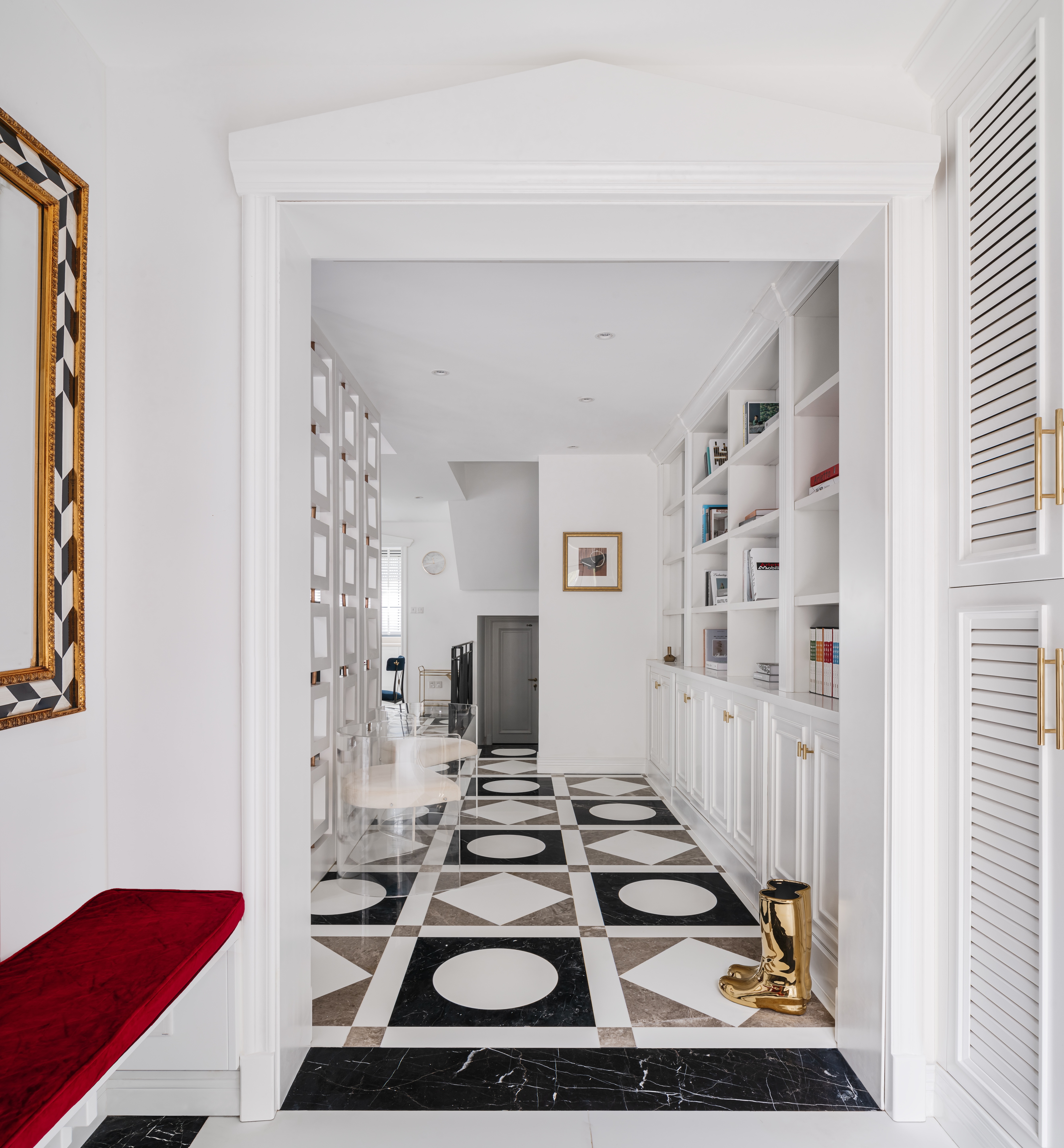 门厅扩容与动线再造:在合规前提下调整入户方向并扩充门厅,结合满墙的步入式储物系统,形成强大的收纳内核和归家仪式感的序厅。