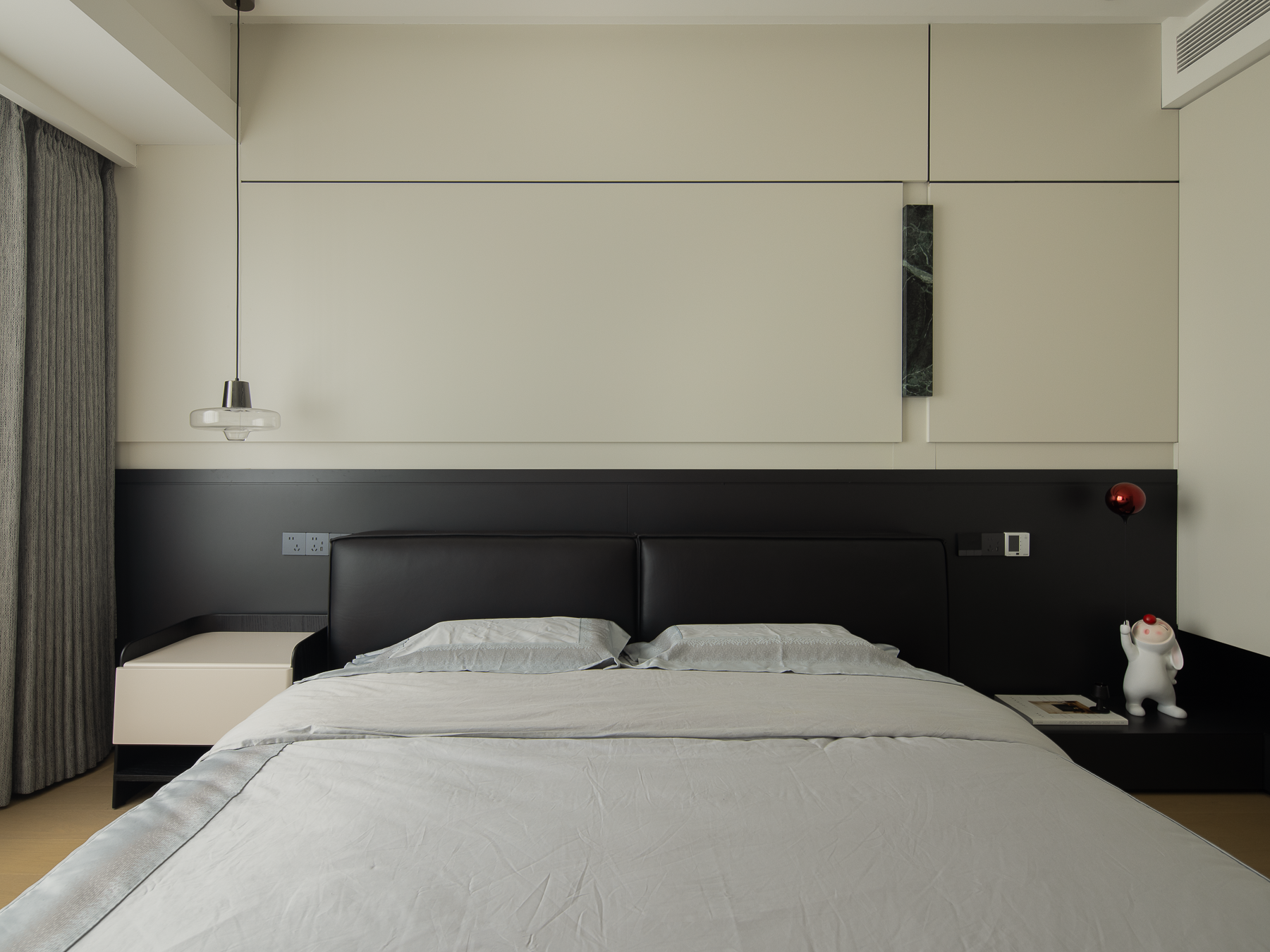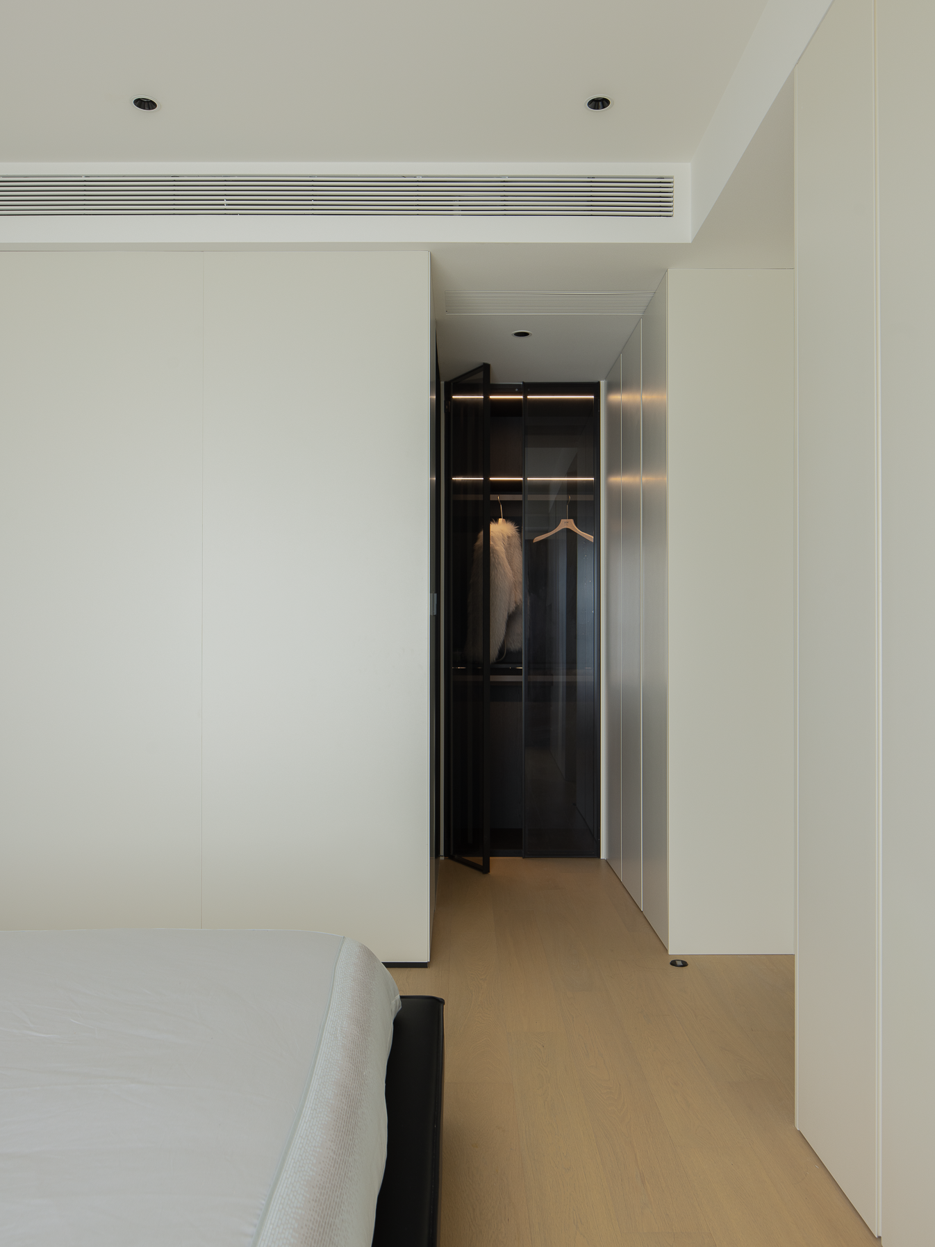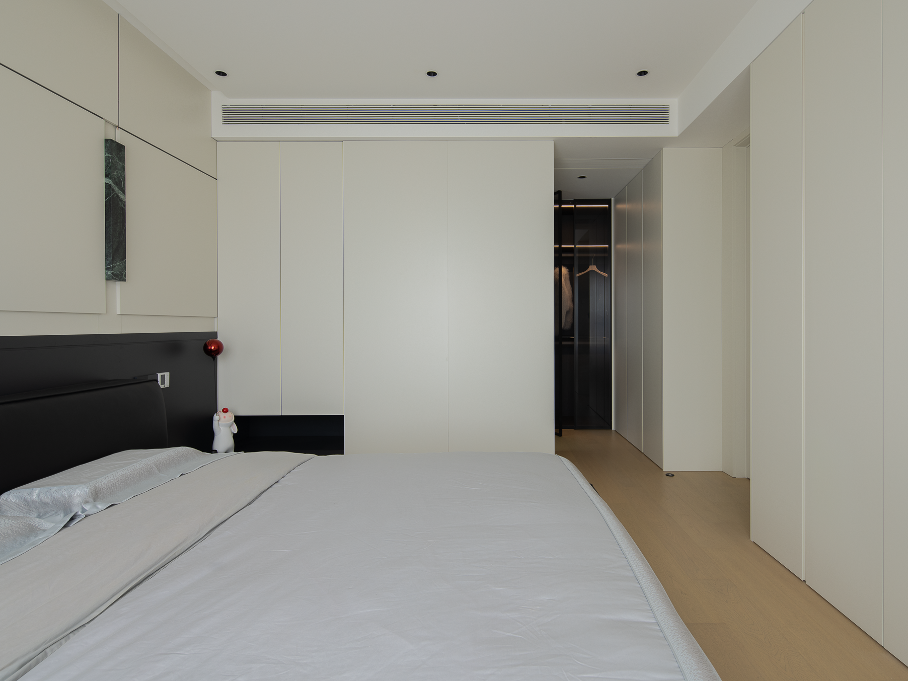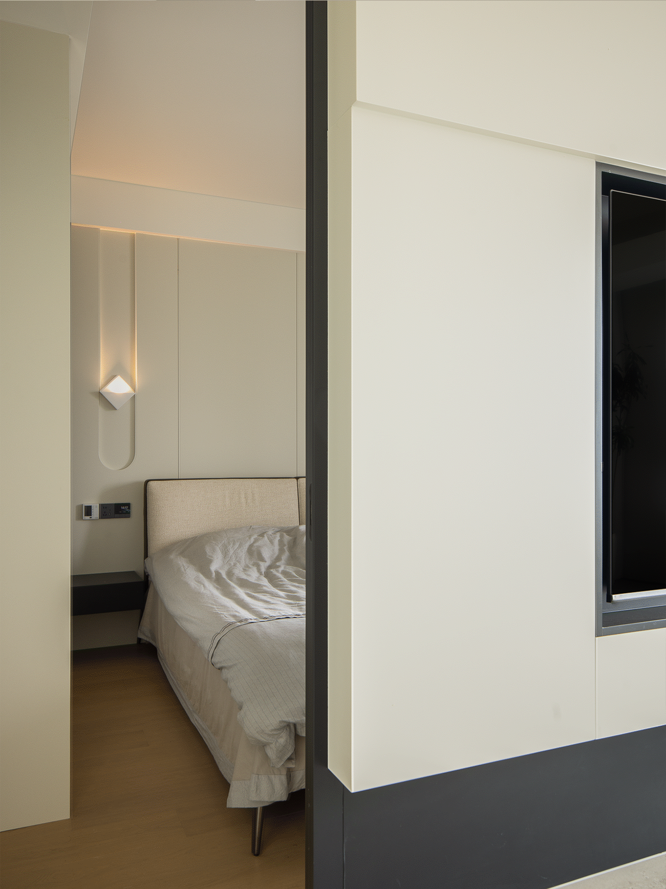 空间布局:核心解决了原始户型的两大功能缺陷:储物空间不足与餐厨空间局促。设计通过理性的设计手段,打造开阔通透且纯粹的空间效果。为化解原餐厨厅的局促,我们通过格局重构,将相邻的小房间改为厨房,原厨房区域被释放为高效的操作区并融入西式岛台,由此形成一个功能复合且开阔的餐厨空间。通过优化主卧进门动线,顺势整个过道空间,将低效的过道转化为高效的储物区。不仅提高了空间的利用率,更以简洁的形式增强了日常生活的秩序感。不同场域间的过渡,以细腻的节奏自然衔接,消弭空间的生硬边界。主卧延续整体调性,却多了几分私密的温柔。背景墙以简约的线条勾勒出立体的轮廓,搭配低饱和的软装与柔和的间接光影,共同围合出一个静谧的庇护所,让居者在此能褪去疲惫,感知内心的宁静。