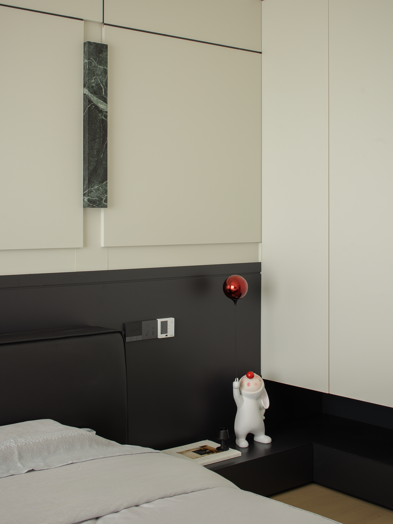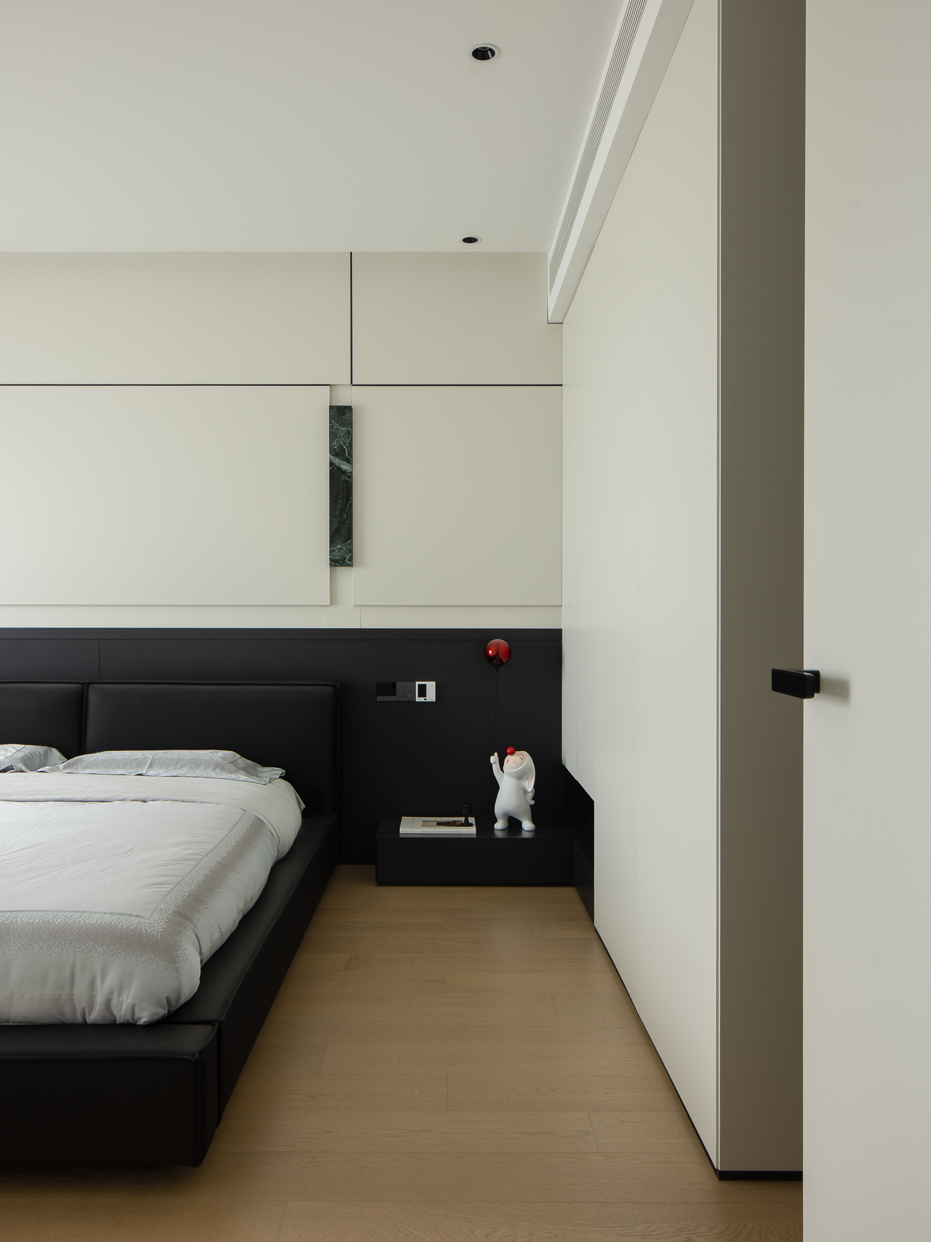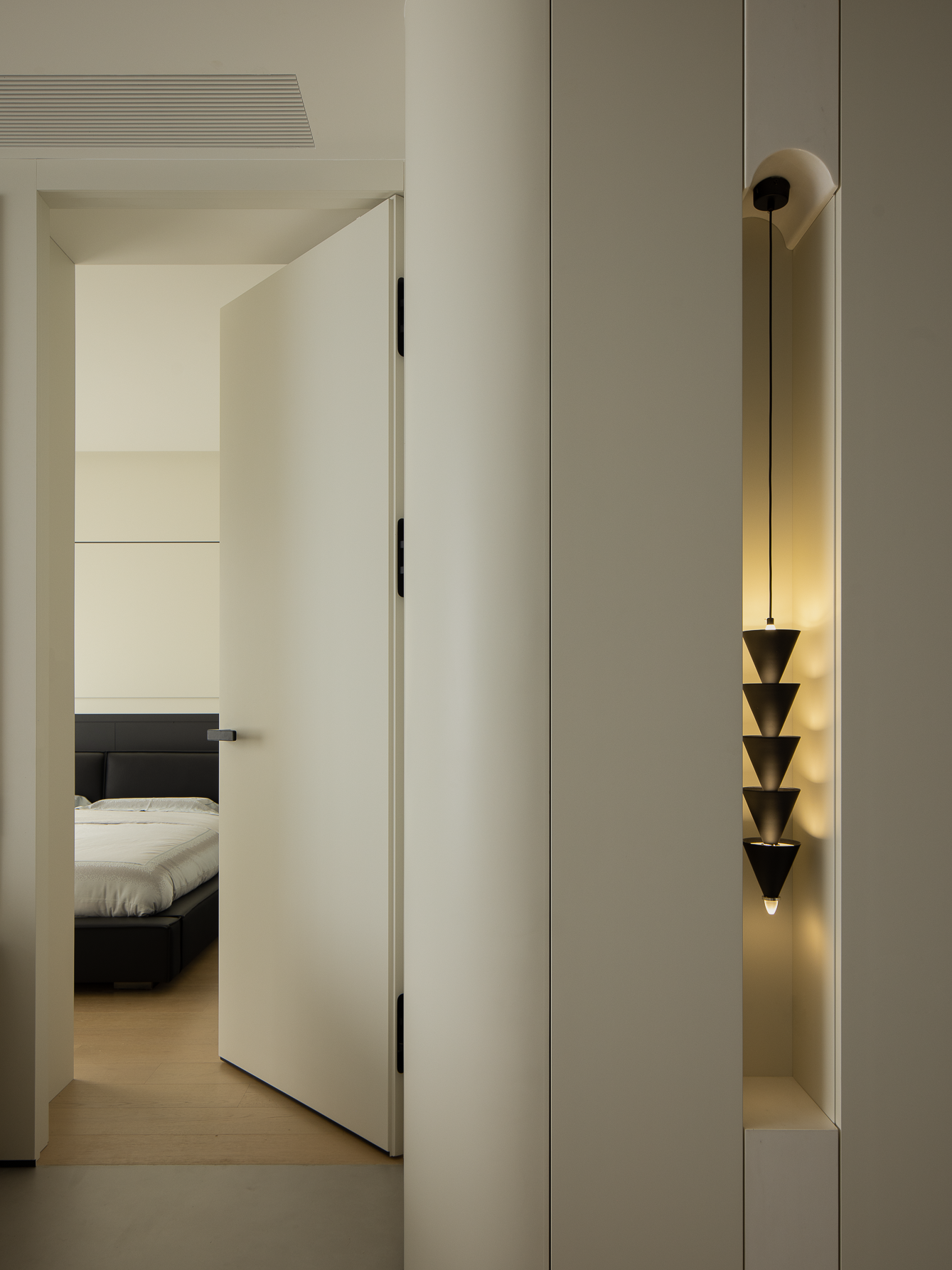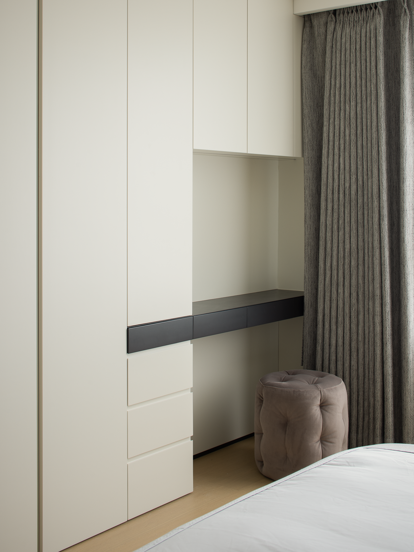 空间布局:核心解决了原始户型的两大功能缺陷:储物空间不足与餐厨空间局促。设计通过理性的设计手段,打造开阔通透且纯粹的空间效果。为化解原餐厨厅的局促,我们通过格局重构,将相邻的小房间改为厨房,原厨房区域被释放为高效的操作区并融入西式岛台,由此形成一个功能复合且开阔的餐厨空间。通过优化主卧进门动线,顺势整个过道空间,将低效的过道转化为高效的储物区。不仅提高了空间的利用率,更以简洁的形式增强了日常生活的秩序感。不同场域间的过渡,以细腻的节奏自然衔接,消弭空间的生硬边界。主卧延续整体调性,却多了几分私密的温柔。背景墙以简约的线条勾勒出立体的轮廓,搭配低饱和的软装与柔和的间接光影,共同围合出一个静谧的庇护所,让居者在此能褪去疲惫,感知内心的宁静。