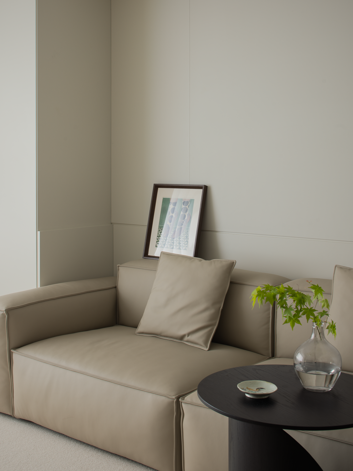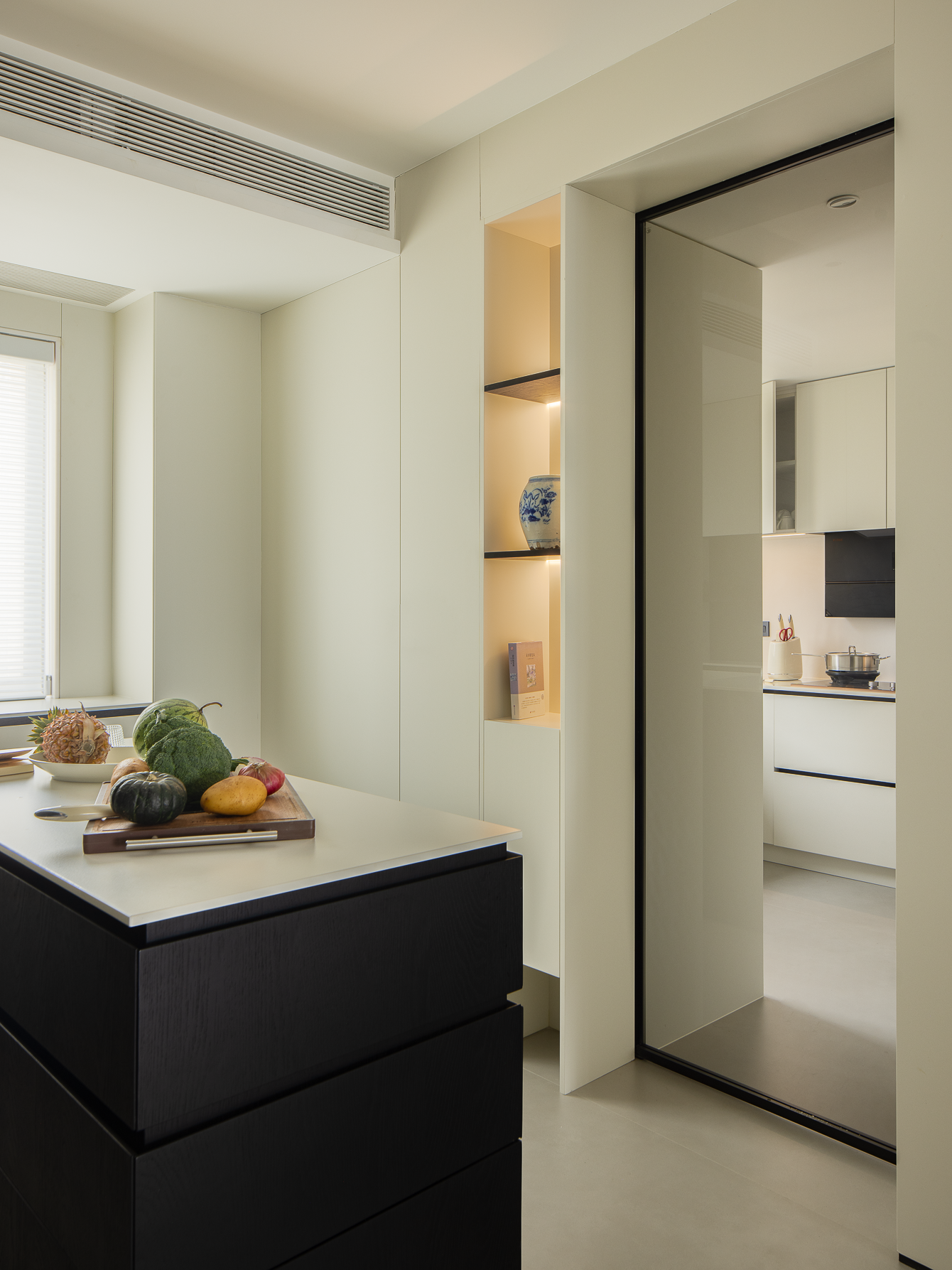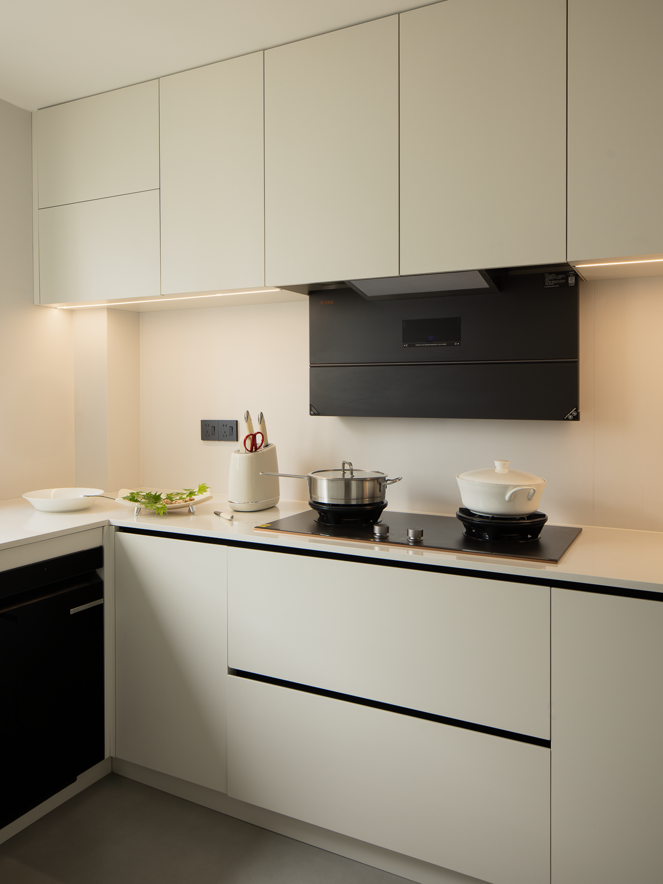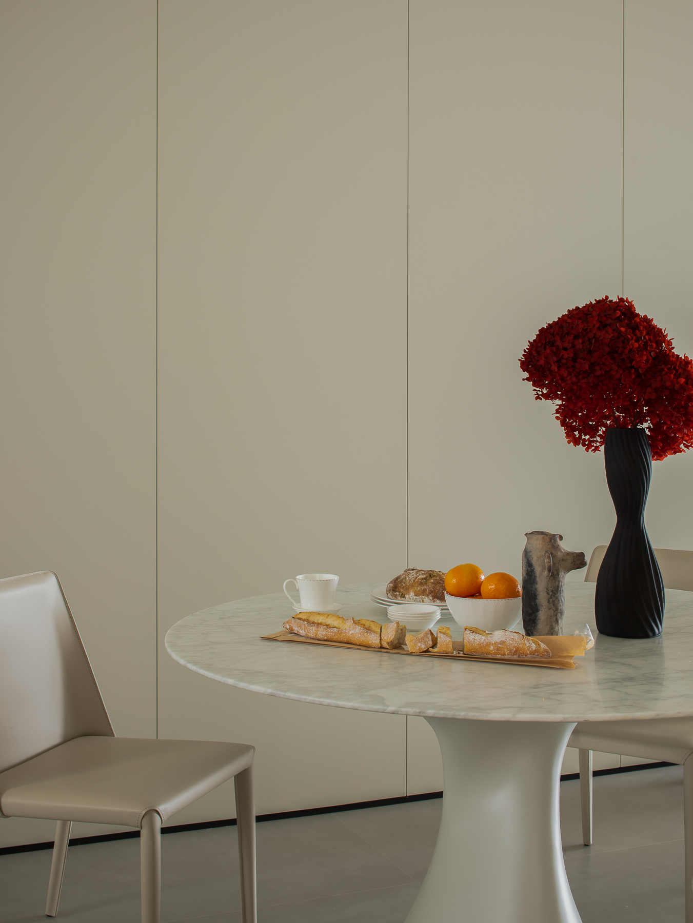 空间布局:核心解决了原始户型的两大功能缺陷:储物空间不足与餐厨空间局促。设计通过理性的设计手段,打造开阔通透且纯粹的空间效果。为化解原餐厨厅的局促,我们通过格局重构,将相邻的小房间改为厨房,原厨房区域被释放为高效的操作区并融入西式岛台,由此形成一个功能复合且开阔的餐厨空间。通过优化主卧进门动线,顺势整个过道空间,将低效的过道转化为高效的储物区。不仅提高了空间的利用率,更以简洁的形式增强了日常生活的秩序感。不同场域间的过渡,以细腻的节奏自然衔接,消弭空间的生硬边界。主卧延续整体调性,却多了几分私密的温柔。背景墙以简约的线条勾勒出立体的轮廓,搭配低饱和的软装与柔和的间接光影,共同围合出一个静谧的庇护所,让居者在此能褪去疲惫,感知内心的宁静。