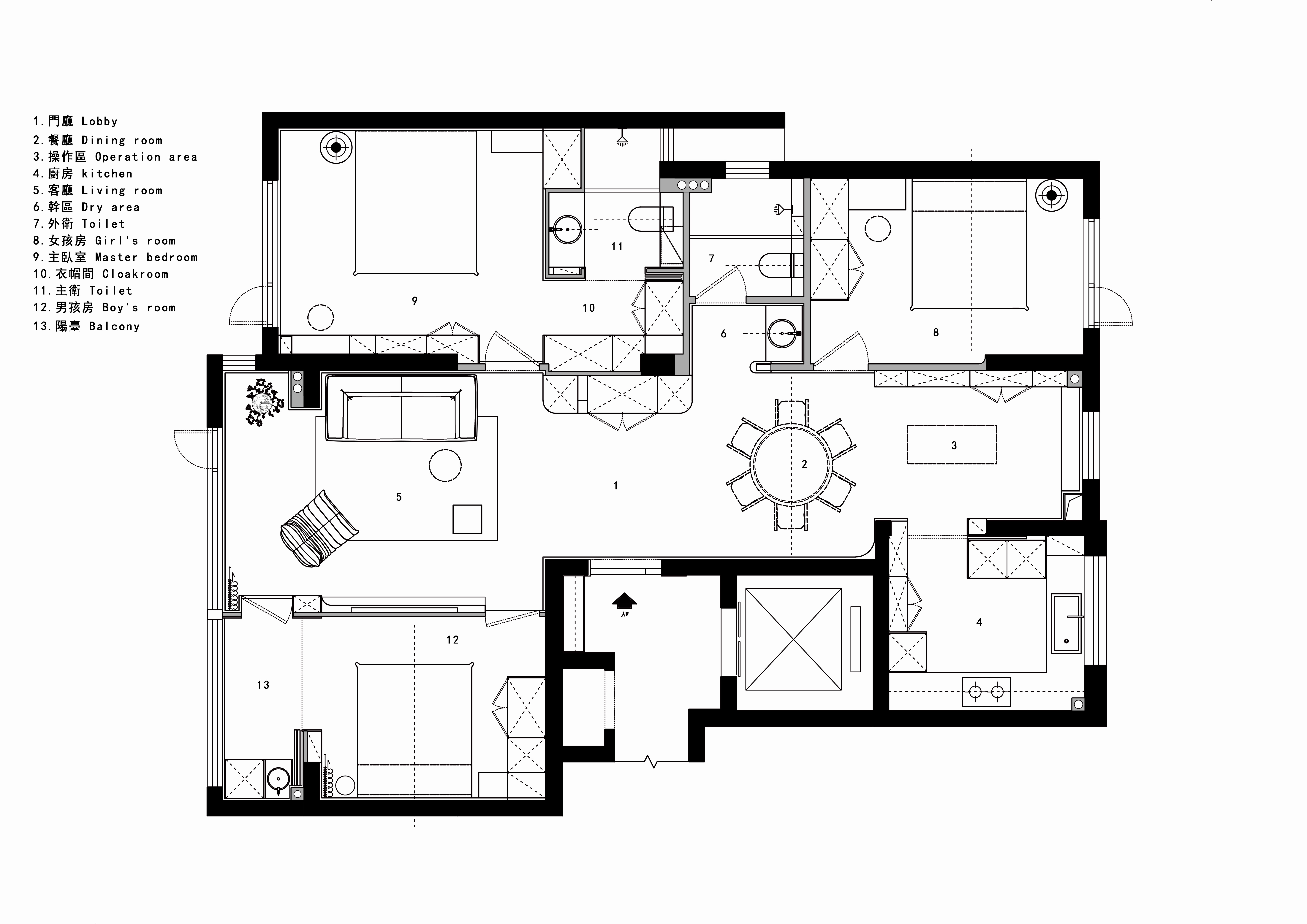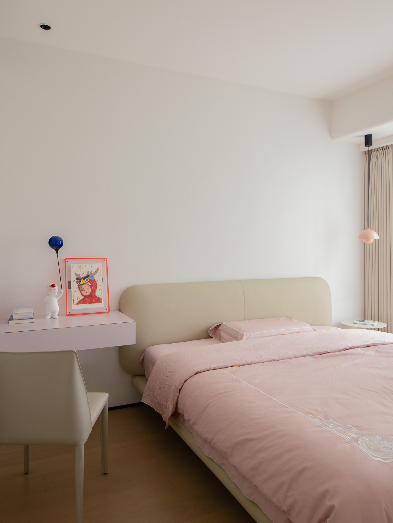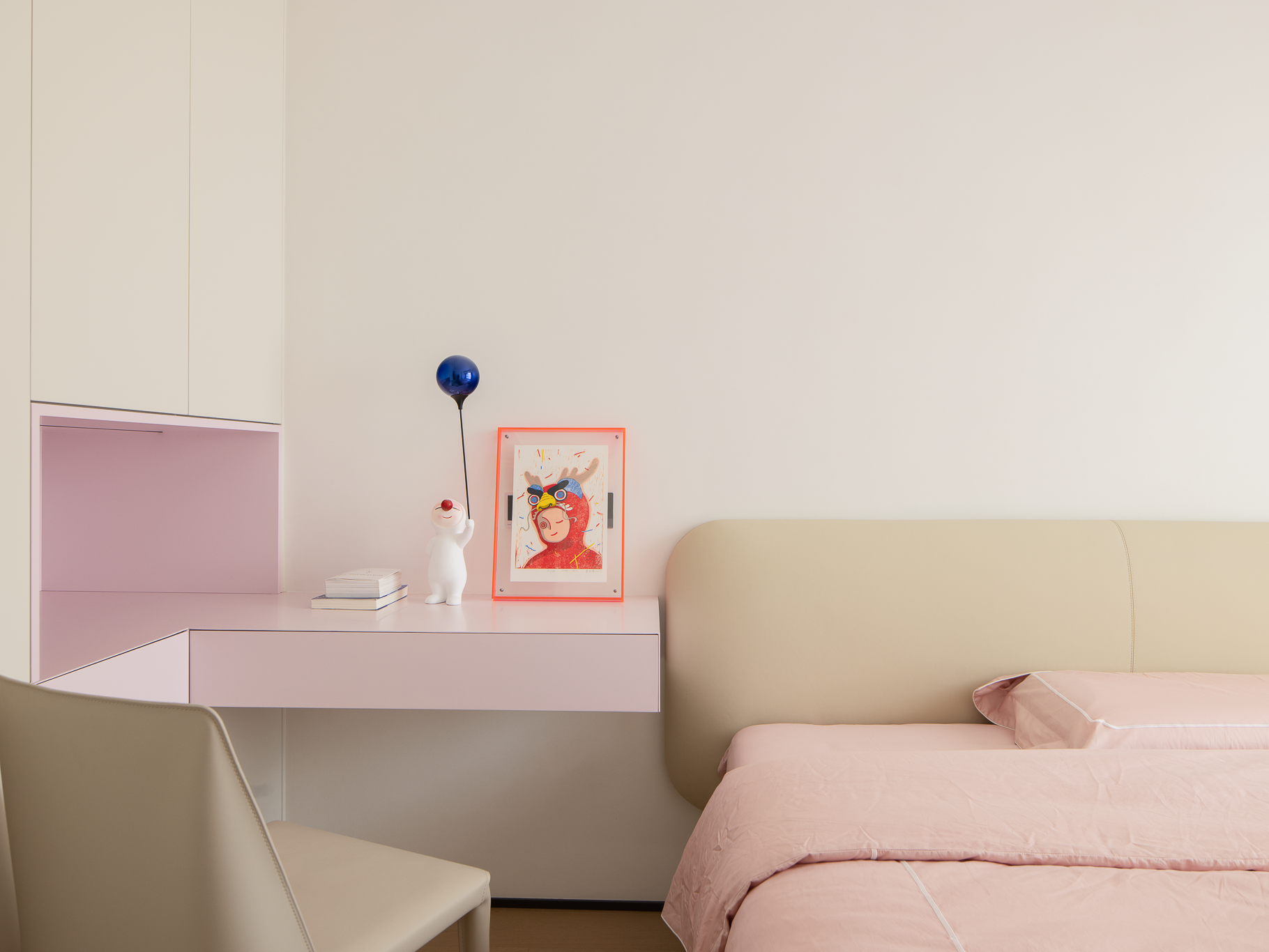 空间意境:空间塑造以直线为核心元素,借由结构构成化解空间缺陷,更将黄金分割比例渗透到每一处设计细节中,营造出超越形式本身的理性与和谐之美。以现代简约为基调,纯粹的色块勾勒出空间骨架,搭配浅色沙发柔化了空间的冷峻,为场域内注入呼吸感。圆桌凝聚了家的“向心性”,以此为枢纽,空间功能向吧台与客厅自然延展,形成流畅的递进关系。流畅的空间布局不仅定义了空间的功能属性,更释放了生活的无数种美好可能。布局的微调与重构,不仅让空间愈发纯粹,更添一份自在悠然。几何元素的变幻,于细节处勾勒出空间的质感。通过优化主卧进门动线,顺势整个过道空间,将低效的过道转化为高效的储物区。不仅提高了空间的利用率,更以简洁的形式增强了日常生活的秩序感。女儿房的设计为成长预留的弹性,清新的色彩与可随意变换的软装构件,赋予空间灵动性。在一个简约的框架内,为她搭建起一个纯净而充满生机的童话世界。