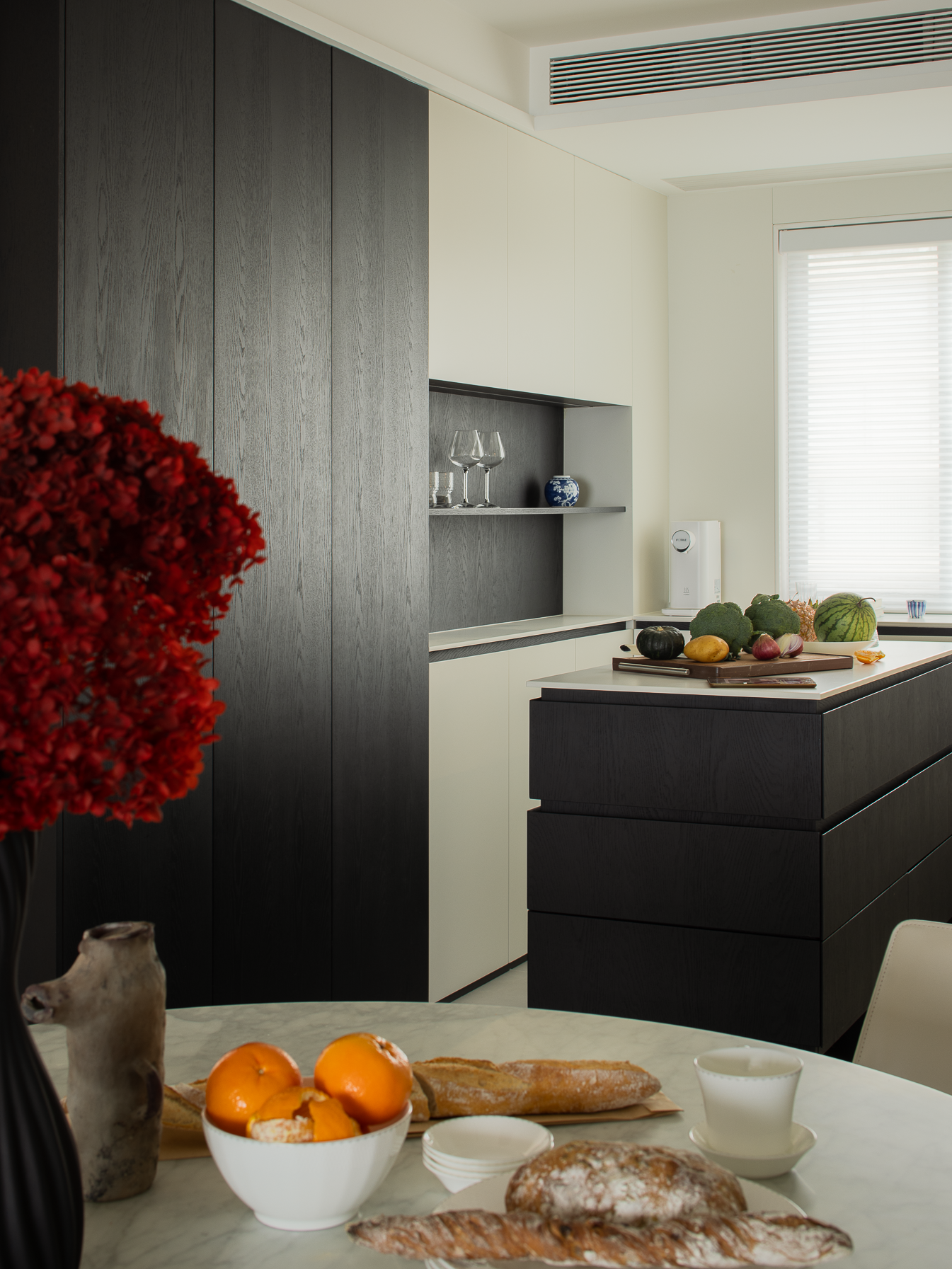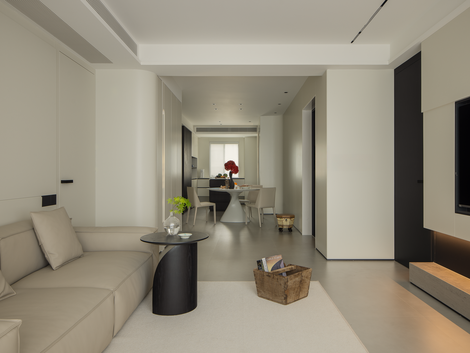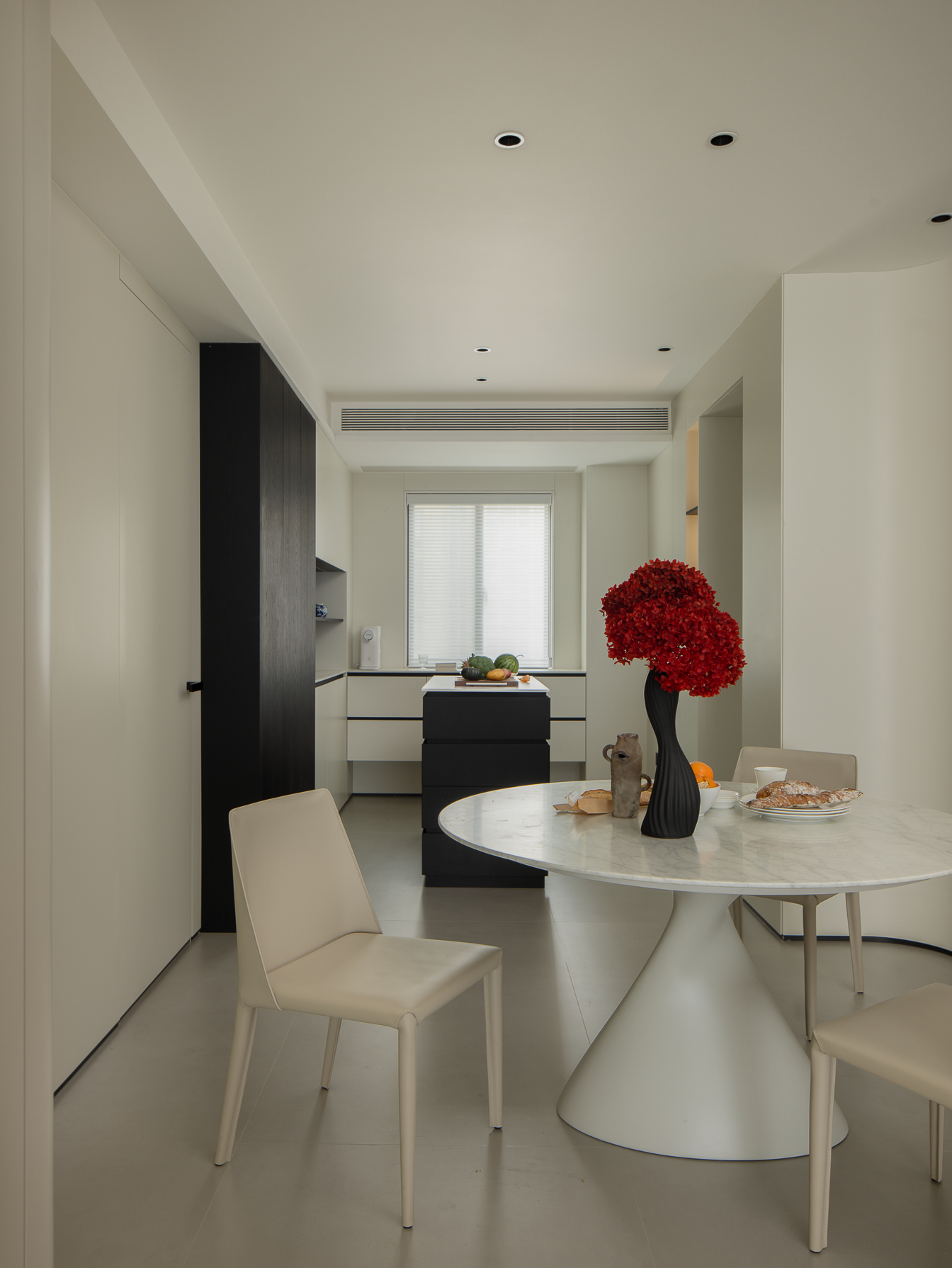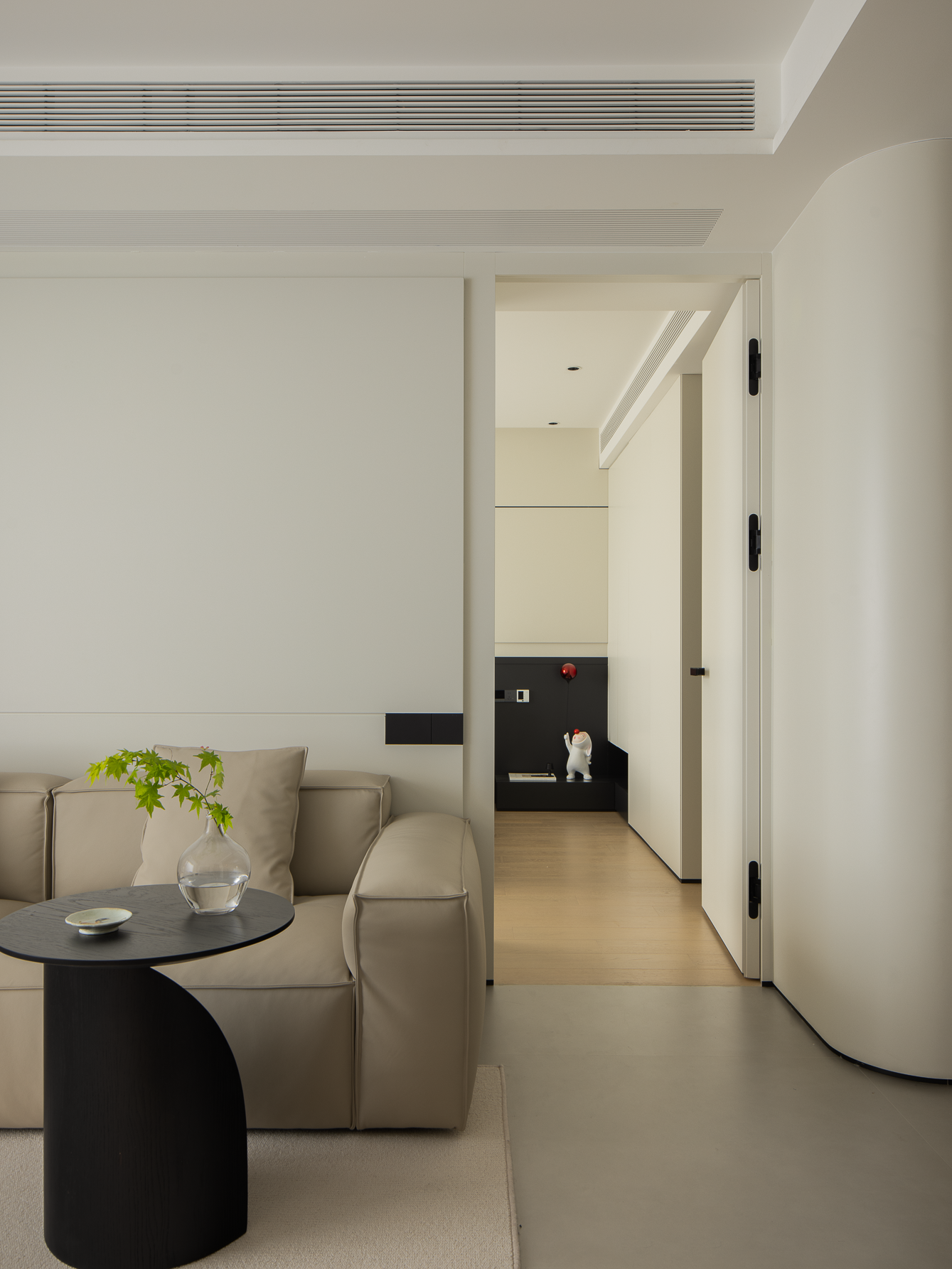 项目定位:本案为精装修全改项目,在将风格彻底重塑为现代简约风,并采用经典黑白色系打造干净利落视觉感受的同时,核心解决了原始户型的两大功能缺陷:储物空间不足与餐厨空间局促。设计通过理性的设计手段,打造开阔通透且纯粹的空间效果。