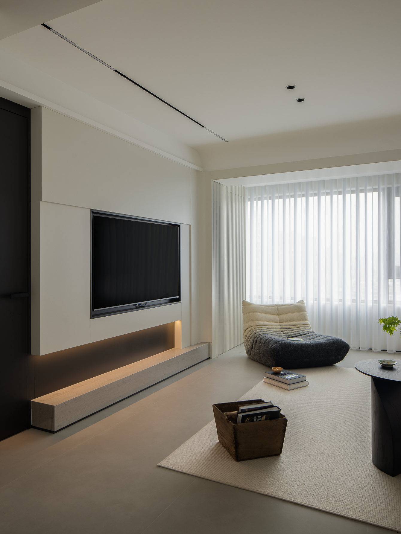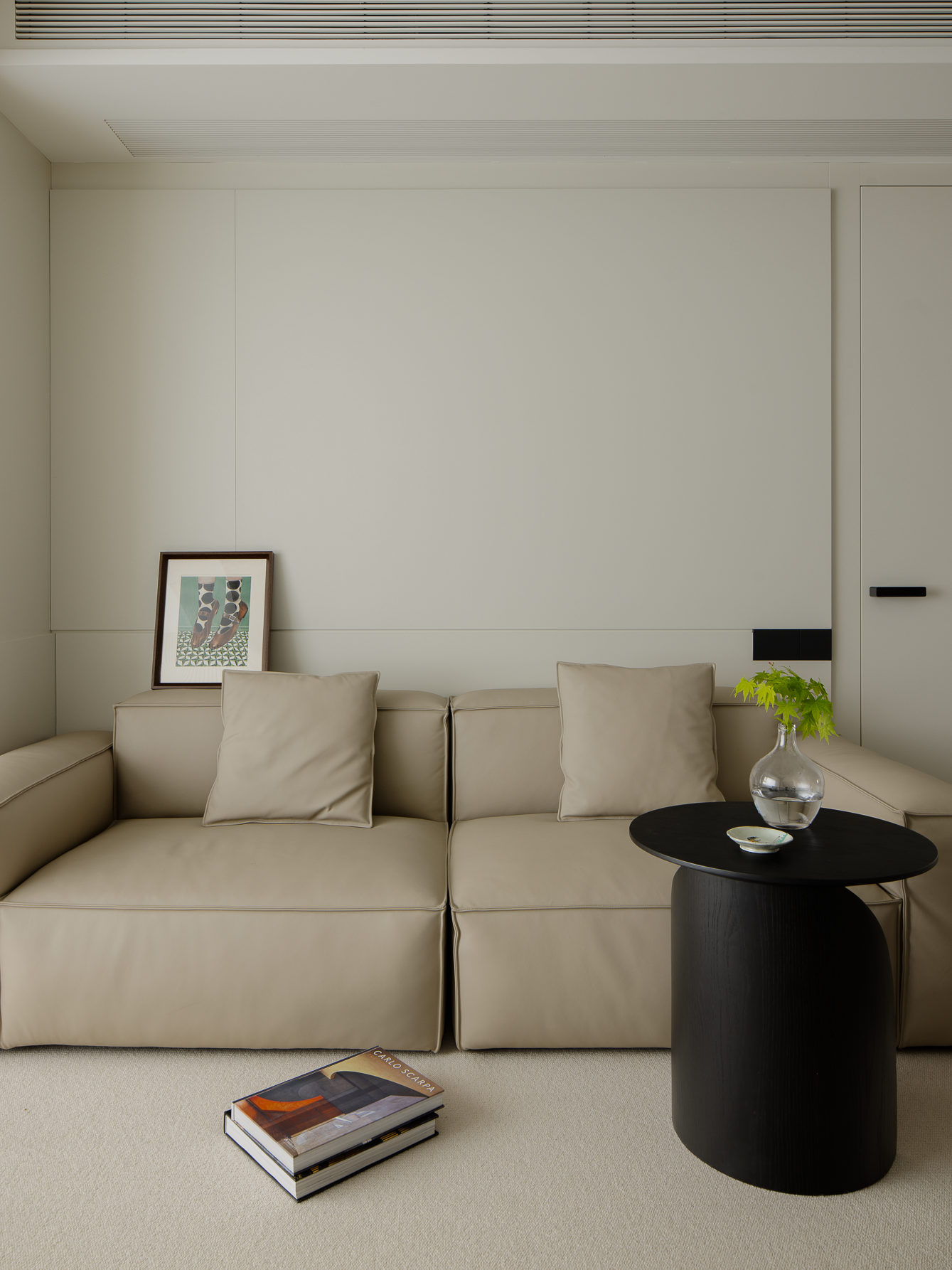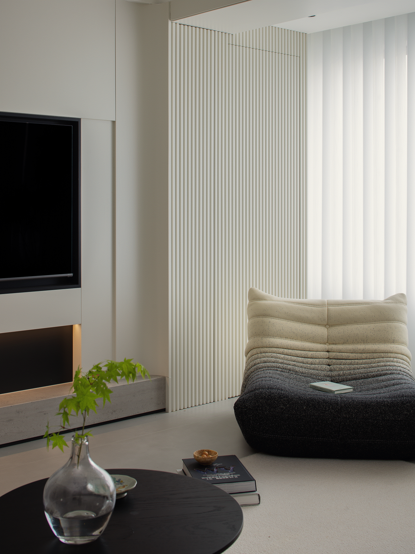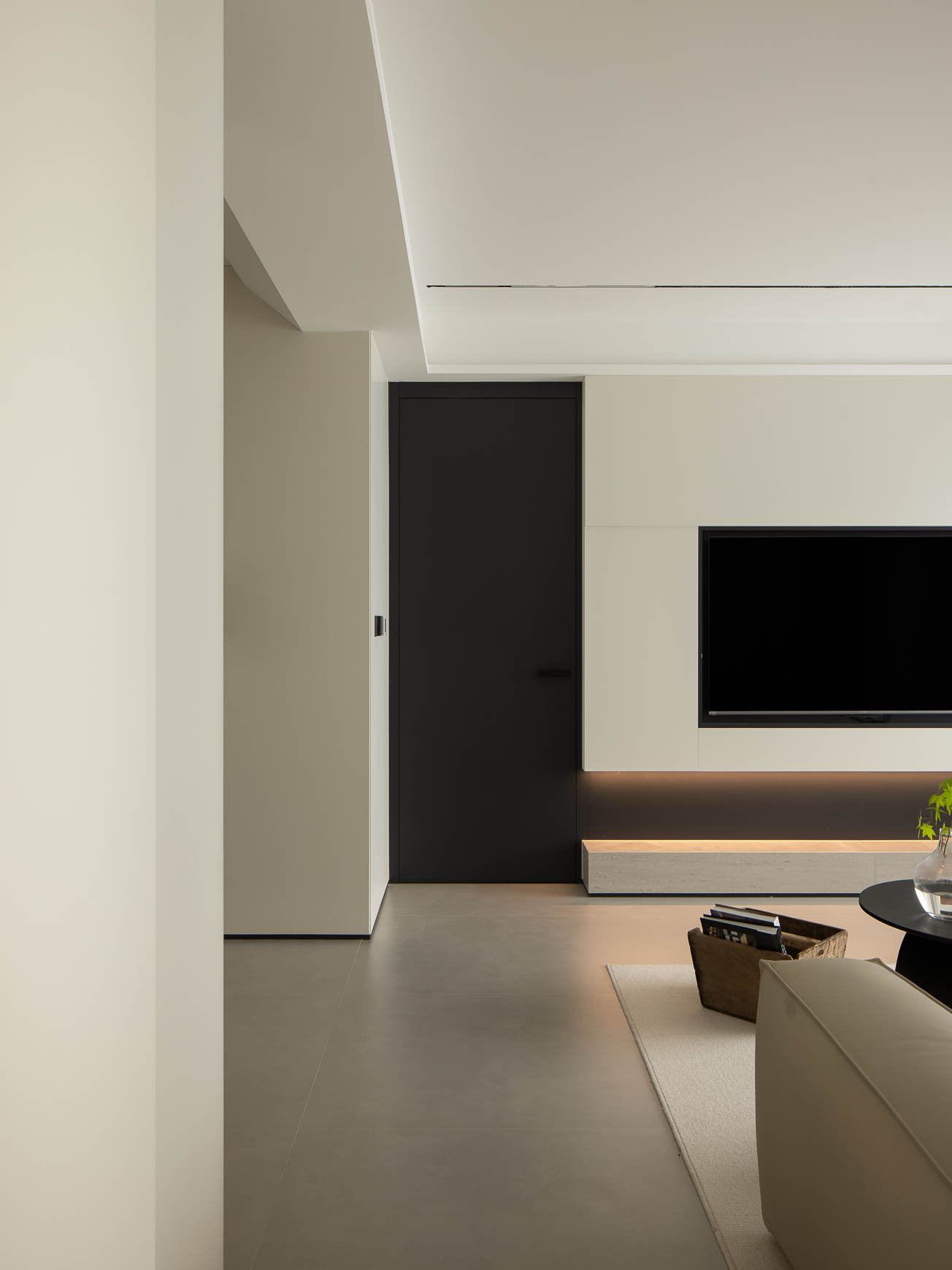 项目定位:本案为精装修全改项目,在将风格彻底重塑为现代简约风,并采用经典黑白色系打造干净利落视觉感受的同时,核心解决了原始户型的两大功能缺陷:储物空间不足与餐厨空间局促。设计通过理性的设计手段,打造开阔通透且纯粹的空间效果。
