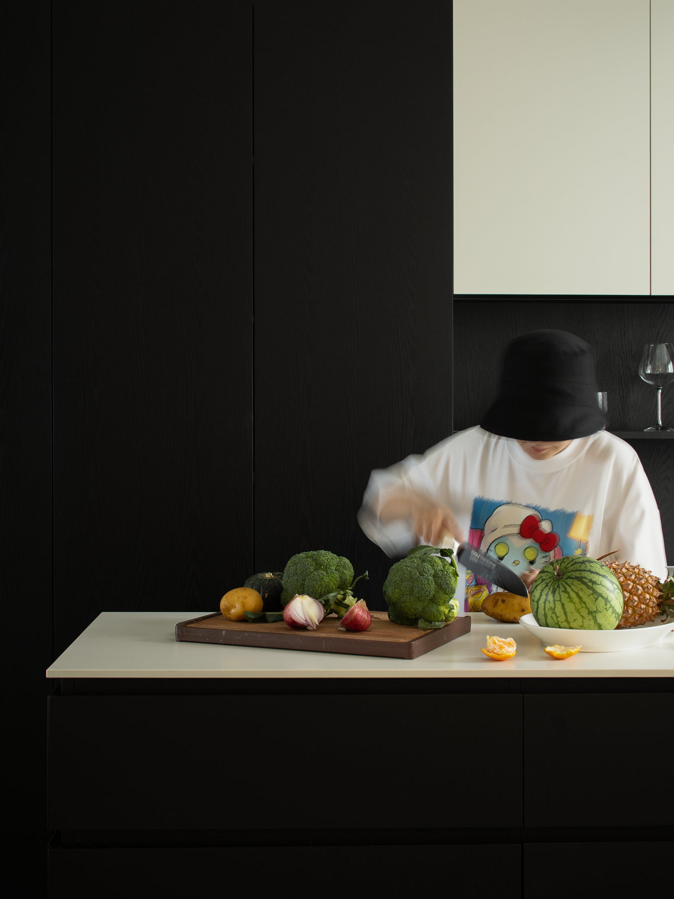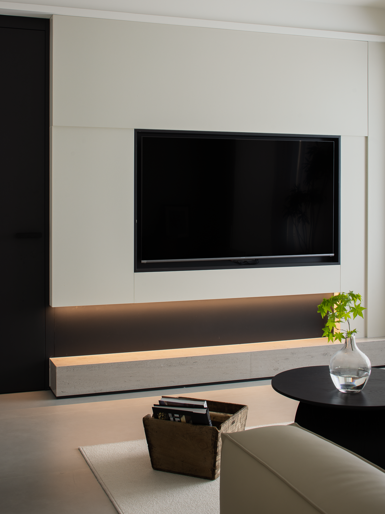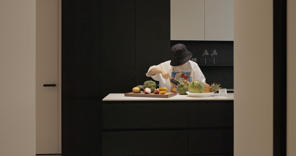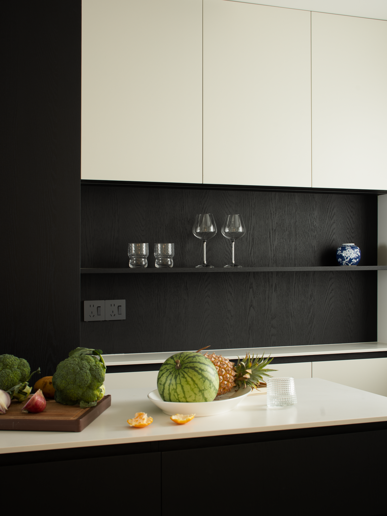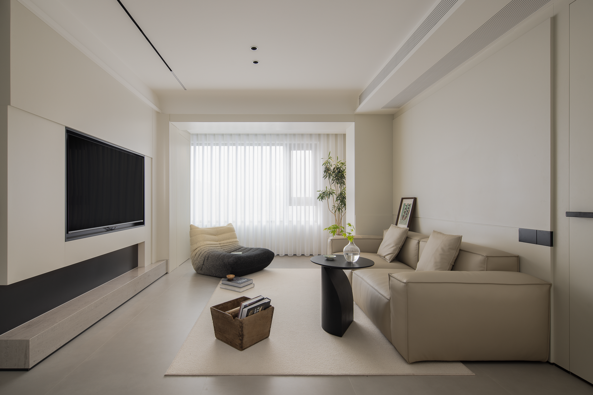 项目定位:本案为精装修全改项目,在将风格彻底重塑为现代简约风,并采用经典黑白色系打造干净利落视觉感受的同时,核心解决了原始户型的两大功能缺陷:储物空间不足与餐厨空间局促。设计通过理性的设计手段,打造开阔通透且纯粹的空间效果。