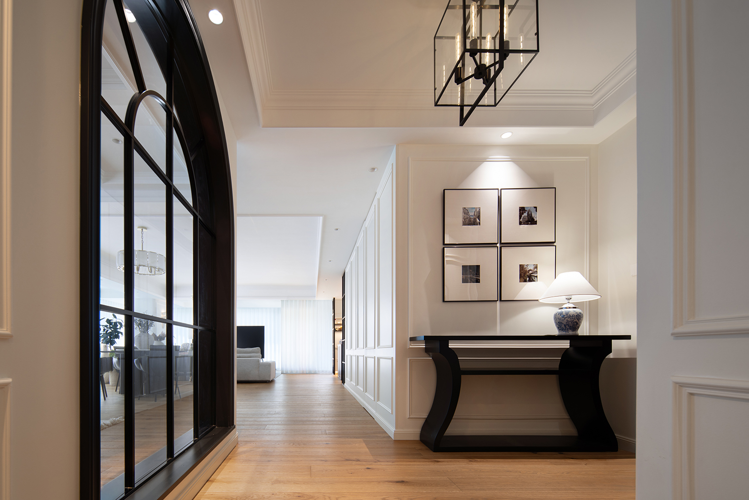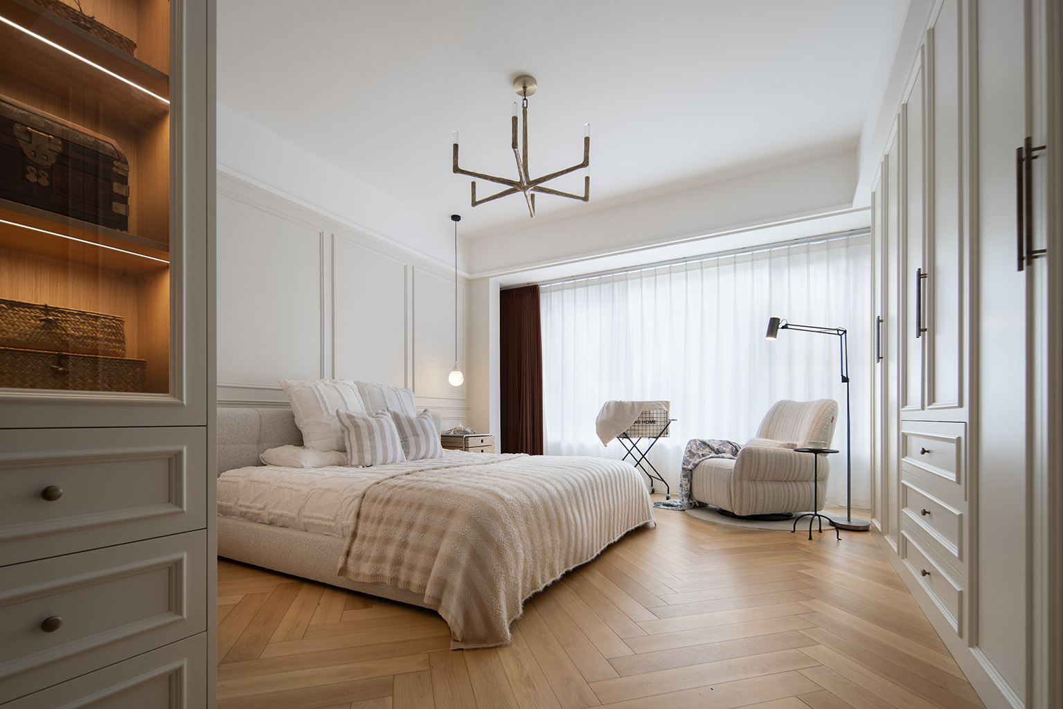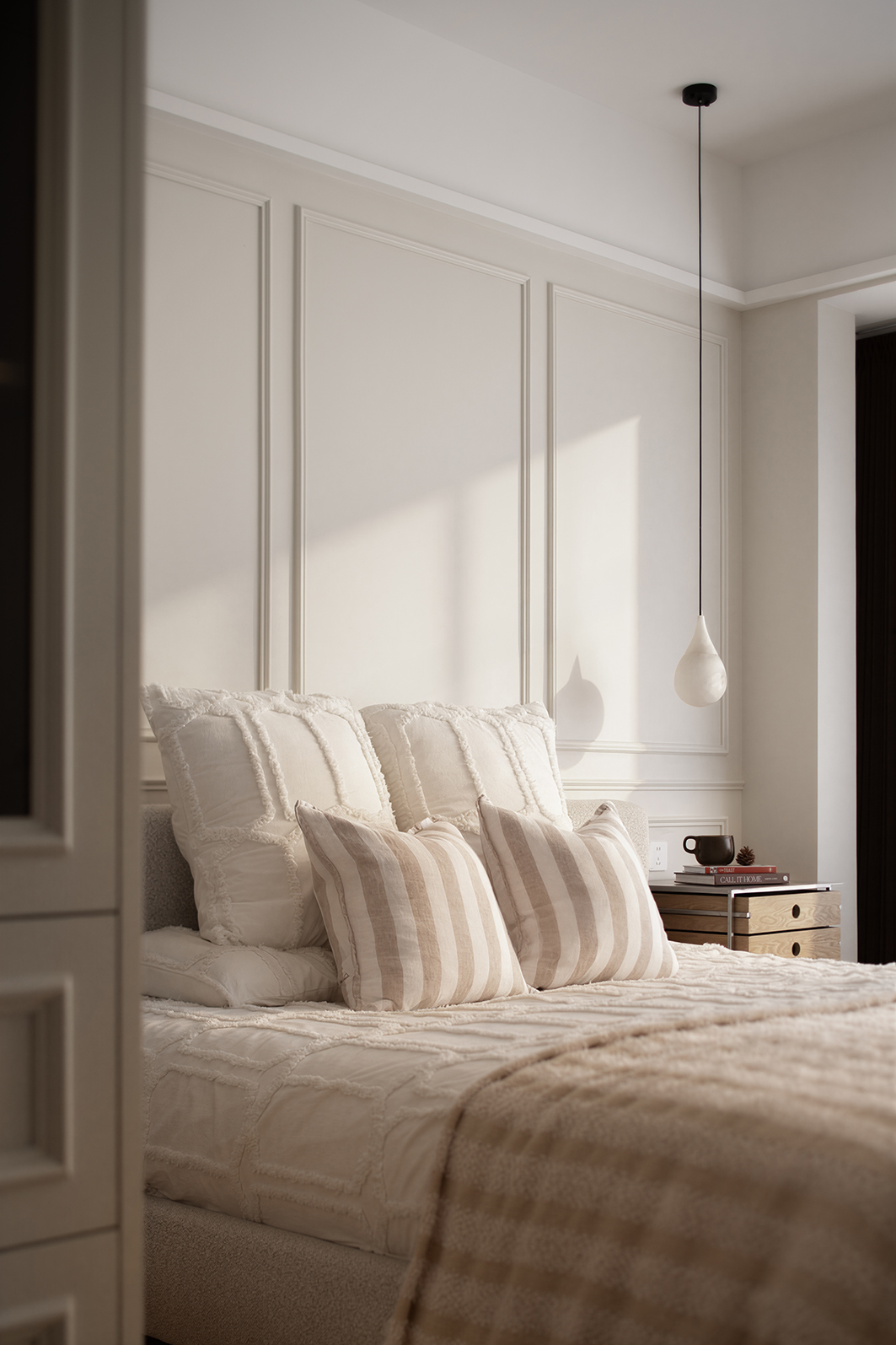 设计选材:墙面设计摒弃了繁复的线条墙板,采用PU线条结合蛋壳光艺术漆的简约形式。这一做法不仅降低了基层板与墙板带来的材料浪费与造价成本,还在保证视觉效果优雅呈现的同时,提升了空间的环保性与居住舒适度。所有主要材料均具备低维护、耐磨损、易清洁的特性,体现了我们秉持的“长效设计” 理念——不盲目追随潮流,拒绝使用易过时的材料,从而让空间在历经时间沉淀后,愈发散发出从容、宁静的美感。