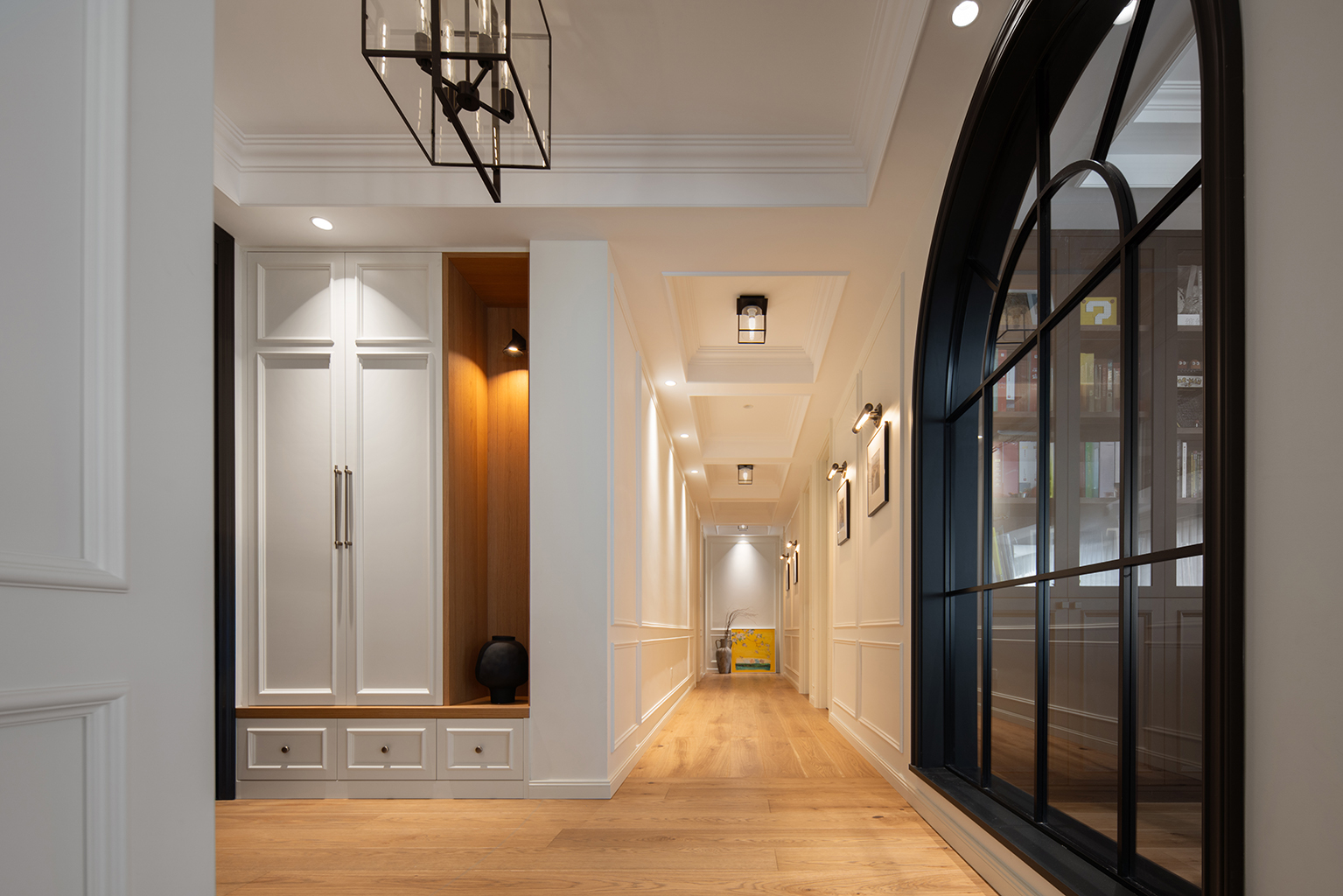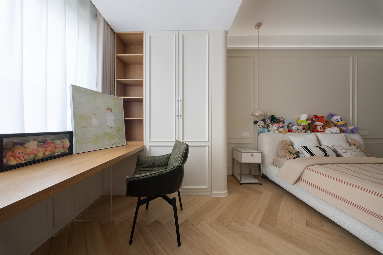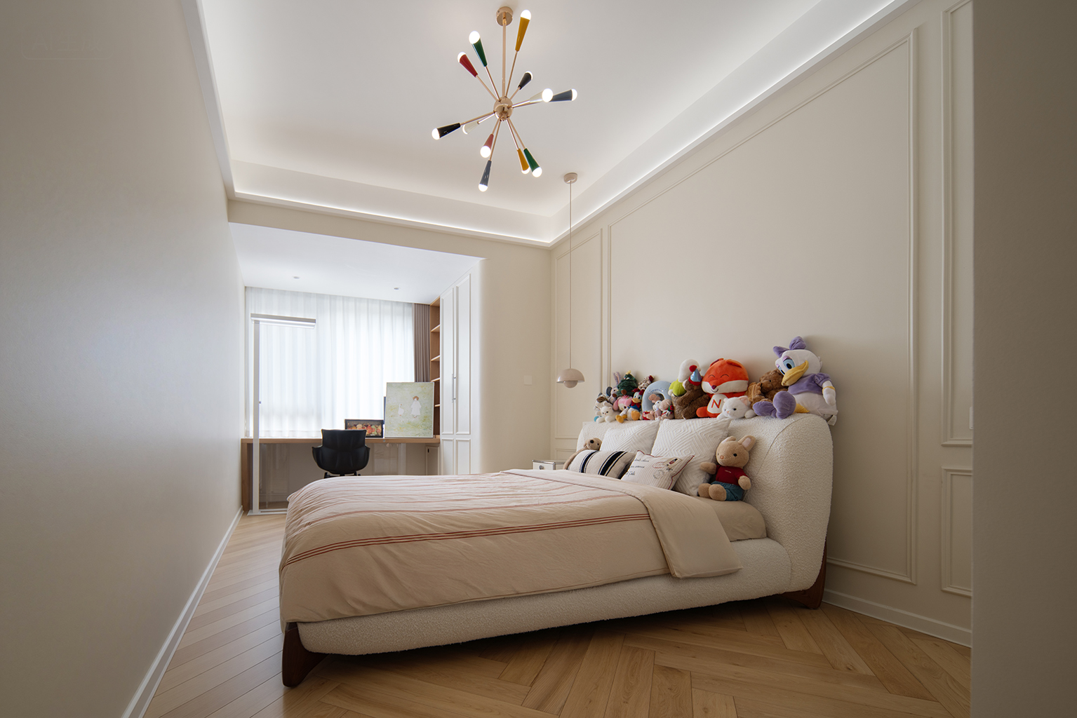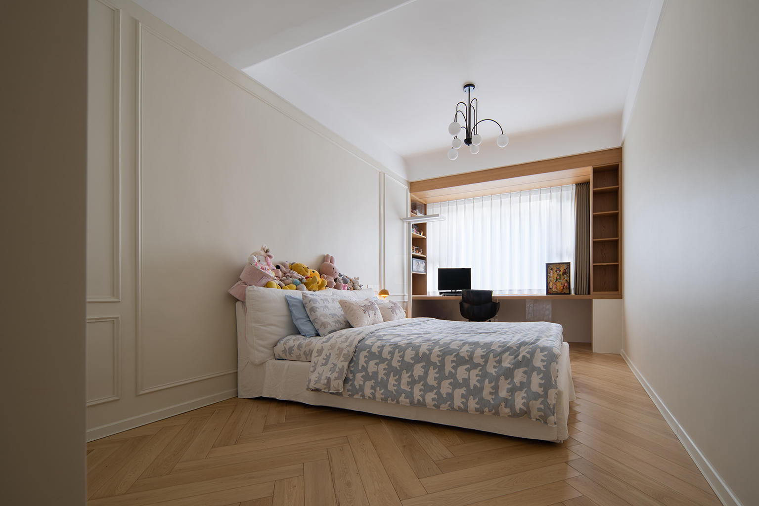 设计选材:墙面设计摒弃了繁复的线条墙板,采用PU线条结合蛋壳光艺术漆的简约形式。这一做法不仅降低了基层板与墙板带来的材料浪费与造价成本,还在保证视觉效果优雅呈现的同时,提升了空间的环保性与居住舒适度。所有主要材料均具备低维护、耐磨损、易清洁的特性,体现了我们秉持的“长效设计” 理念——不盲目追随潮流,拒绝使用易过时的材料,从而让空间在历经时间沉淀后,愈发散发出从容、宁静的美感。