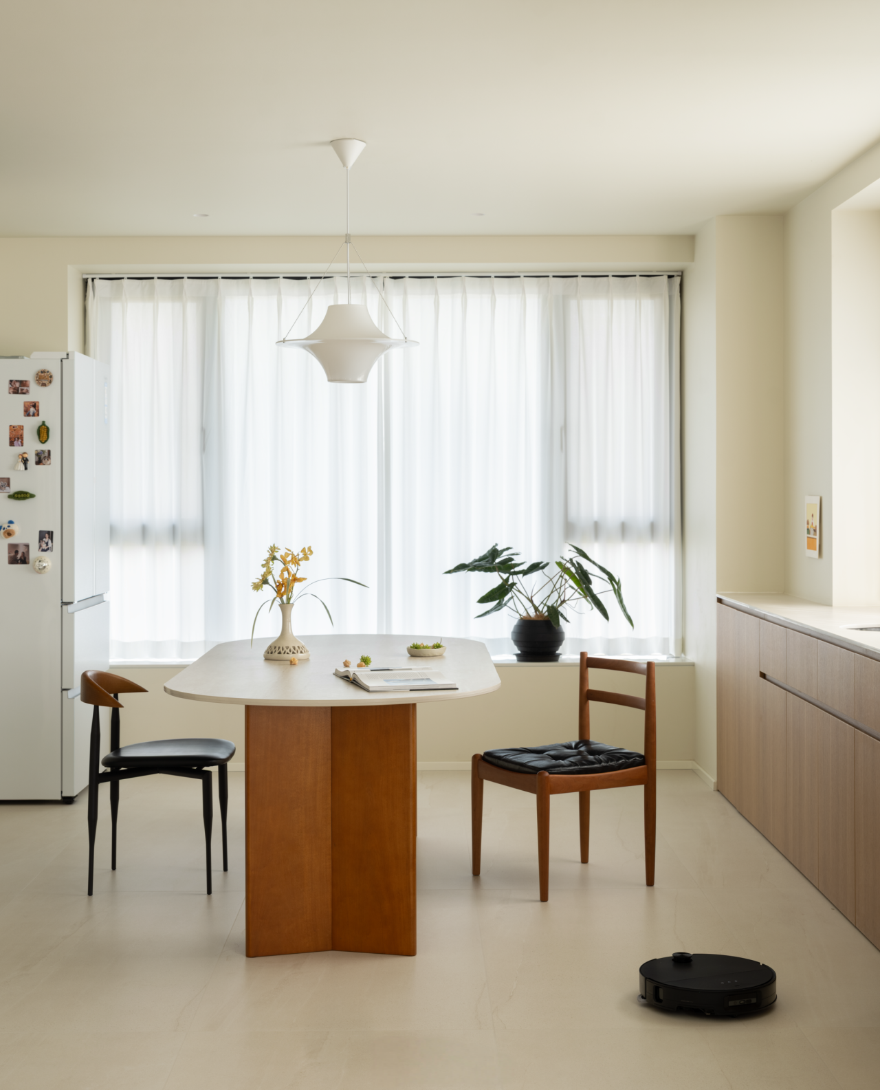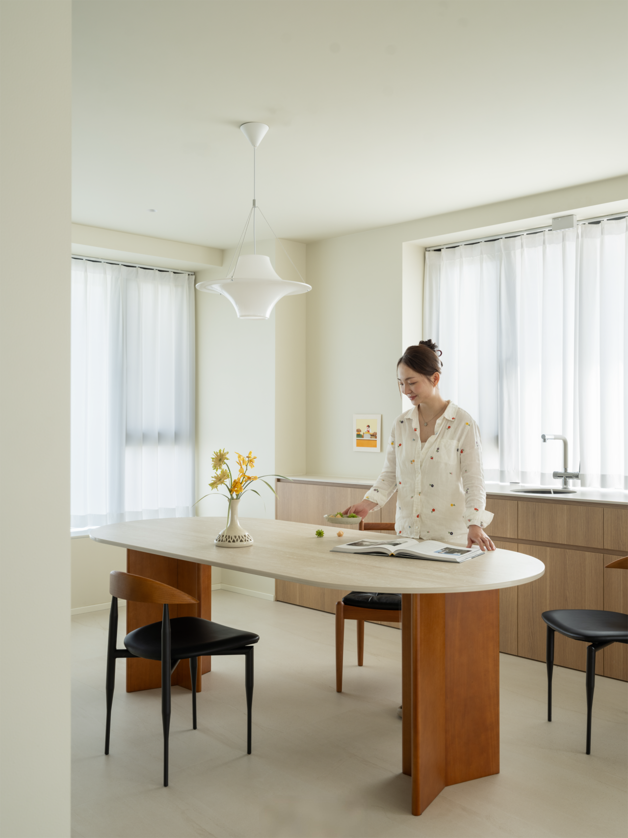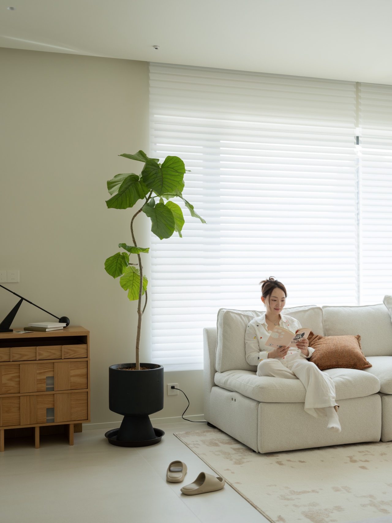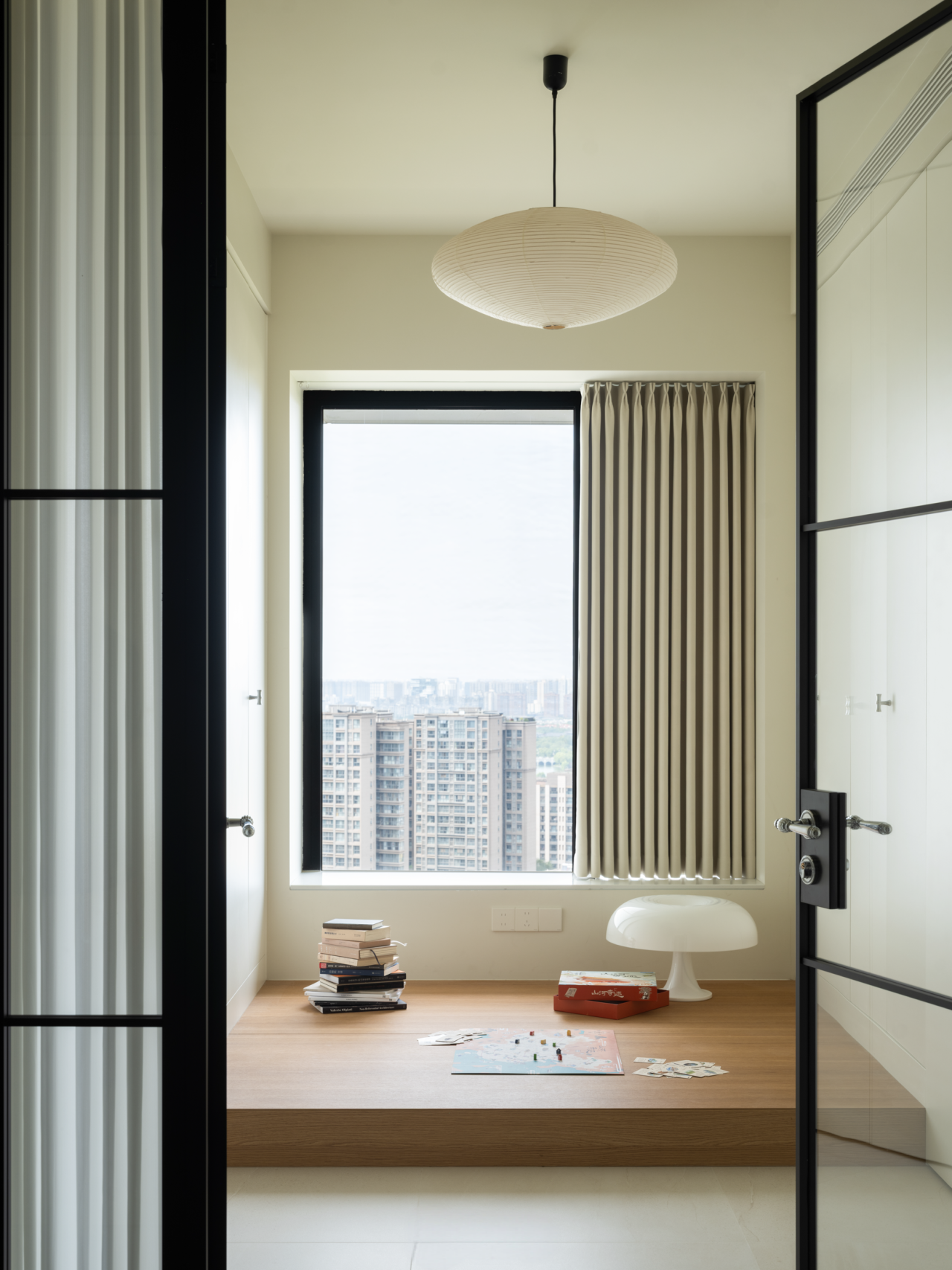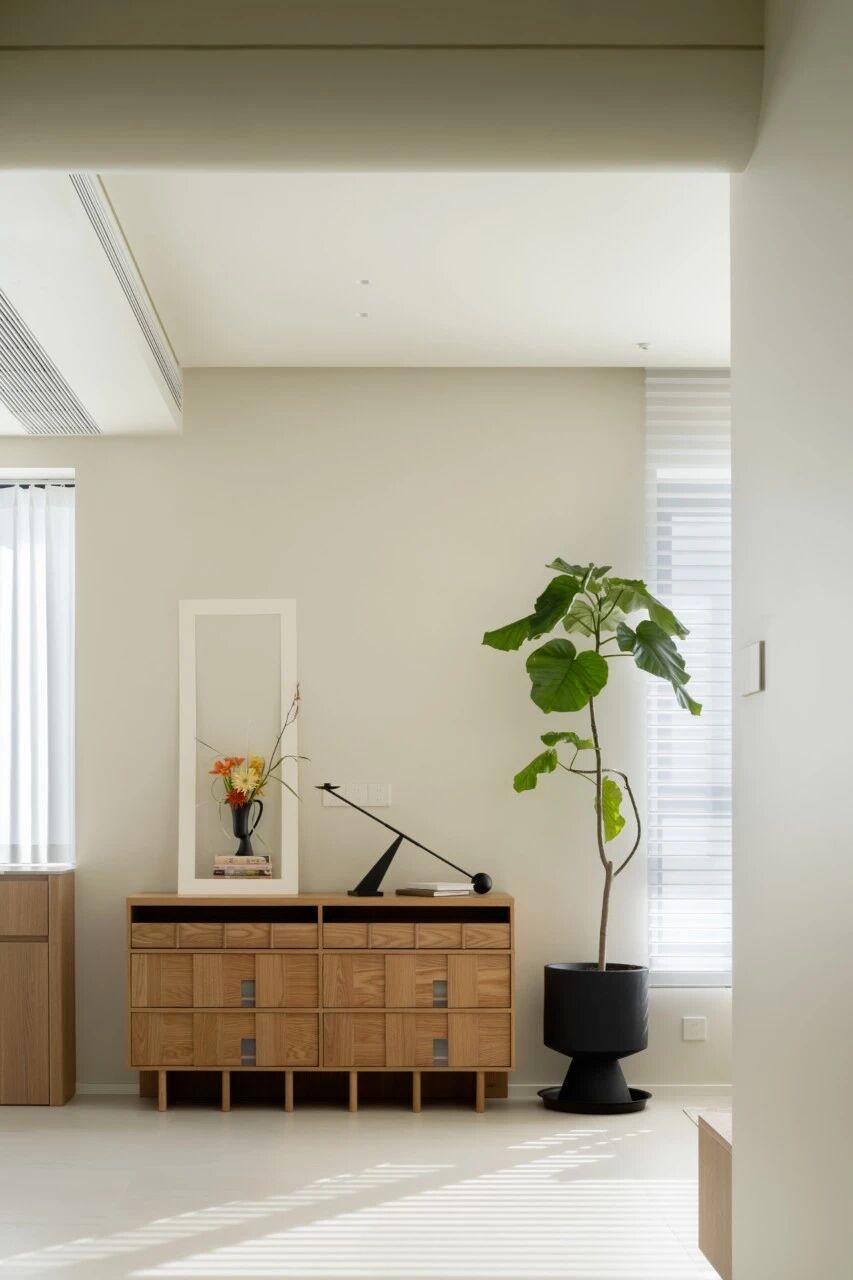 细节的点缀不止是灵光一闪,也是对家的极致温柔。过道尽头,恰是客厅与餐厅交汇的过渡,一方木质低斗柜静静伫立。柜面可错落摆放些小巧的装饰,不经意间便成了进门后的 “端景”,让冗长的过道有了落点,每一次归家都能与这份精致不期而遇。客厅的开阔落地窗,是空间里 “光的容器”,将室外的日光与景致尽数揽入,让室内每一寸角落都亮得通透。无需繁复的装饰,仅以简约的陈设点缀,便足以烘托出整个空间松弛自在的氛围。