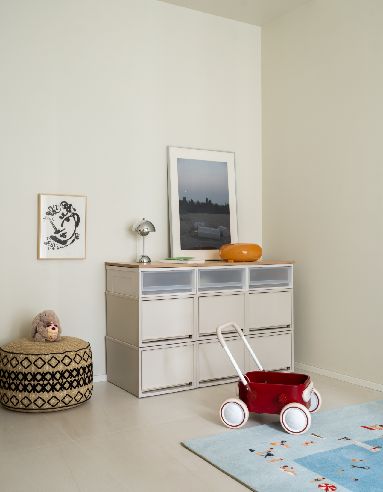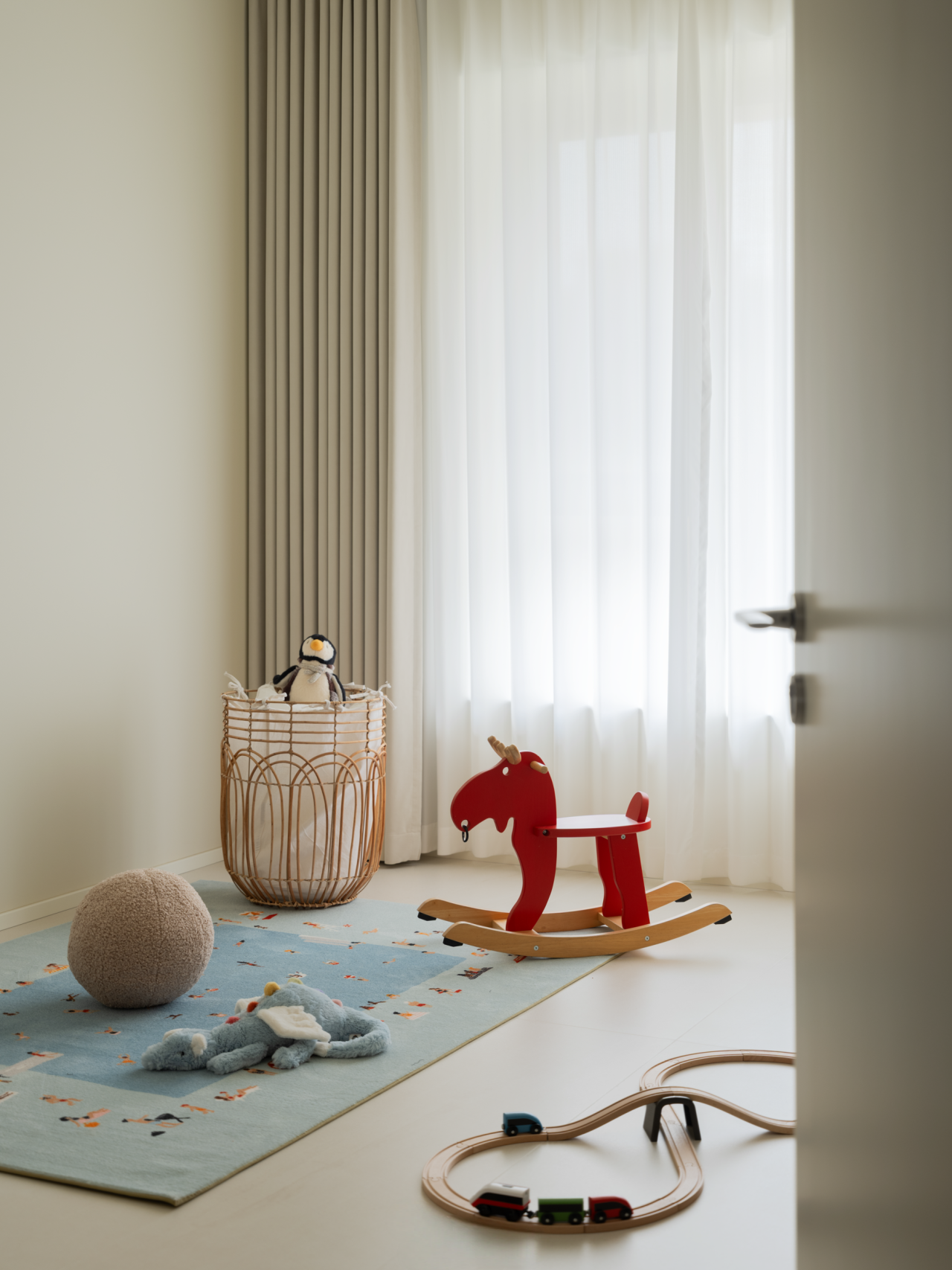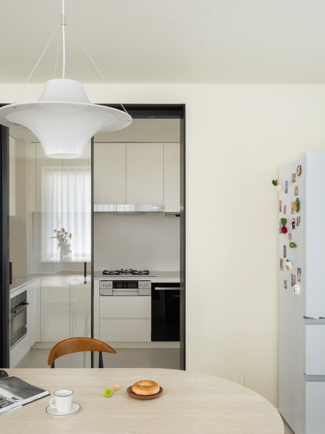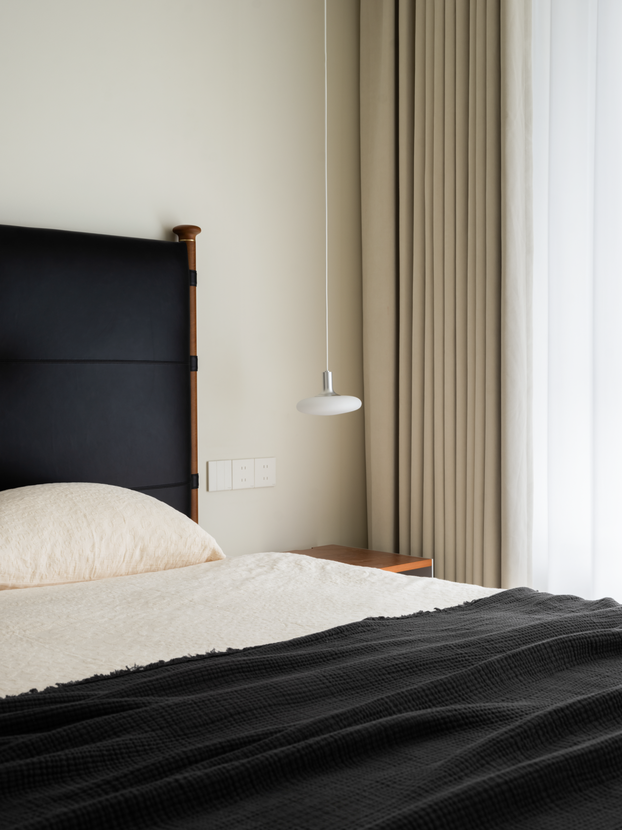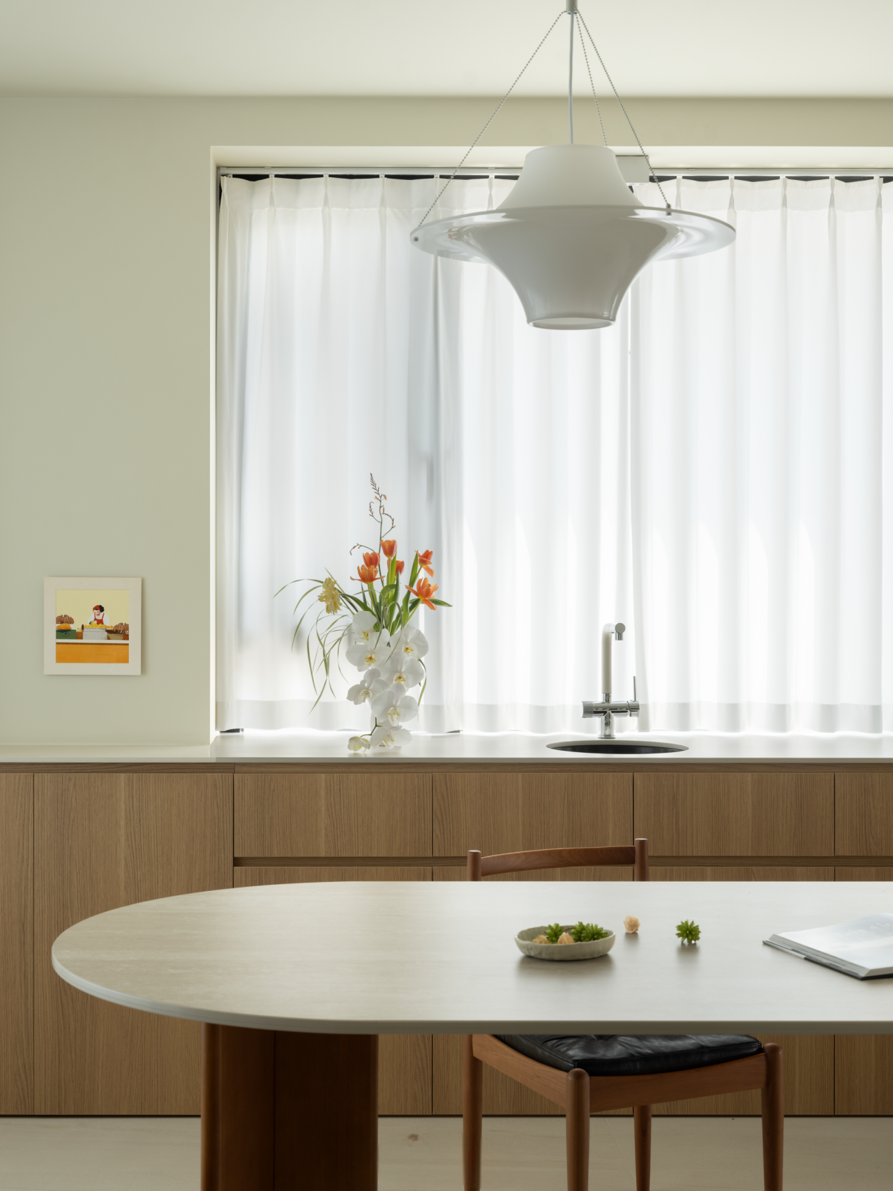 细节的点缀不止是灵光一闪,也是对家的极致温柔。过道尽头,恰是客厅与餐厅交汇的过渡,一方木质低斗柜静静伫立。柜面可错落摆放些小巧的装饰,不经意间便成了进门后的 “端景”,让冗长的过道有了落点,每一次归家都能与这份精致不期而遇。客厅的开阔落地窗,是空间里 “光的容器”,将室外的日光与景致尽数揽入,让室内每一寸角落都亮得通透。无需繁复的装饰,仅以简约的陈设点缀,便足以烘托出整个空间松弛自在的氛围。