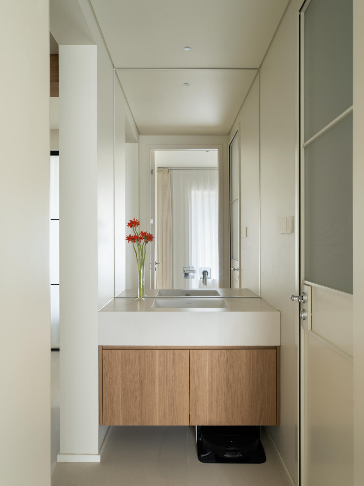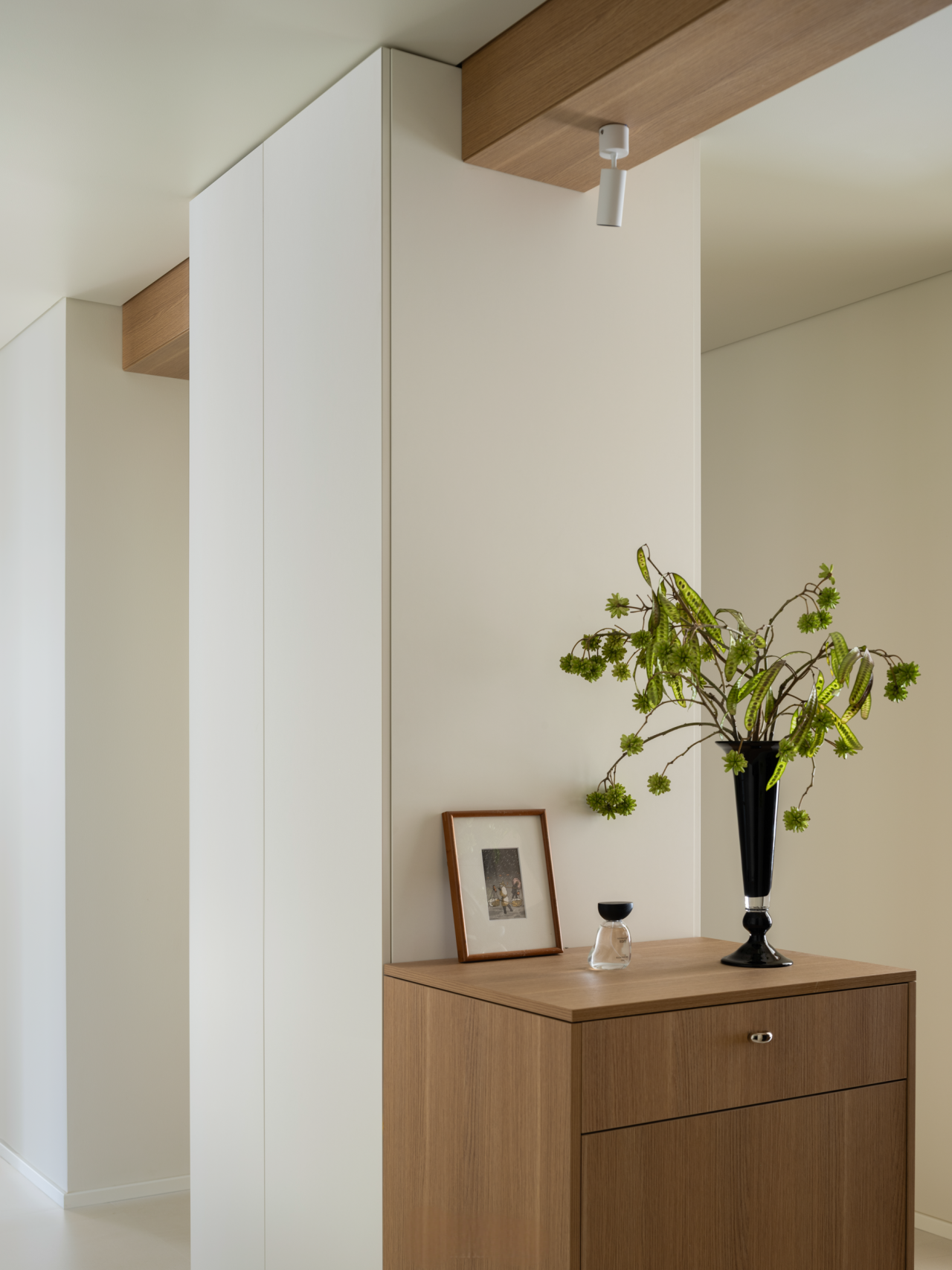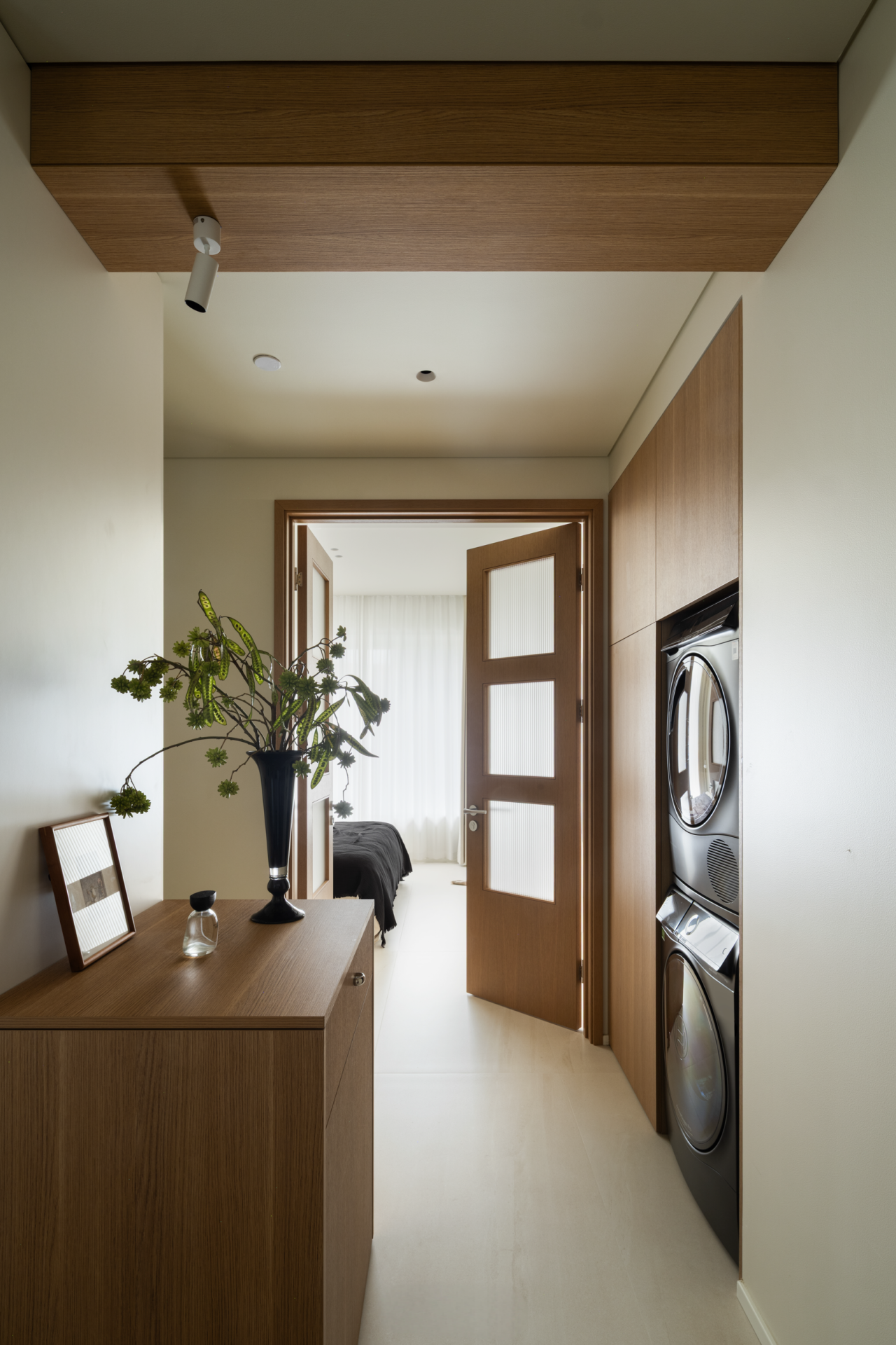 空间布局:设计为家调节多种空间情绪。进门处的狭长过道与众多承重墙,构成了空间改造的先天制约。设计师转而向内探求,将主卧衣帽间“打开”,瞬间化闭塞为开阔,奠定了入口区域的开敞格局。量身定制的高低组合柜与木饰面包裹的房梁纵横交错,如同精心编排的空间韵律,引导出流畅的洄游动线。格局的解放不仅成就了视觉上的开阔感,更“盈余”出恰到好处的角落,从容安放家政间的需求,于方寸间实现功能与美学的平衡。