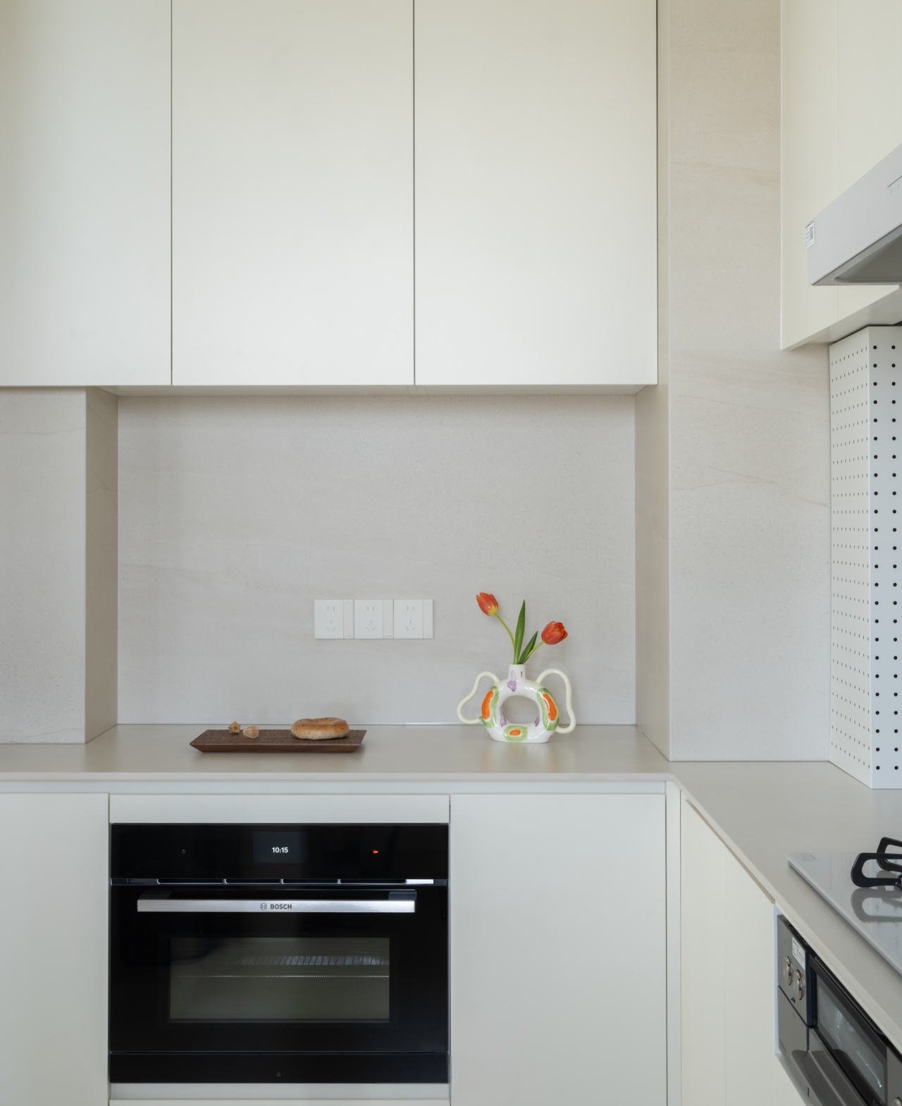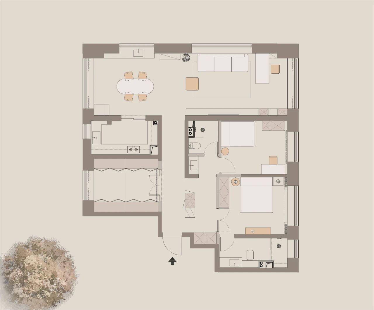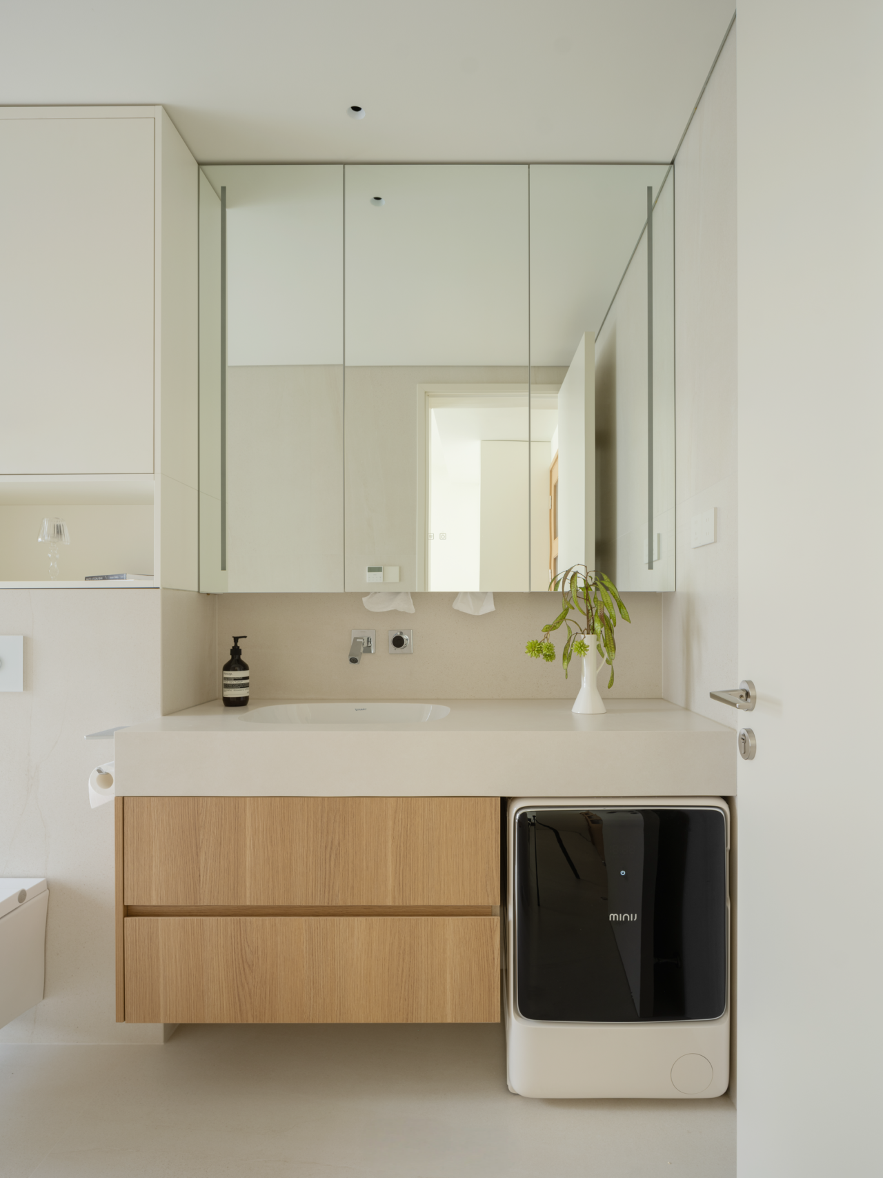 空间布局:设计为家调节多种空间情绪。进门处的狭长过道与众多承重墙,构成了空间改造的先天制约。设计师转而向内探求,将主卧衣帽间“打开”,瞬间化闭塞为开阔,奠定了入口区域的开敞格局。量身定制的高低组合柜与木饰面包裹的房梁纵横交错,如同精心编排的空间韵律,引导出流畅的洄游动线。格局的解放不仅成就了视觉上的开阔感,更“盈余”出恰到好处的角落,从容安放家政间的需求,于方寸间实现功能与美学的平衡。