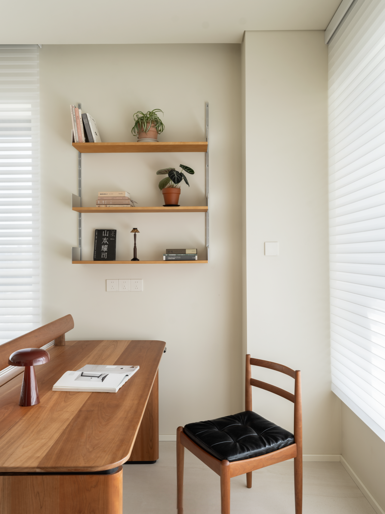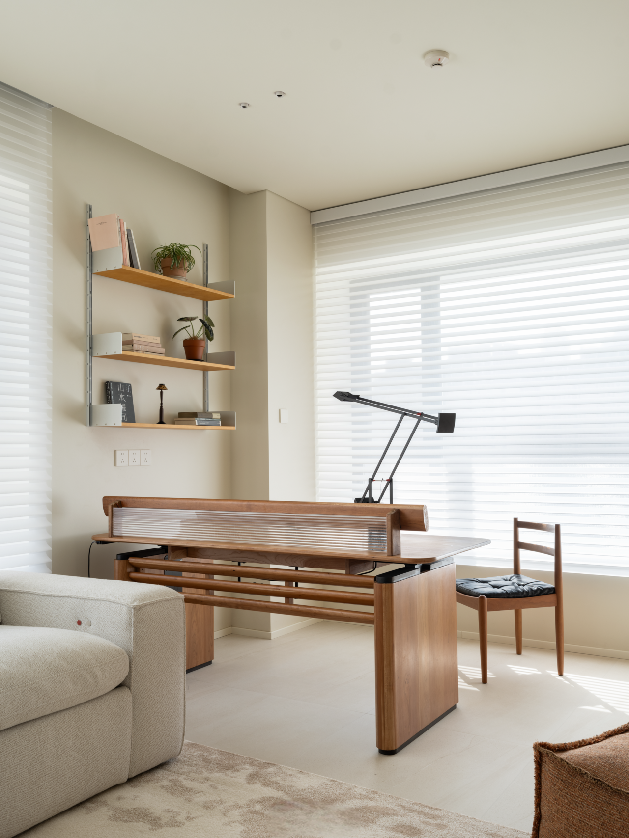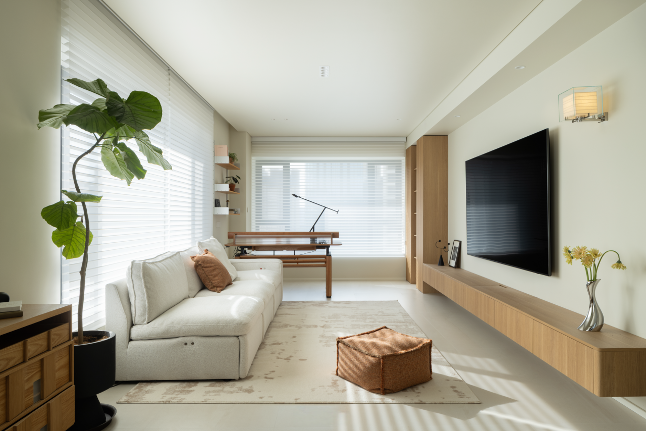 在开阔的客厅里,一方工作区被自然划分出来,没有生硬的隔断,与休闲区域温柔衔接,让工作时也能融入家庭氛围,自此,高效工作与亲密互动不再相悖。工作区配一方升降桌,可随需求调节高度,适配多样工作形态。旁侧立起的储物高柜,收纳着书籍与办公用品,中间特意搭建的置物隔板,不将空间填满,而是预留出恰到好处的空隙,让光线与空气自在流通,为忙碌的工作时光添了几分呼吸感。 -