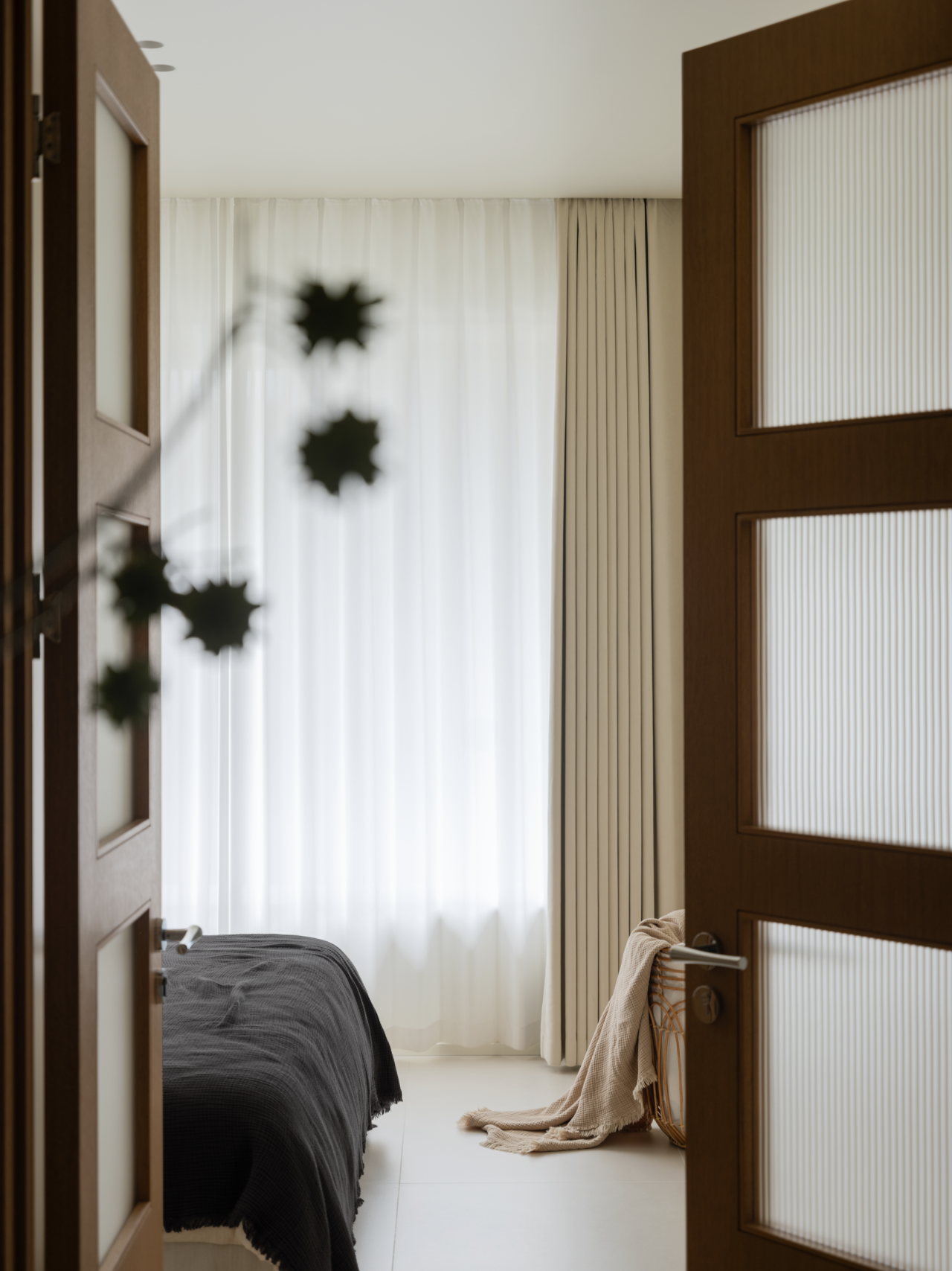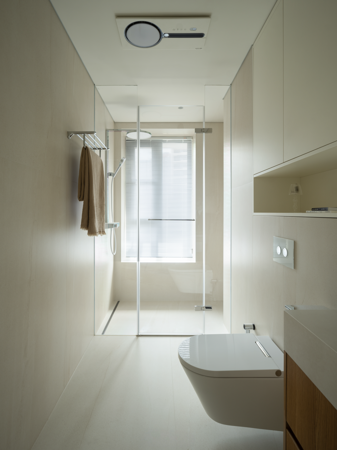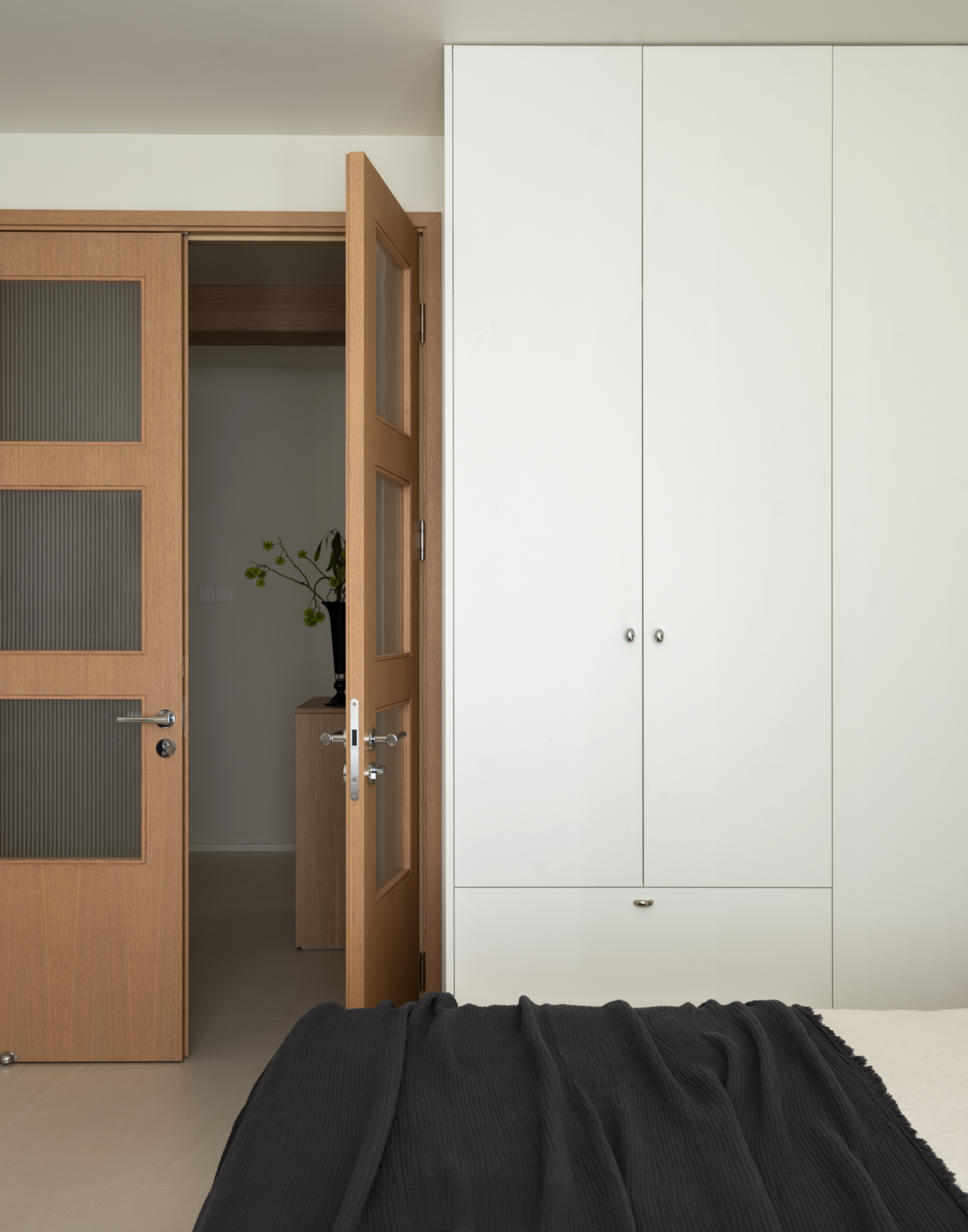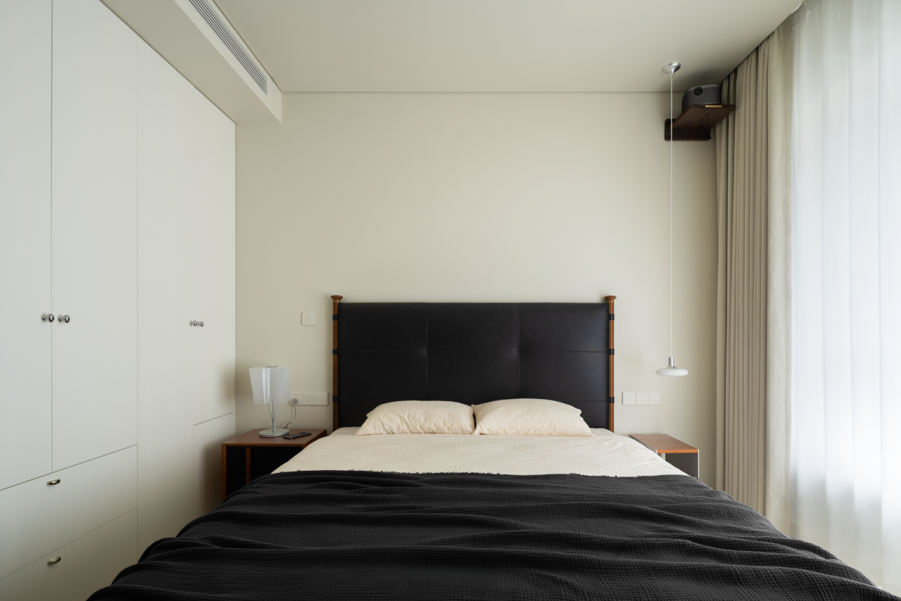 设计选材:室内选用经济实用的衣柜门,内嵌金属衣架系统,在控制造价的同时,兼顾收纳的高效与整洁。衣帽间深处,稍稍抬升的地台悄然铺设,不仅界定了区域,更为临时居留提供了一处闲适的栖居角落。